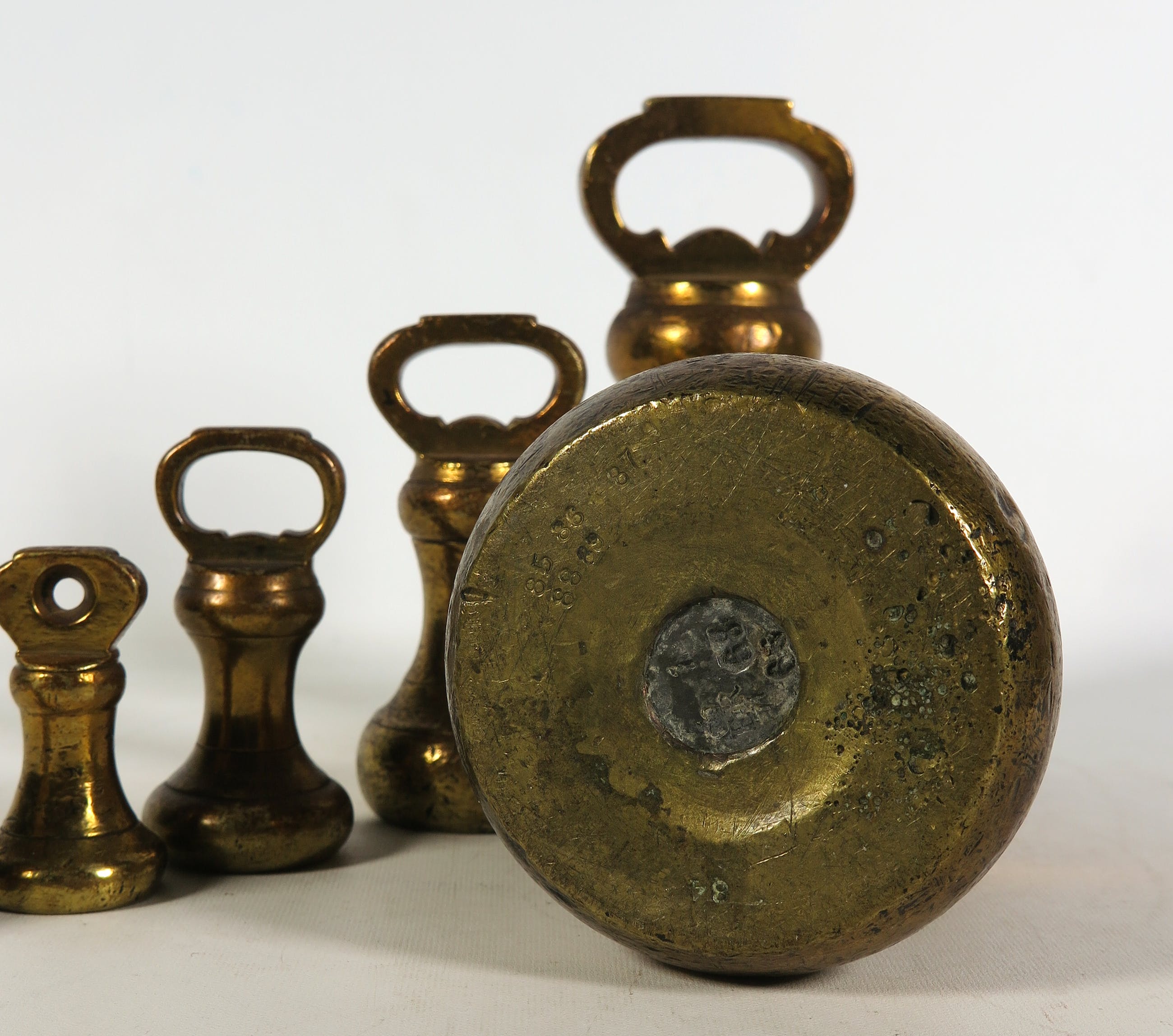 Set bronzen gewichten mooie gebruikte conditie. In totaal omvat de set tien gewichten.