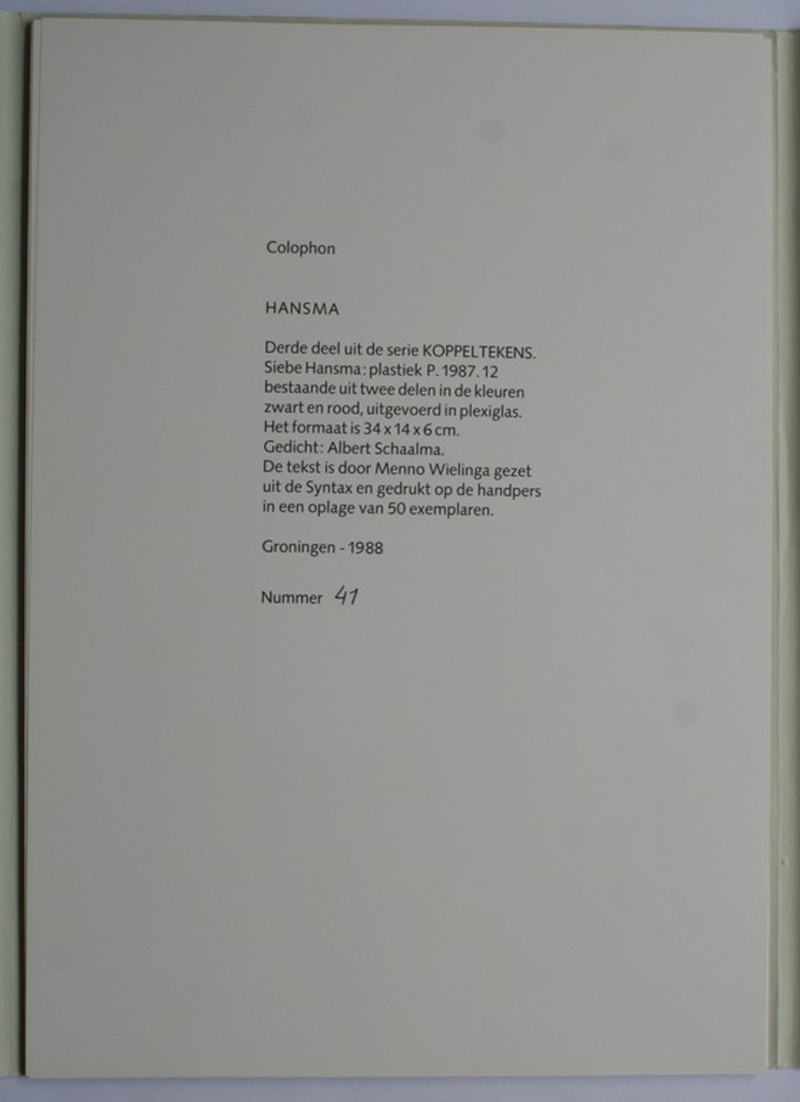Nog niet in elkaar gezet plastiek in twee delen, in een map van de kunstenaar Siebe Hansma. Met een gedicht van dichter Albert Schaalma. Het geheel bestaat uit een grijze map met daarin het zwart en rode plastiek in verpakking. Genummerd en gesigneerd. Verder in de map 3 bladen met het gedicht, een colophon en een toelichting. In originele staat.