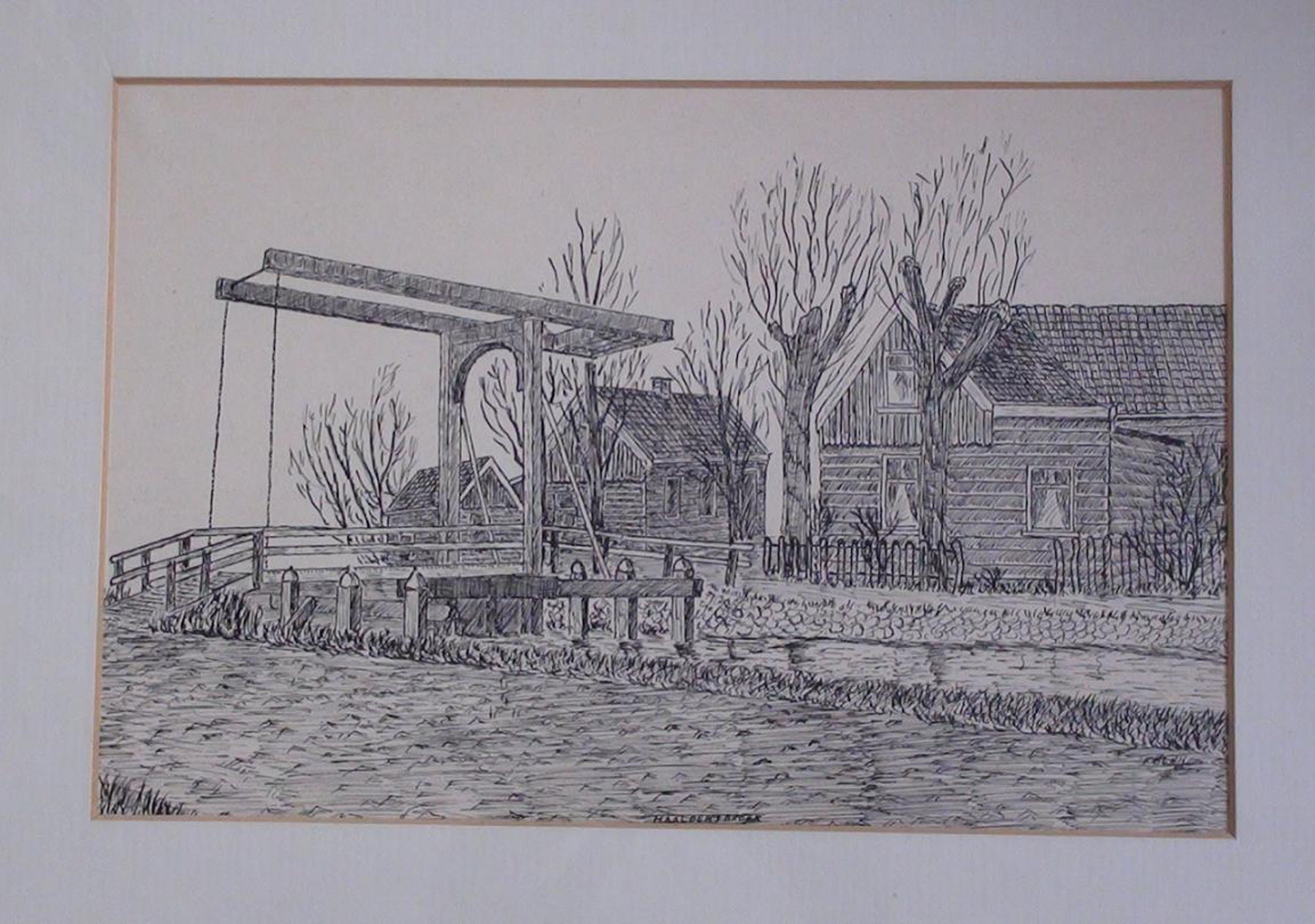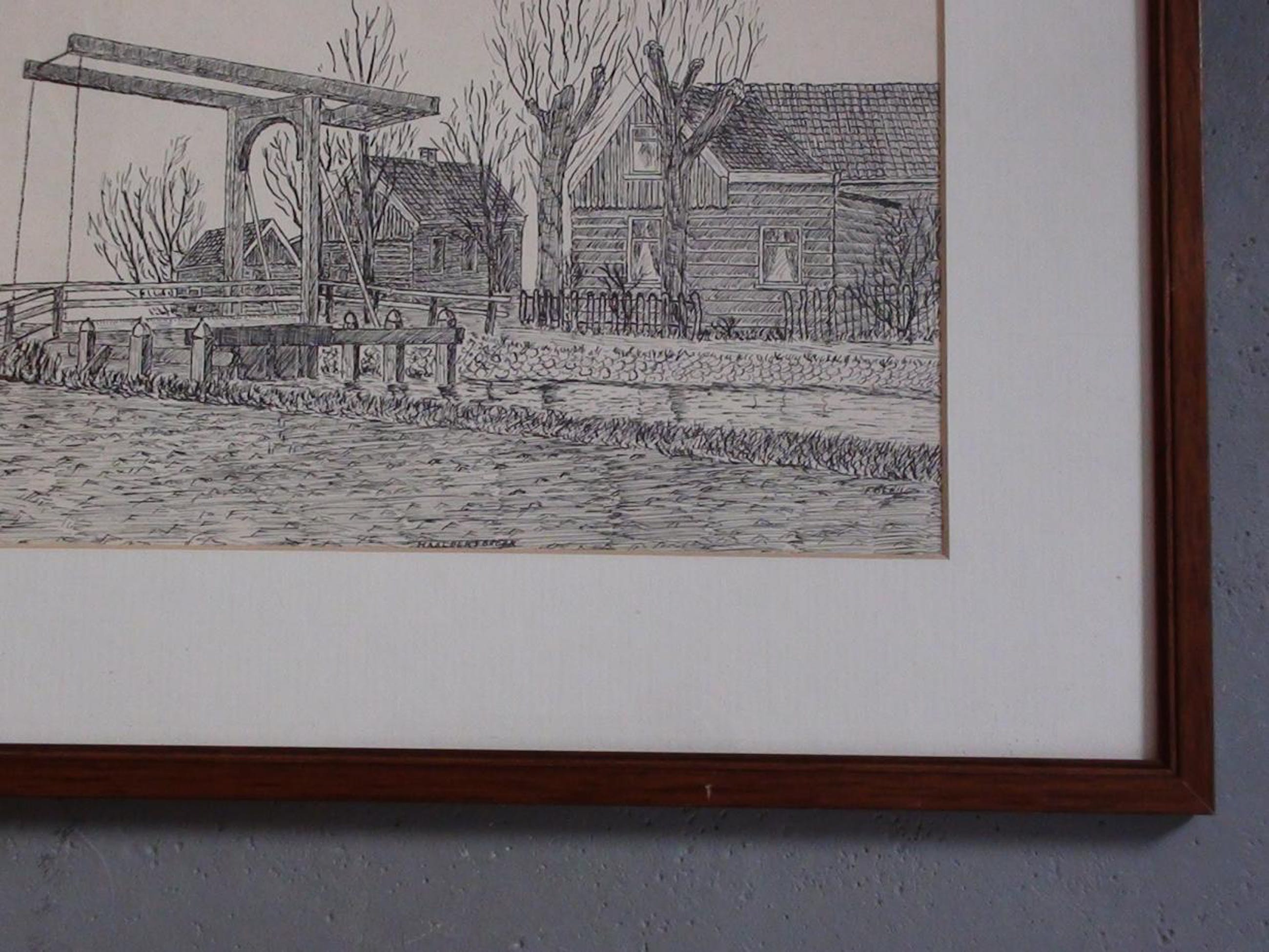 Mooie inkttekening van "Haaldersbroek te Zaandam", allereerst getekend in potlood en daarna met oostindische inkt. Gesigneeerd in de tekening rechtsonder: F. Bleij ?? (zie foto).