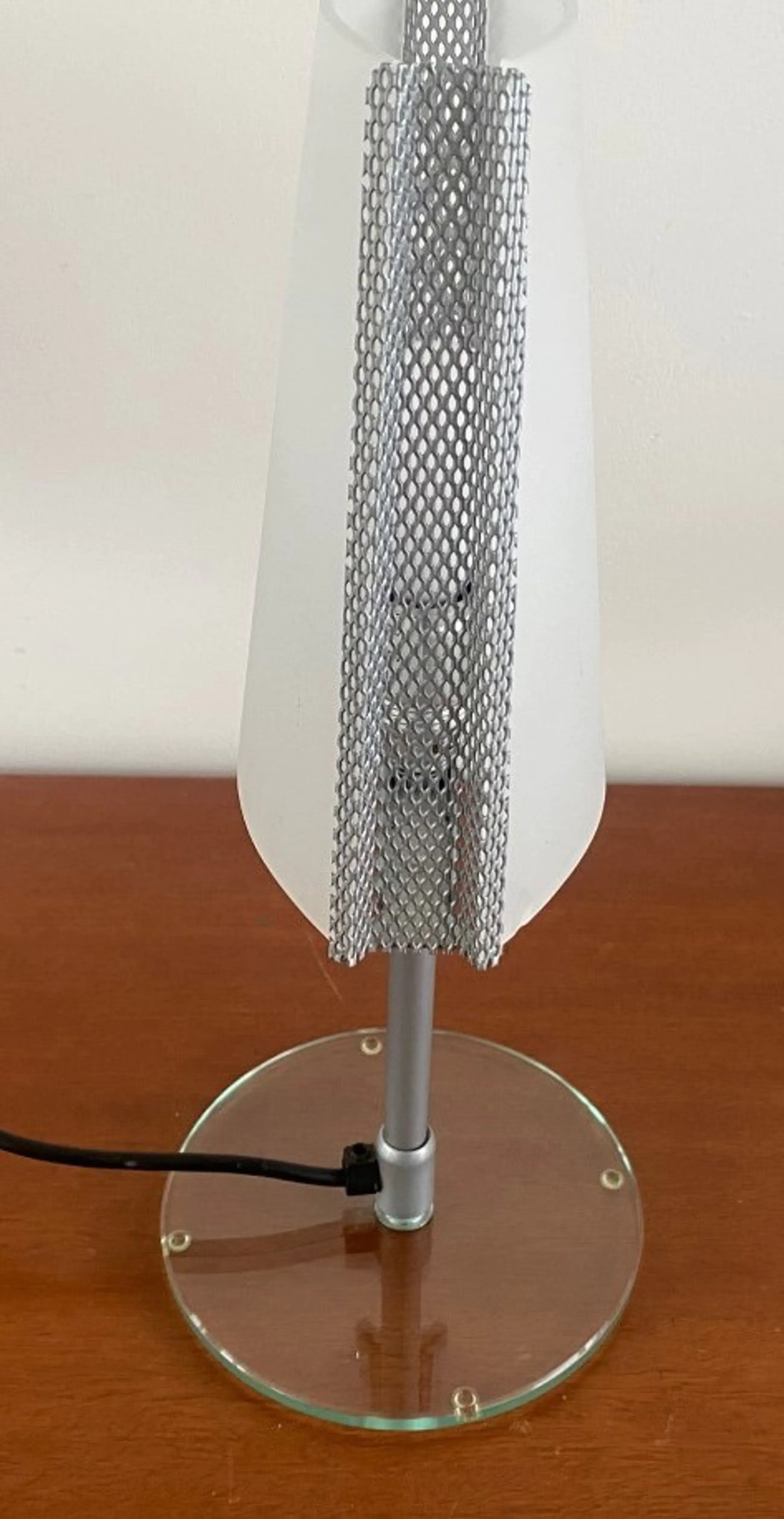 Design tafellamp gemaakt bij de Italiaanse firma Sothis in de jaren '90-'2000. Kwaliteitslamp waarbij een combinatie van staal en glas is gebruikt. De ovale kap is van gesatineerd glas met gewafeld staal gemaakt en de voet van helder veiligheidsglas. De fitting is voorzien van een merksticker met technische gegevens.