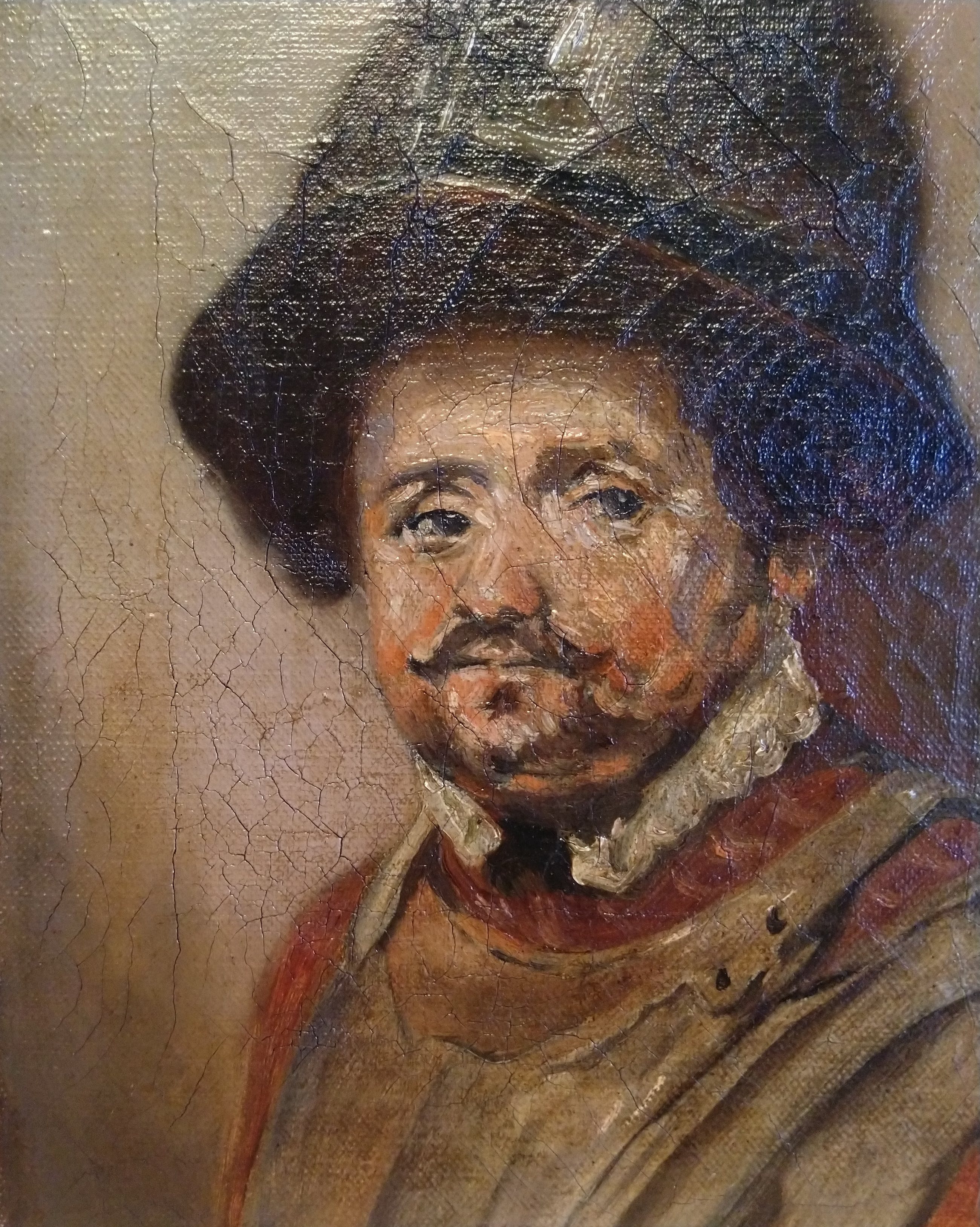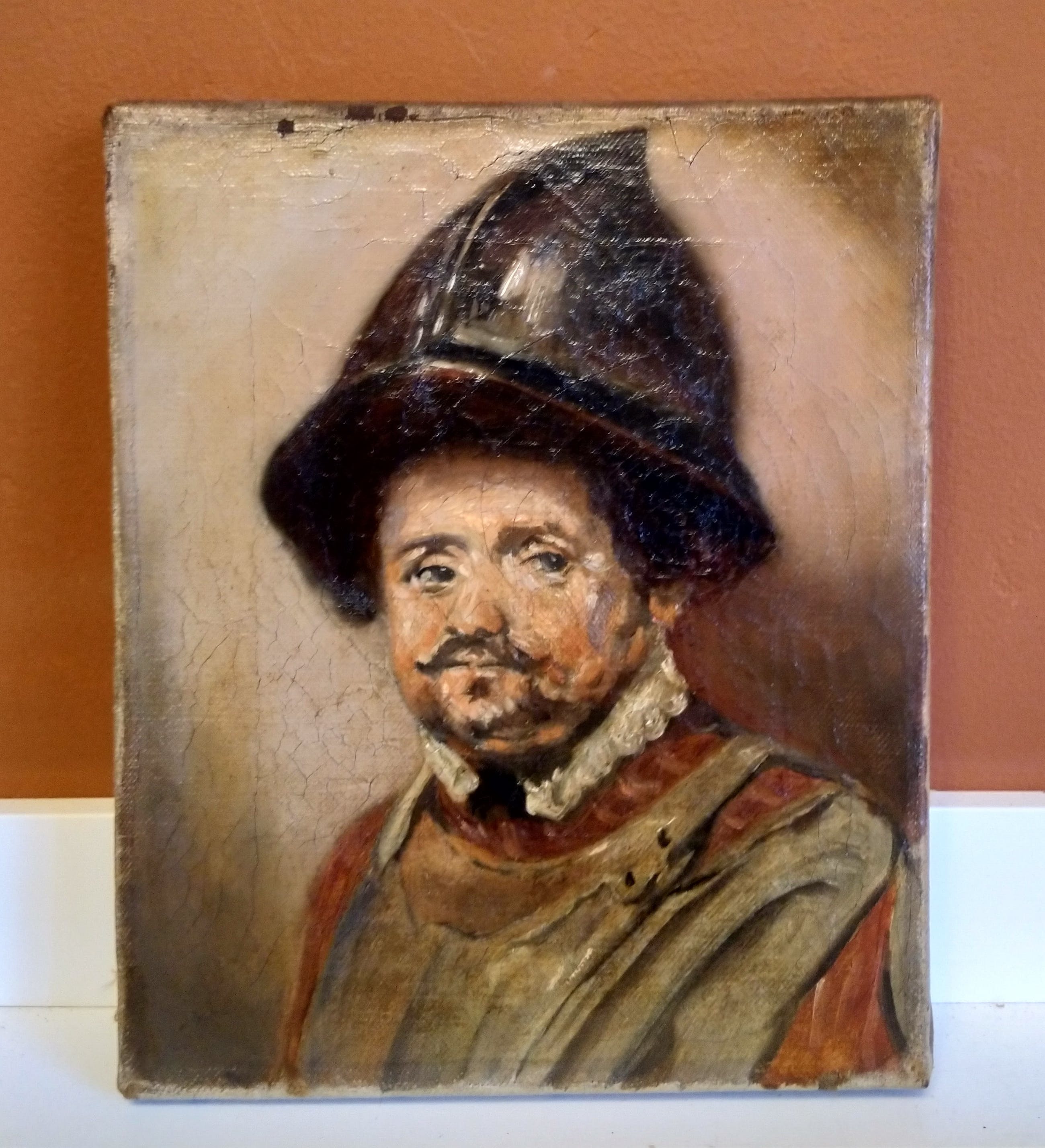 Prachtig 19e eeuws portret door onbekende meester van een Spaanse soldaat Conquistador. Geschatte leeftijd circa 150 jaar