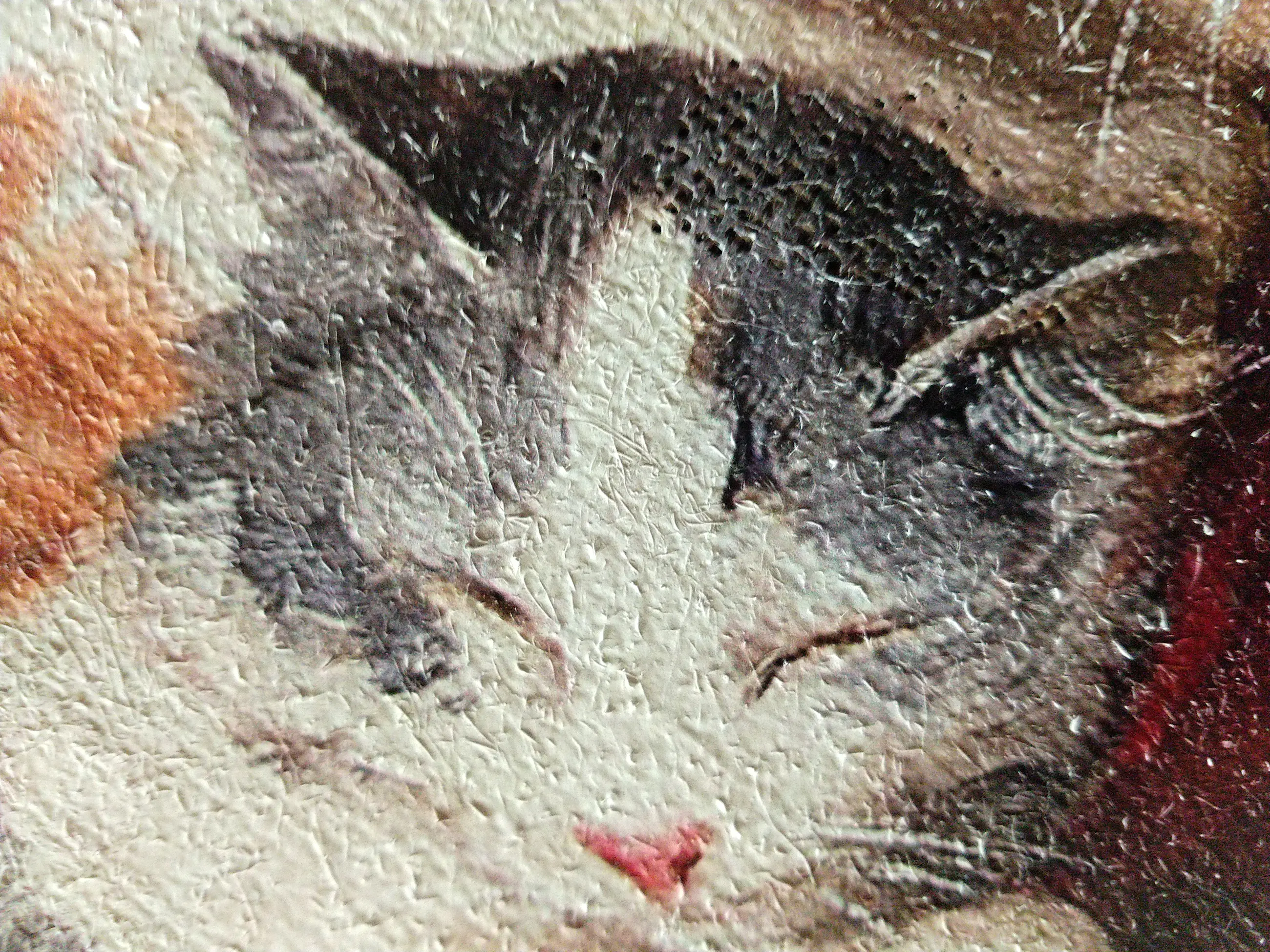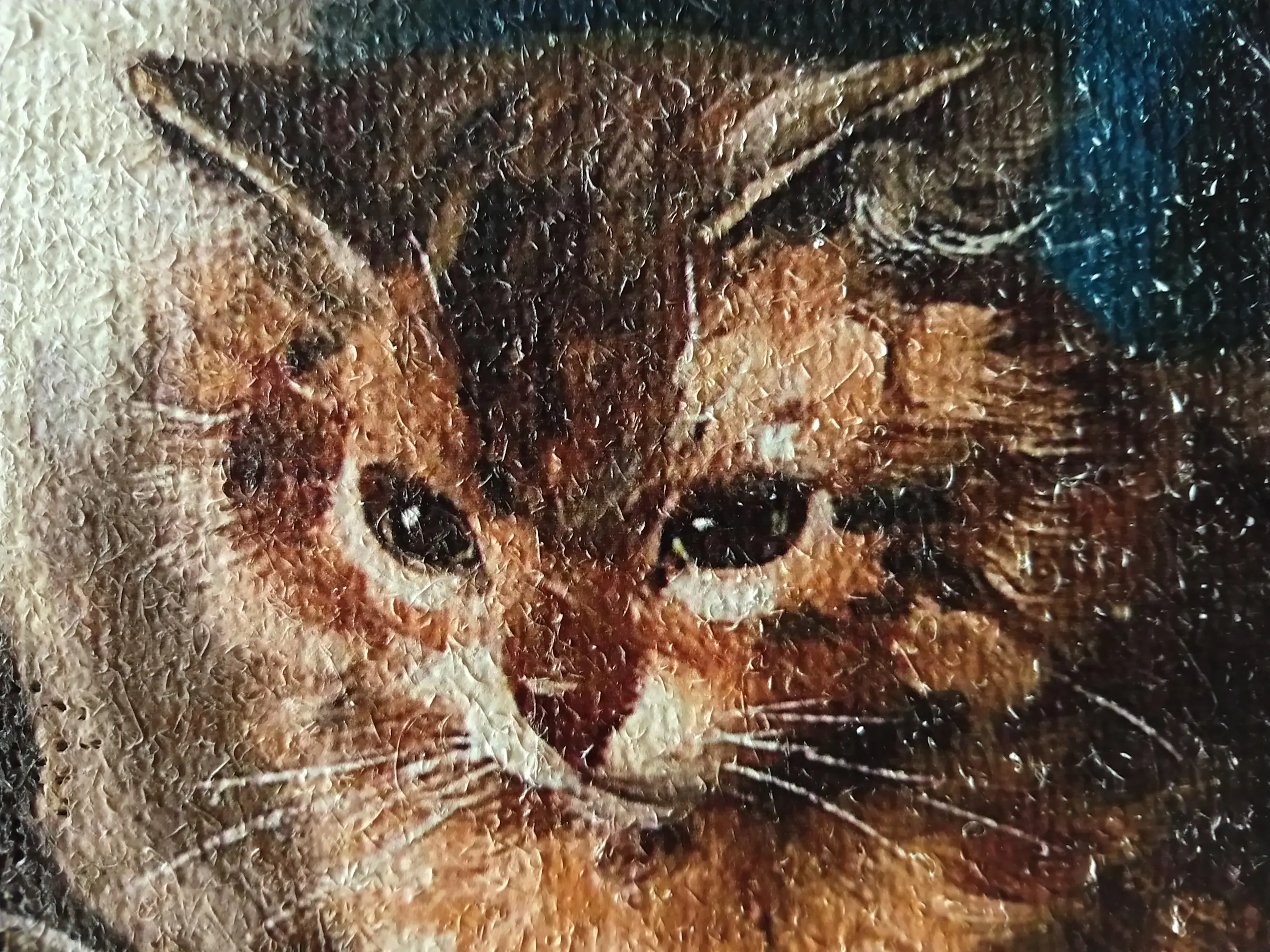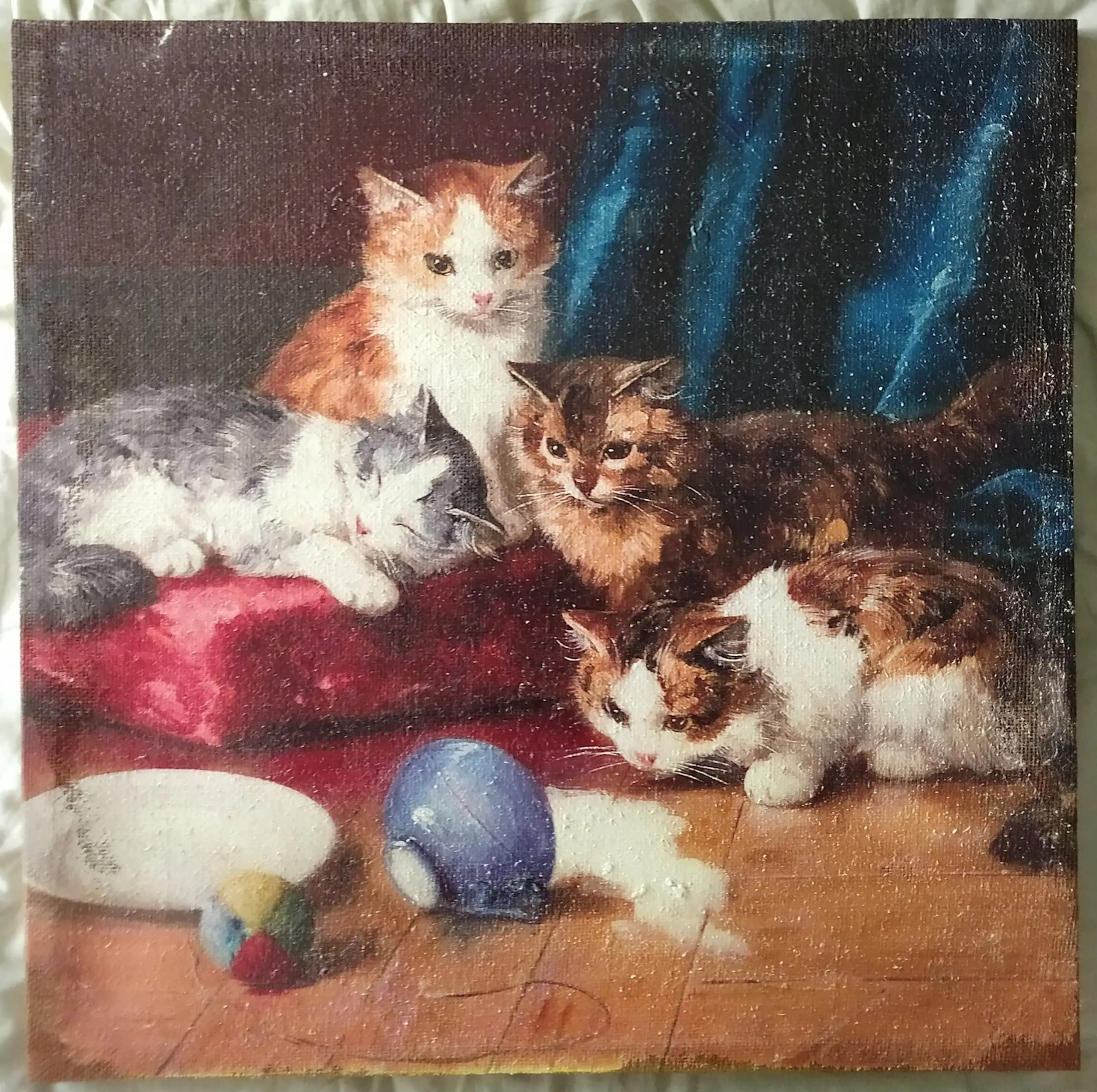 Hollandse school. Spelende katten. Olieverf op doek. Het betreft een olieverf op doek met onder de verf een (ingeschilderde) druk Op enkele plekken zijn er open plekken in het canvas omdat de verf er doorheen is gevallen.
