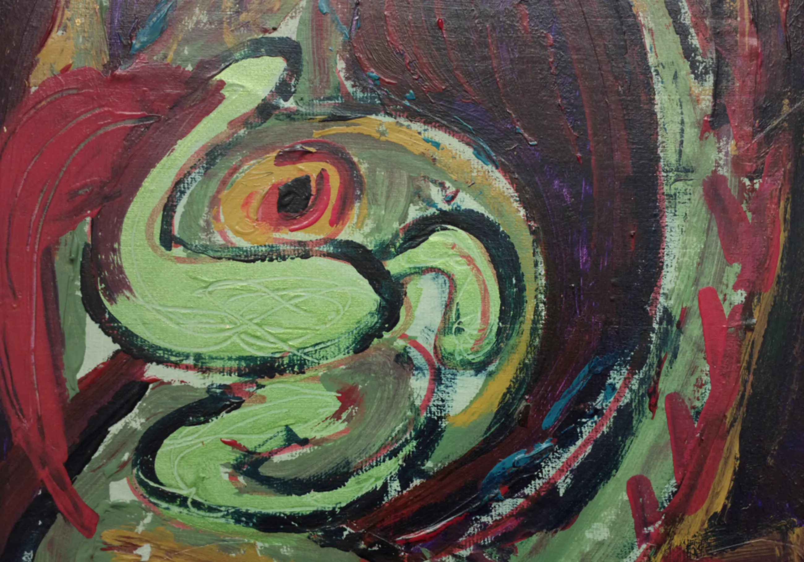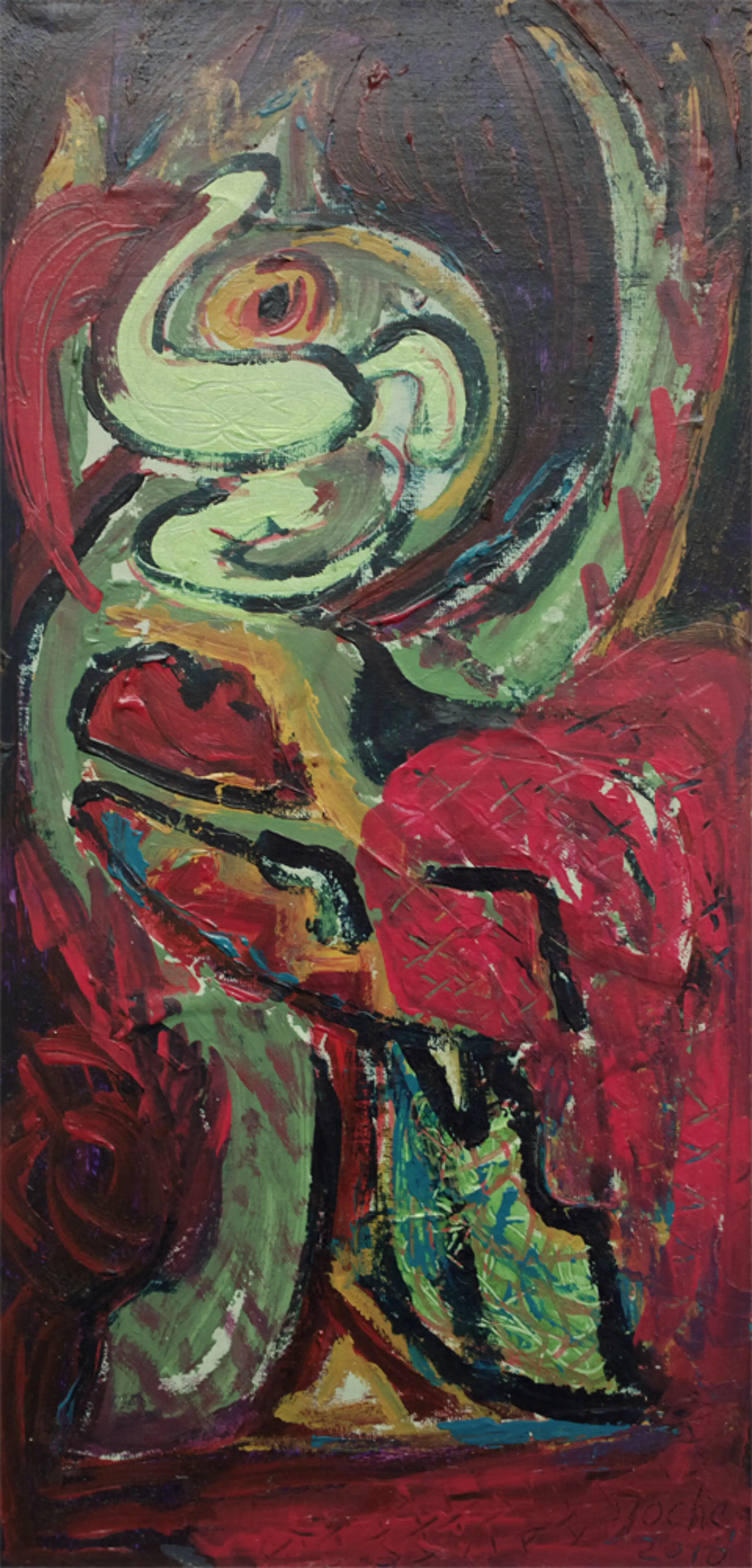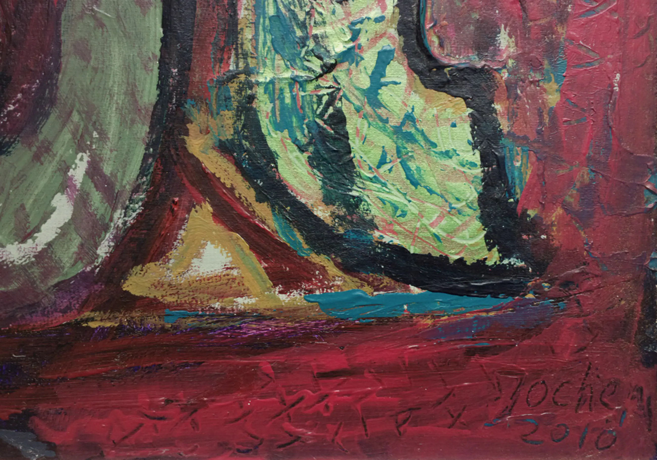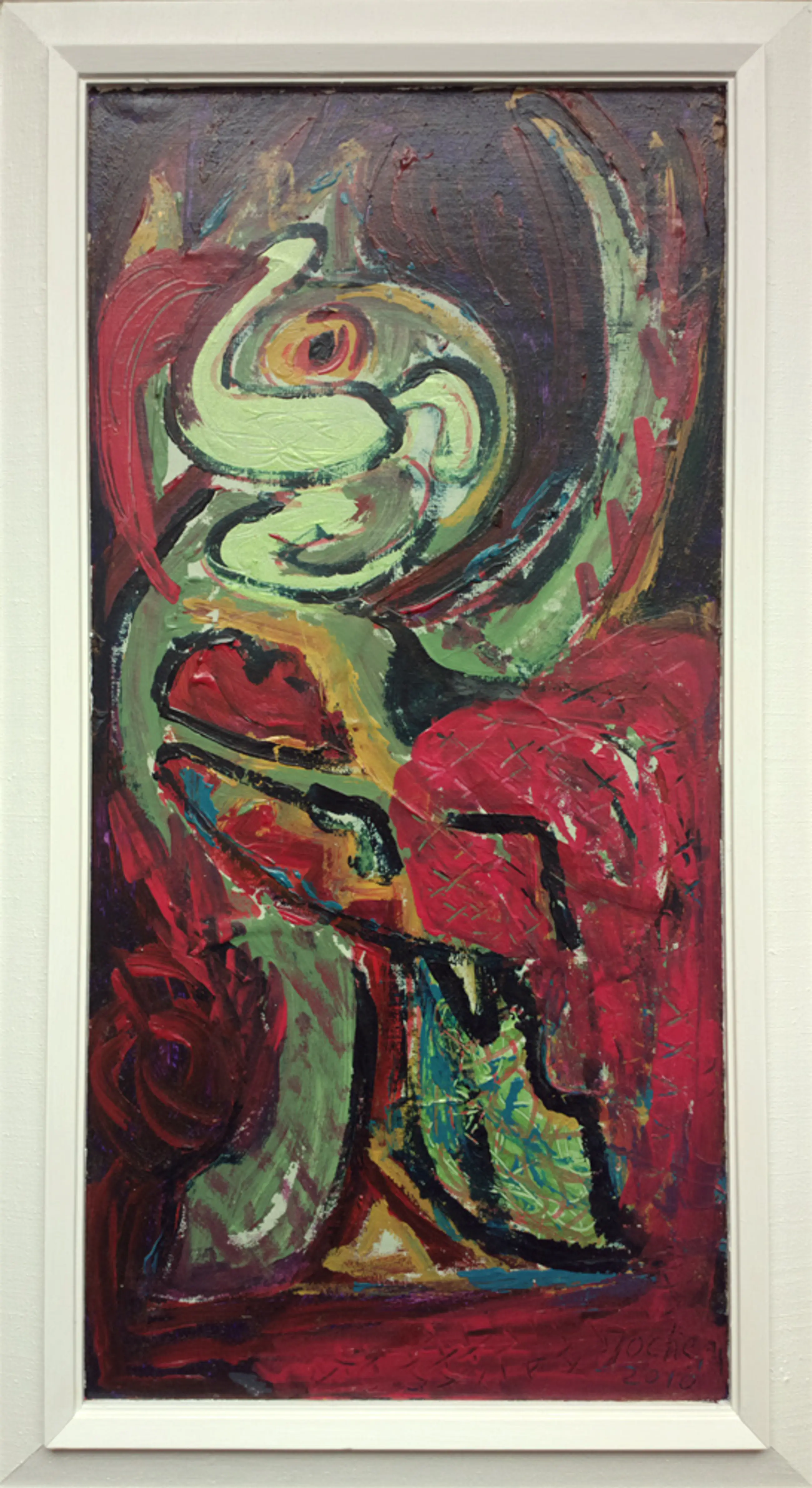 Over het werk: Acrylverf op paneel van Jochem de Ruijter (1981). Staande figuur in een expressionistische stijl geschilderd. Het werk is rechtsonder gesigneerd 'Jochem' en gedateerd '2010'.