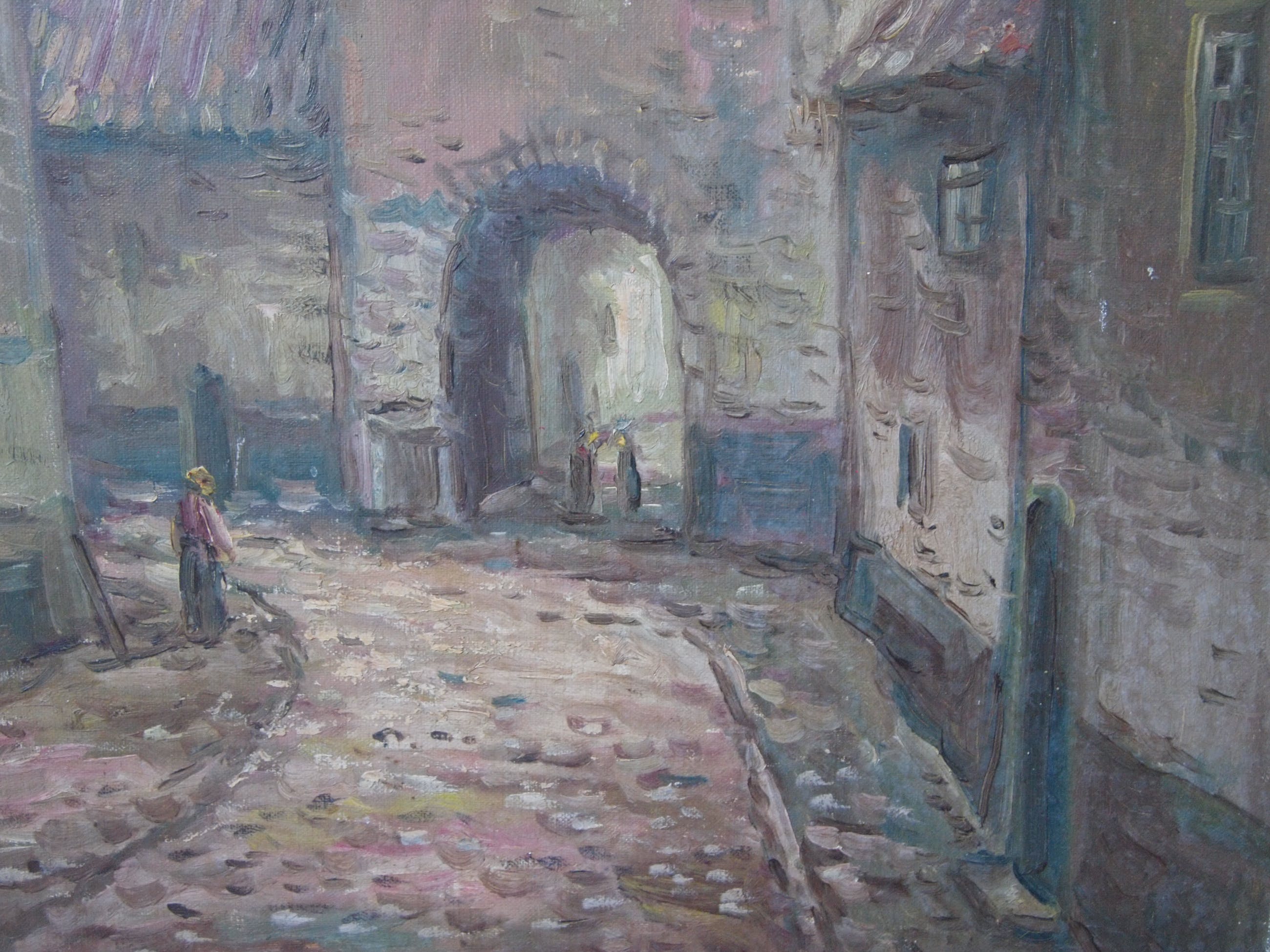 Een klassiek olieverf schilderij van een stadsgezicht ergens in West Europa. Linksonder gesigneerd L. Zwanenberg. Het werk is voorzien van een verguld gelakte houten lijst.