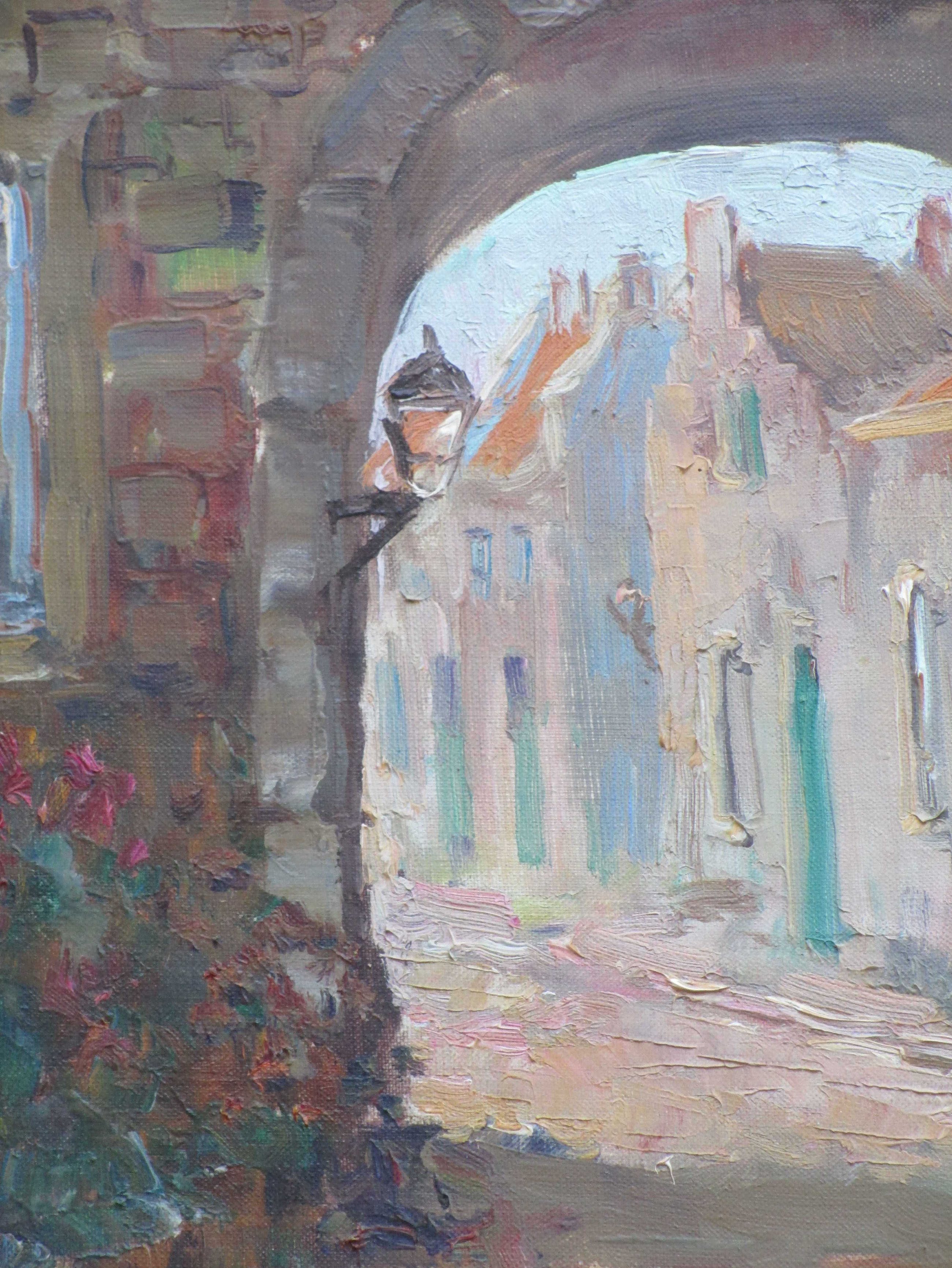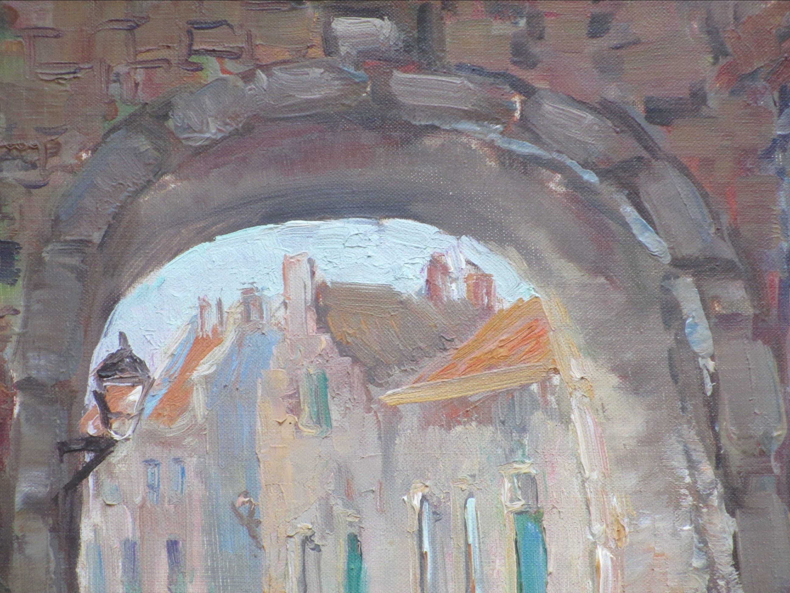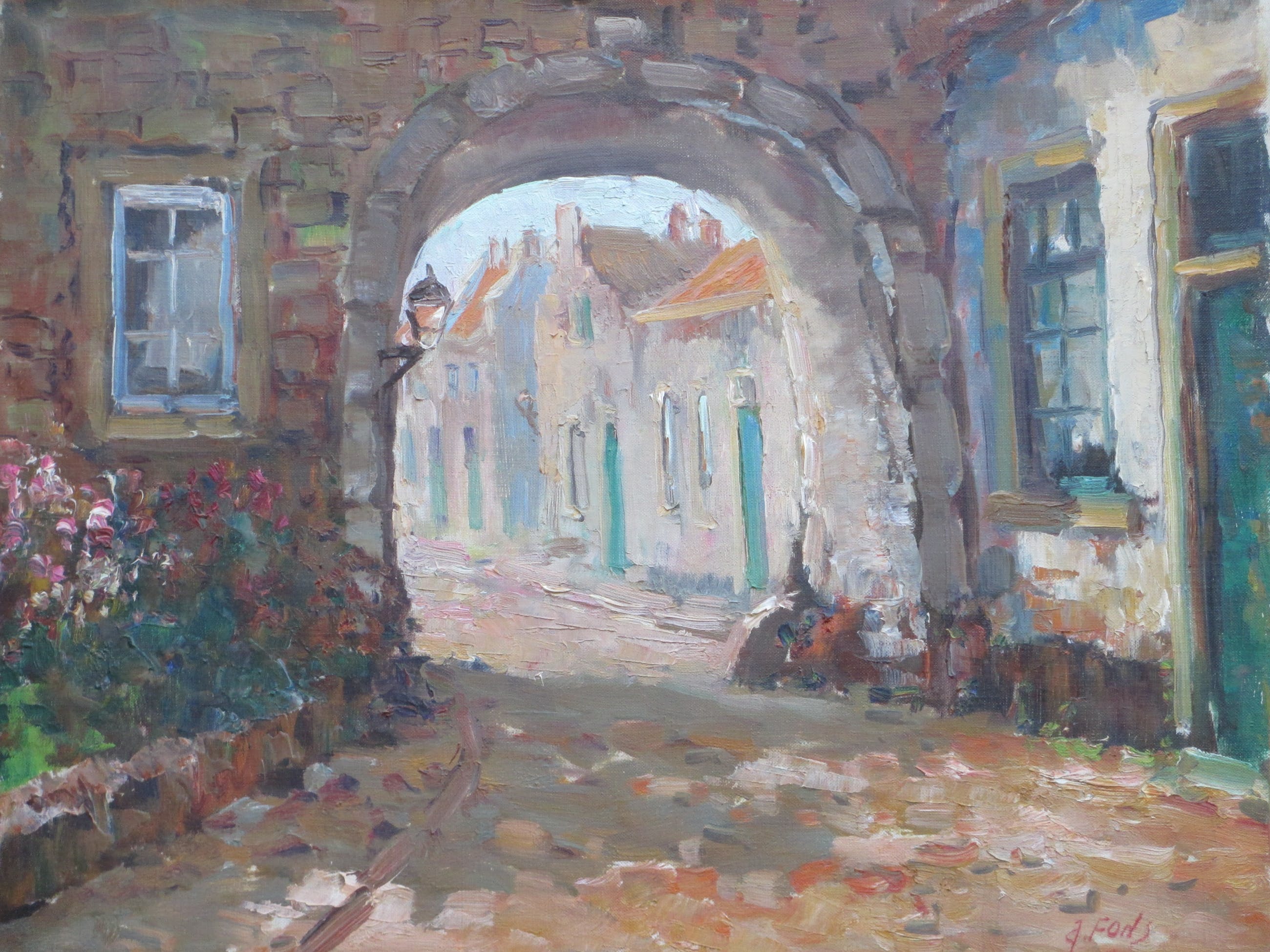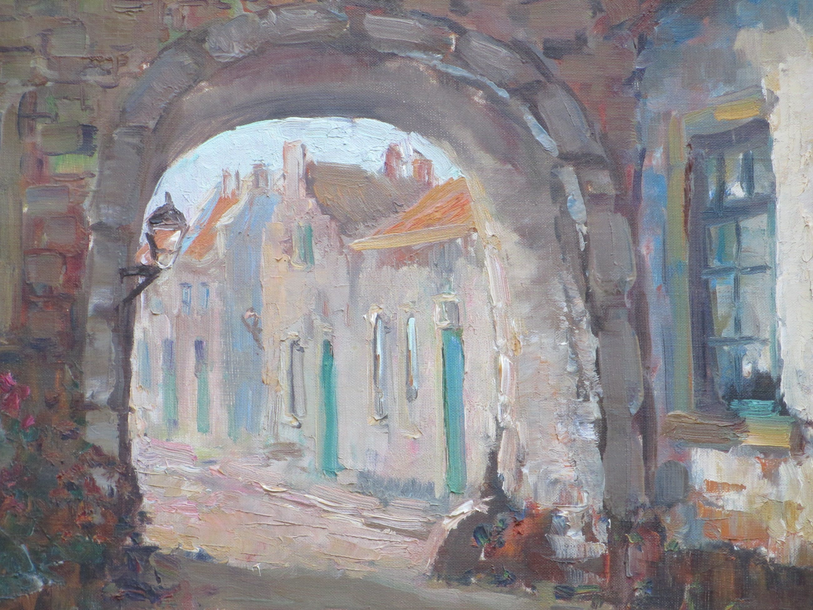 Impressionistisch, zonnig olieverf op doek door A. Fons Voorstelling van een stadsgezicht in Hattem Gesigneerd r.o.: 'A. Fons' Niet gelijst, op spieraam, beeldmaat 40x50 Getiteld op achterzijde spieraam: 'Hattem'