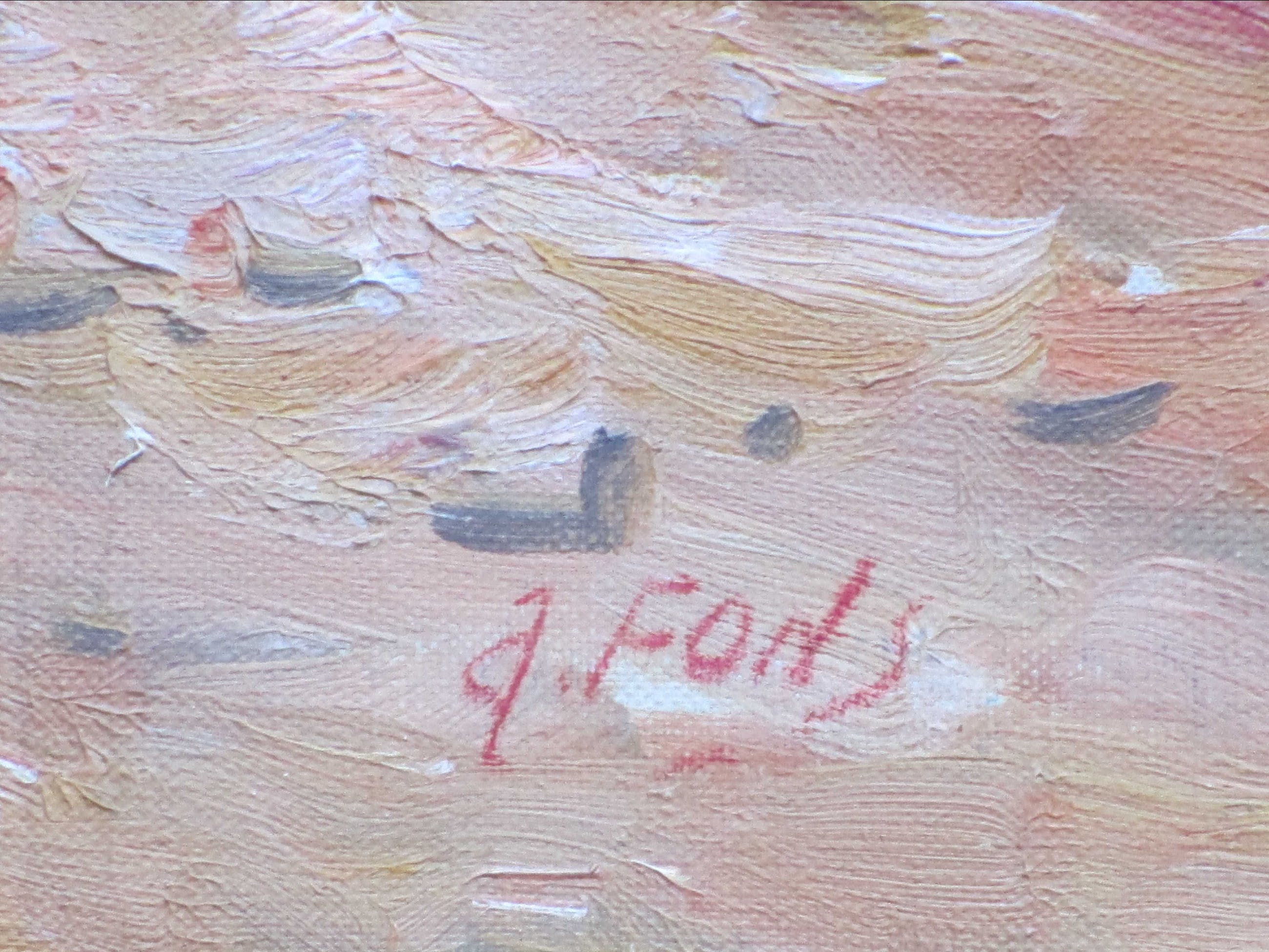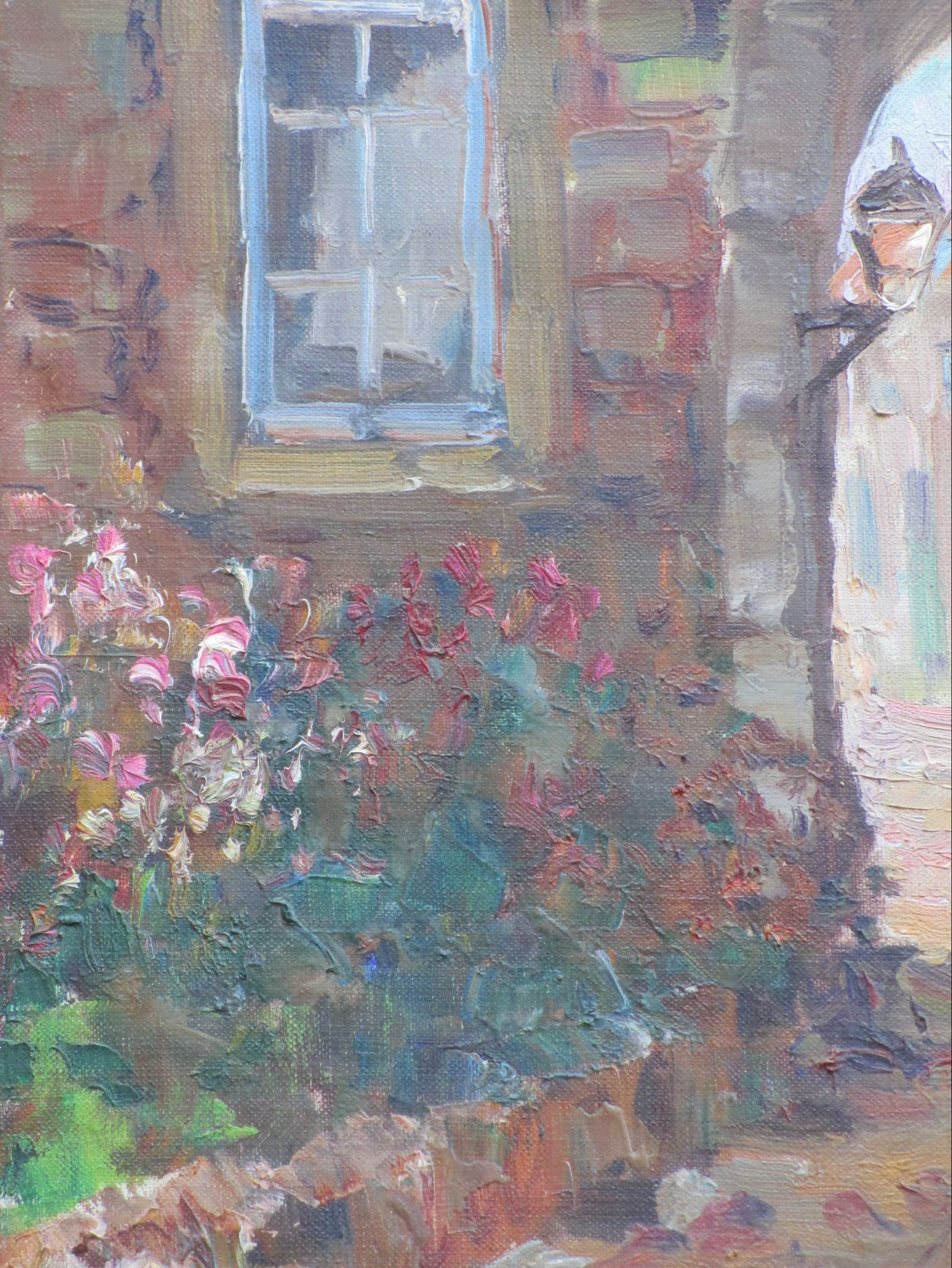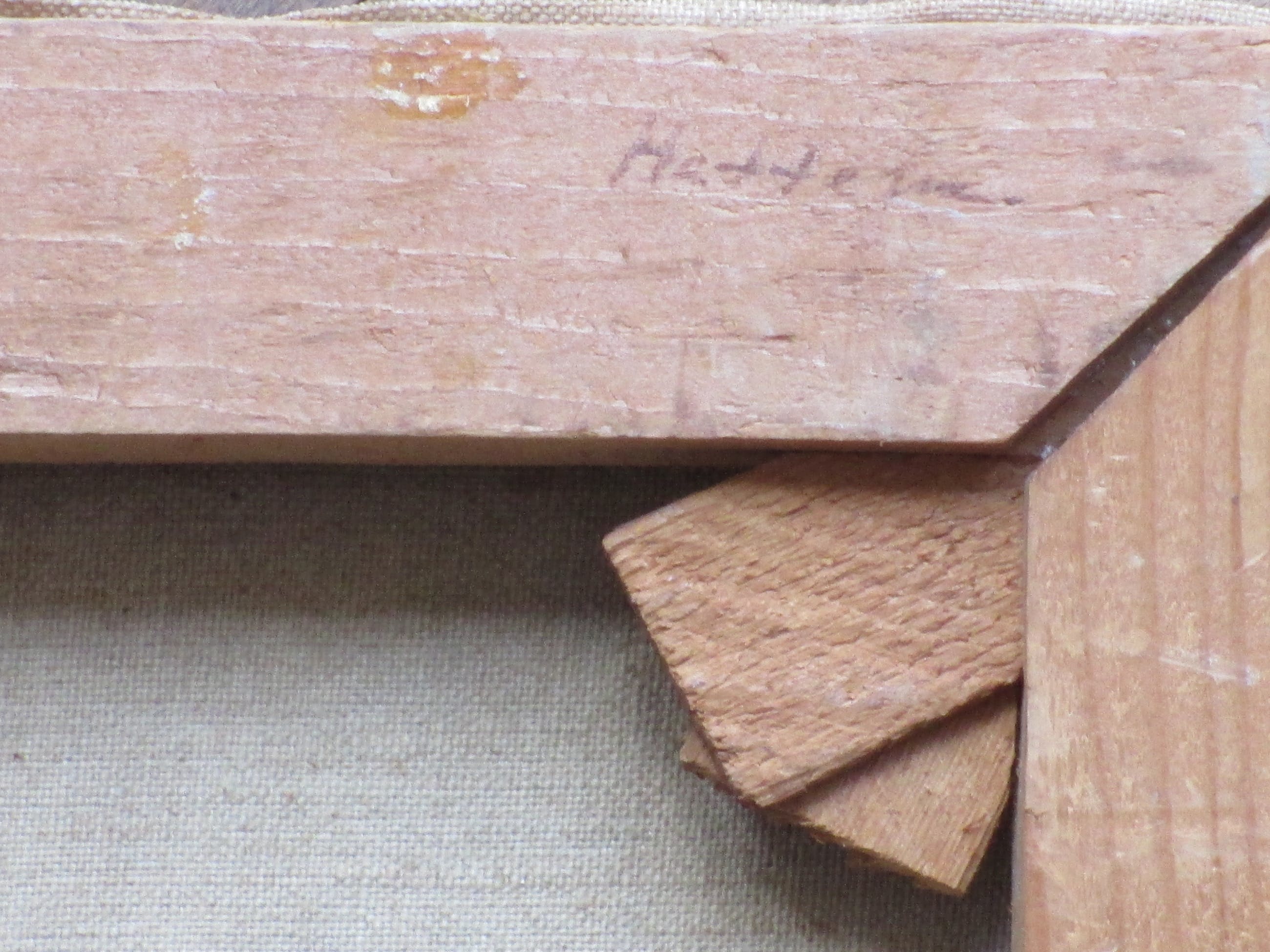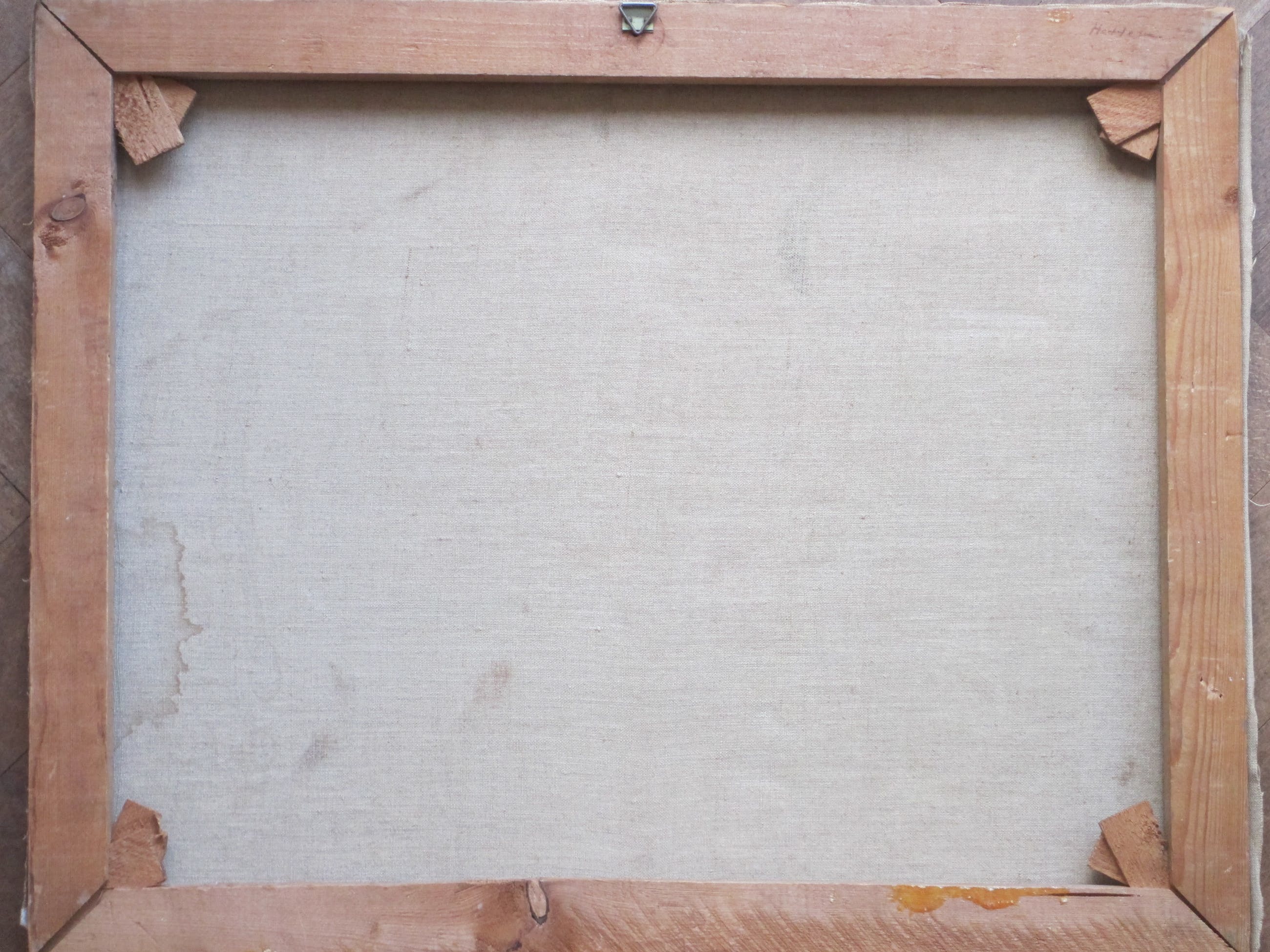 Impressionistisch, zonnig olieverf op doek door A. Fons Voorstelling van een stadsgezicht in Hattem Gesigneerd r.o.: 'A. Fons' Niet gelijst, op spieraam, beeldmaat 40x50 Getiteld op achterzijde spieraam: 'Hattem'