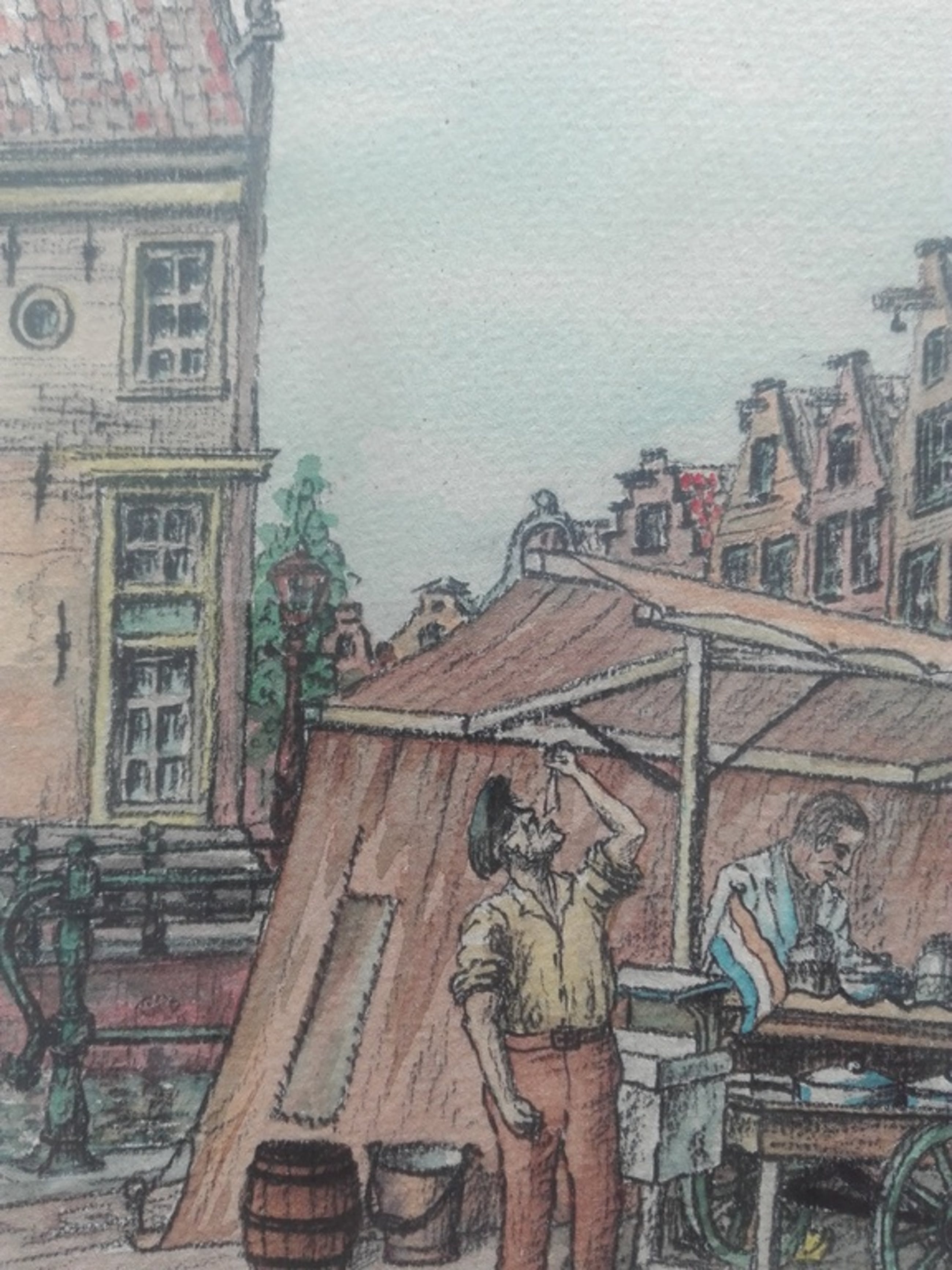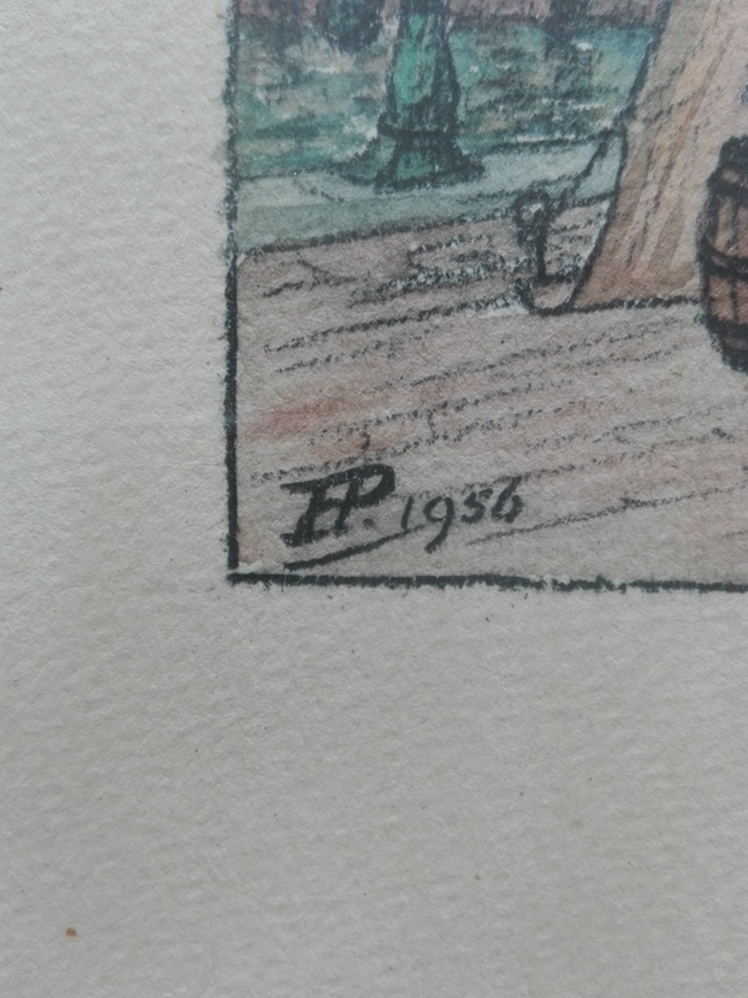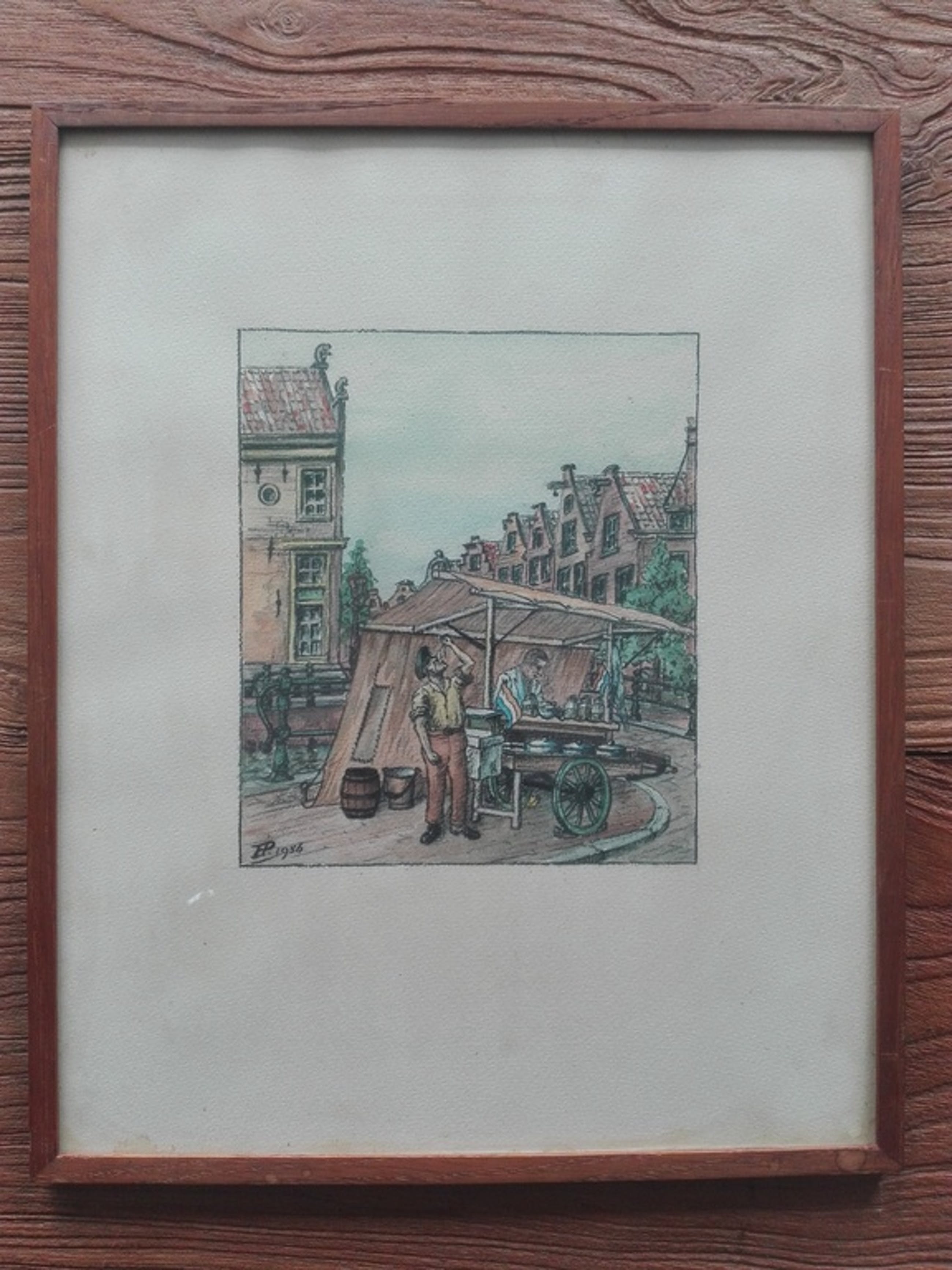 In goede staat, aquarel inclusief mooie lijst aan de randen enigszins gevlekt/vergeeld gesigneerd EP? of FP? , zie foto's.