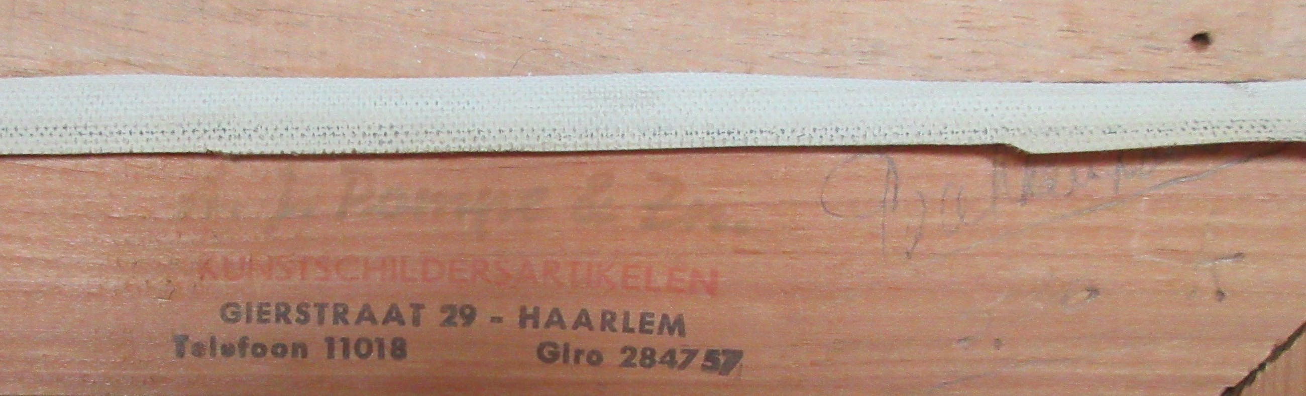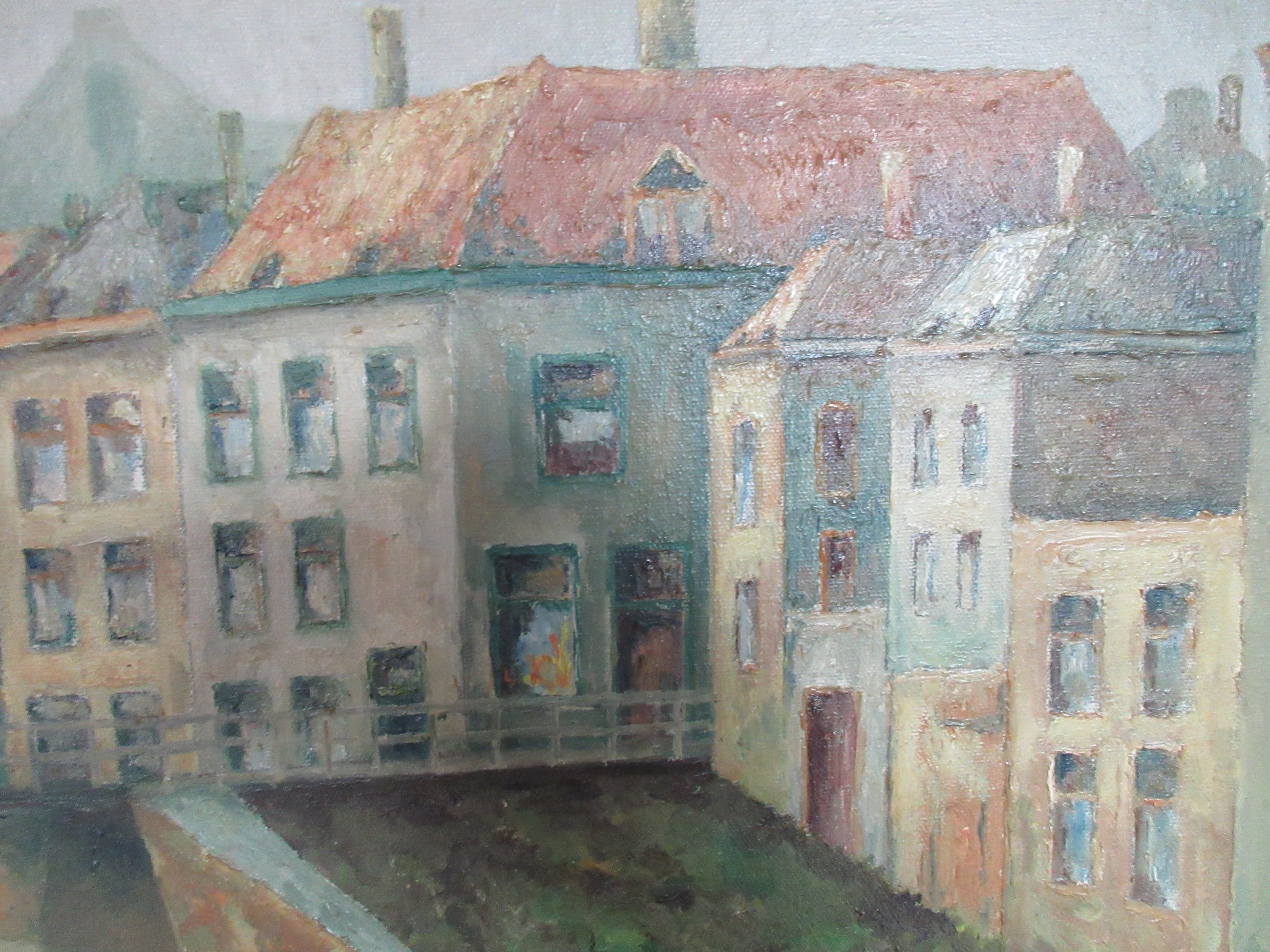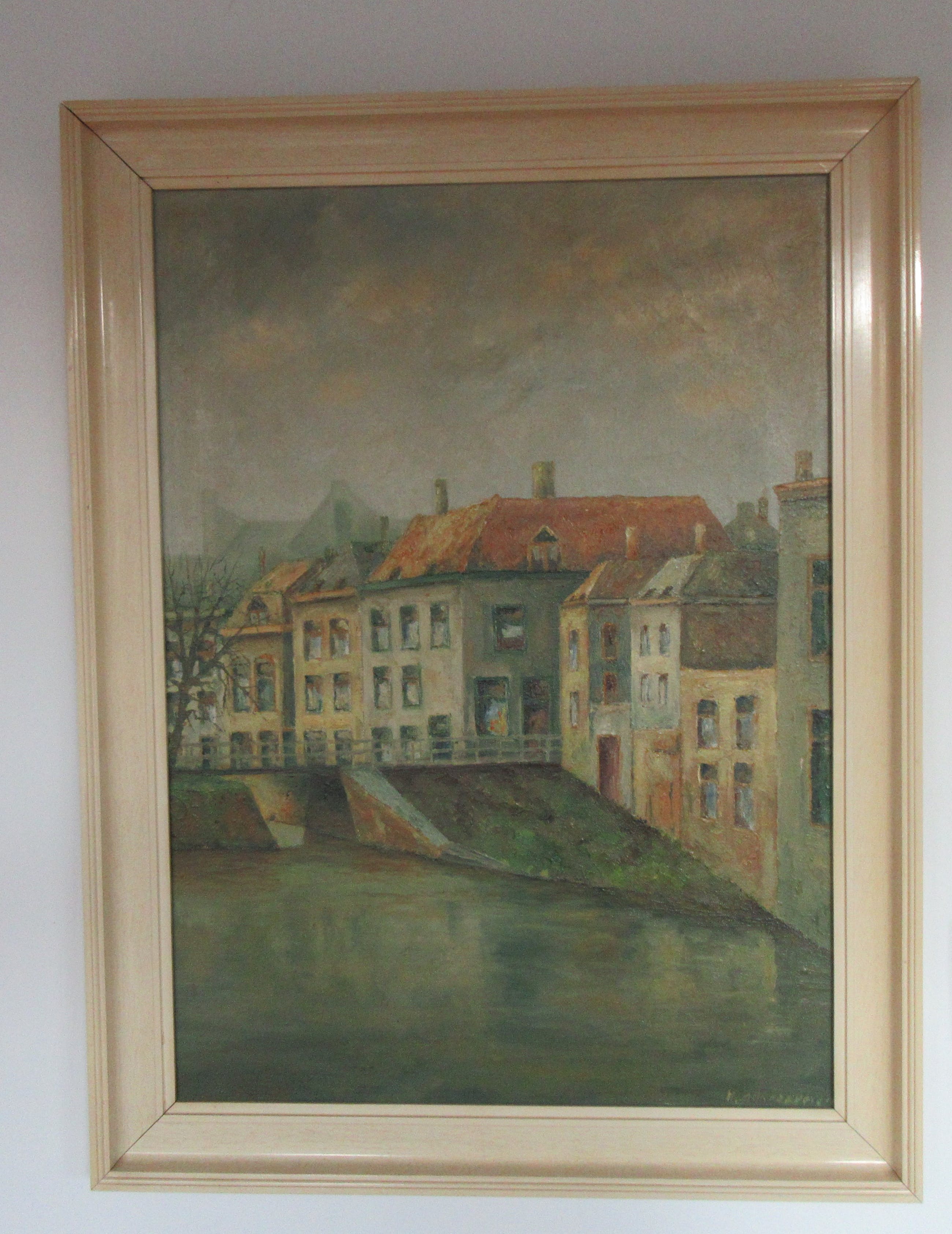 Stadsgezicht van een onbekende Hollandse stad, mogelijk Haarlem. Het schilderij is rechtsonder gesigneerd H. Bakkershaven of hoven, mij een onbekende kunstenaar. Het schilderij en de lijst zijn in zeer goede staat maar wel wat vuil, hebben in rokerige omgeving gehangen. Op de achterzijde de stempel van een oude kunsthandel uit Haarlem en met potlood nogmaals de naam van de kunstenaar. Vandaar de mogelijk verwijzing naar de stad Haarlem.