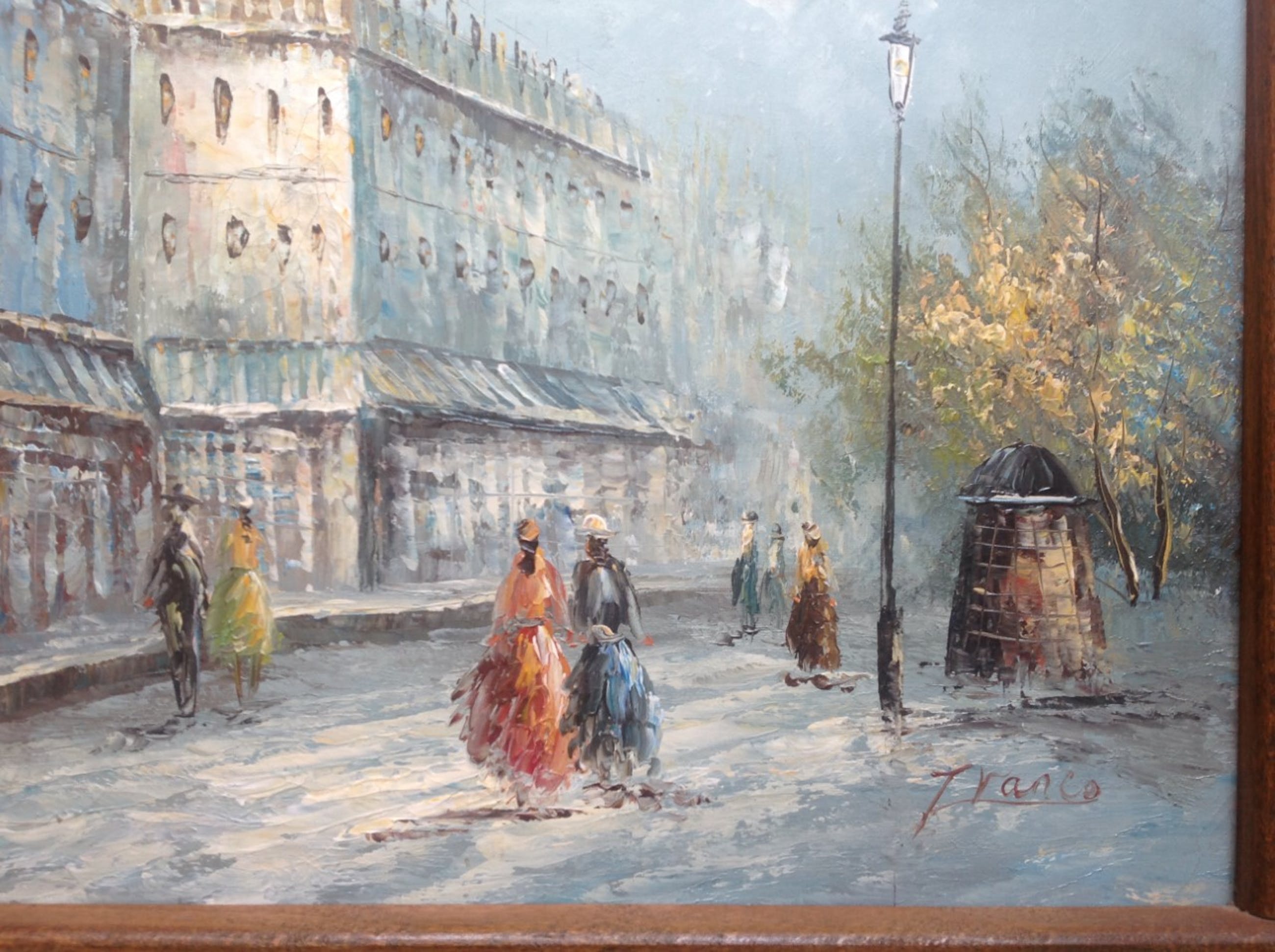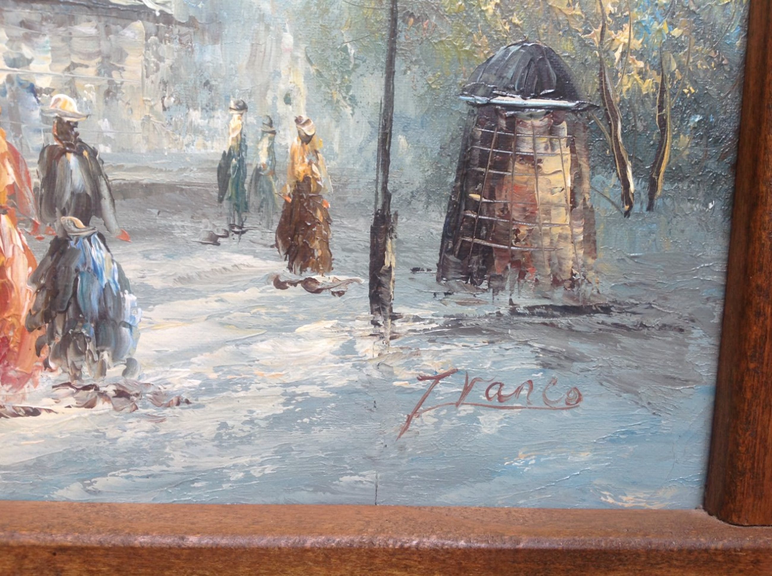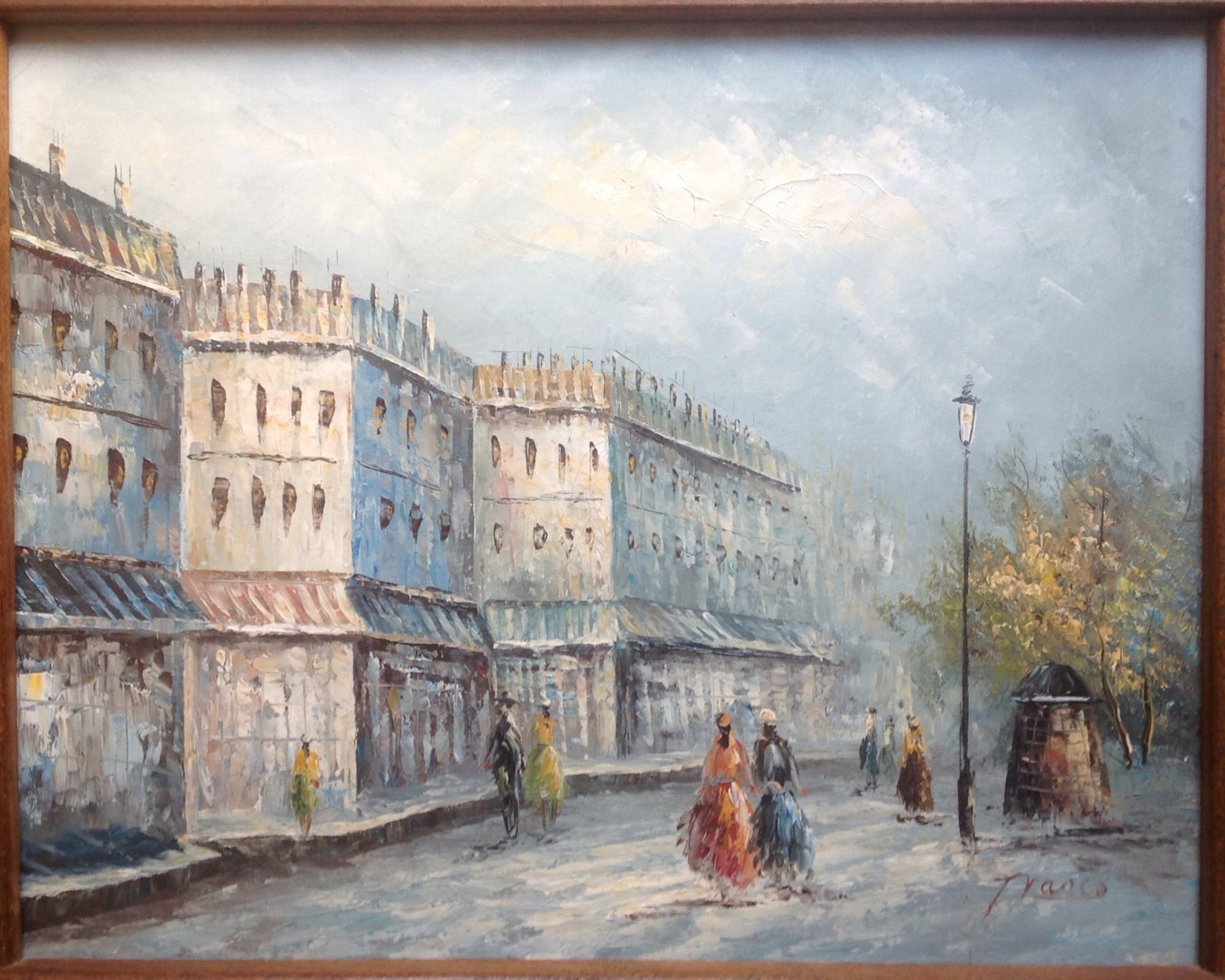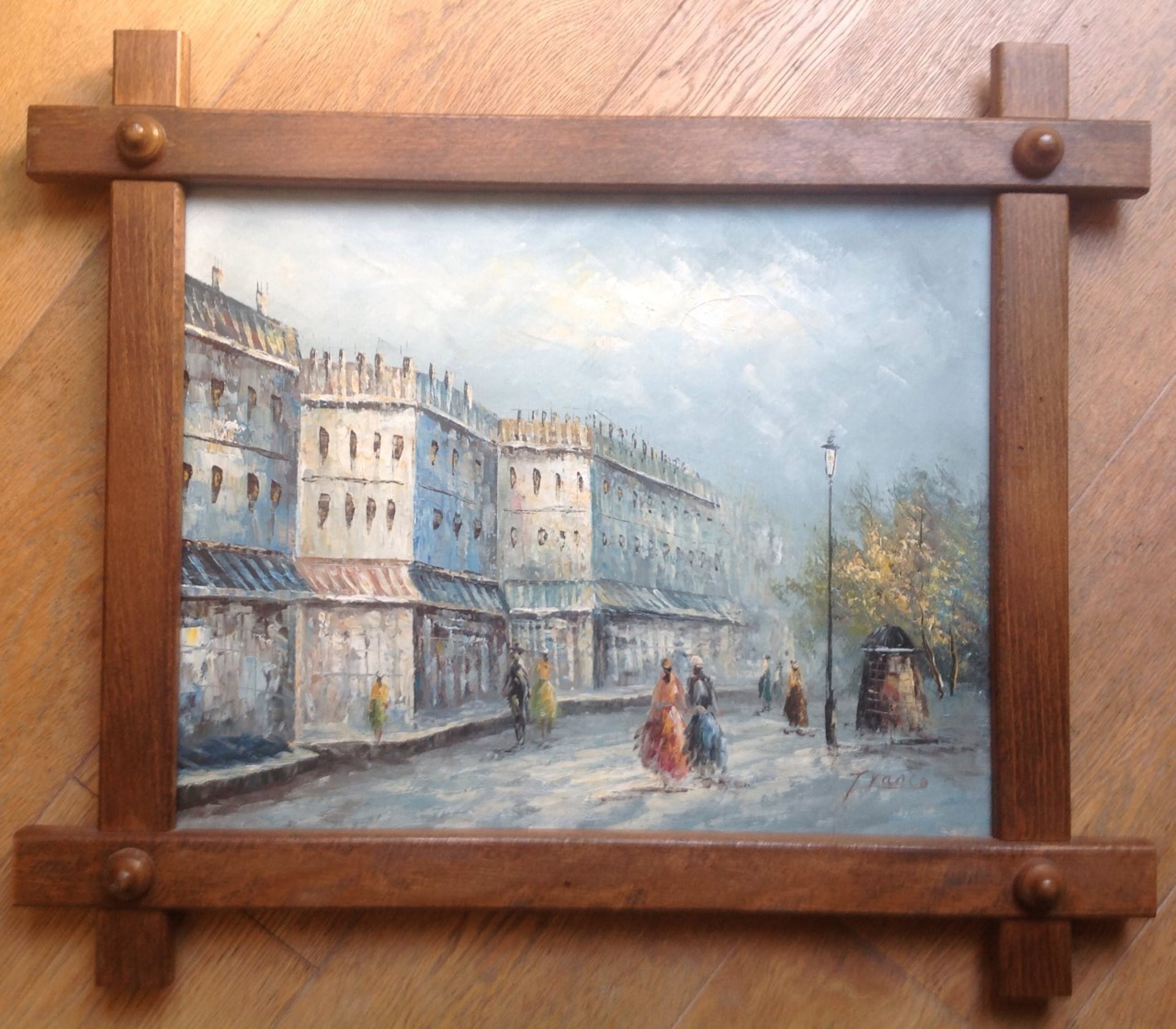 Fraai ingelijst impressionistisch stadsgezicht. Olieverf op doek.Gesigneerd, kunstenaar onbekend.