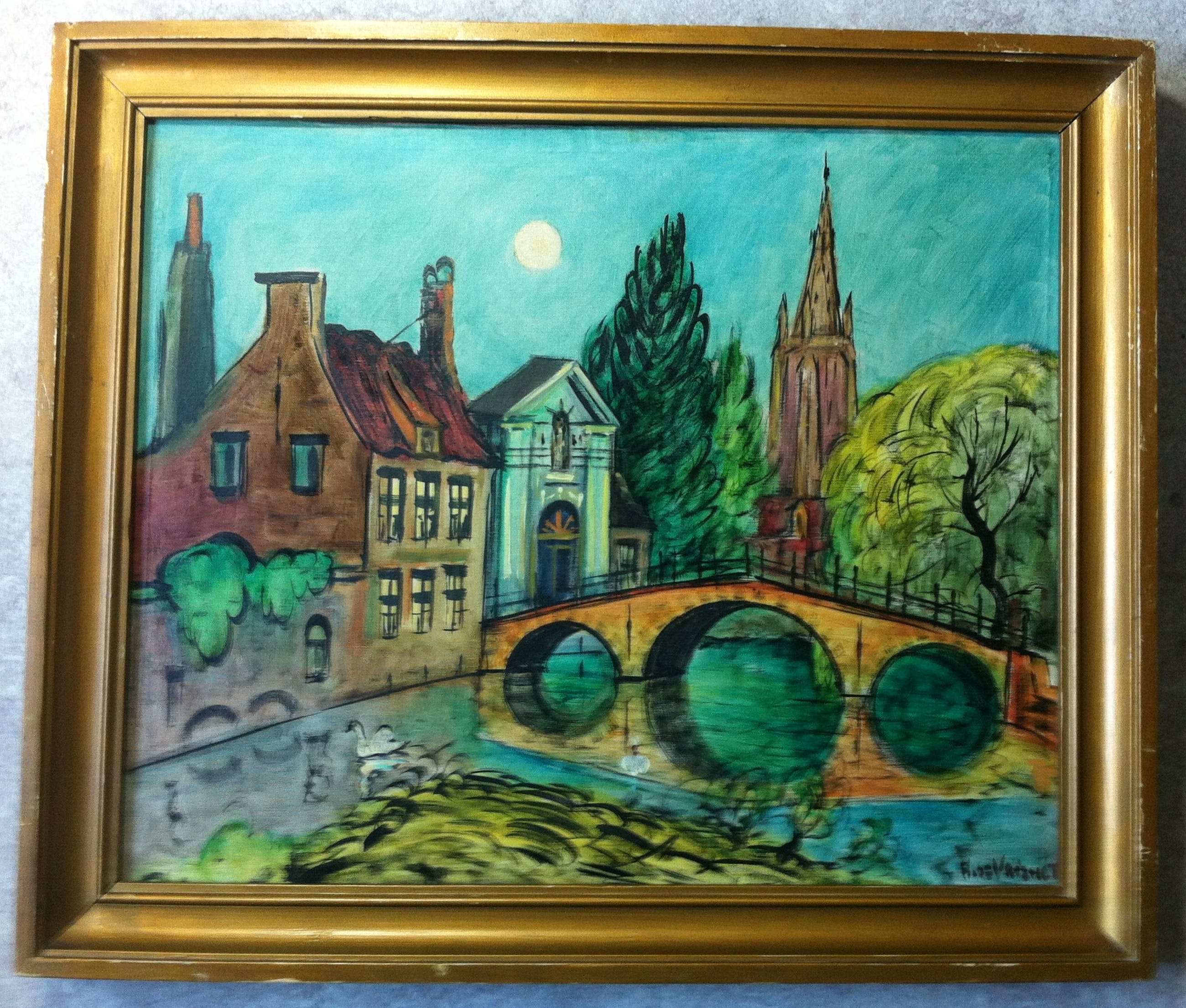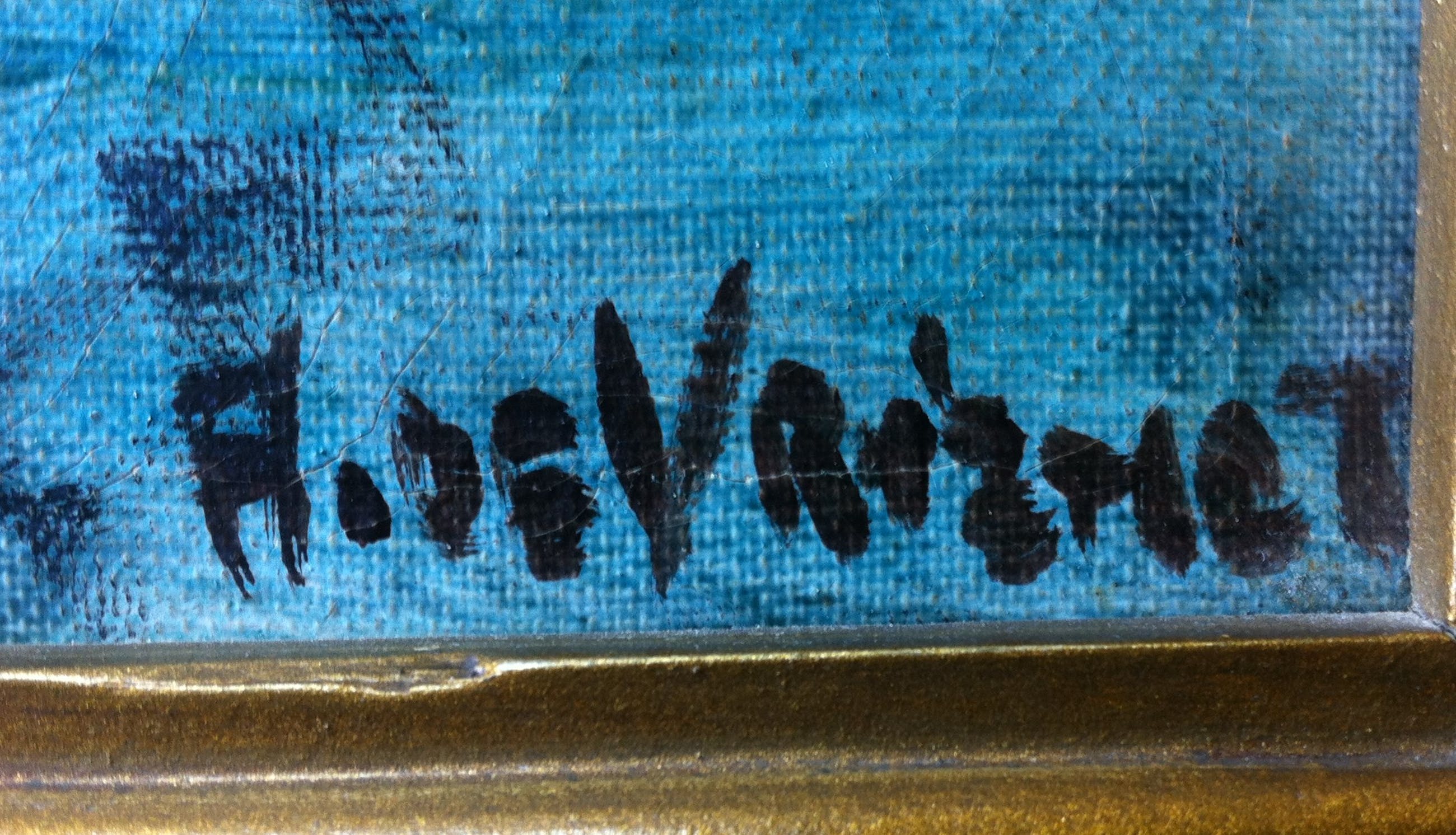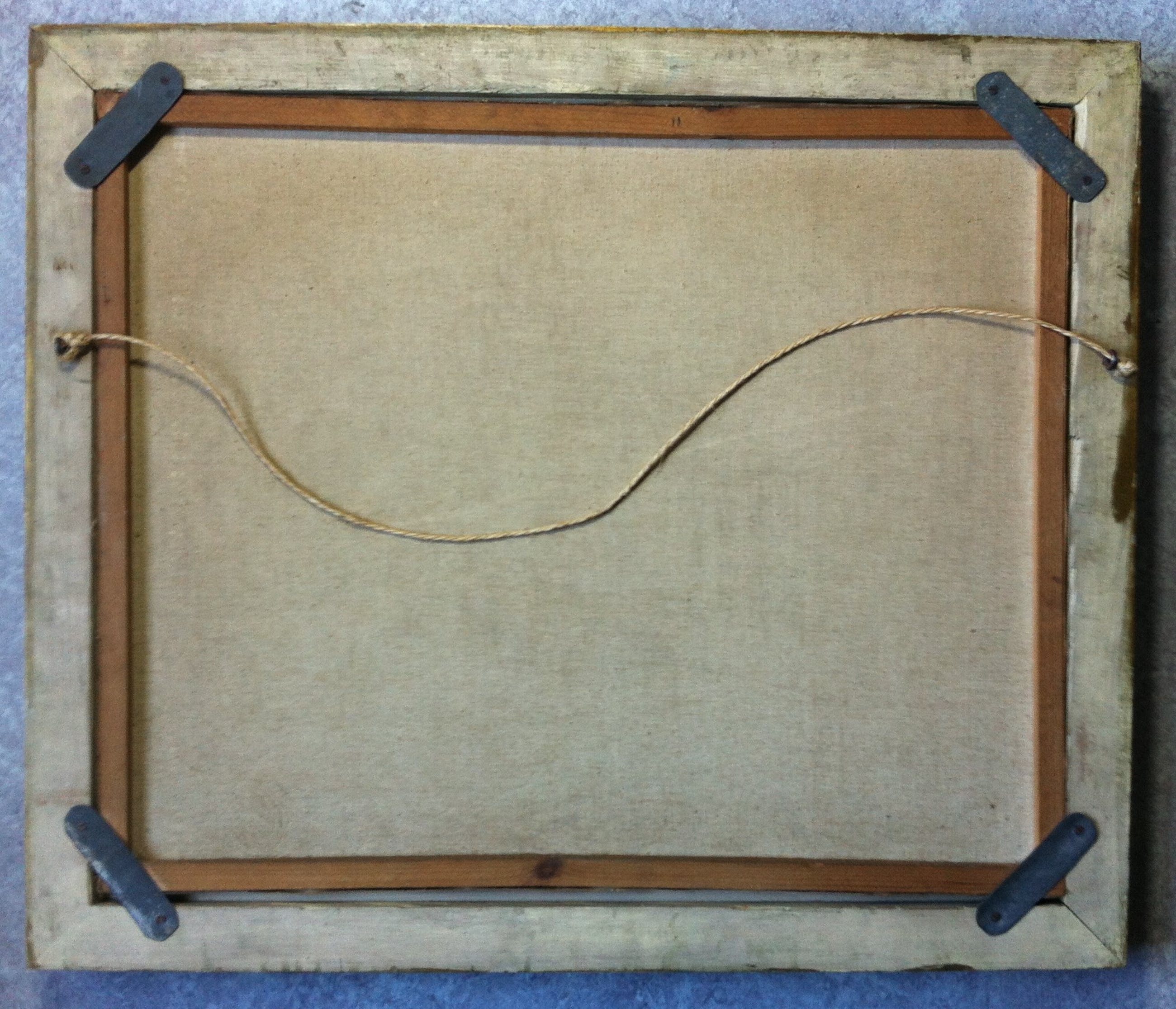 Het doek is in goede staat. De lijst heeft gebruikssporen.