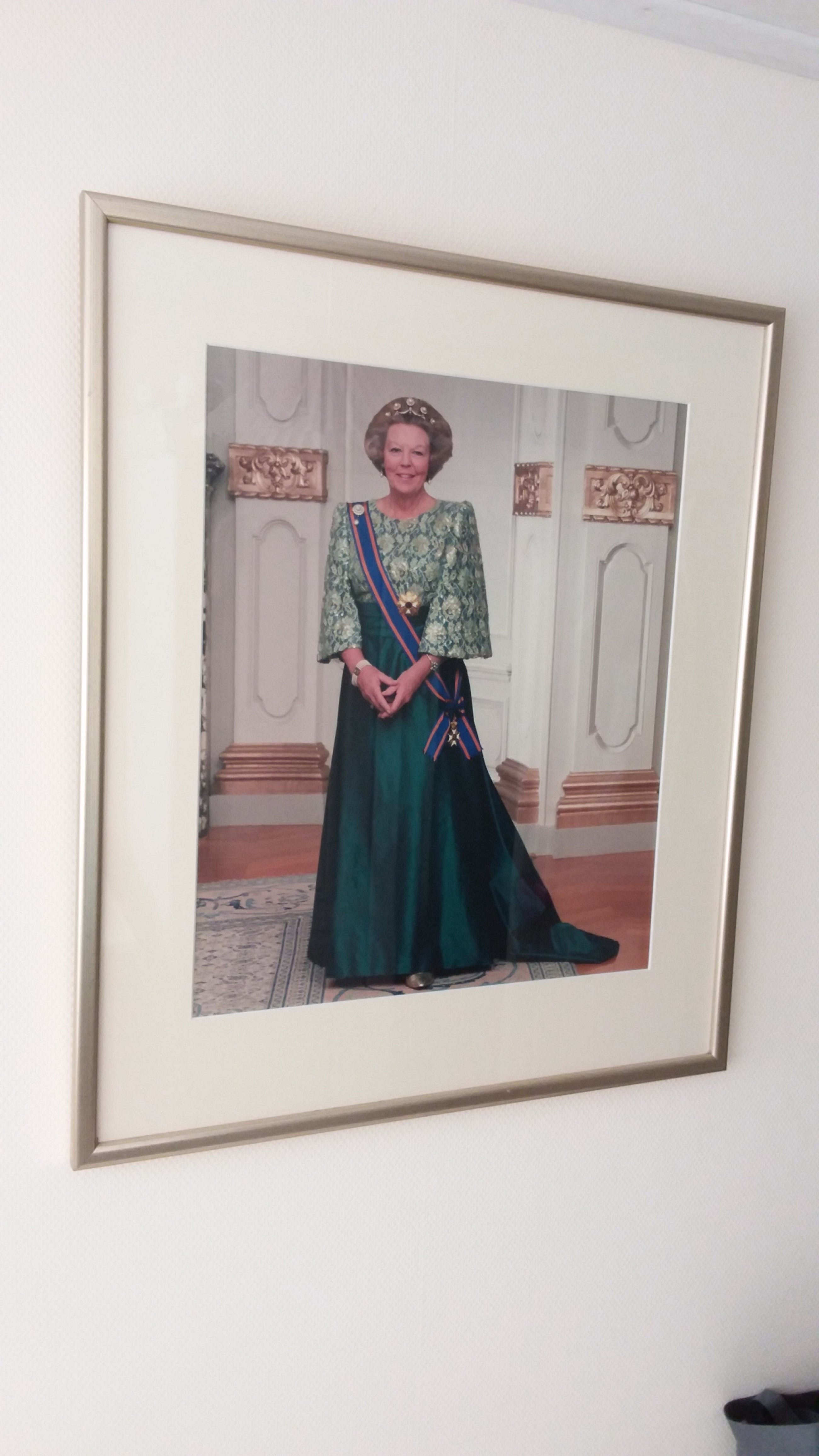 Statieportret van H.M. Koningin Beatrix,  Koningin der Nederlanden.  ingelijst in een passe-partout en een vergulde hardhouten lijstwerk, statieportret is achter glas geplaatst.