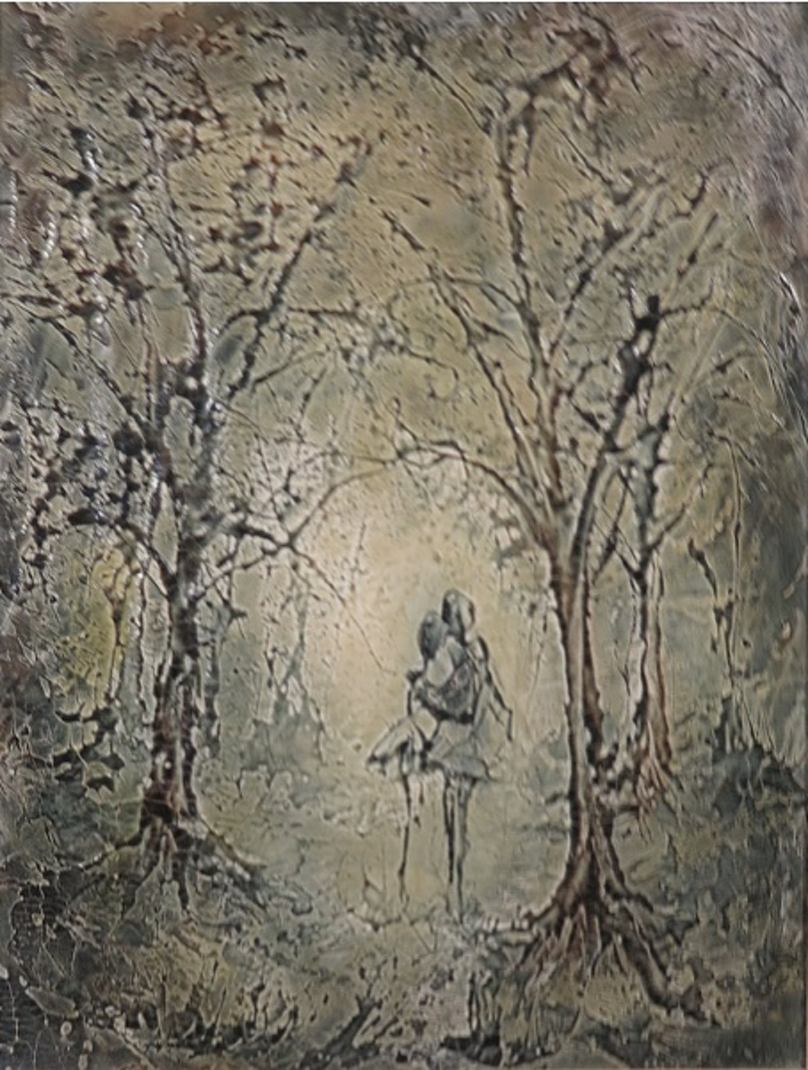 Stelletje in het bos. Mooi schilderij waarin een mooi reliëf zichtbaar is. Wel wat lichte golving in de prent.