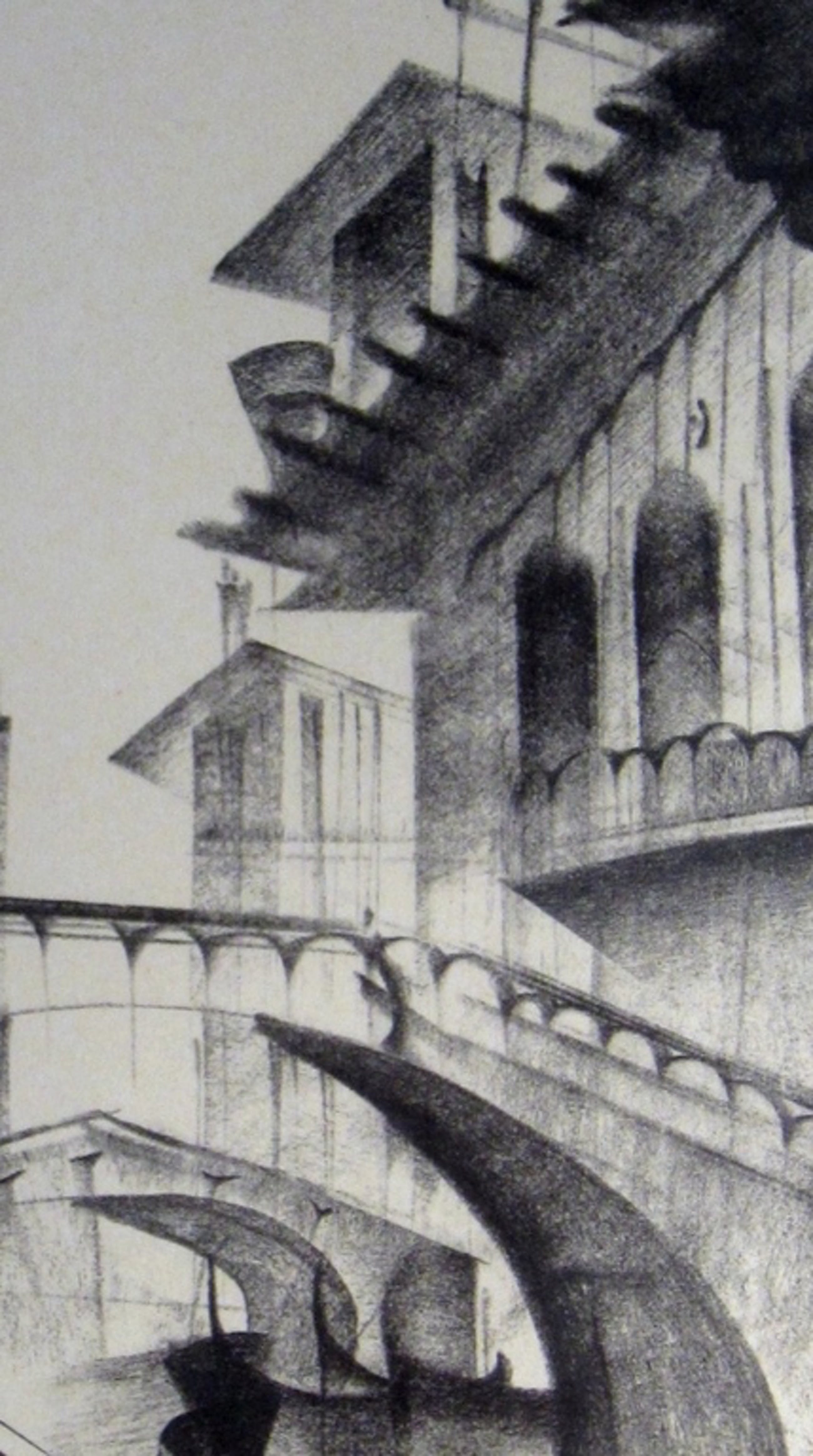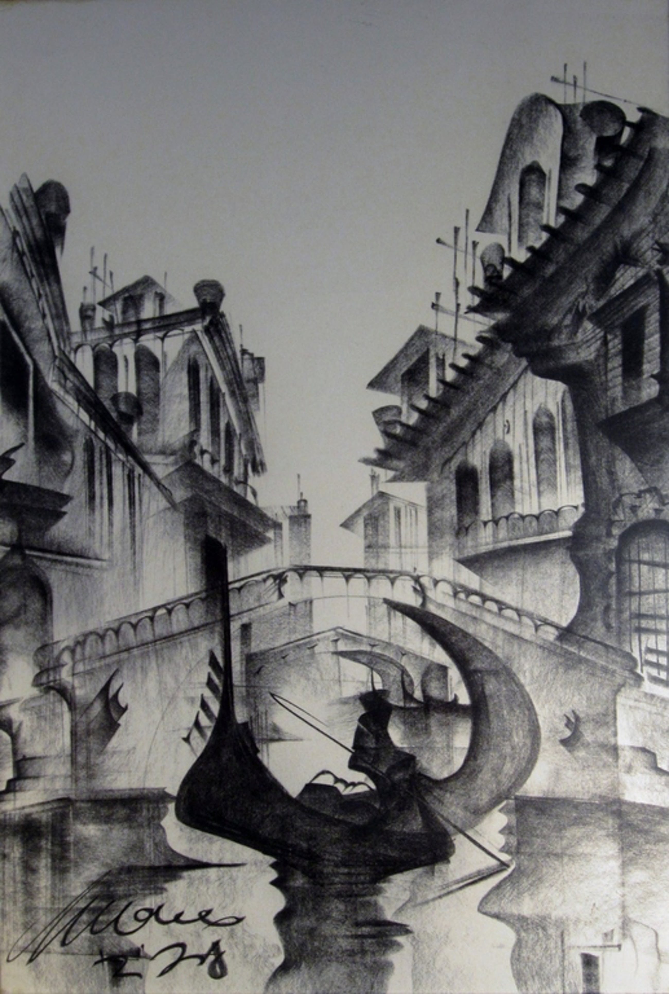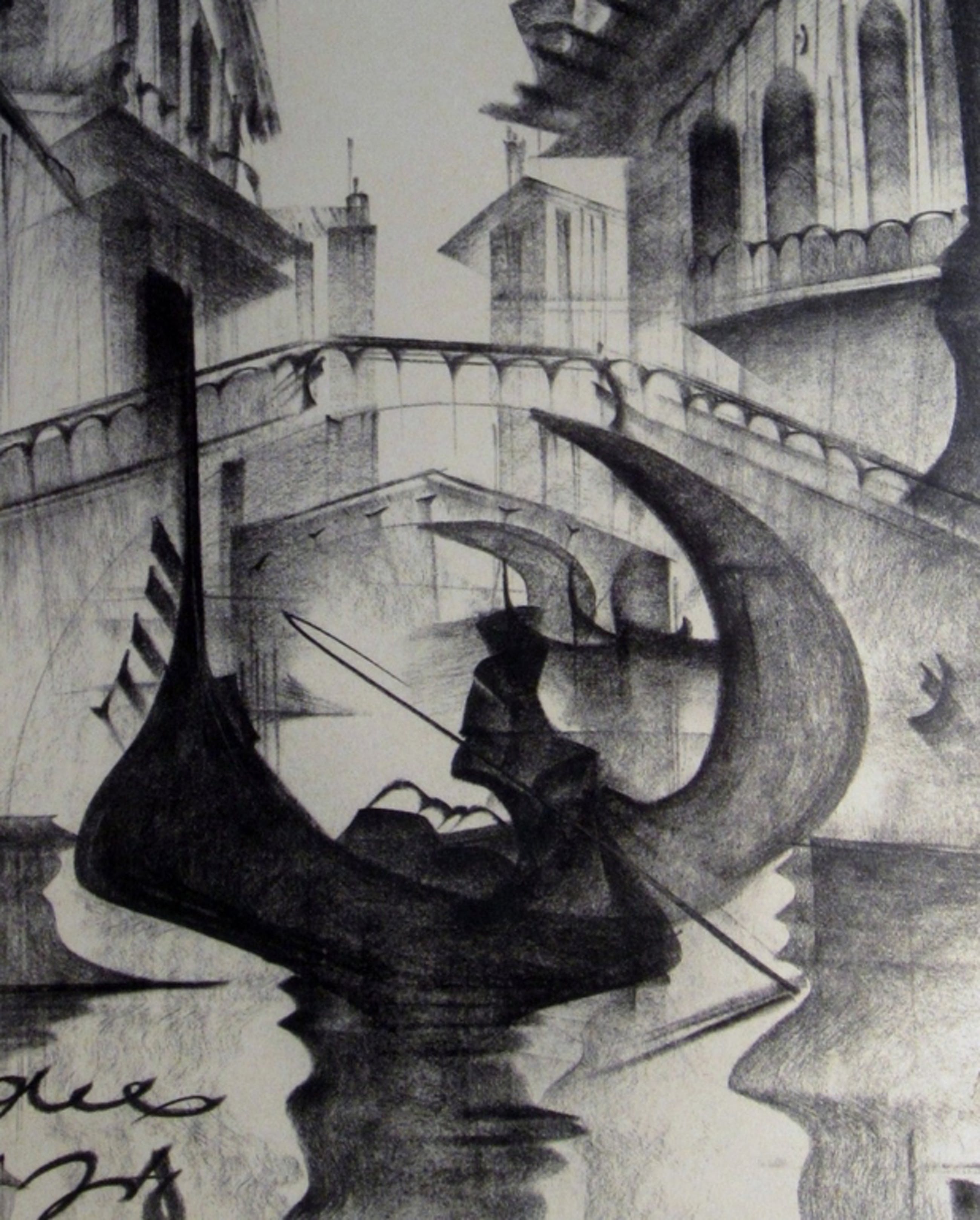 Sterke houtskooltekening met een voorstelling van Venetië.