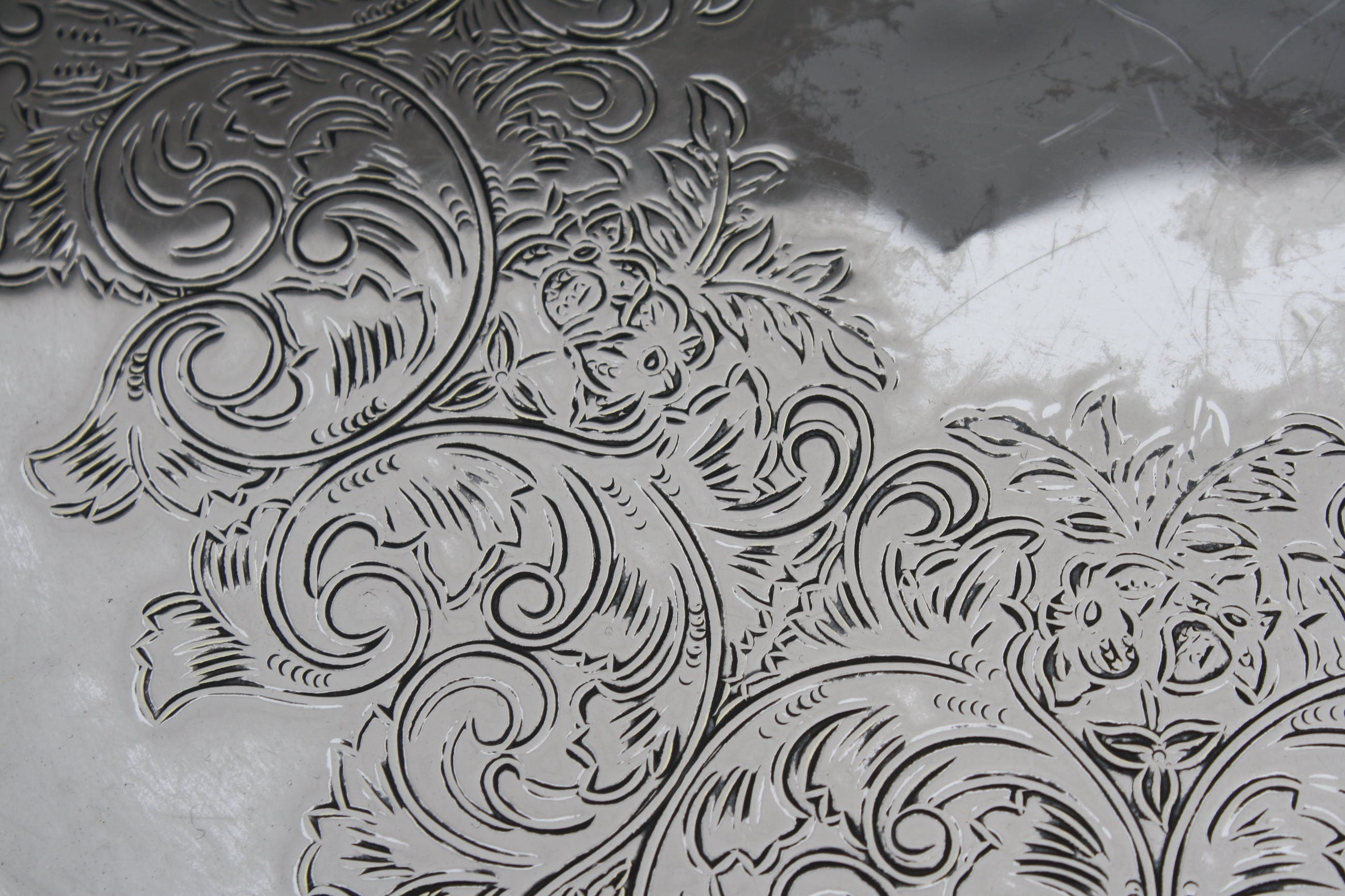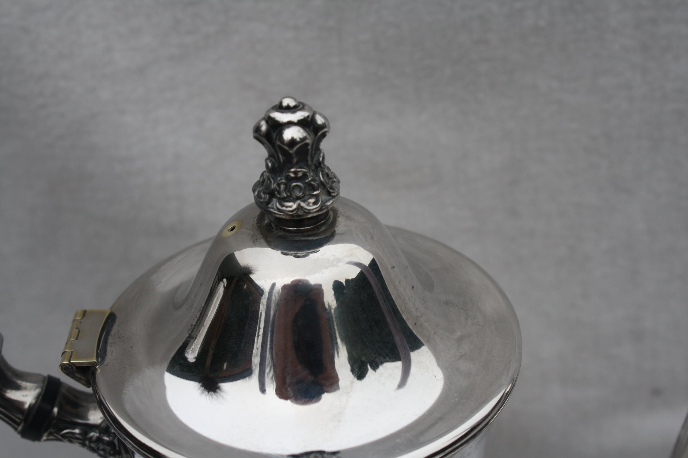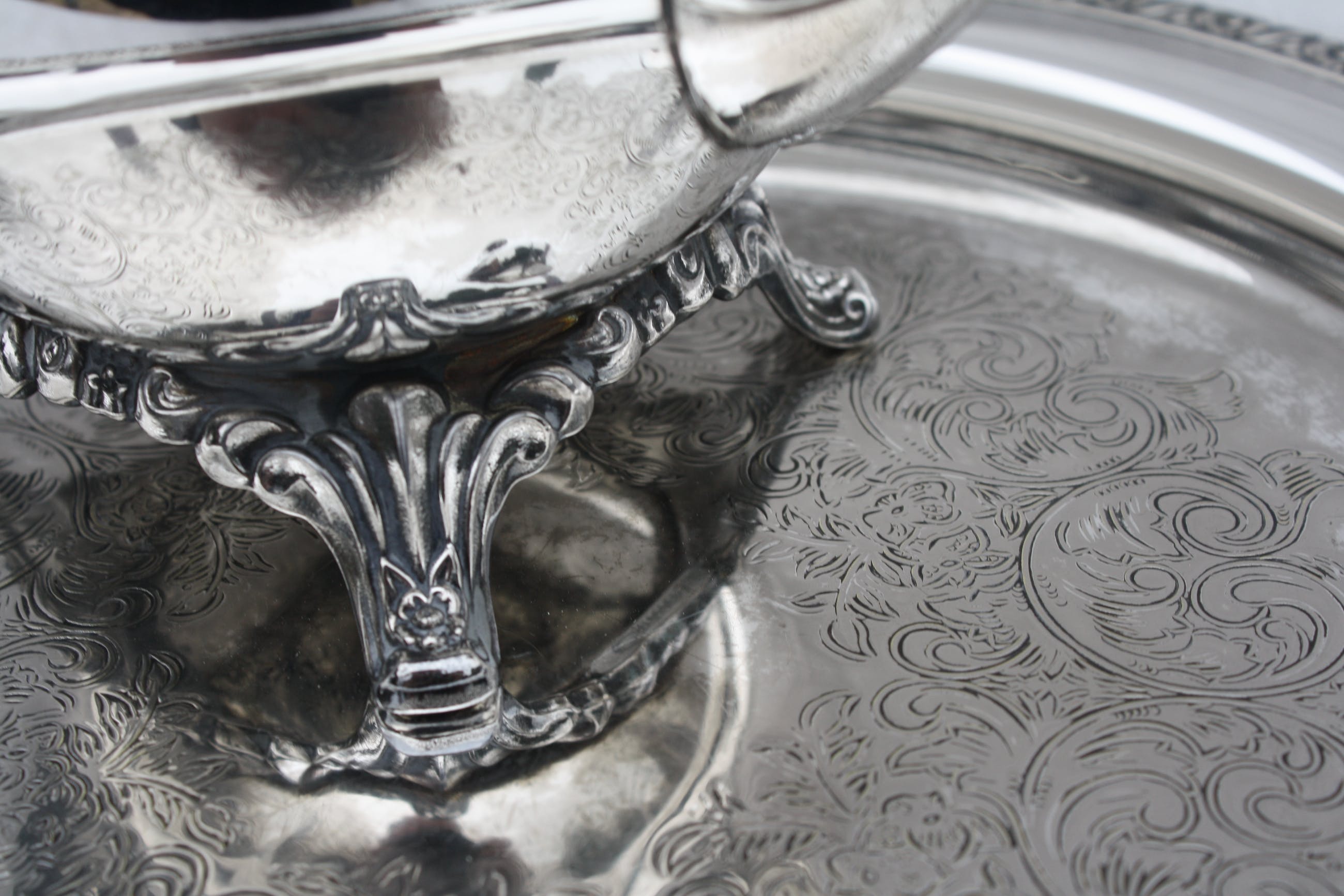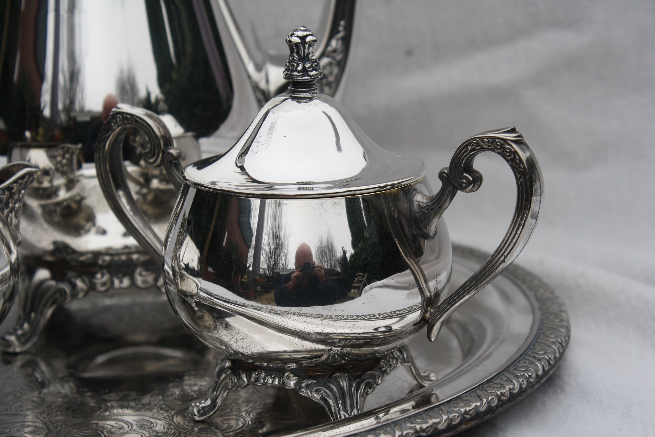 Zwaar Verzilverde Koffieset Oneida USA Silver Plate Gemerkt aan de onderzijde,inclusief mooi gedecoreerd met De hand Gecicileerd dienblad.