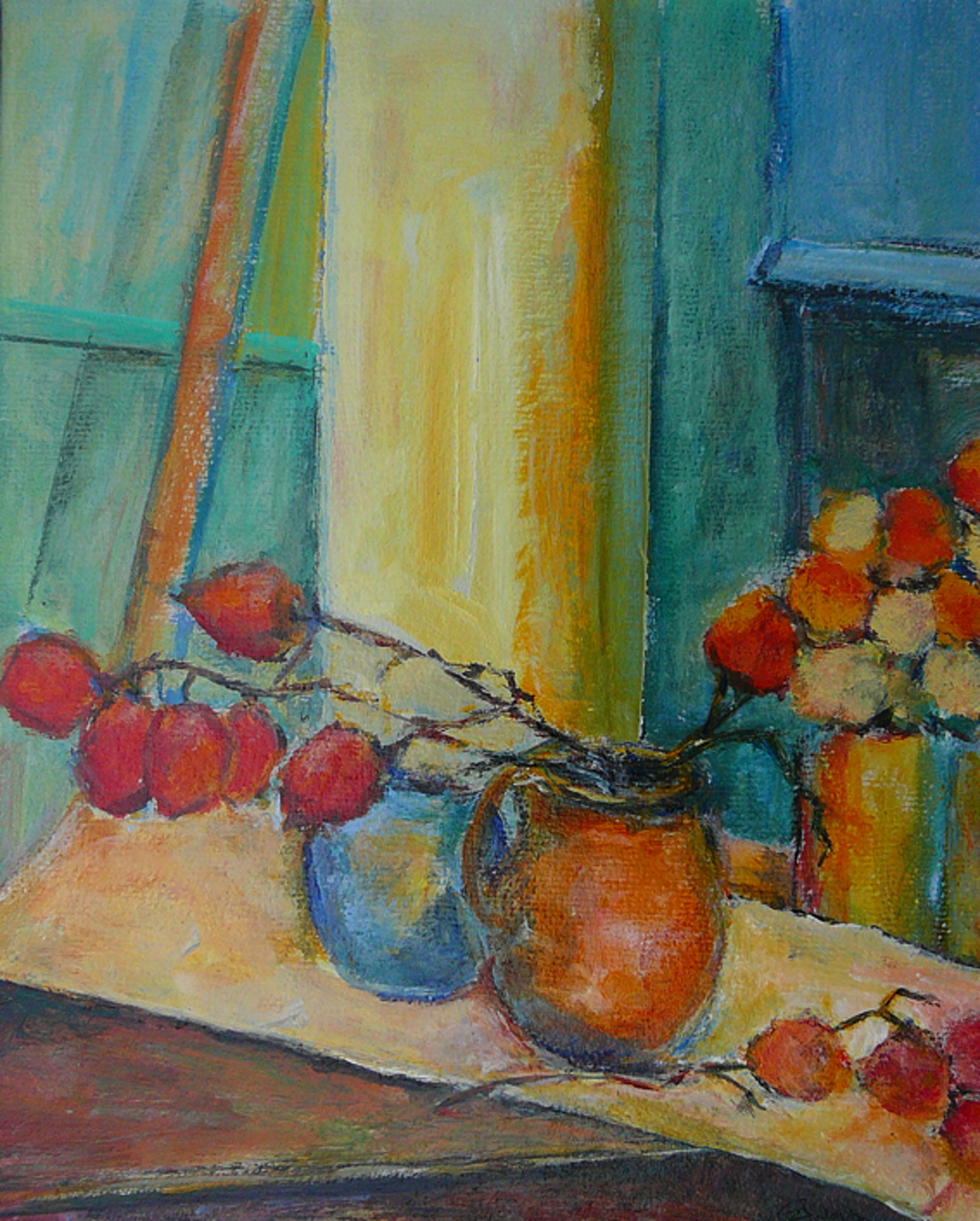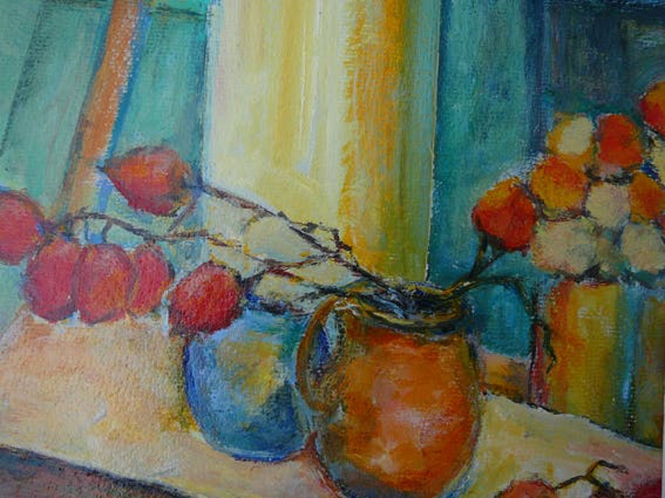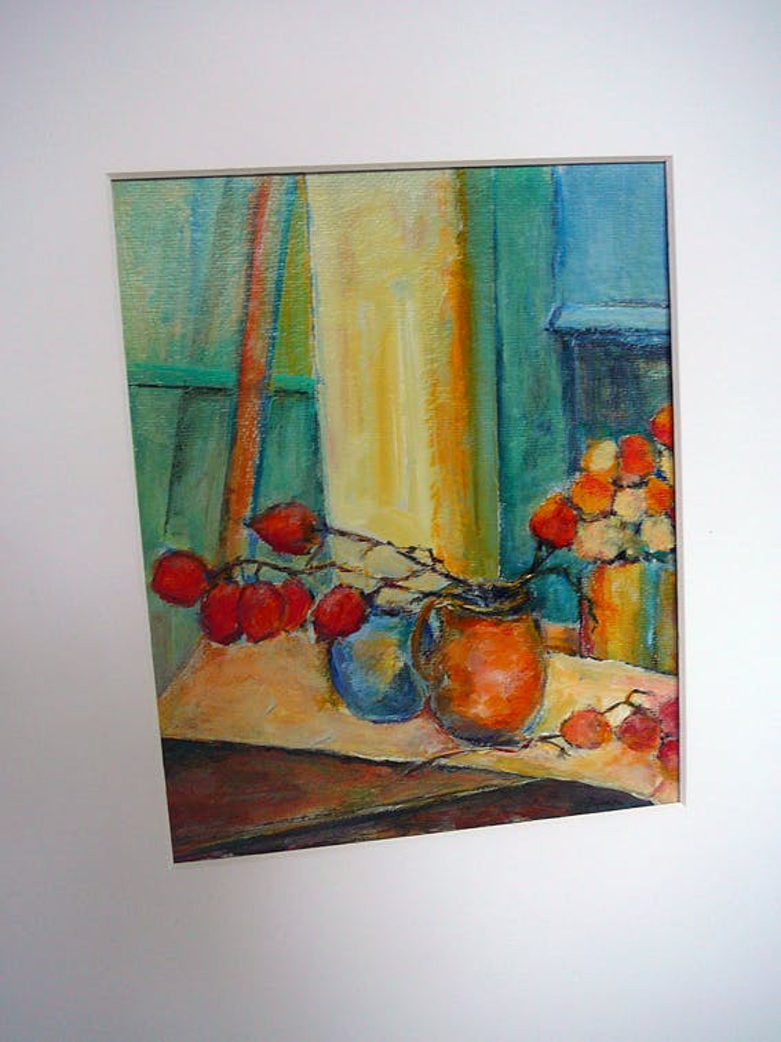 Fraai modern en fris stilleven van een mij onbekende kunstenaar. Het werk is rechtsonder (helaas) onleesbaar gesigneerd. In wissellijst achter glas in staat van nieuw.