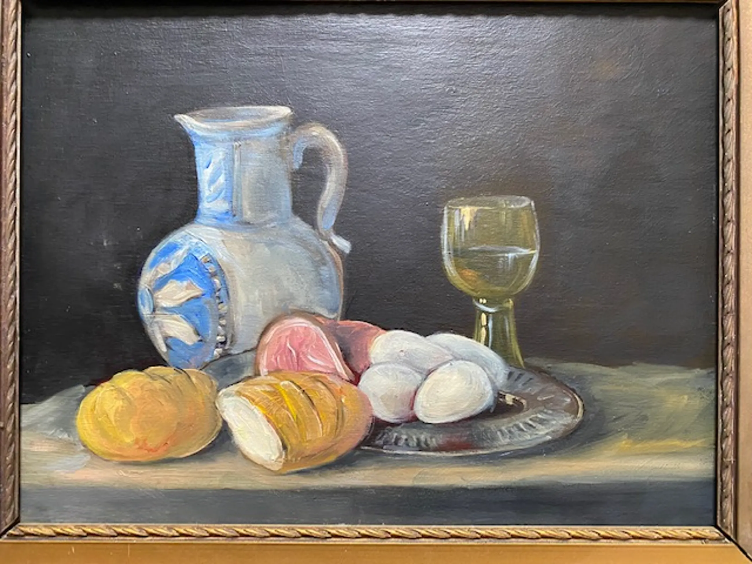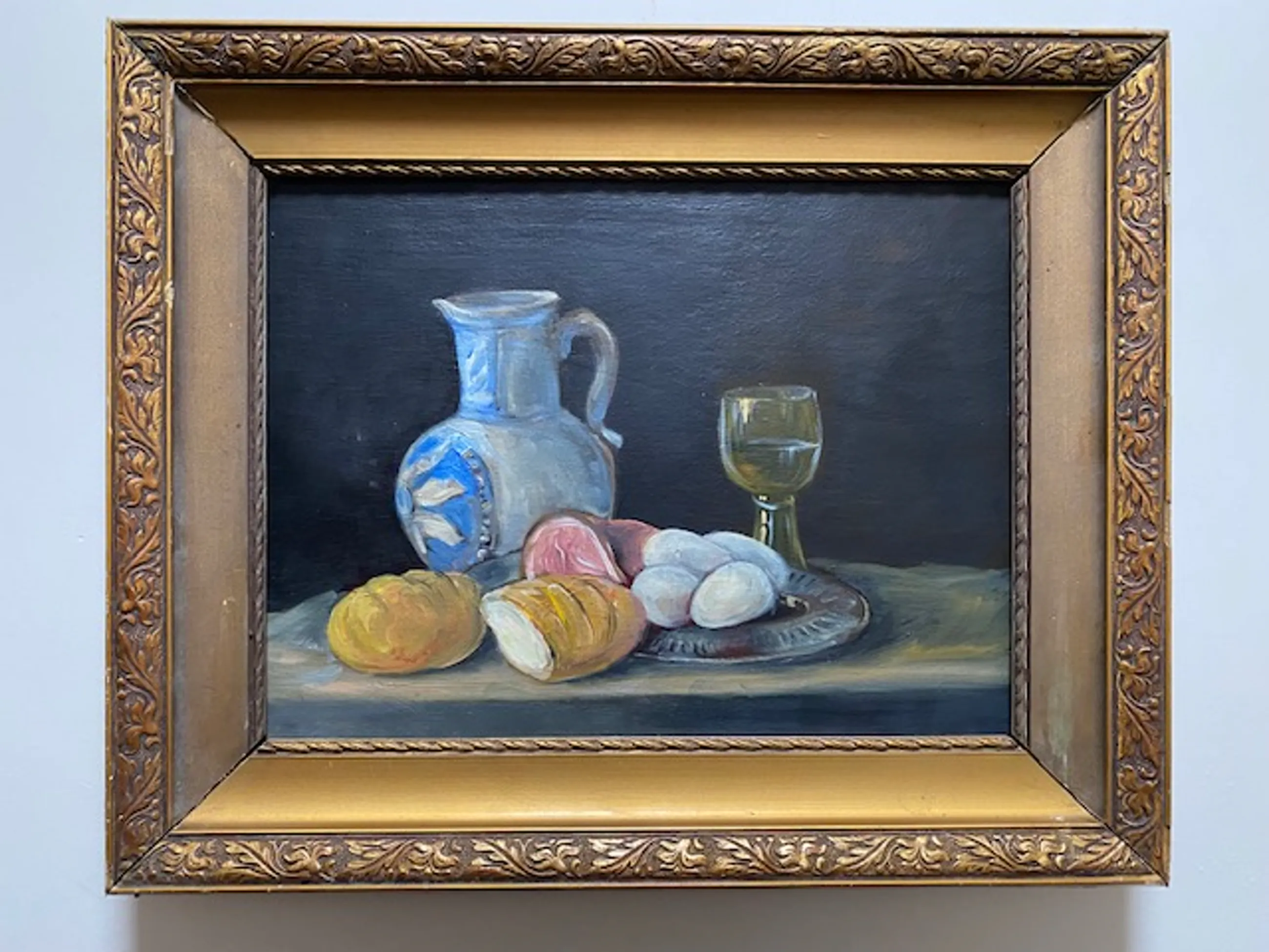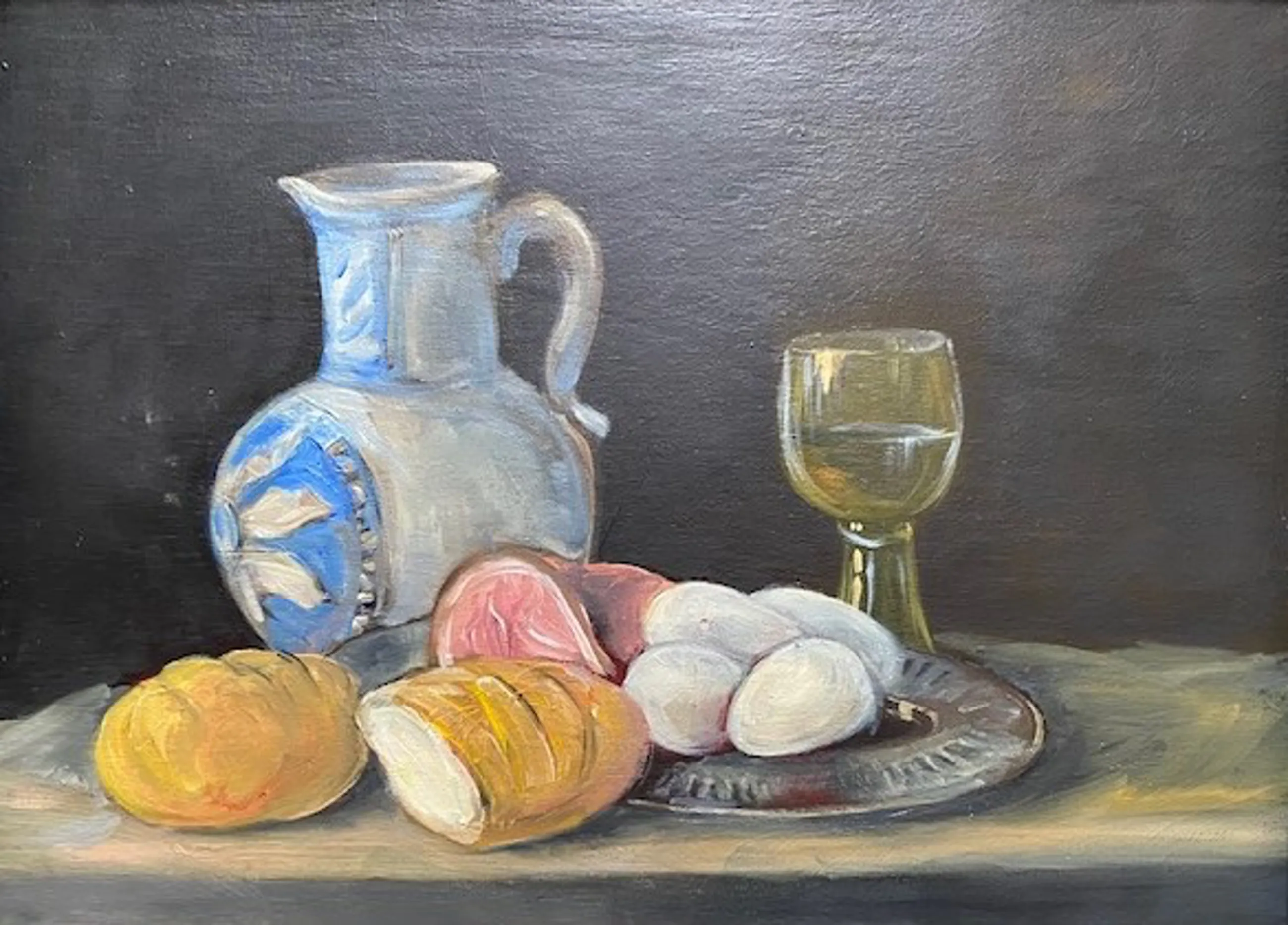 een realistisch stilleven met een wijnglas, brood en eieren alsmede een kruik