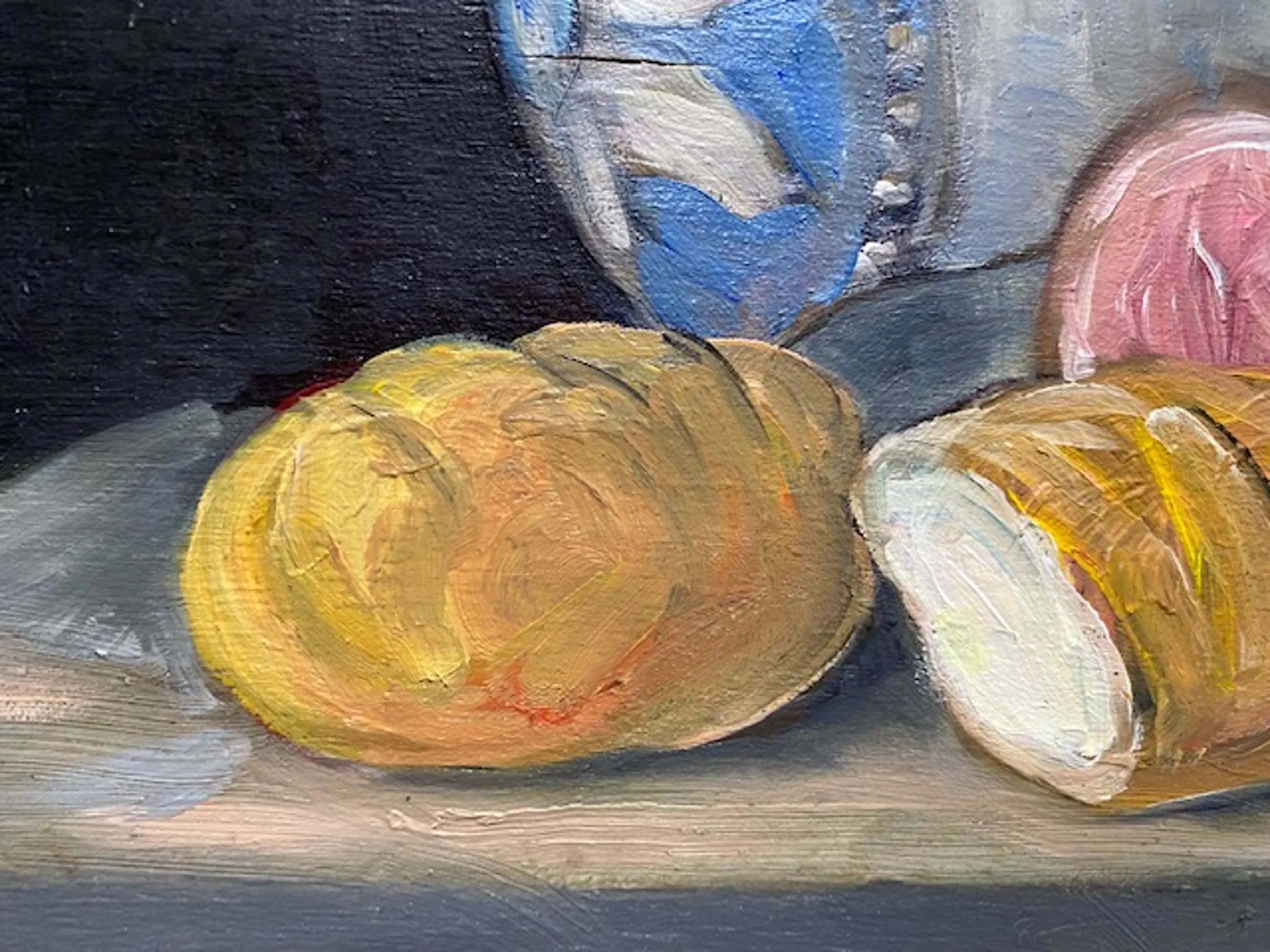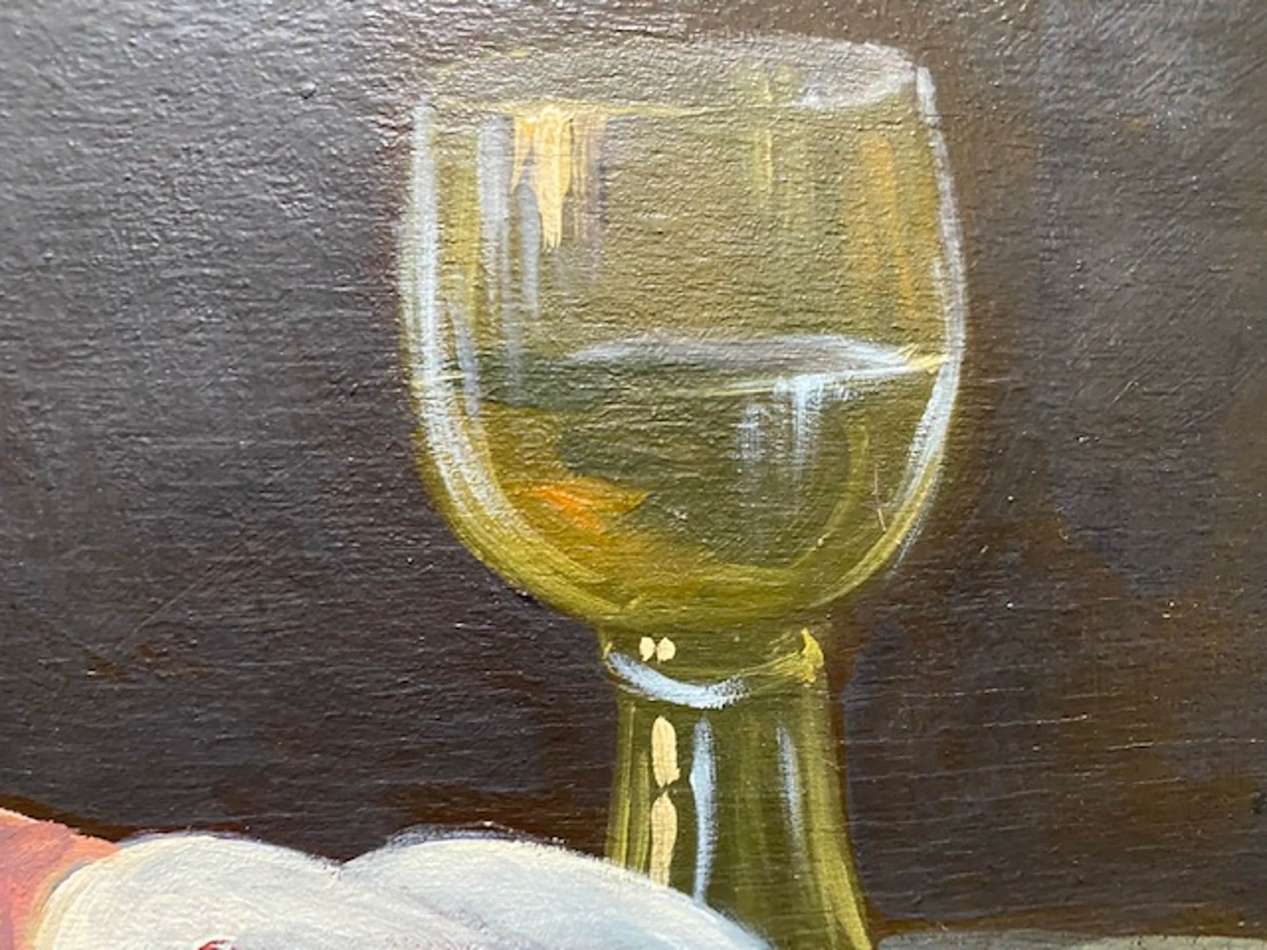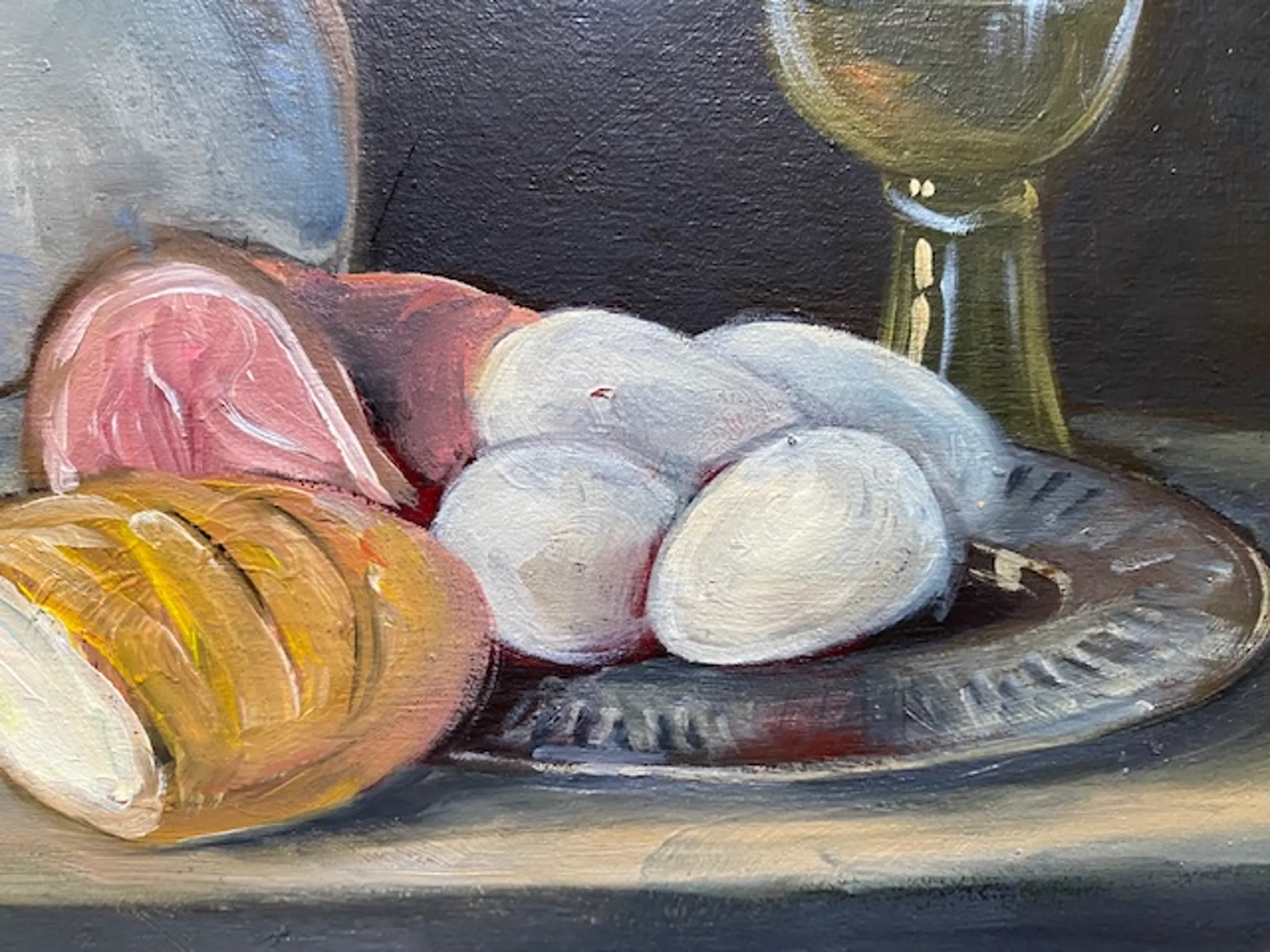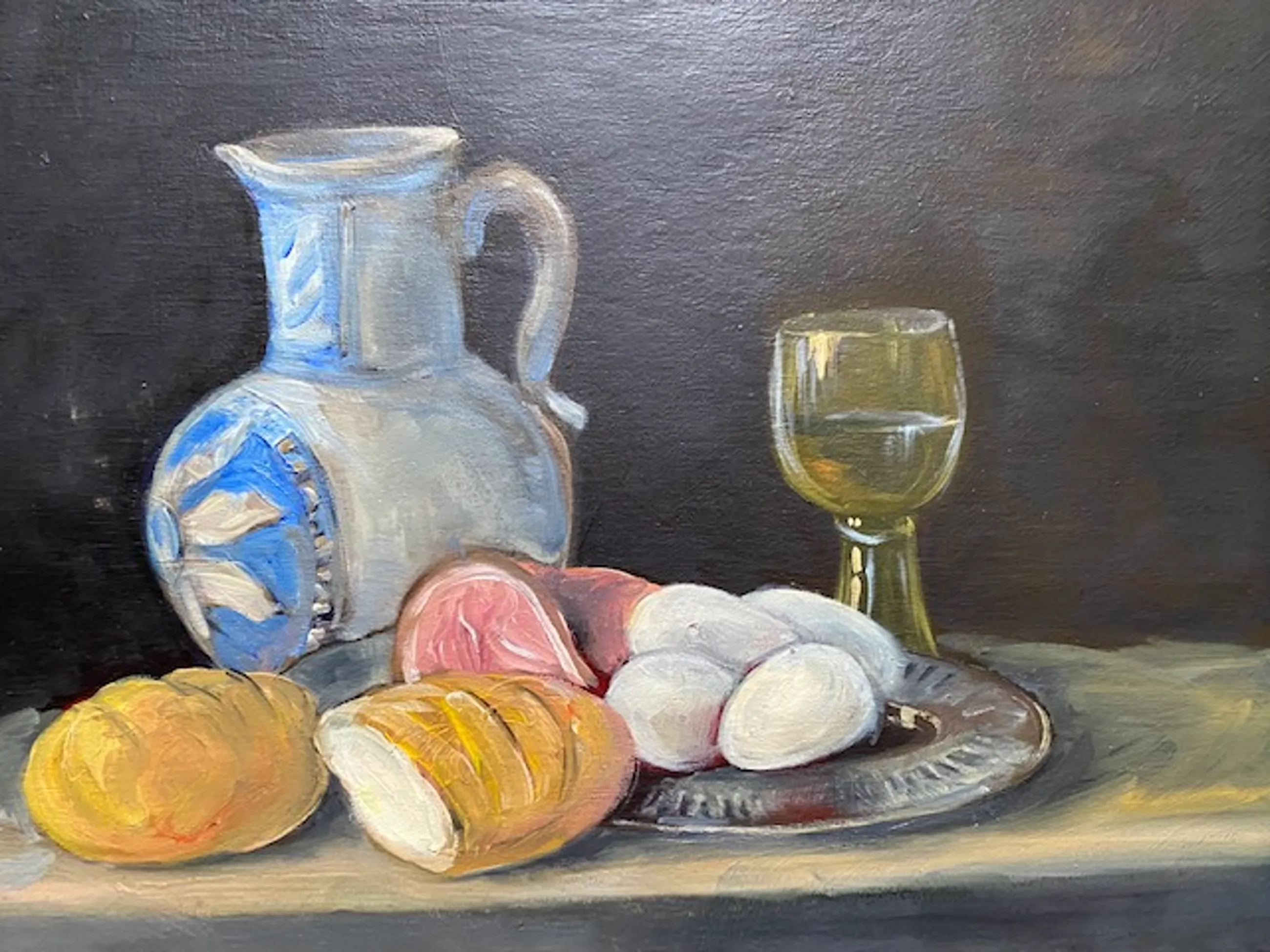 een realistisch stilleven met een wijnglas, brood en eieren alsmede een kruik