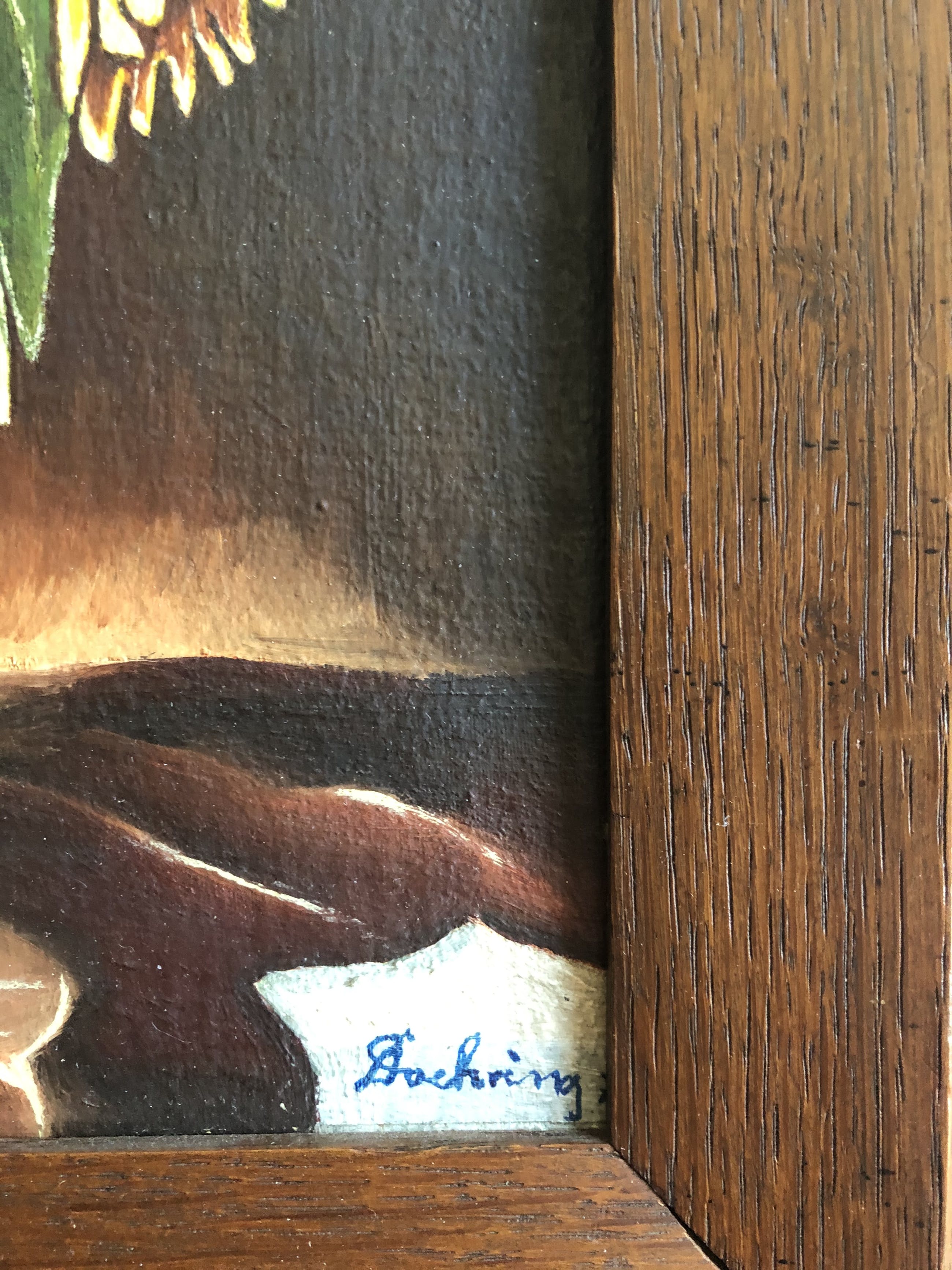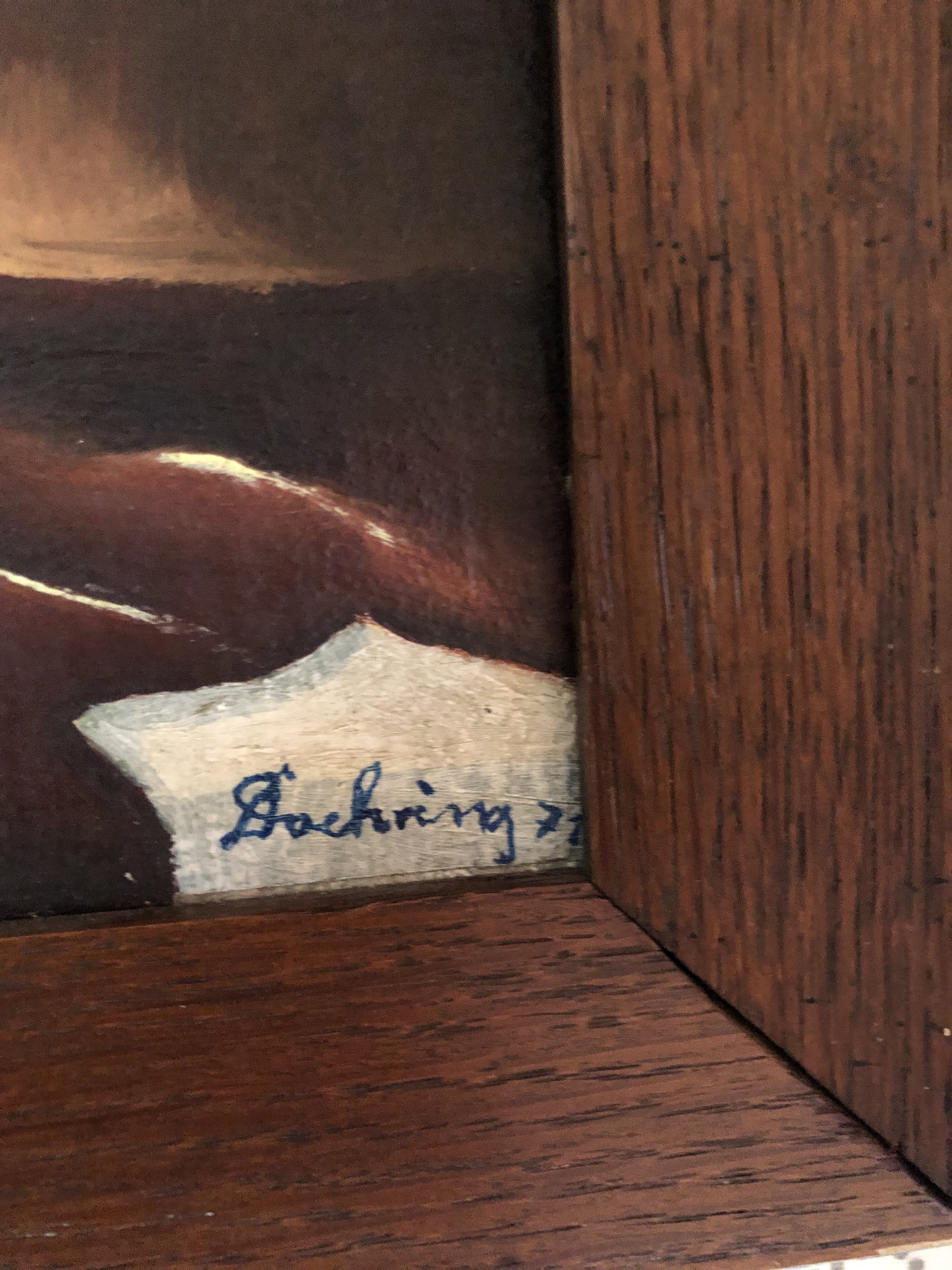 Rechts onderin gesigneerd met Doekring of Boekring. Er lijkt een jaartal achter te staan. Er is een 7 zichtbaar en daarna een 1 (?), dus 1971?