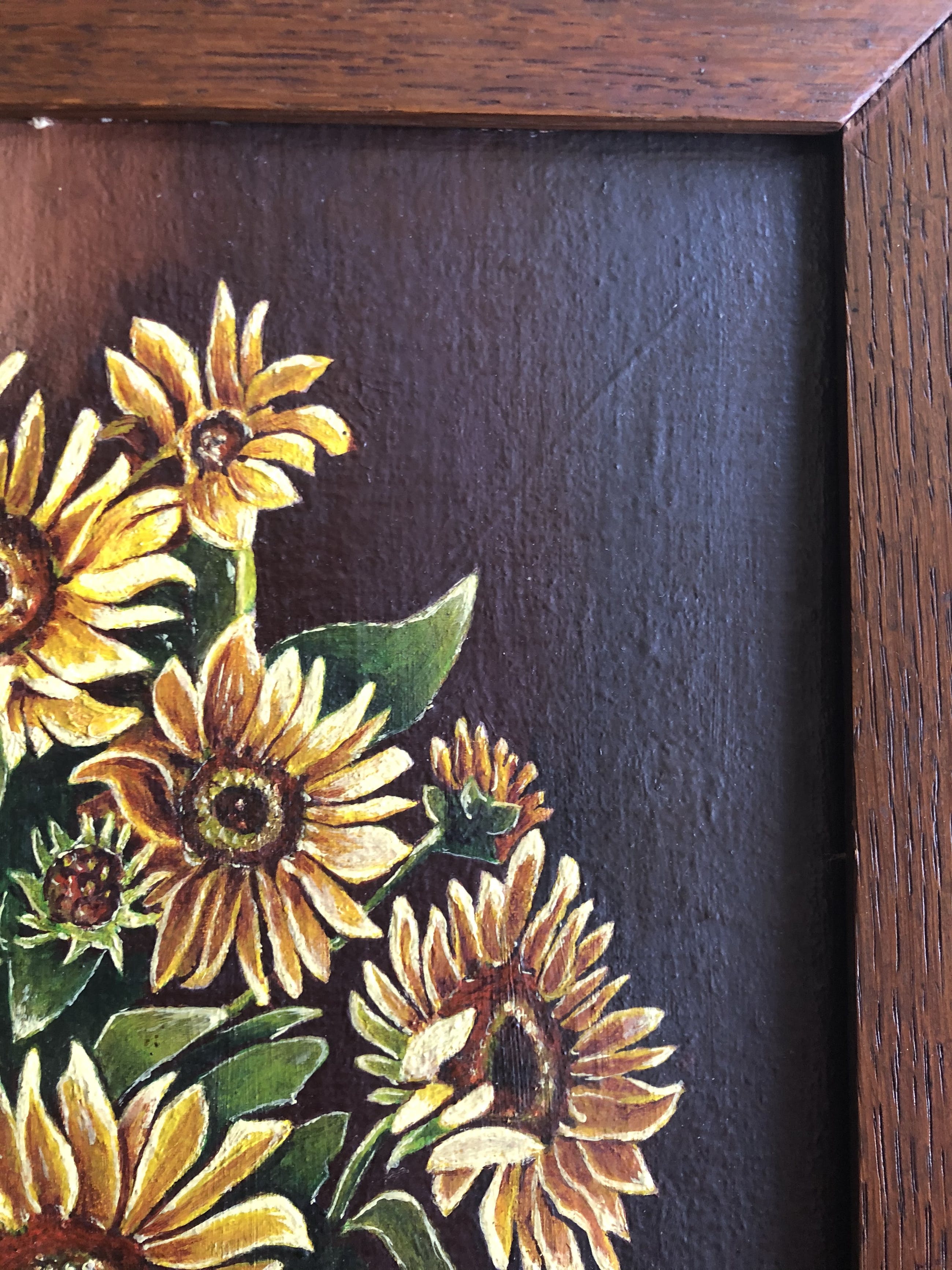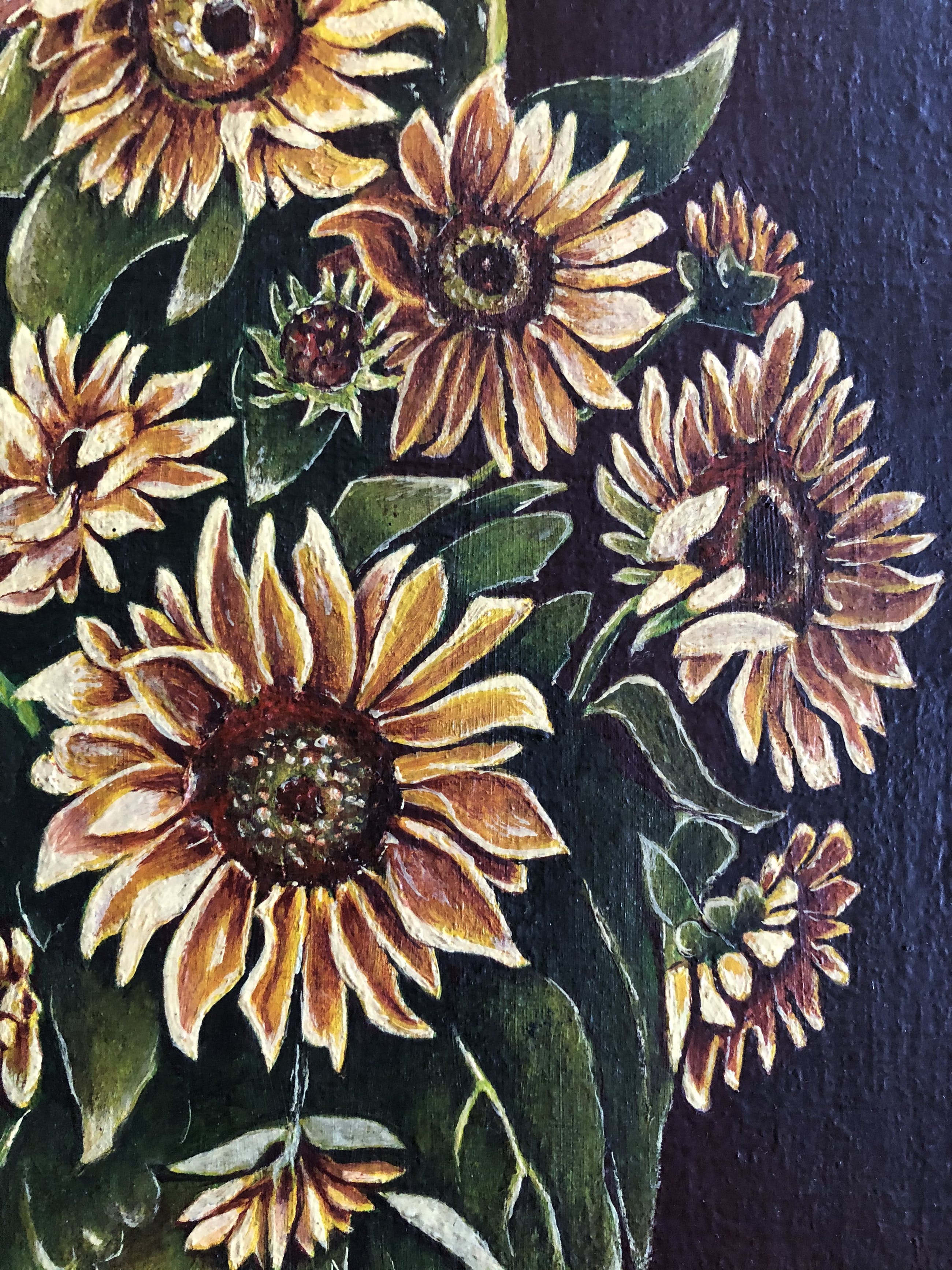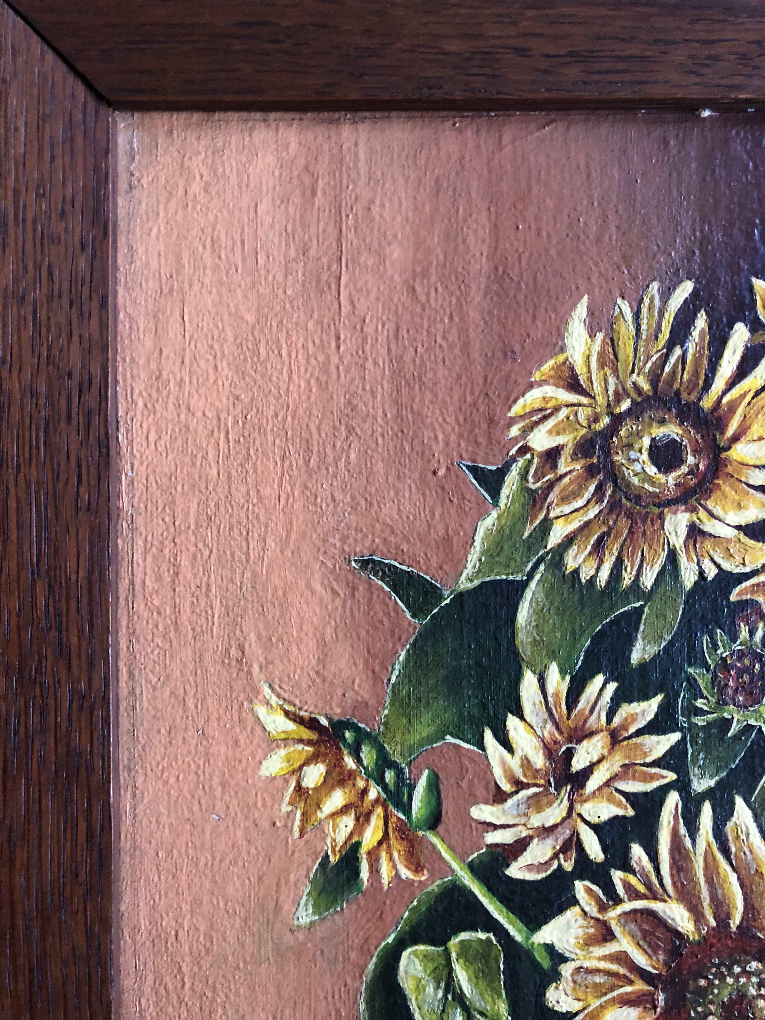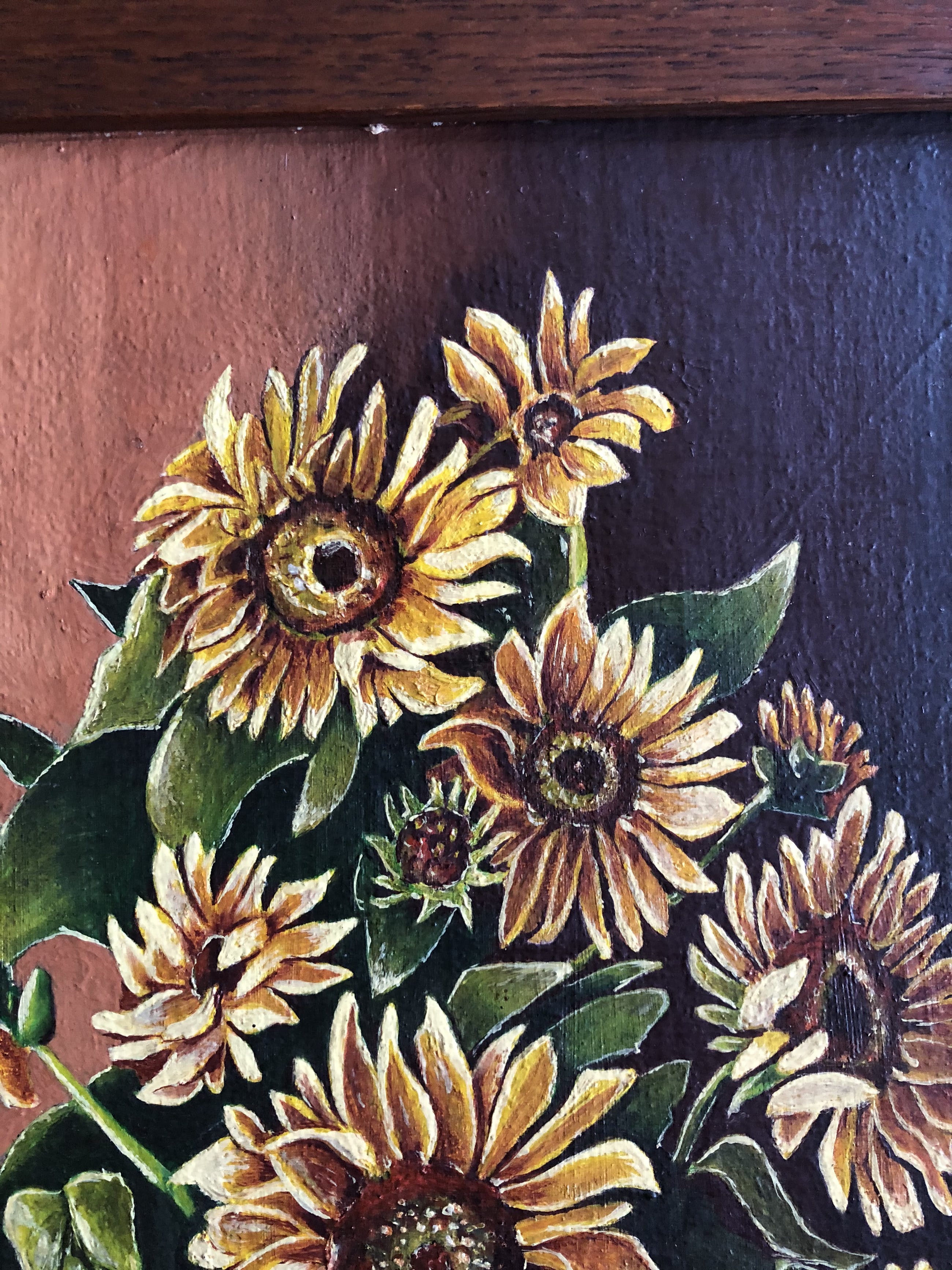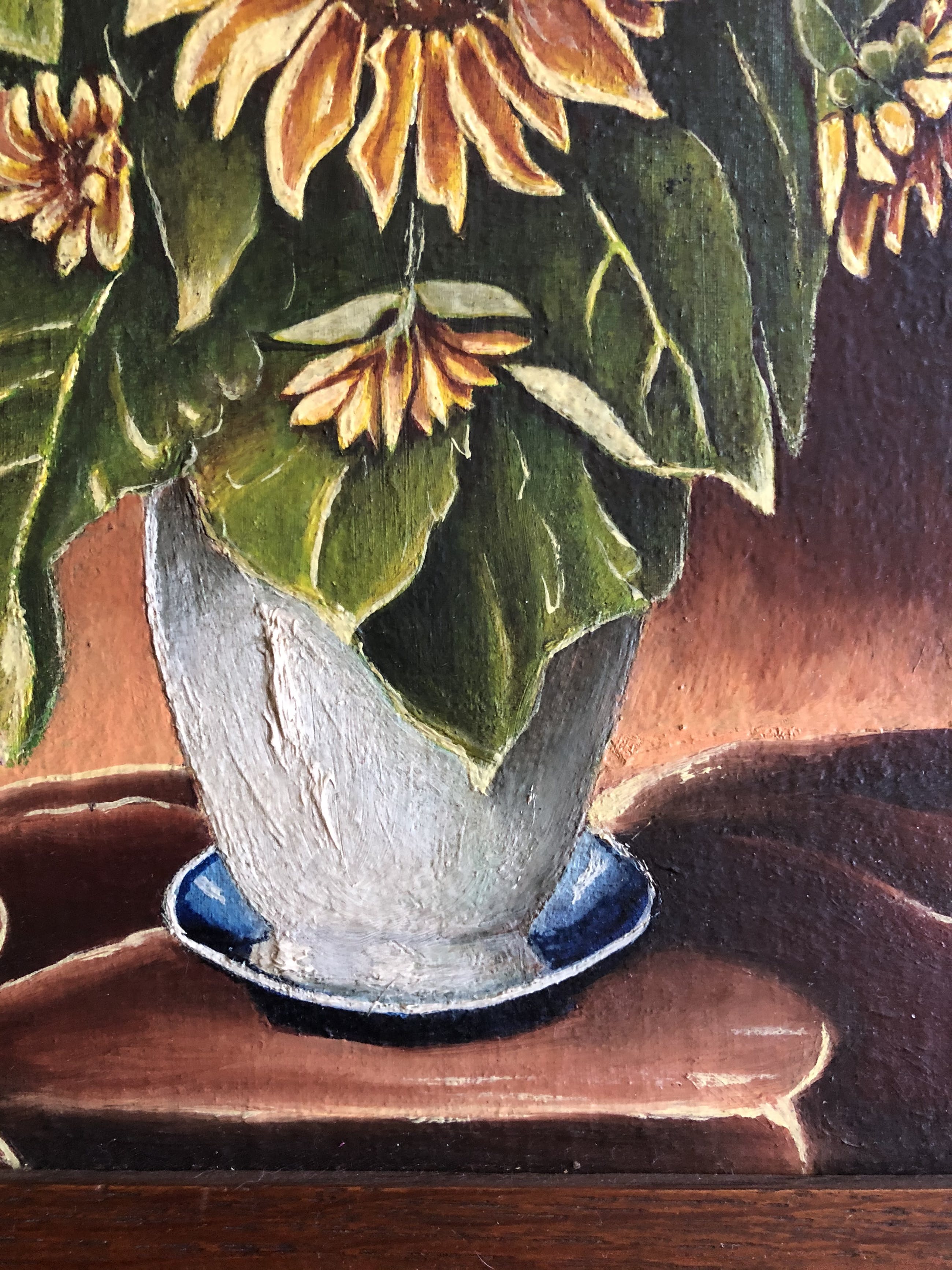 Stilleven van een vaas zonnebloemen op tafel. Zeer kleurrijk en expressief.