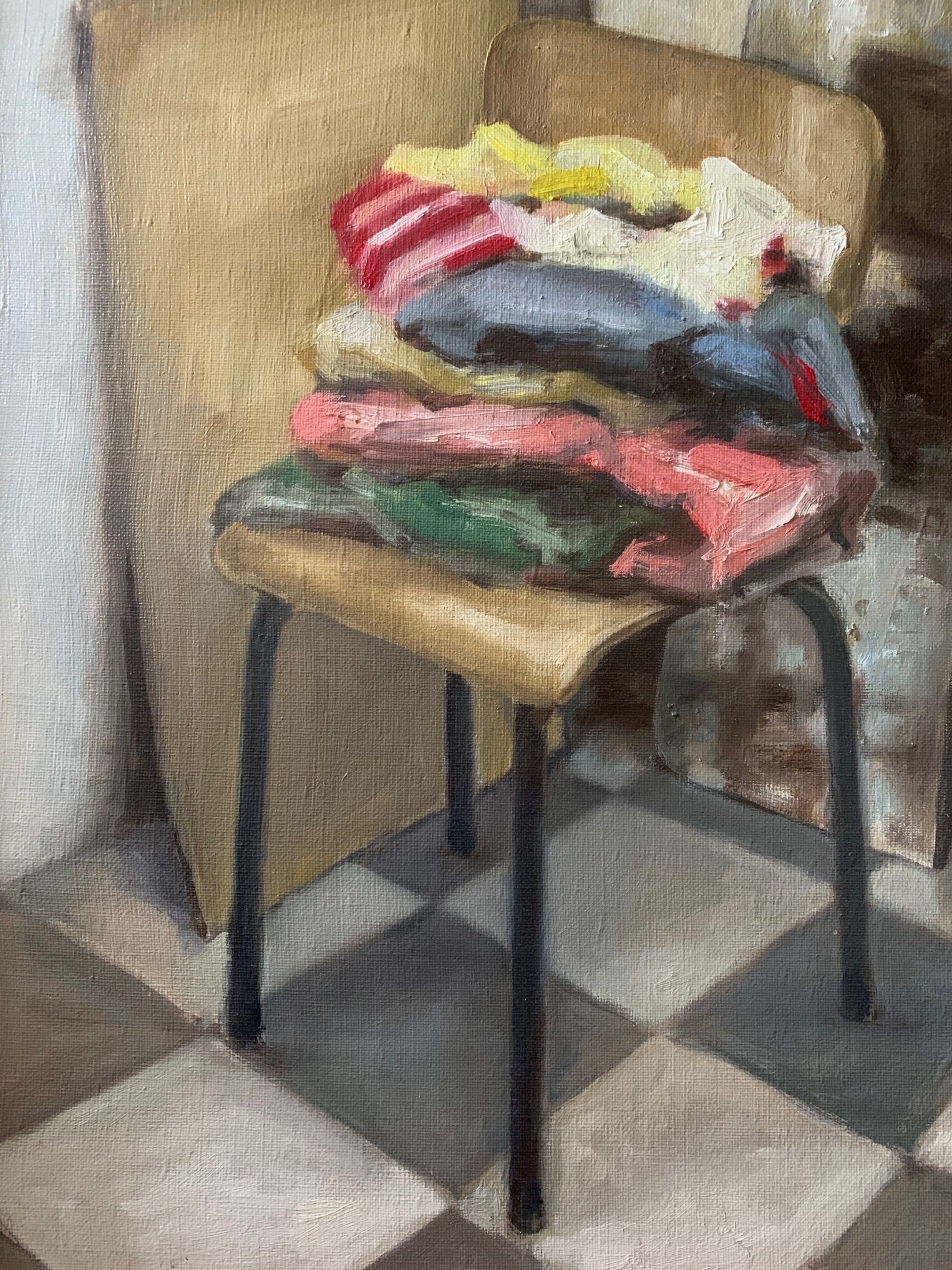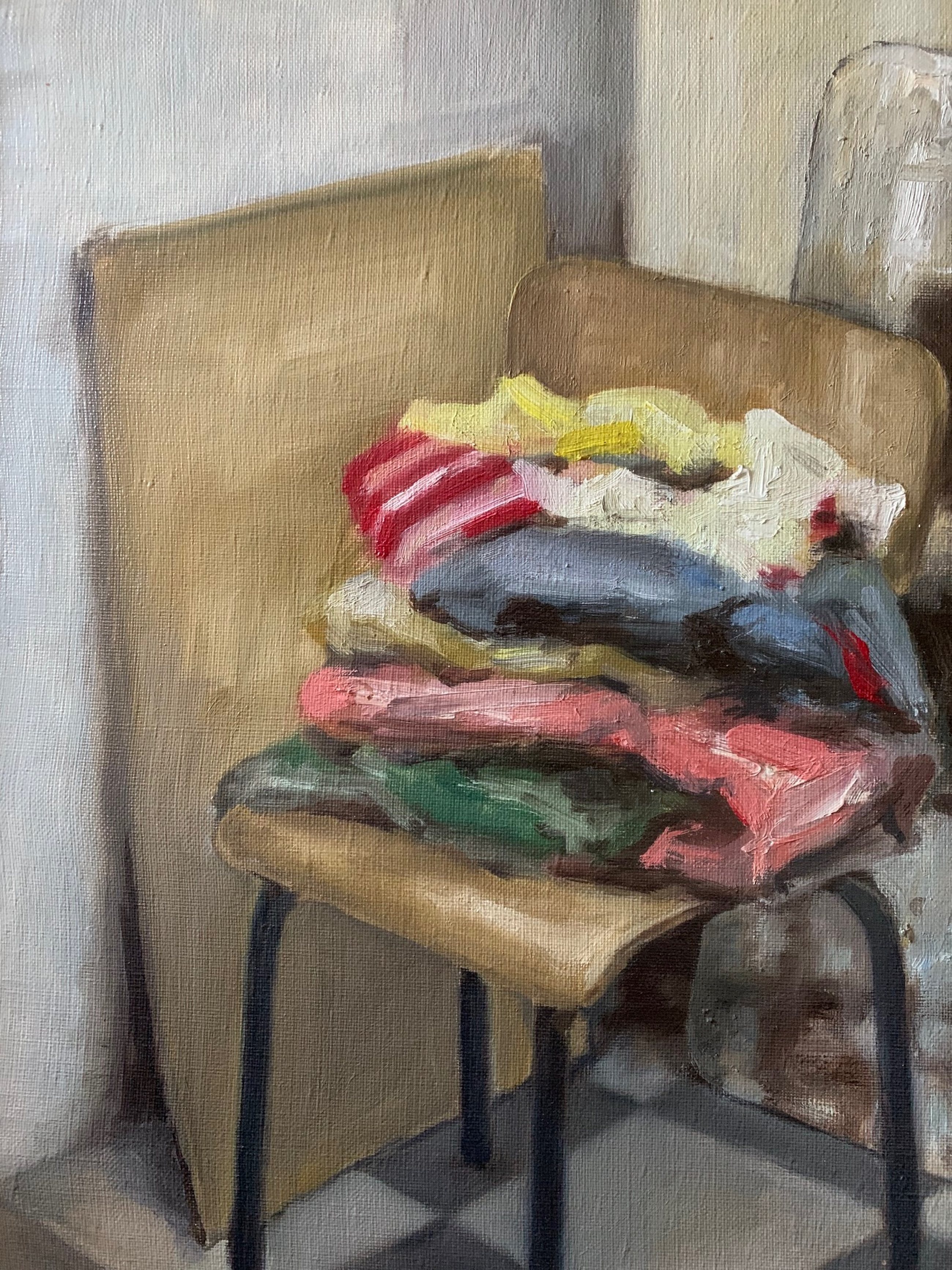 Fraai enigszins pasteus geschilderde voorstelling van een stoel met kleren. Niet gesigneerd.