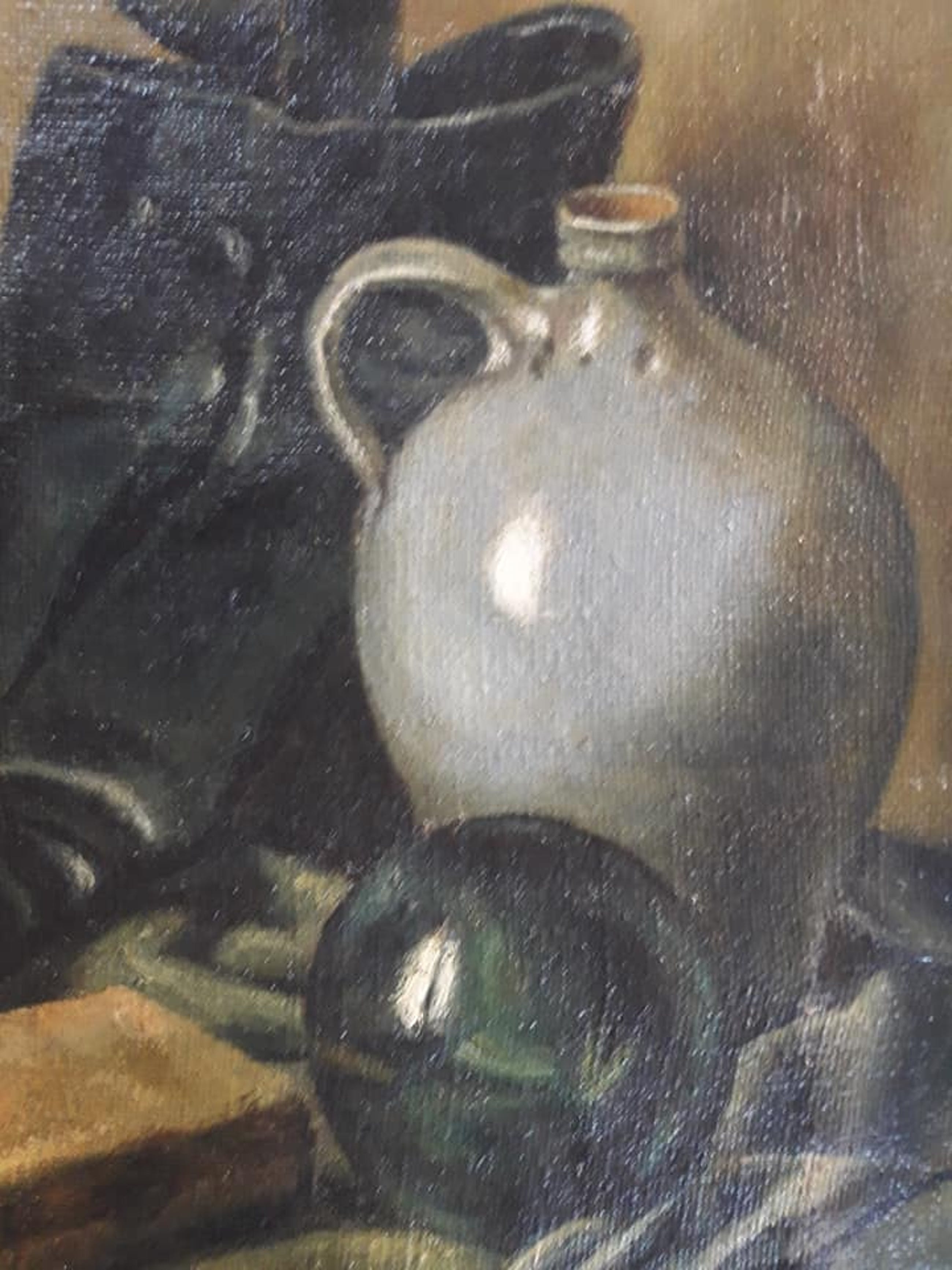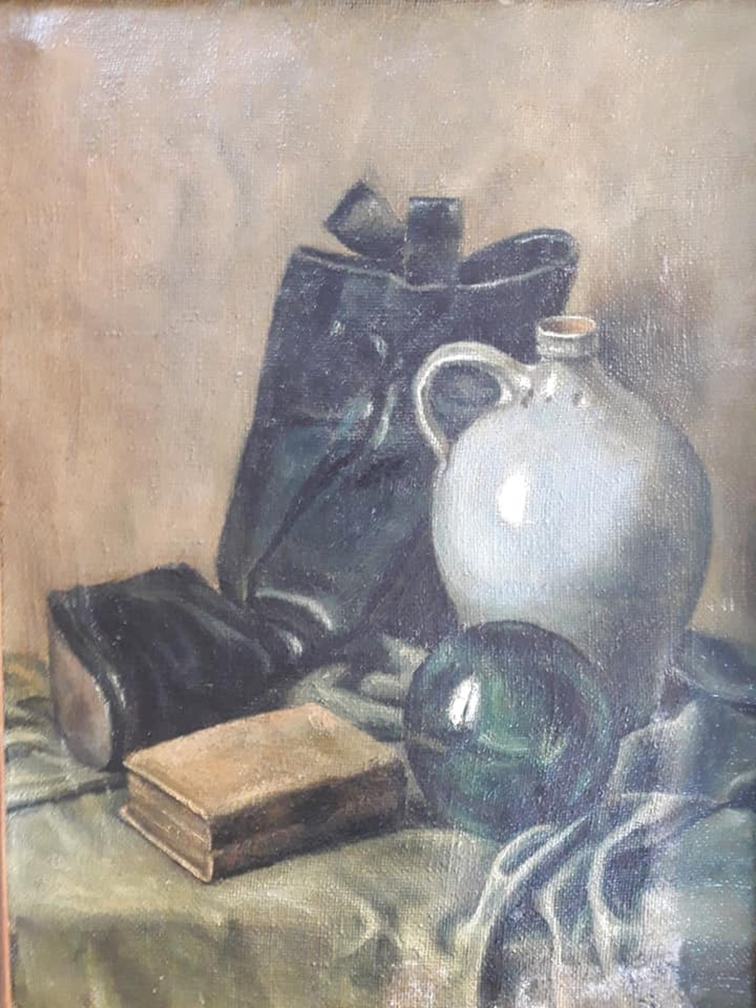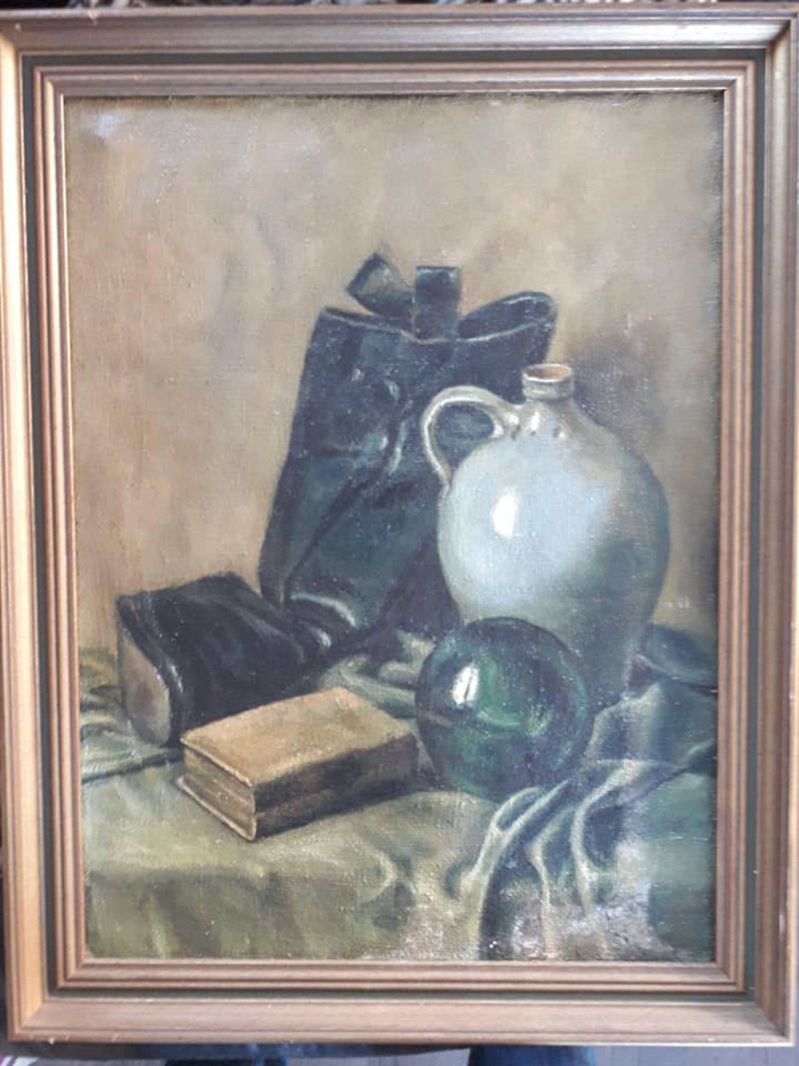 Knap geschildert stilleven met een stenen vaas, glas, een boek en een zak.Helaas is het ongesigneerd. Het zit in een eiken lijst. Wordt verzonden in een op maat gemaakte kist om beschadiging te voorkomen. Kan kosteloos worden afgehaald in Ijmuiden of Bodegraven.