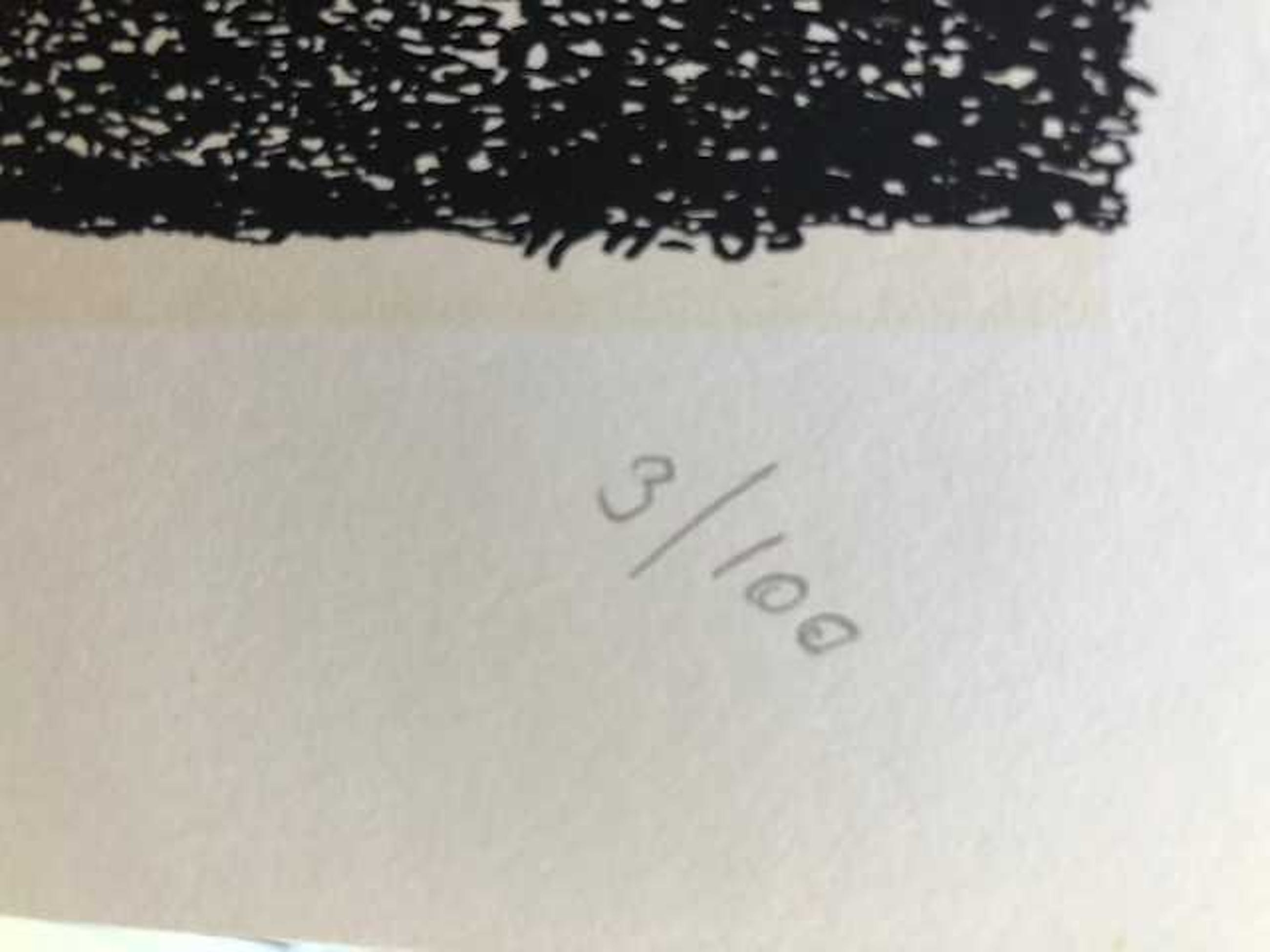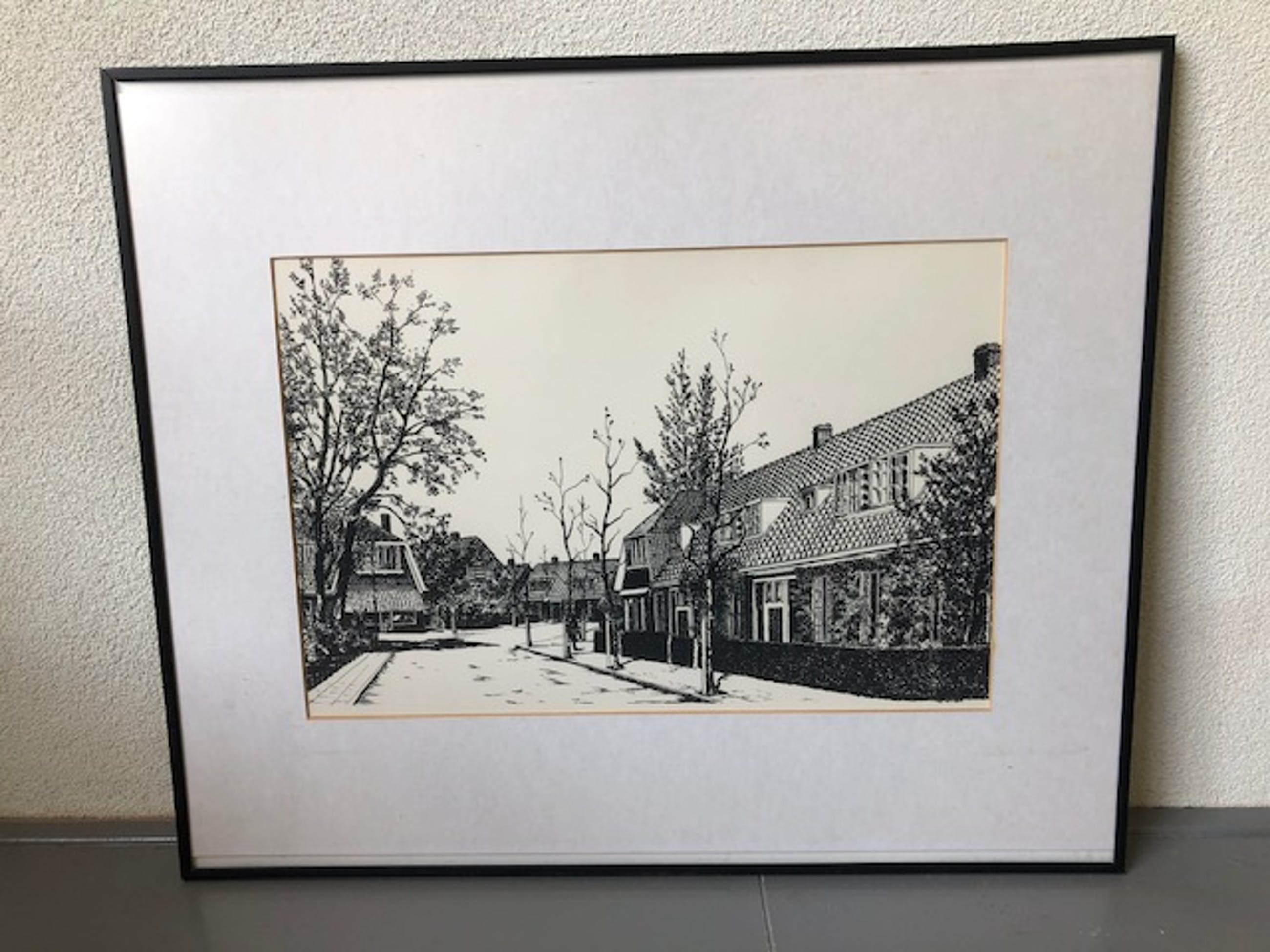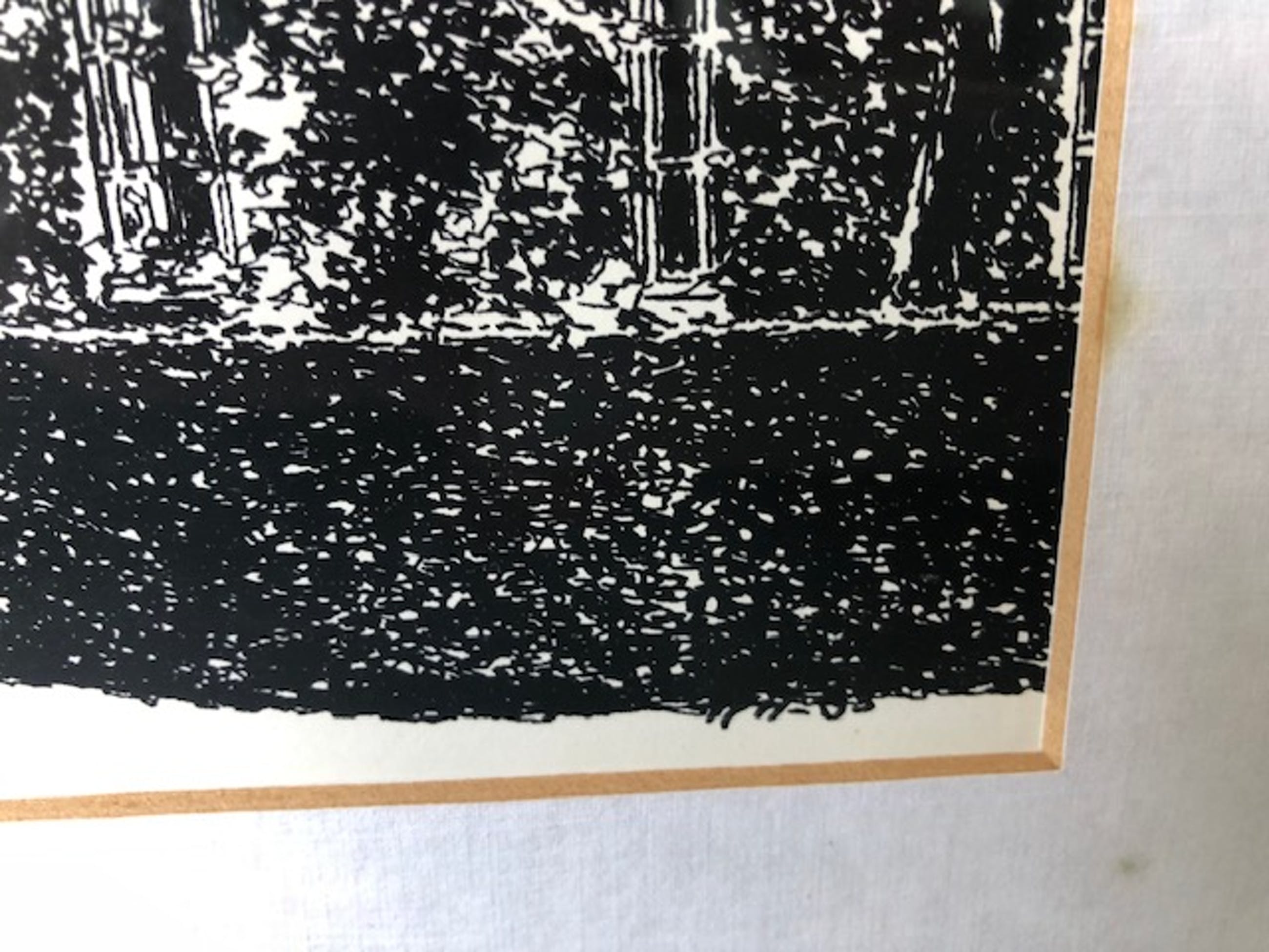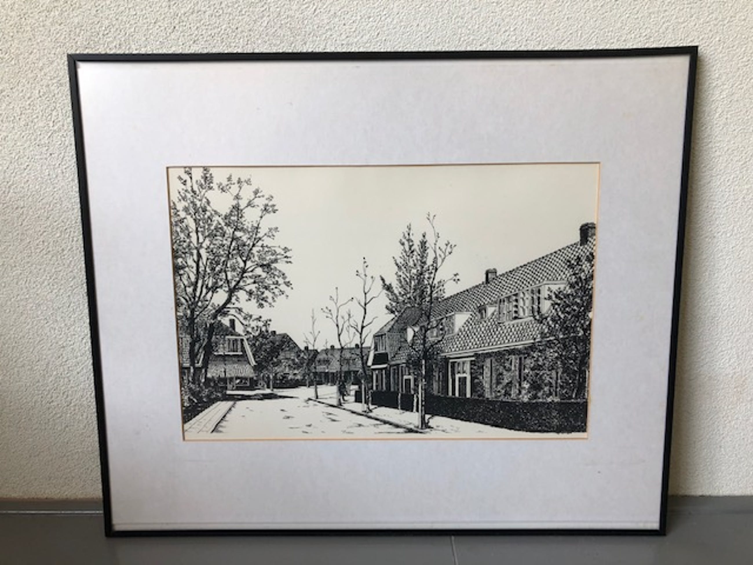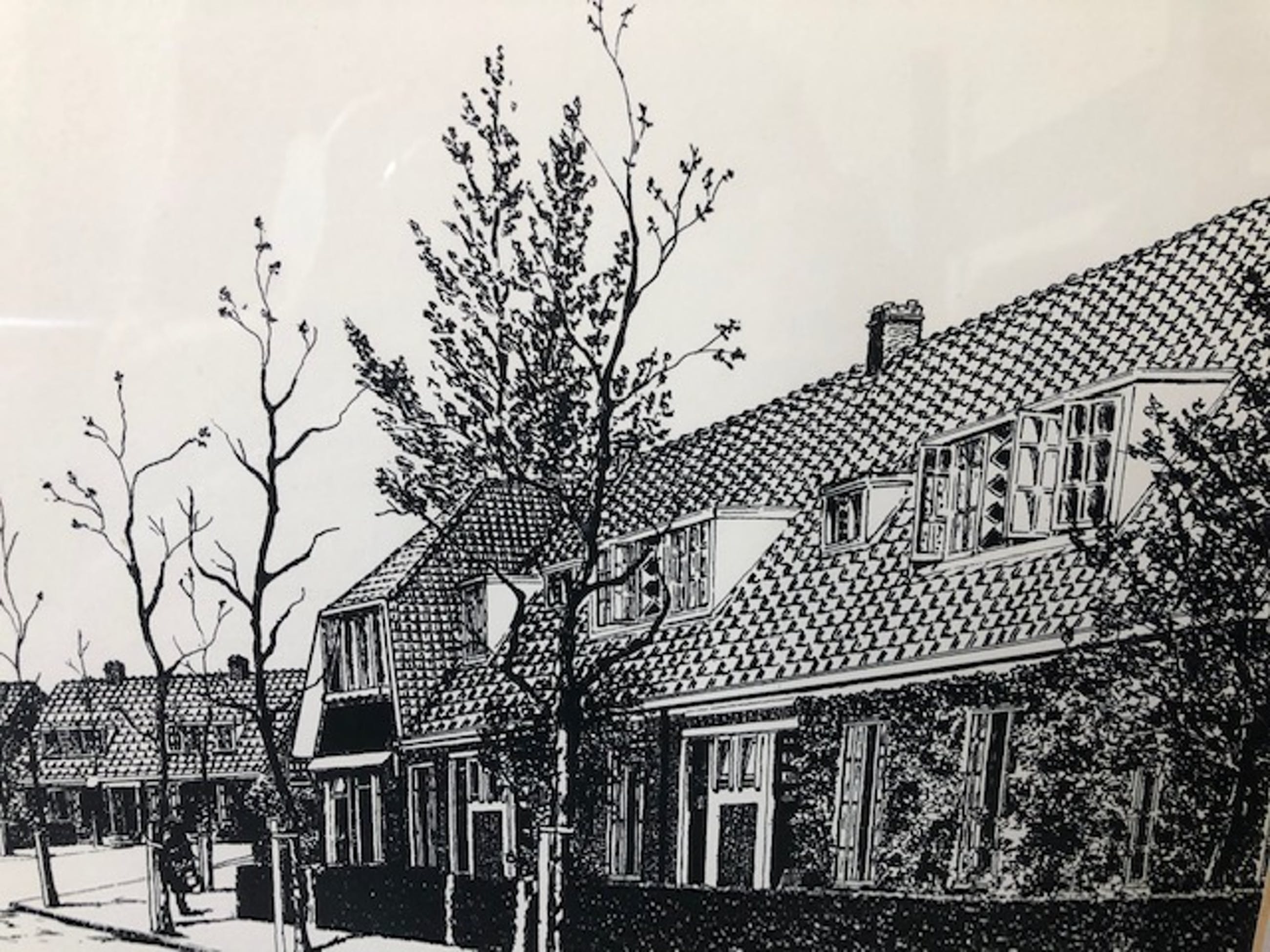 Zeer gedetailleerde zeefdruk met helaas onduidelijke signatuur aan de rechter onderkant. Voorstellende een straat met huizen in de Amsterdamse School stijl. Verkeerd in uitstekende staat. Editie nummer valt buiten het gezichtsveld door de passe-partout, het nummer is 3/100, zie foto.