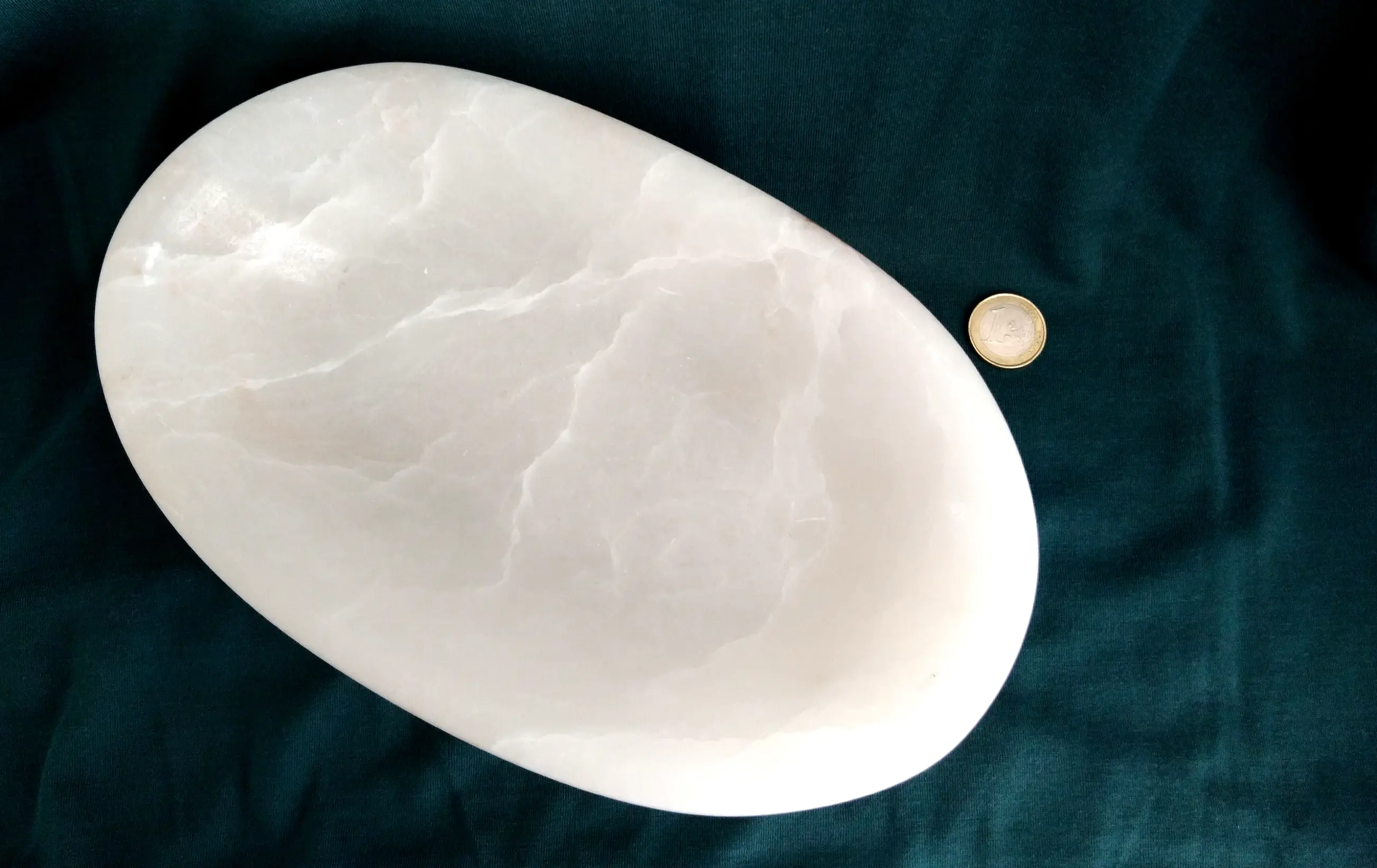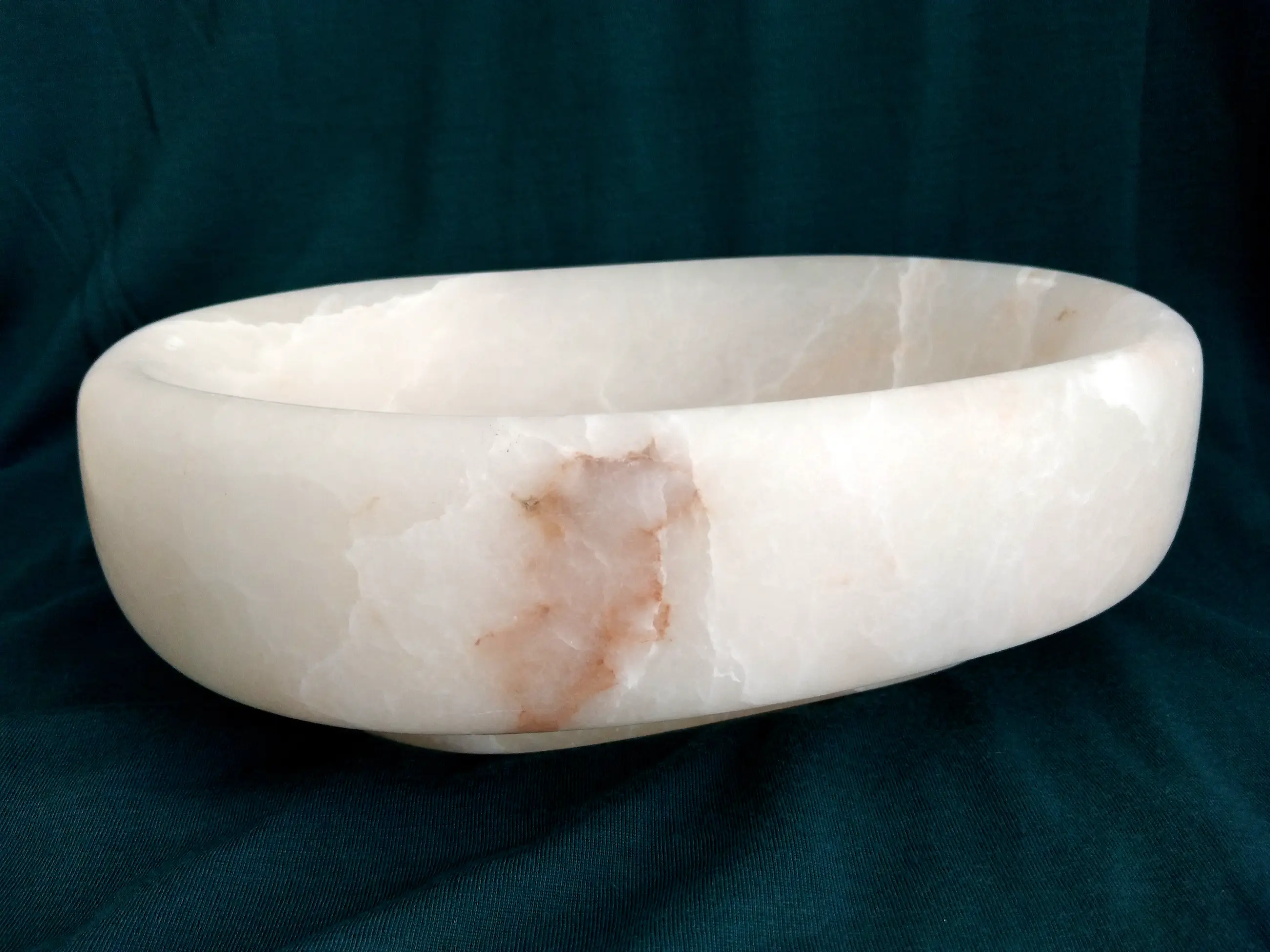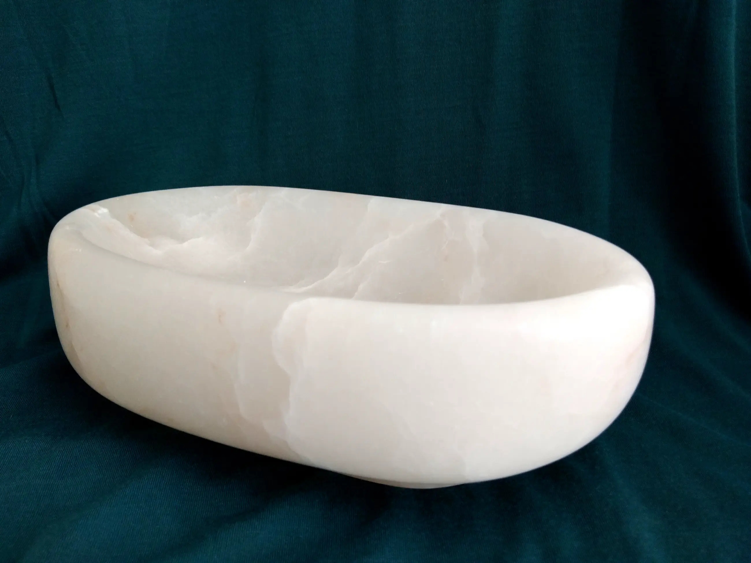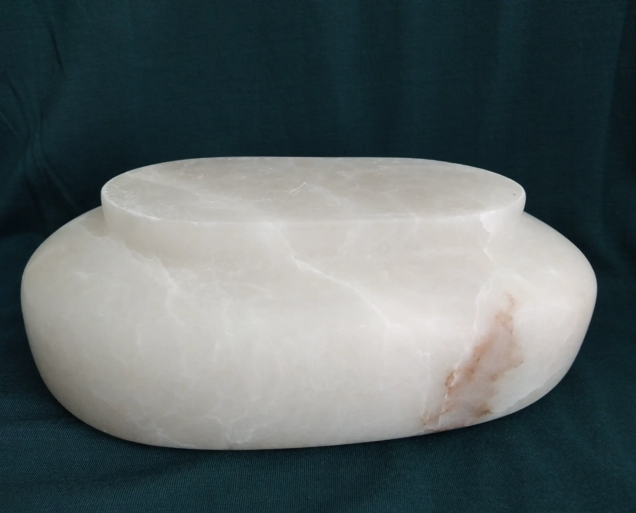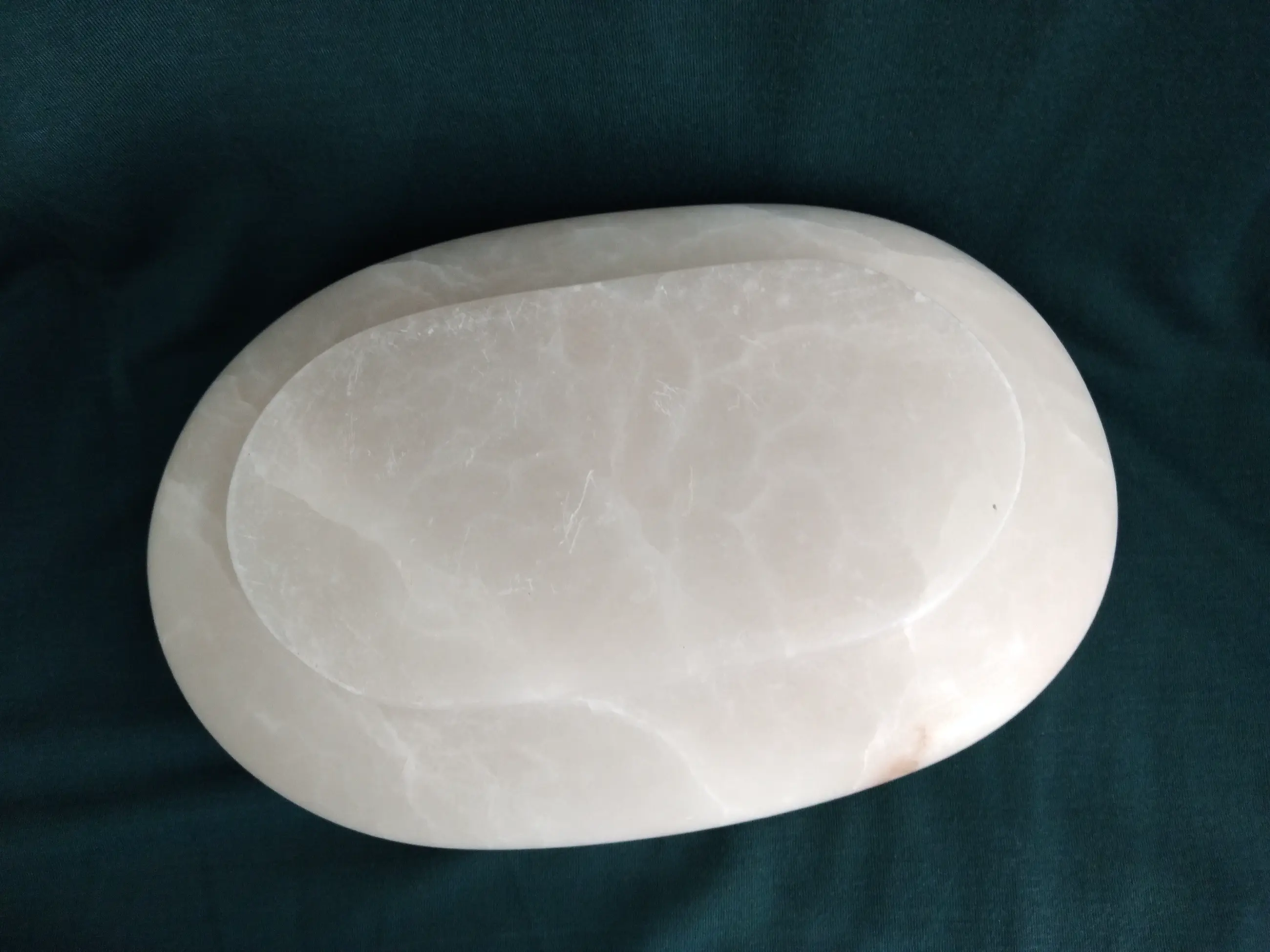 Strakke marmeren schaal, ovaal van vorm en subtiel geaderd.