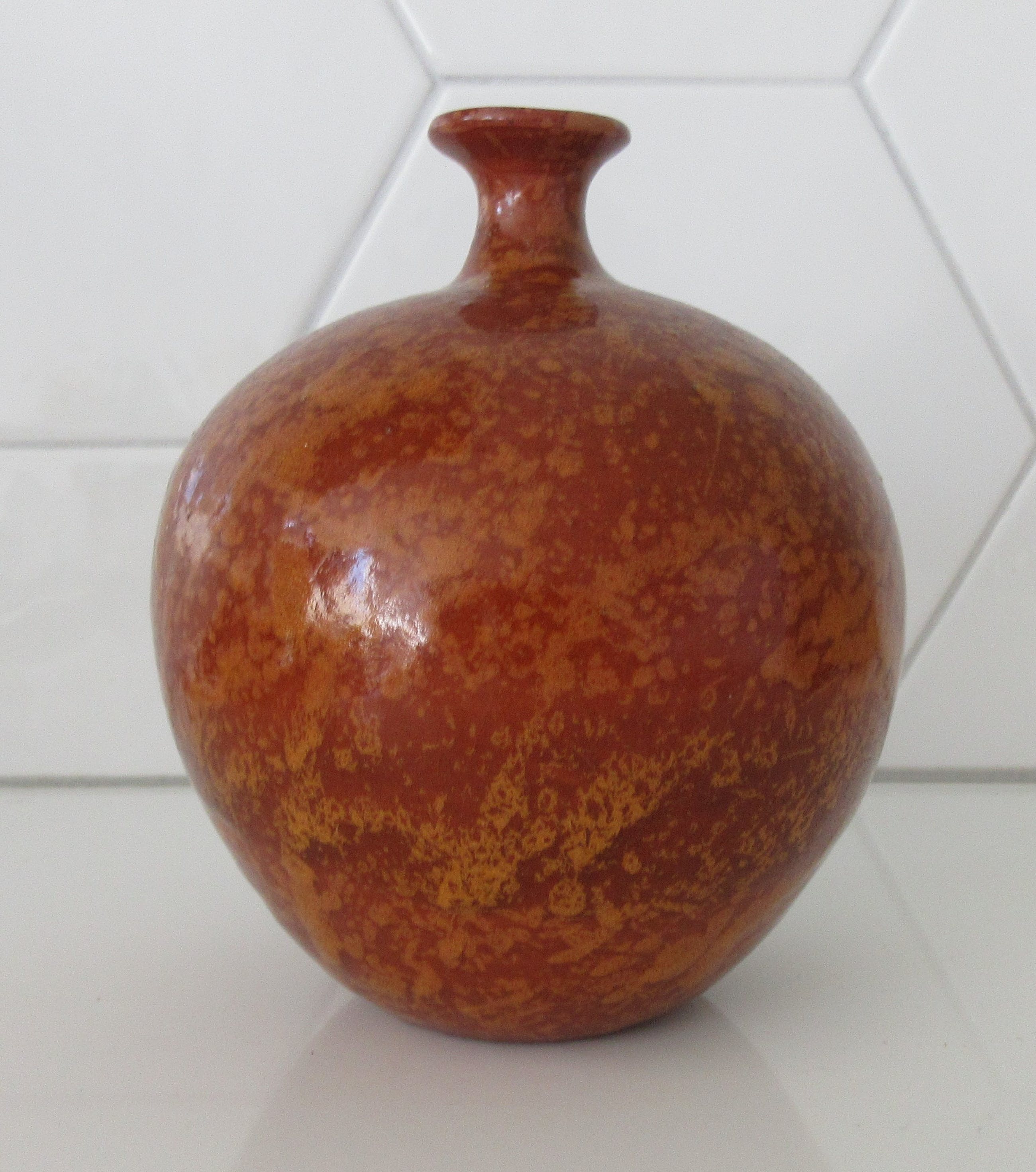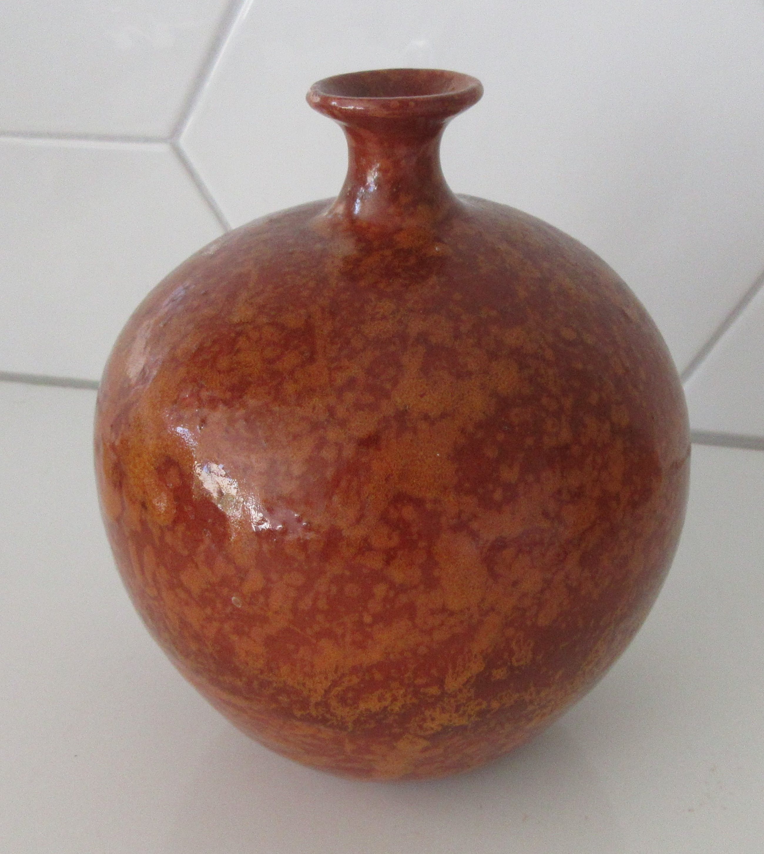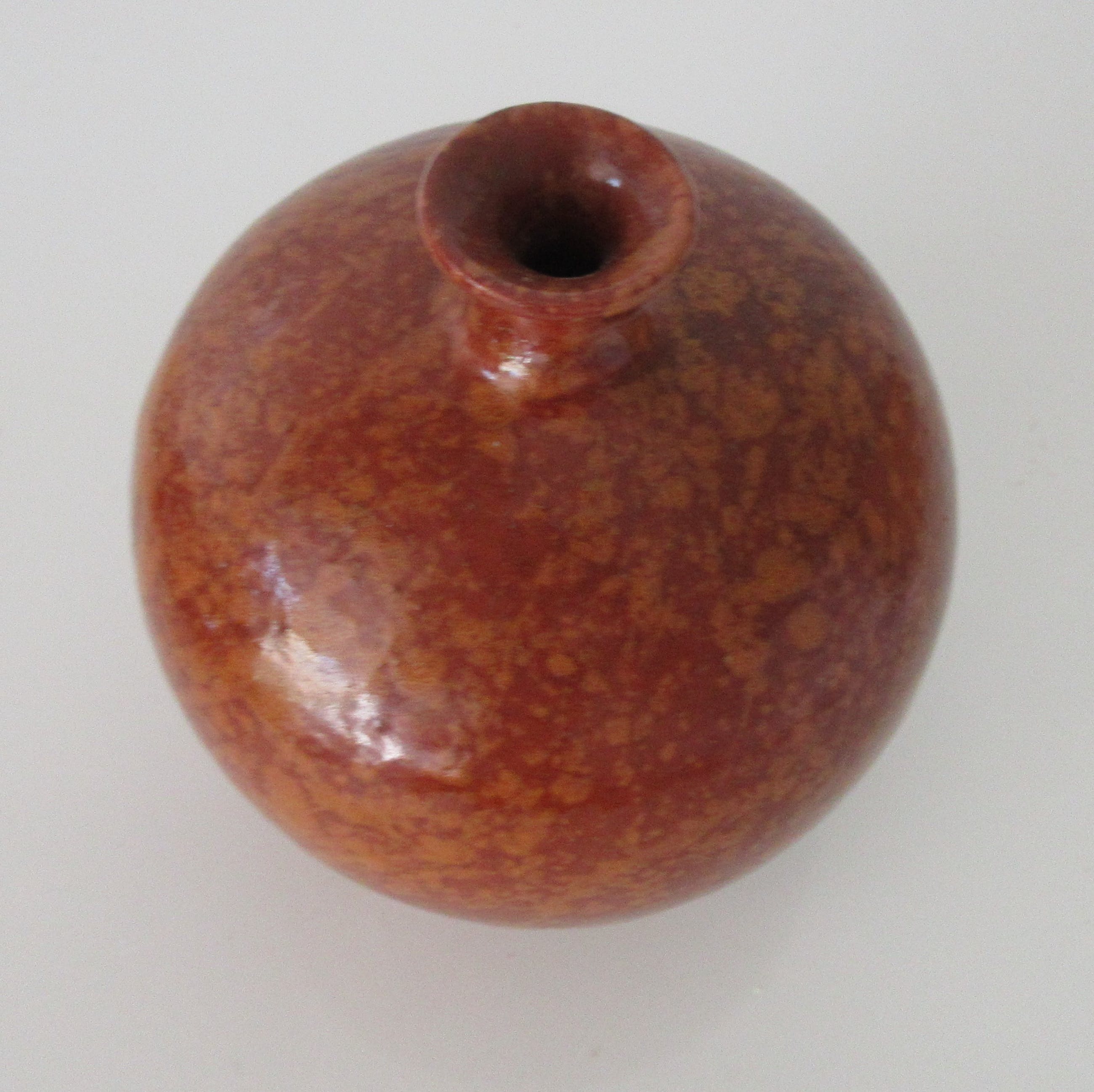 Rood oranje studio keramisch bolvaas van rood aardewerk. Aan de achterzijde gesigneerd, echter kunstenaar of keramist onbekend. In prima onbeschadigde conditie.