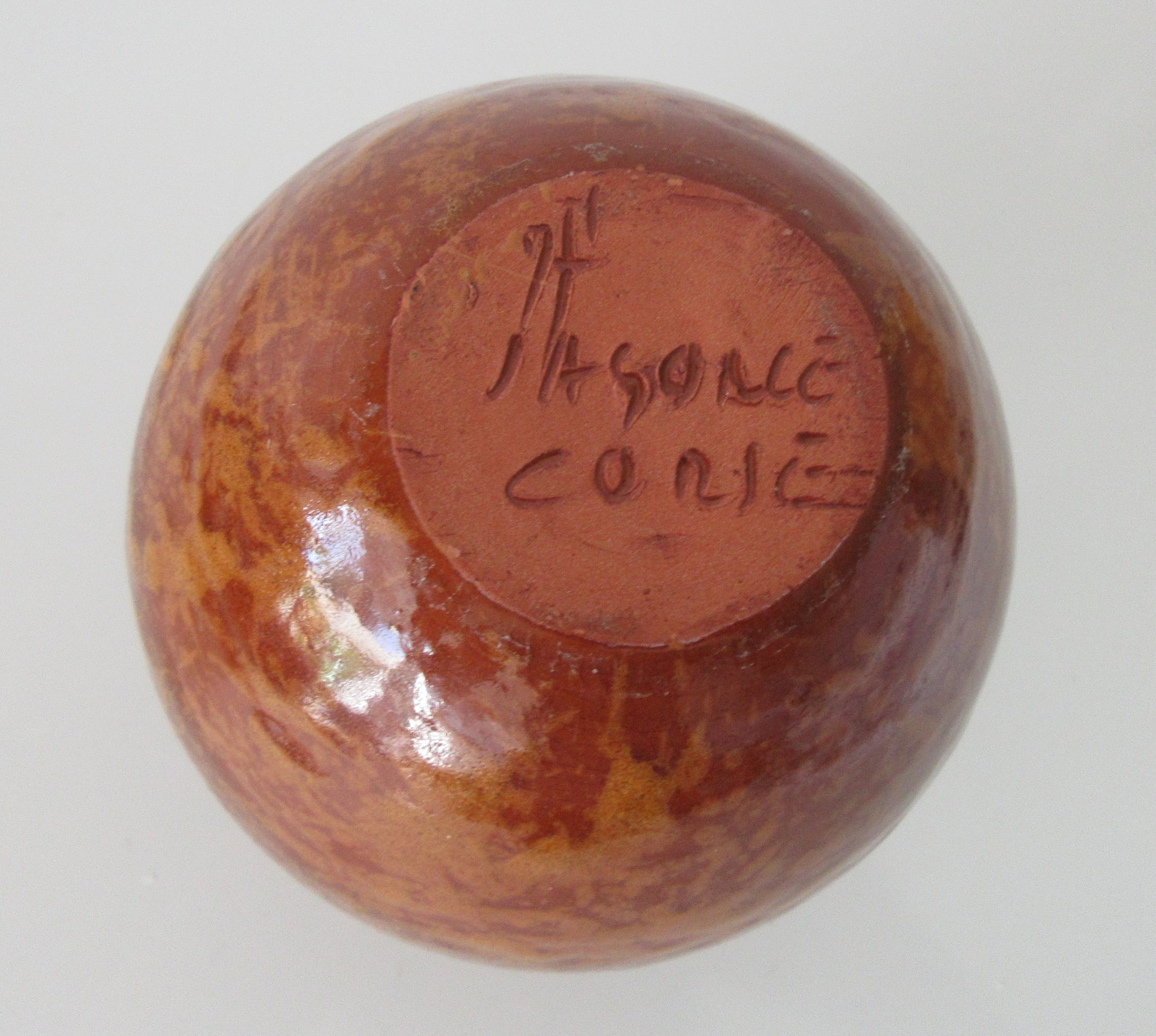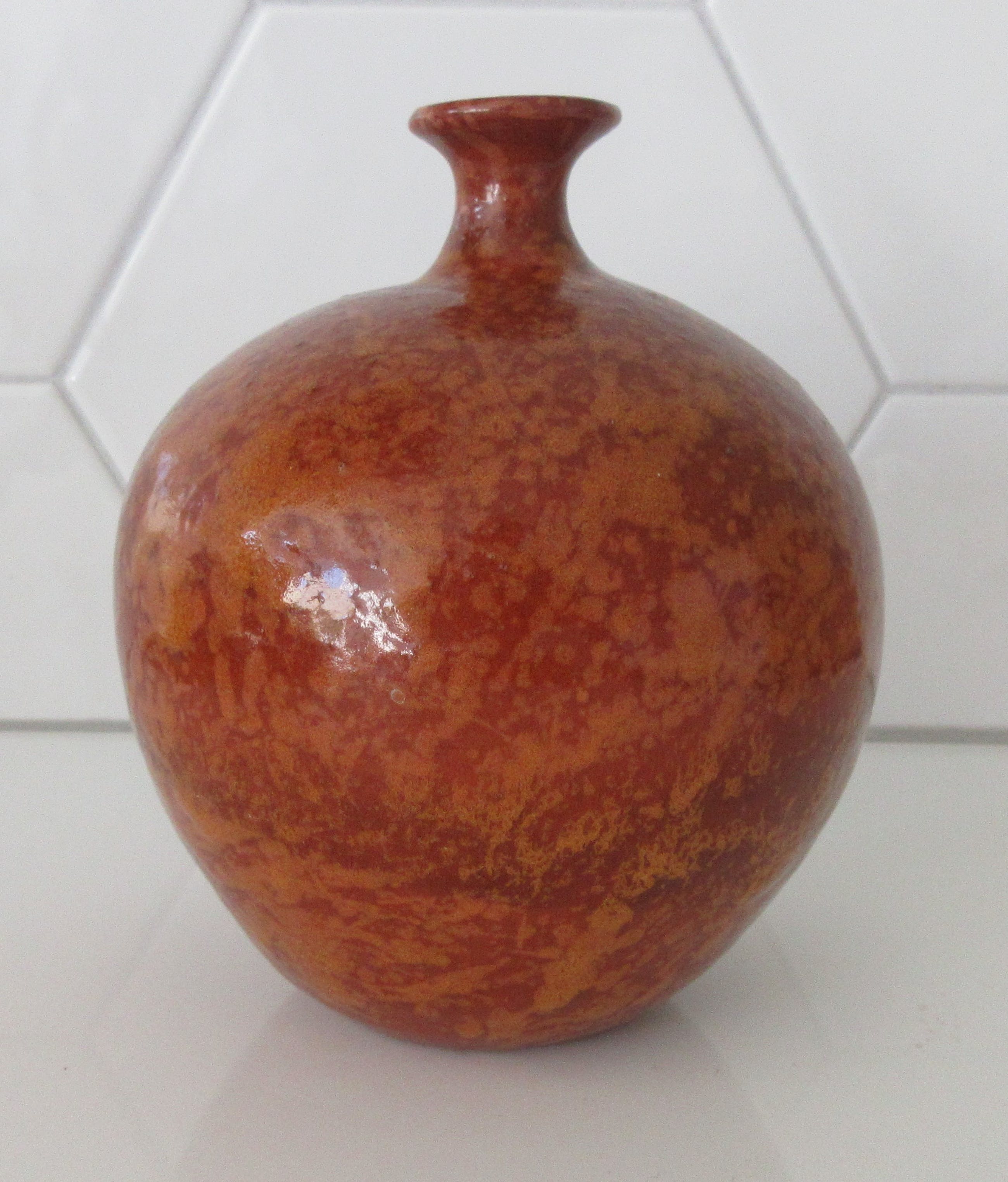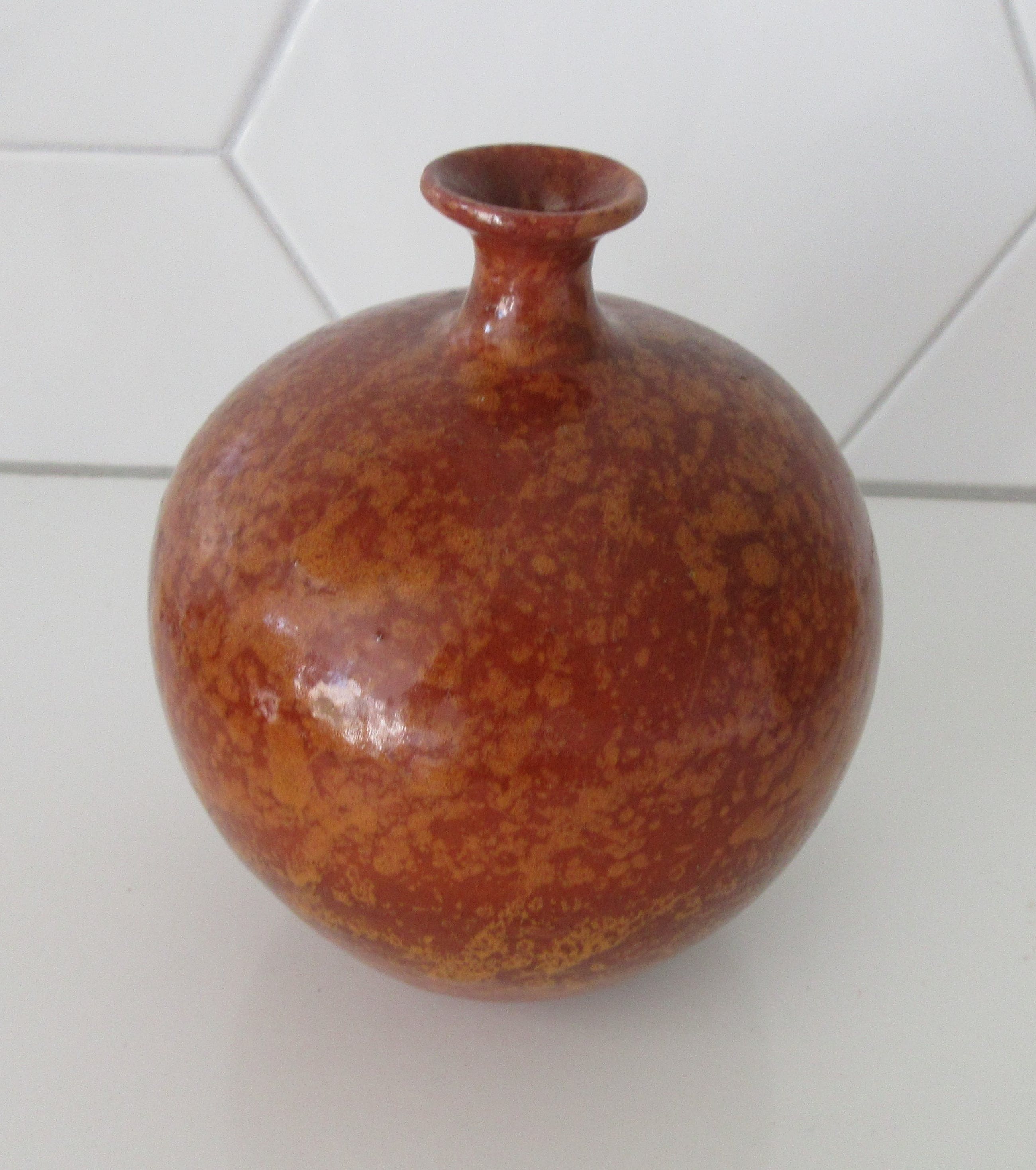 Rood oranje studio keramisch bolvaas van rood aardewerk. Aan de achterzijde gesigneerd, echter kunstenaar of keramist onbekend. In prima onbeschadigde conditie.