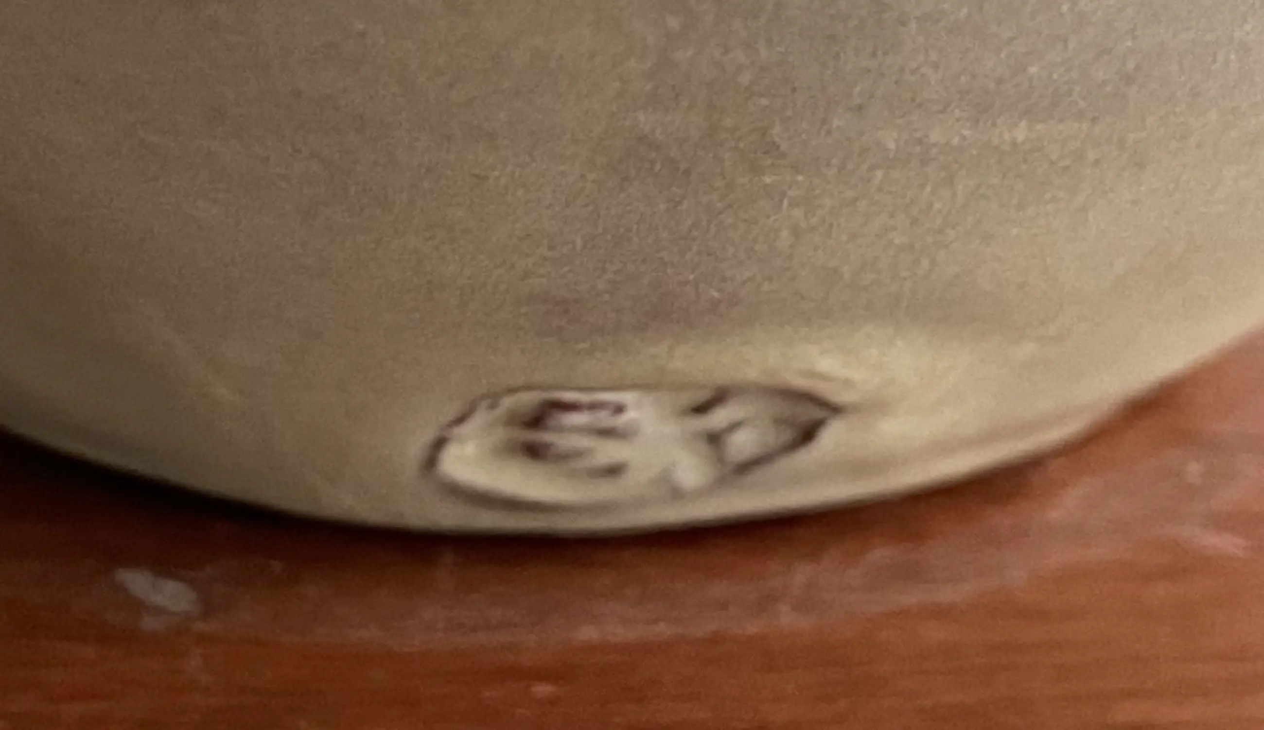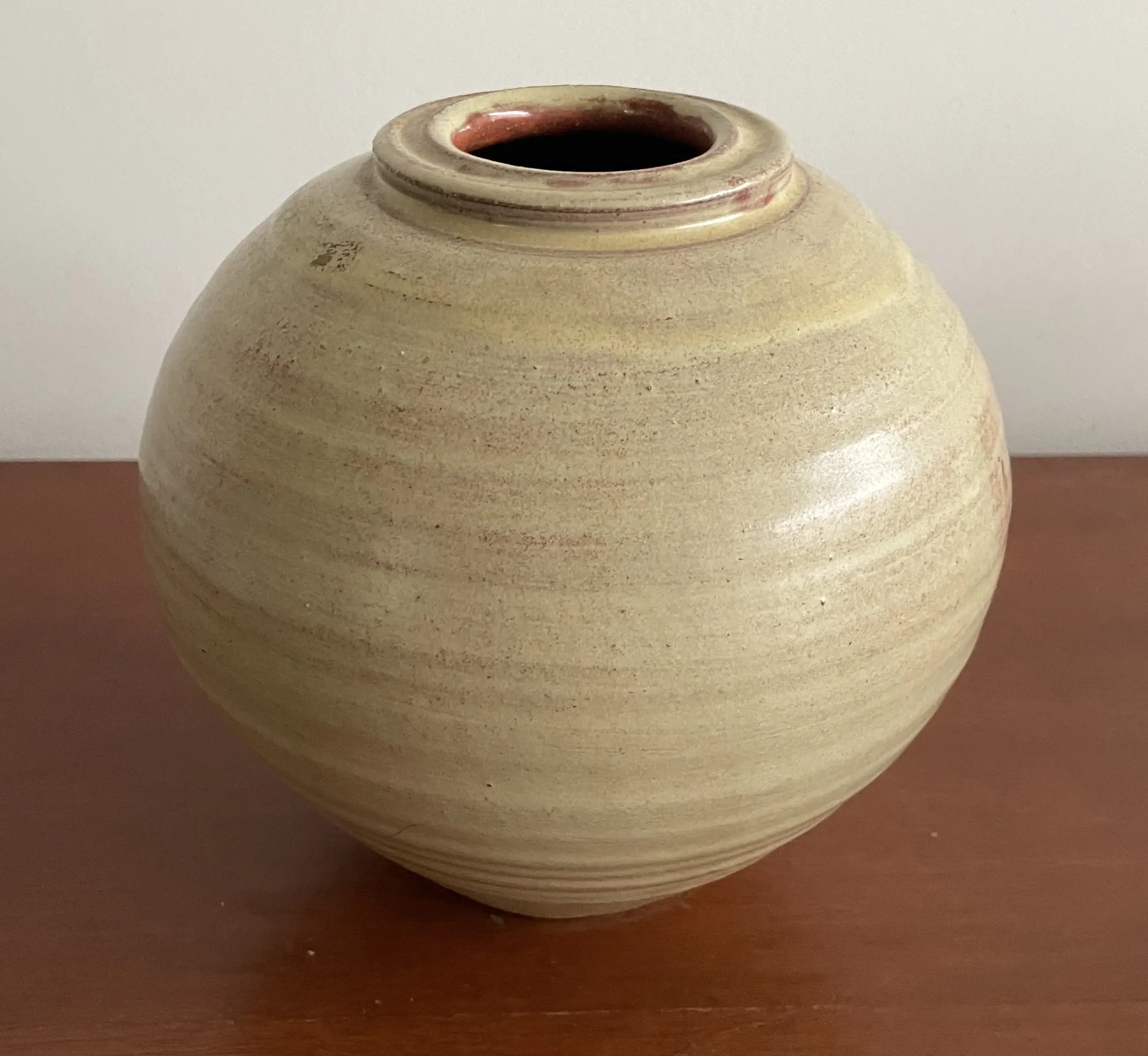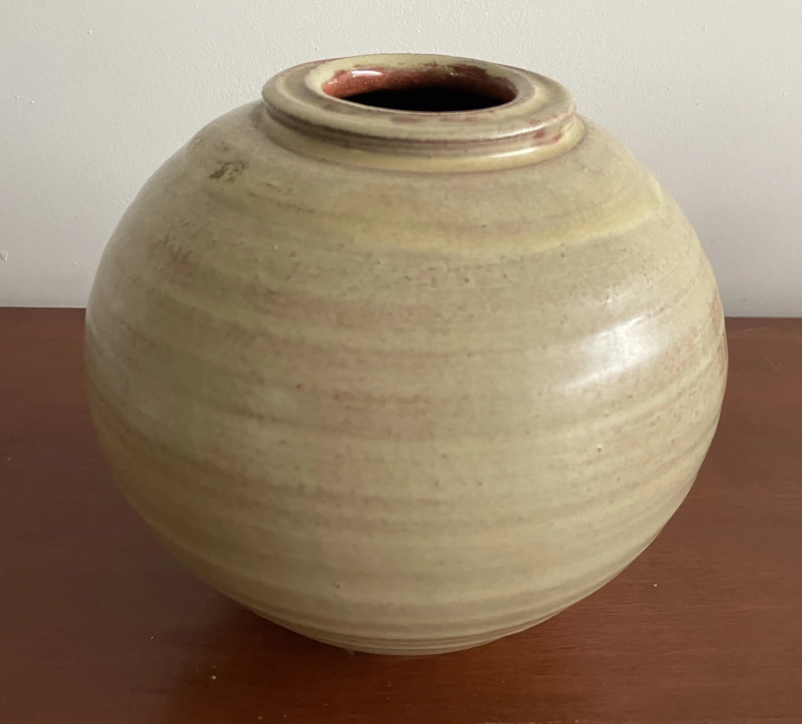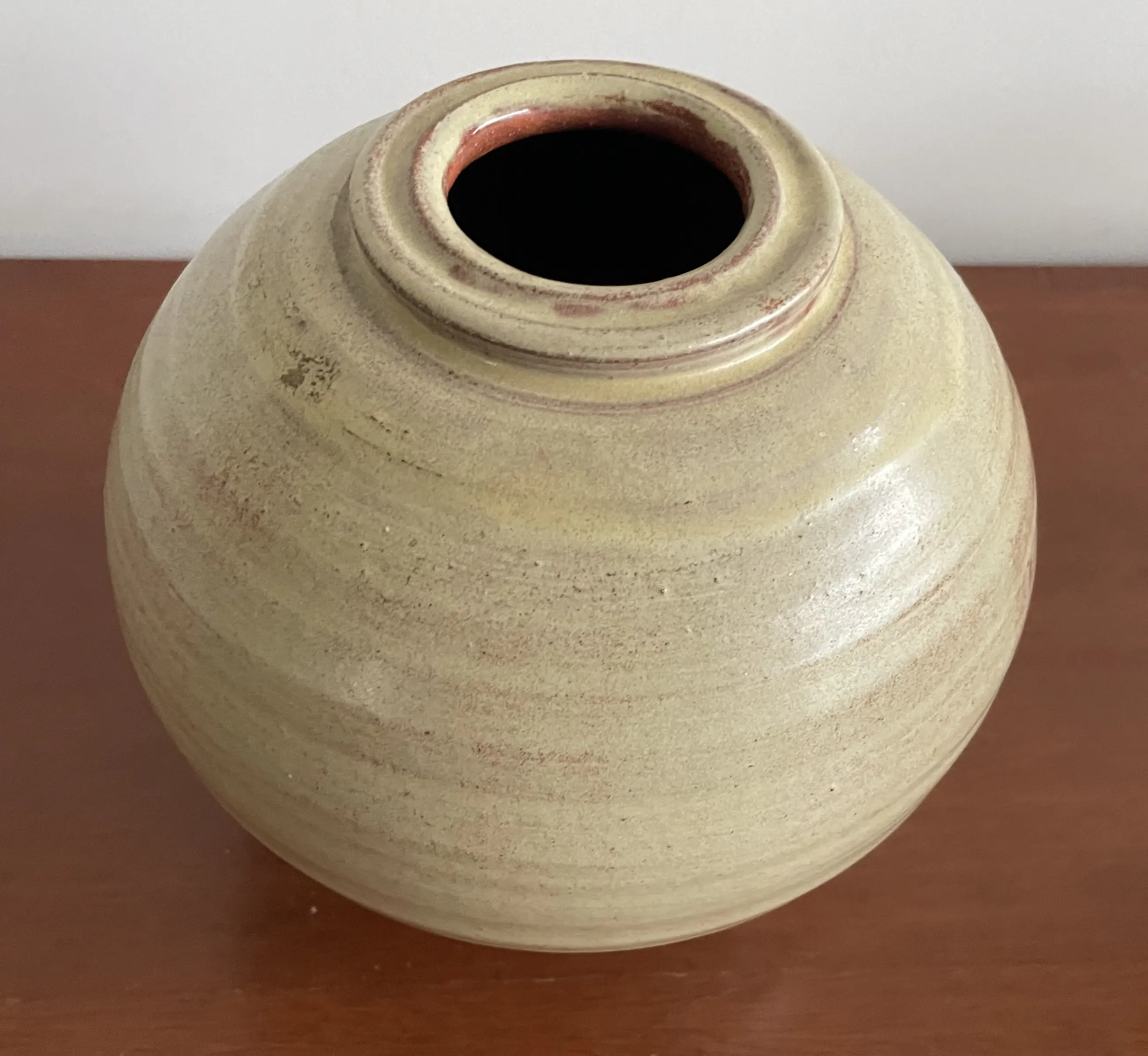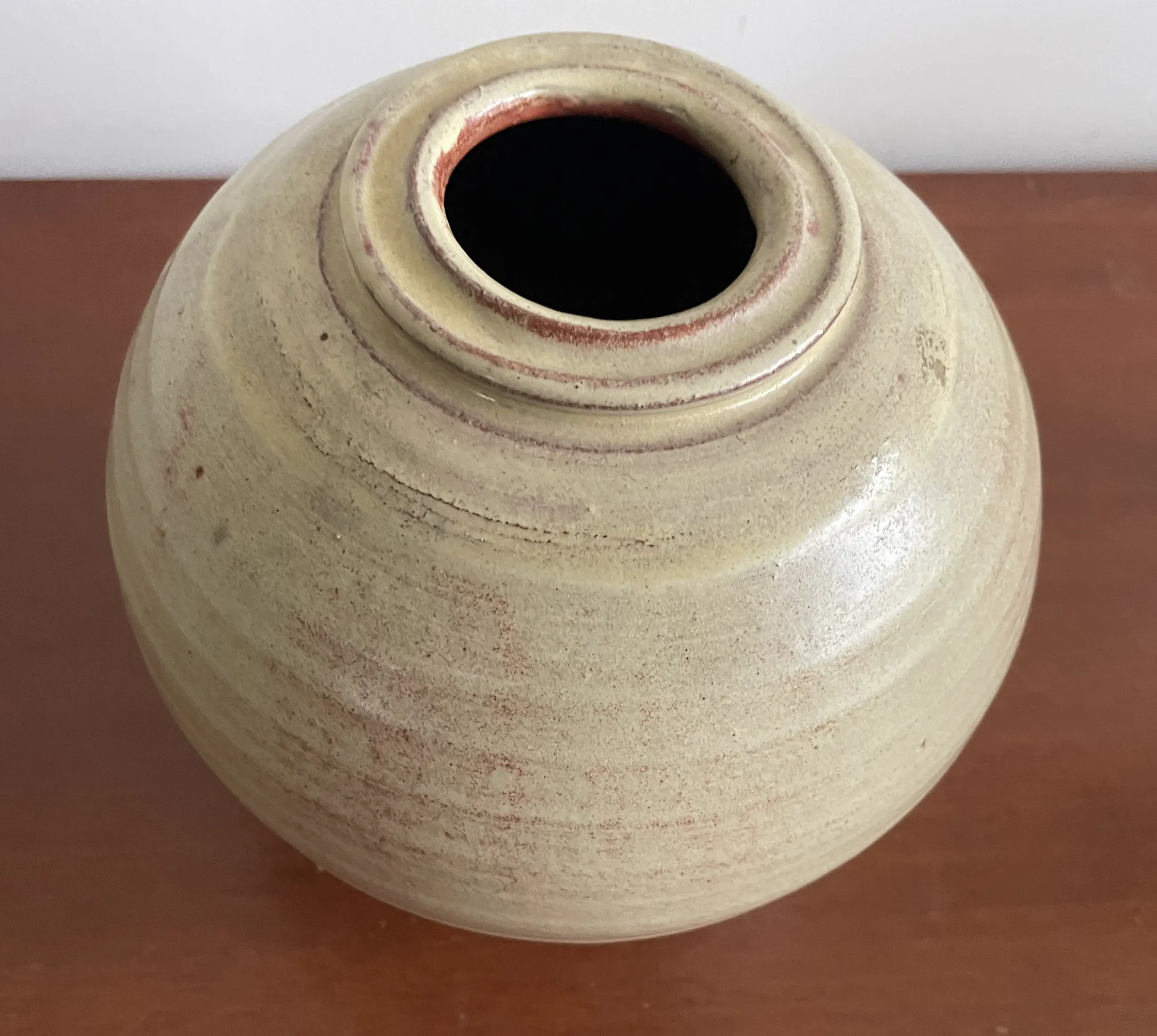 Studio aardewerken bolvaas - rode scherf - uitgevoerd met geel - beige glazuur. Voorzien van ingedrukt monogram. Keramist onbekend.