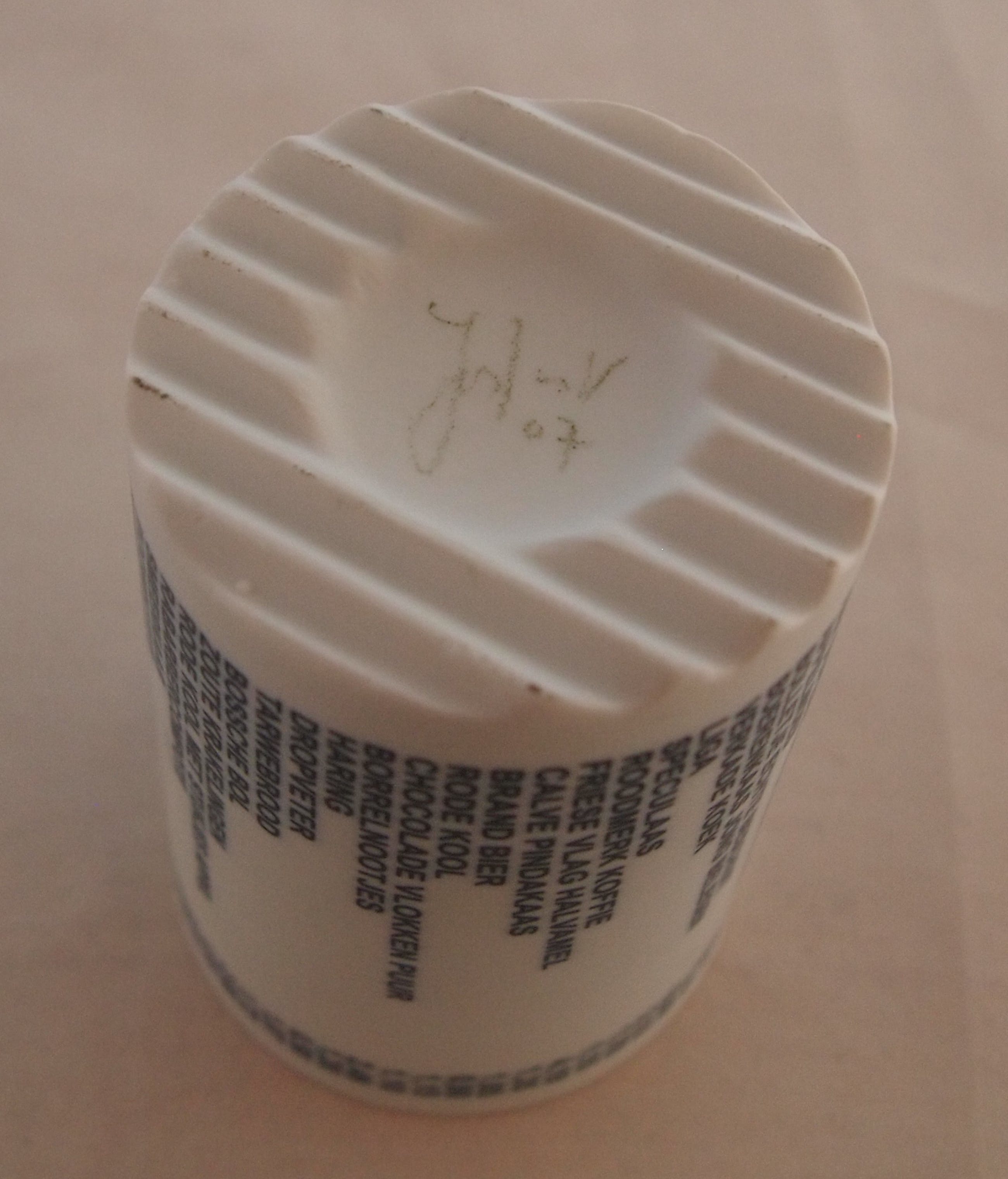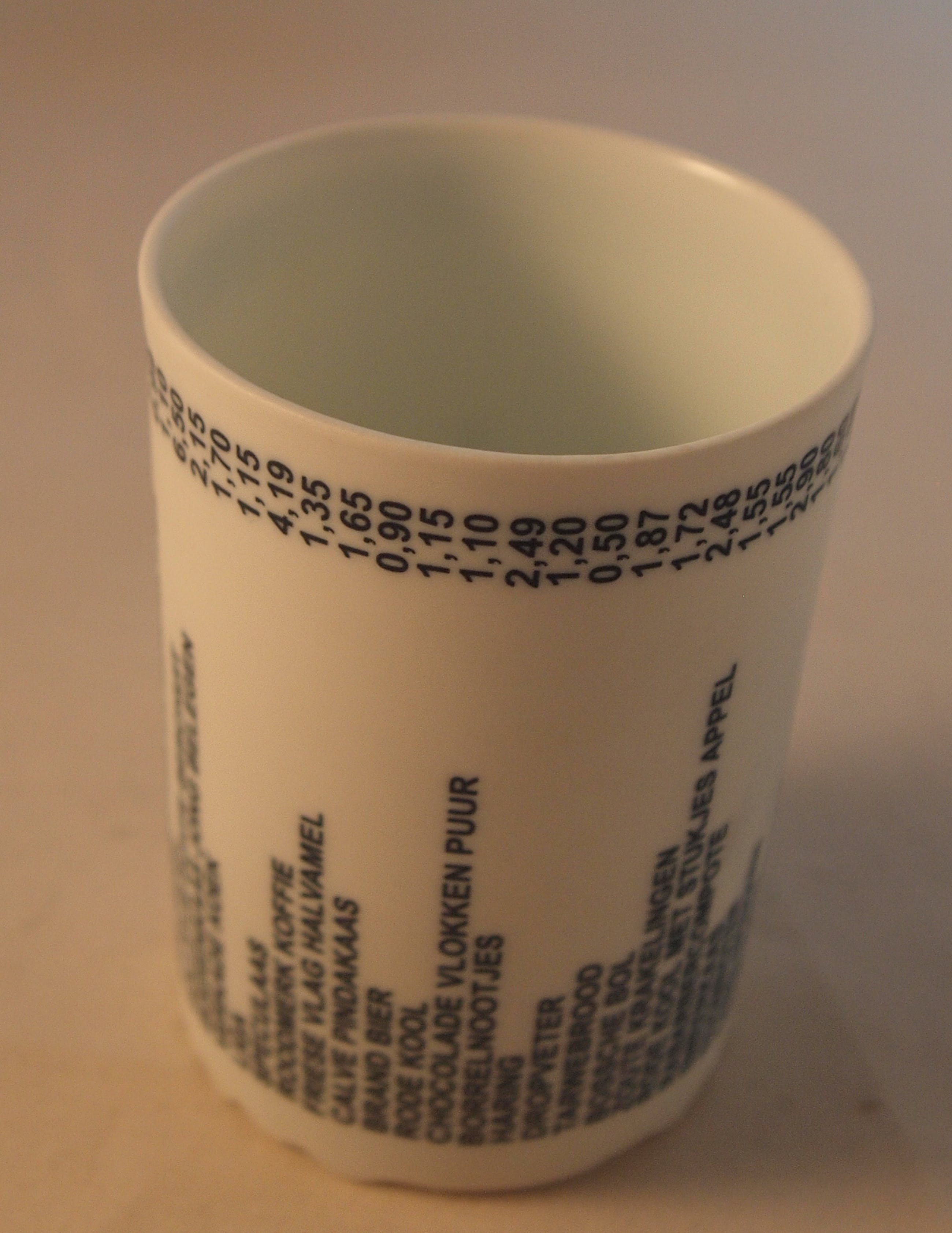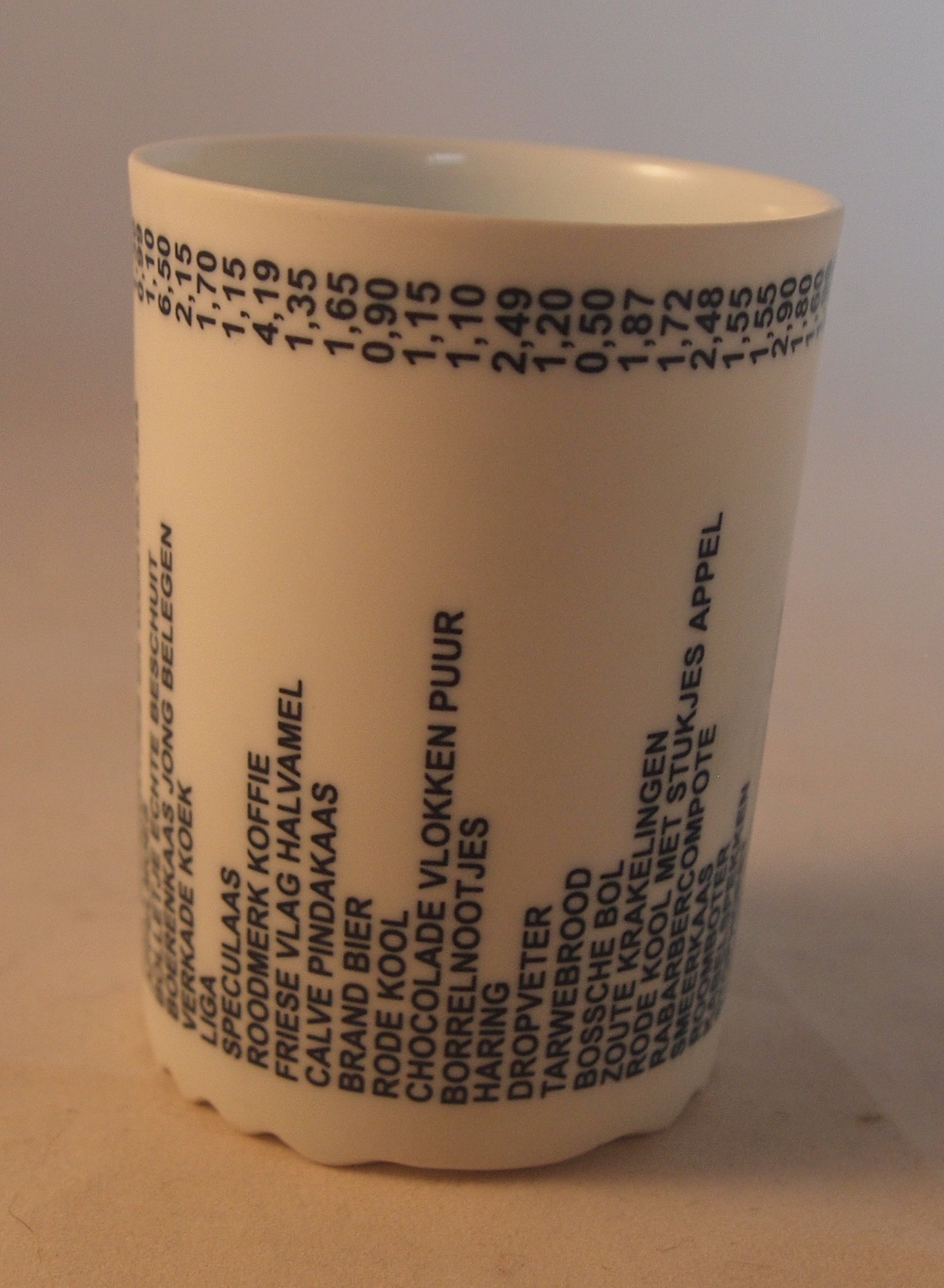 Studio biscuit porseleinen beker "boodschappenlijst". Witte beker met in hard blauw een boodschappenlijst op de zijkant. Gesigneerd aan de onderzijde. Kunstenaar of keramist onbekend.