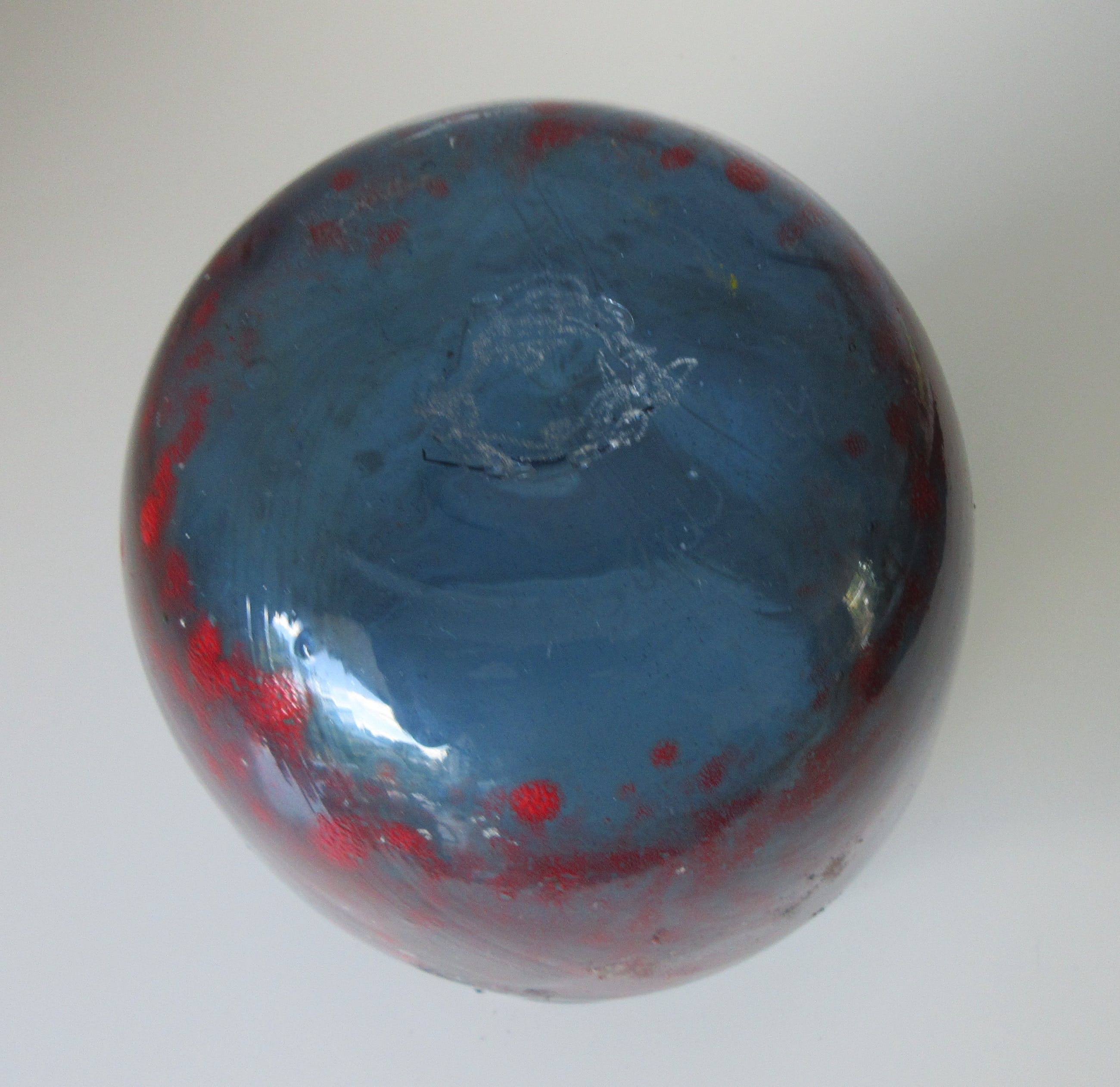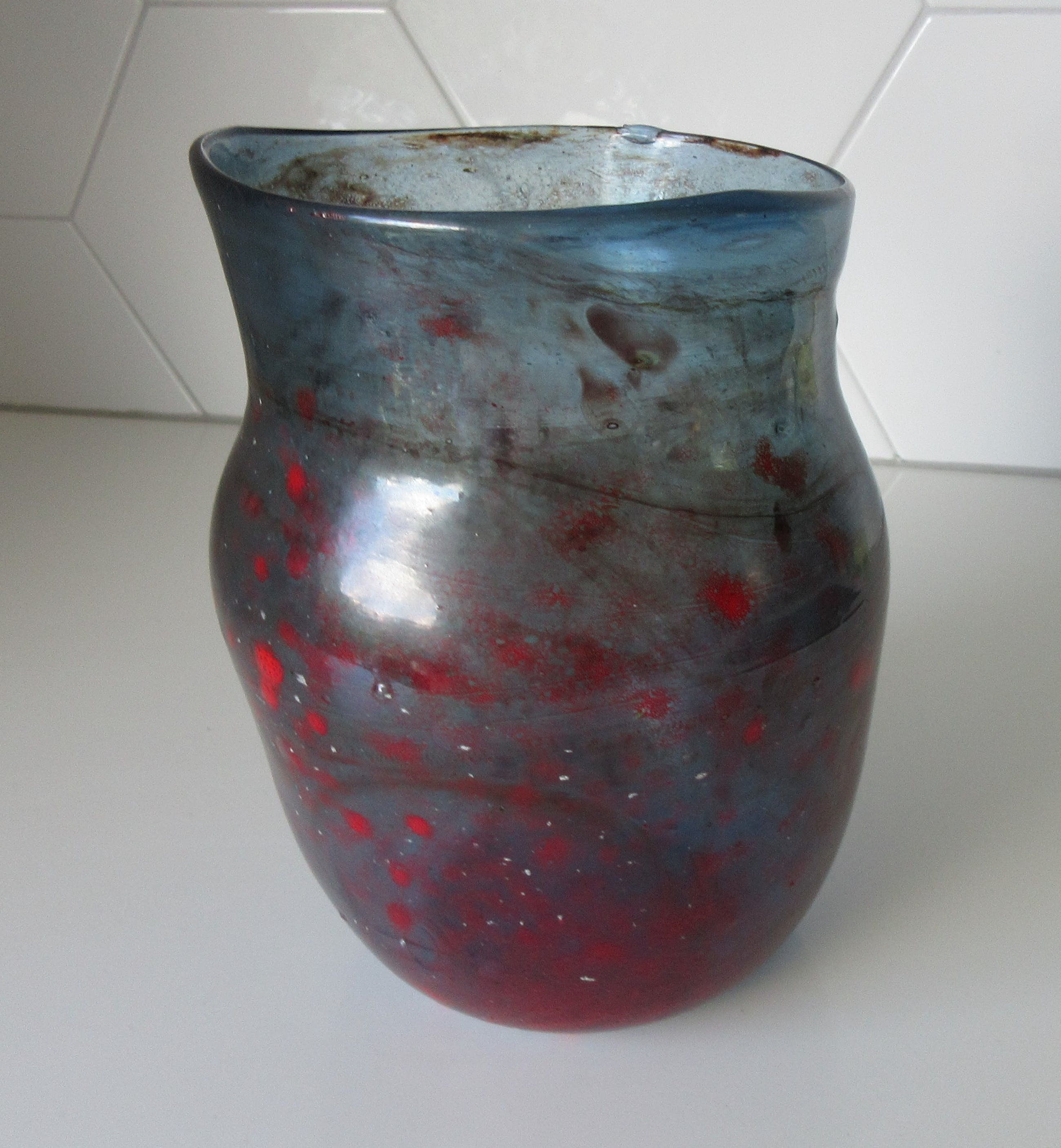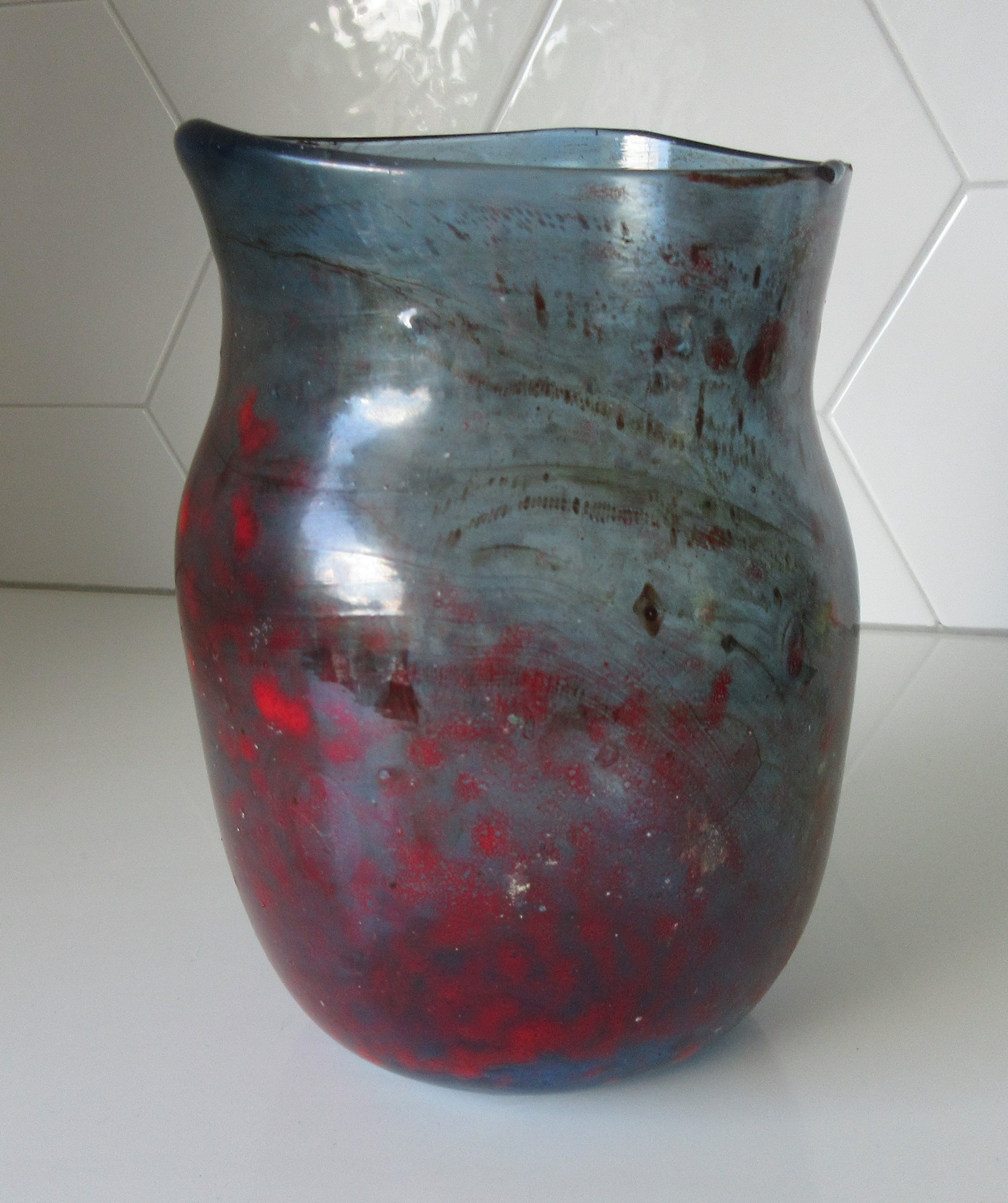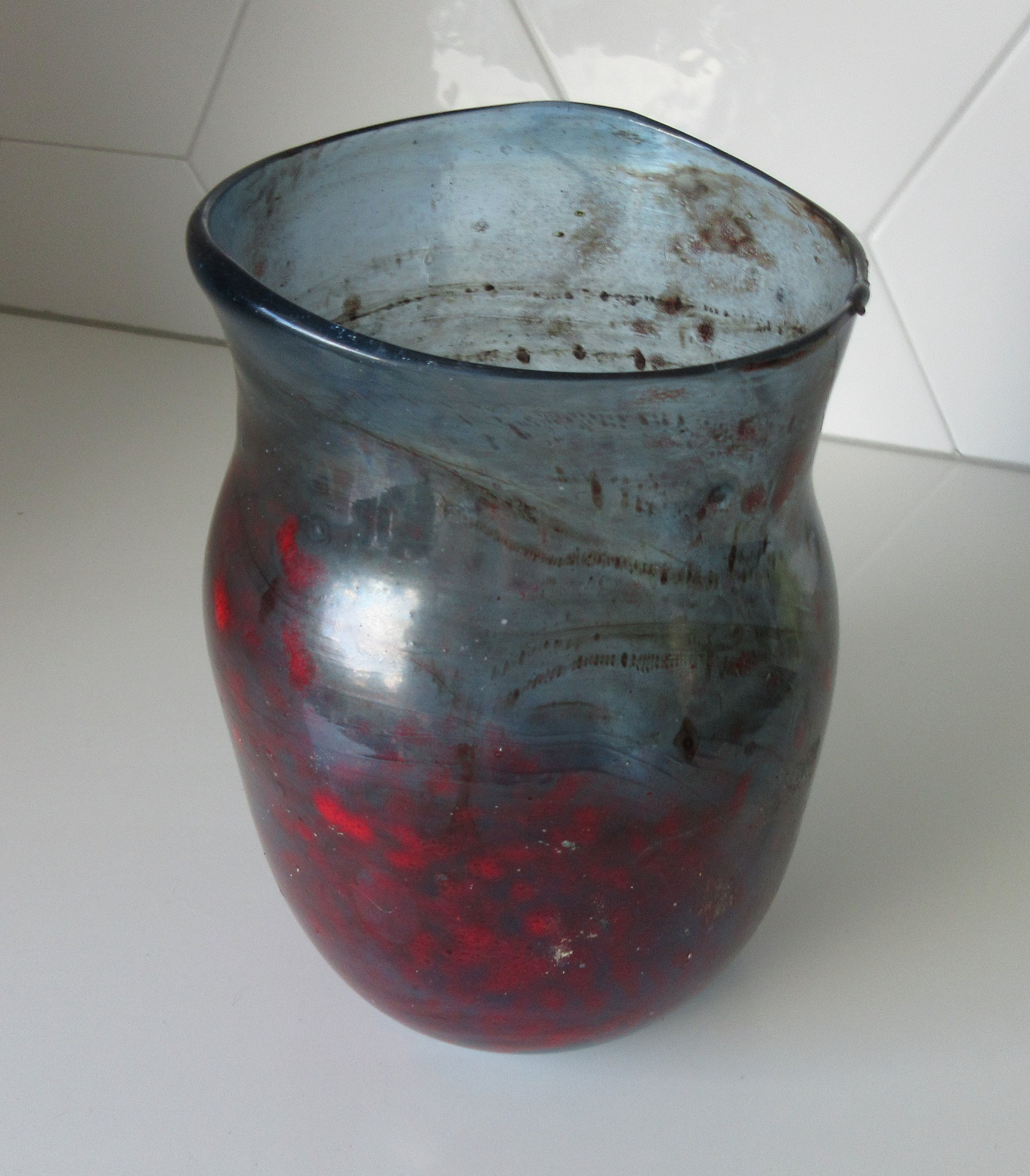 Studio blauw glazen vaas met o.a. rode glaspoeders en groene swirls - hand gesigneerd, maar helaas voor mij ontcijferbaar. Maar een mooi modern stukg glas, mogelijk een unica. Mocht u de signatuut of de stijl herkennen dan hoor ik graag wie de kunstenaar is!