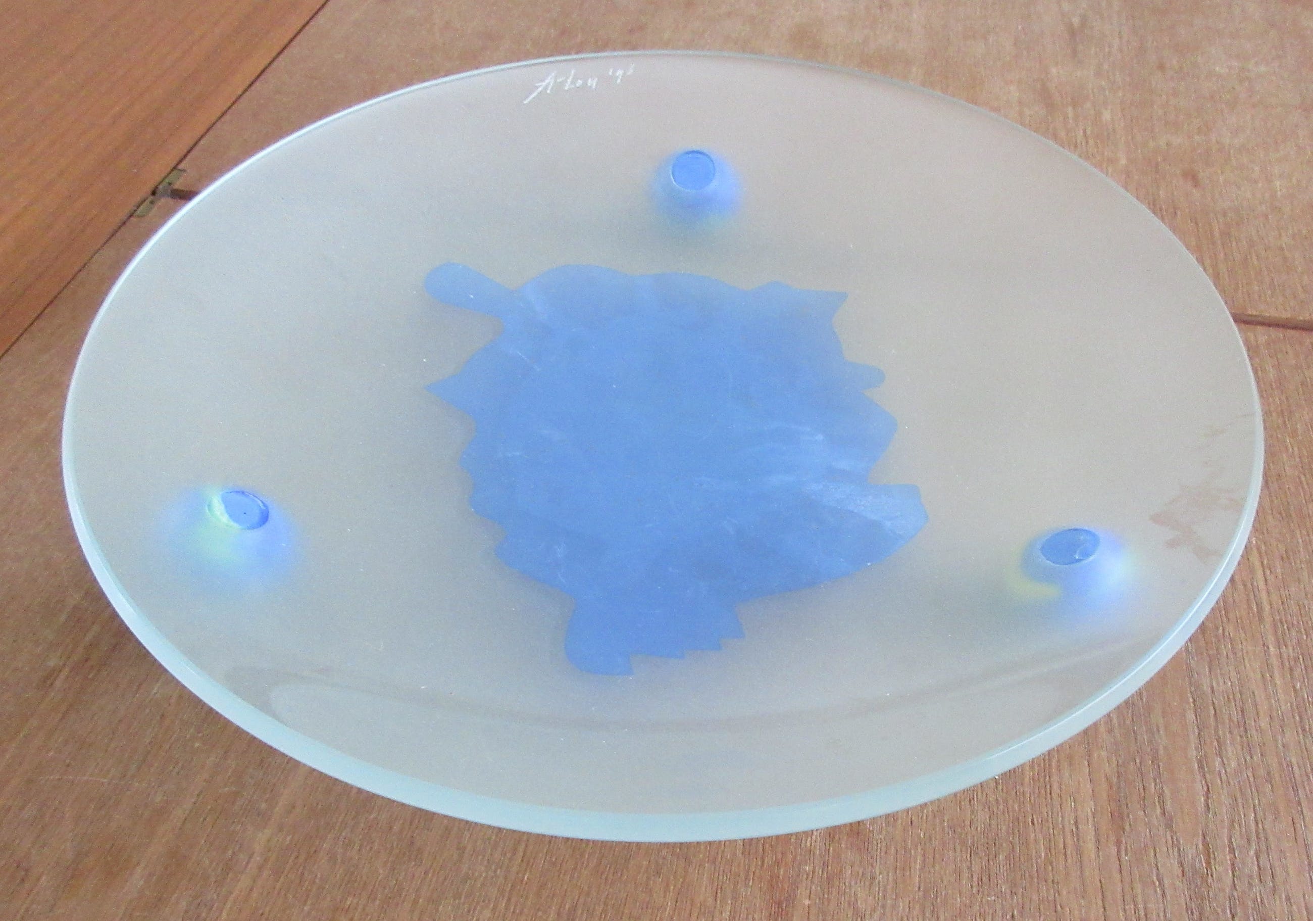 Studio gesatineerd glazen schaal op massieve knikkers als voet gesigneerd A. Lau '97. Gemaakt in opdracht voor Unique international, dit staat op een van de bolvoeten gegraveerd; 'specially made for Unique International'. Onbeschadigde conditie.