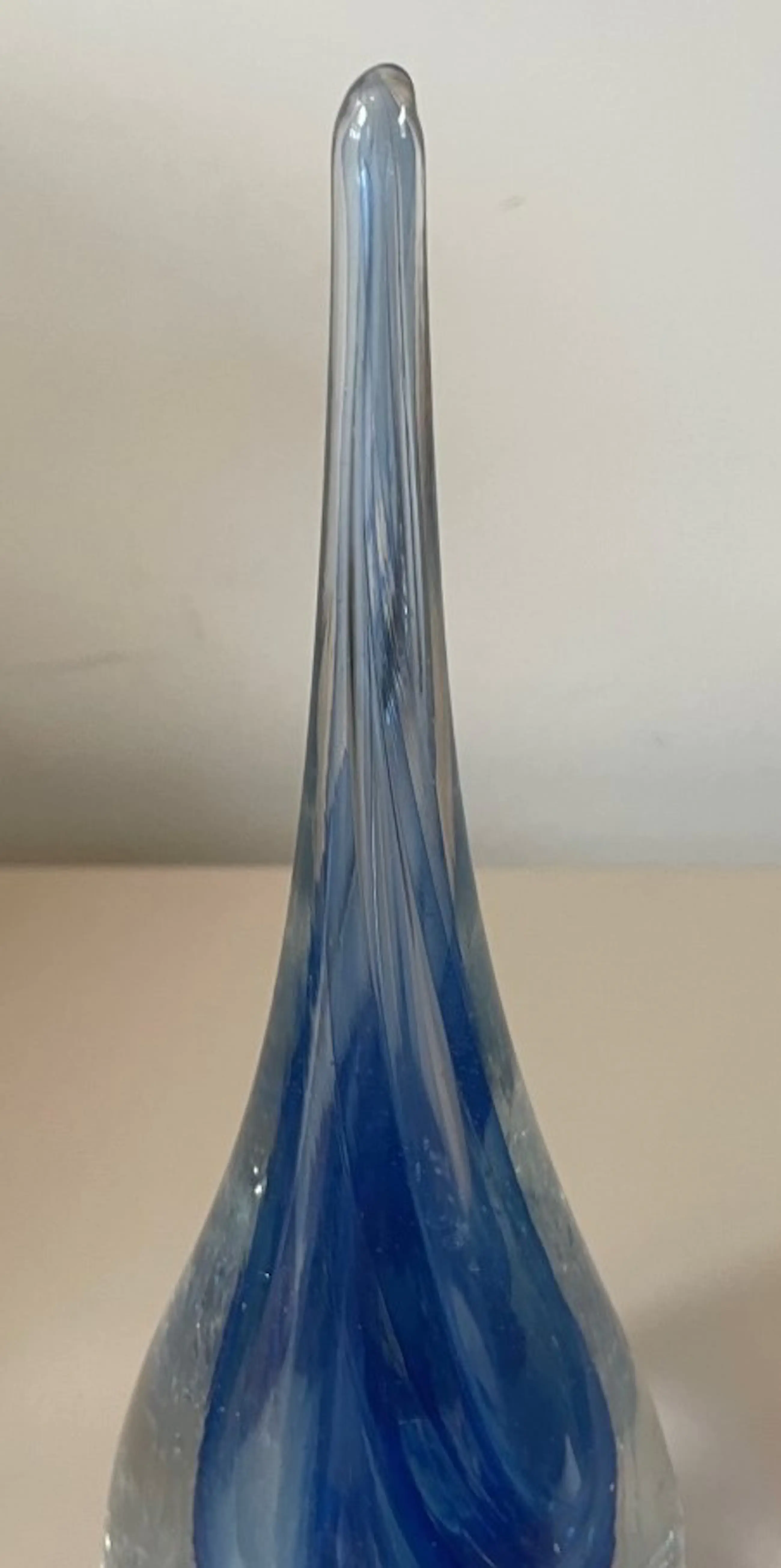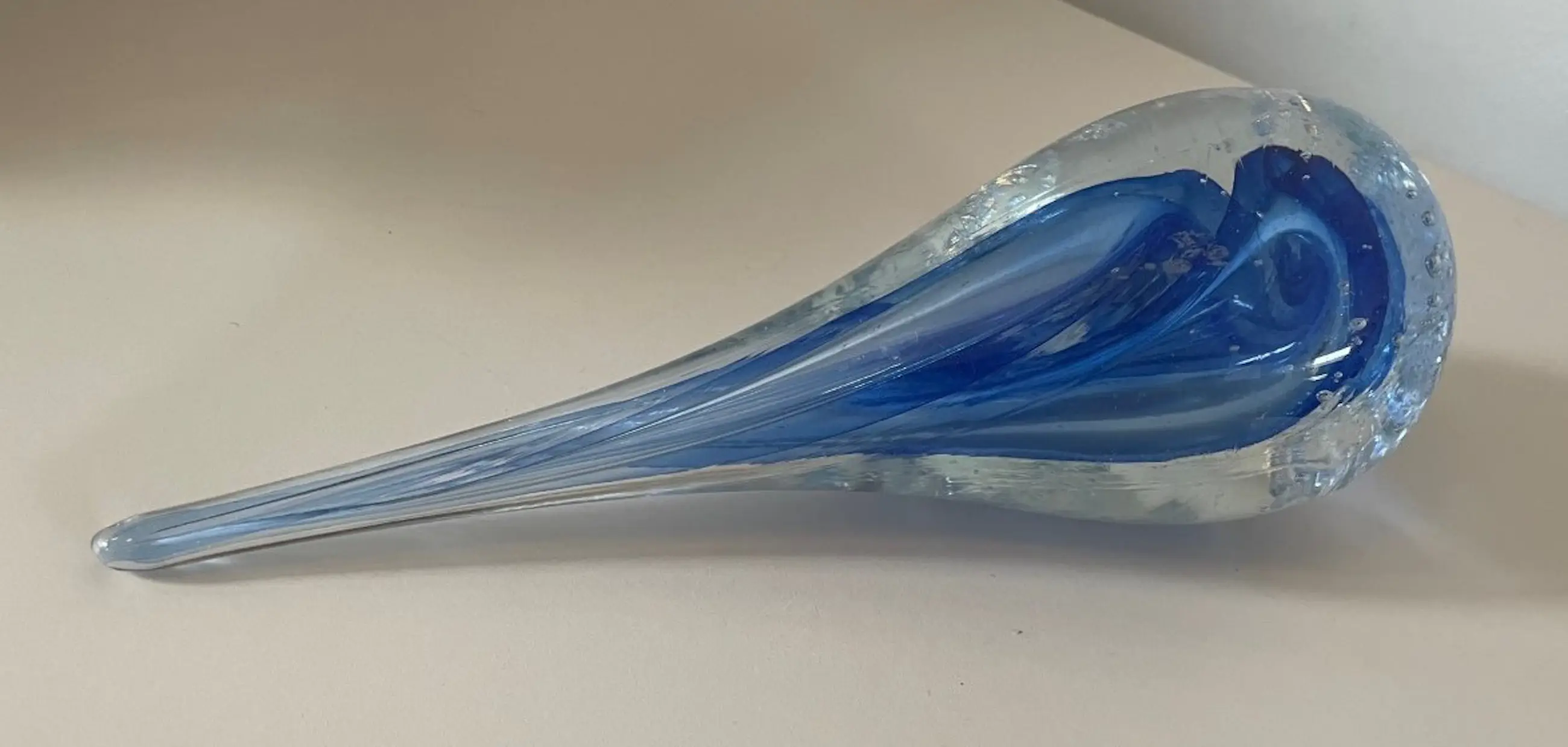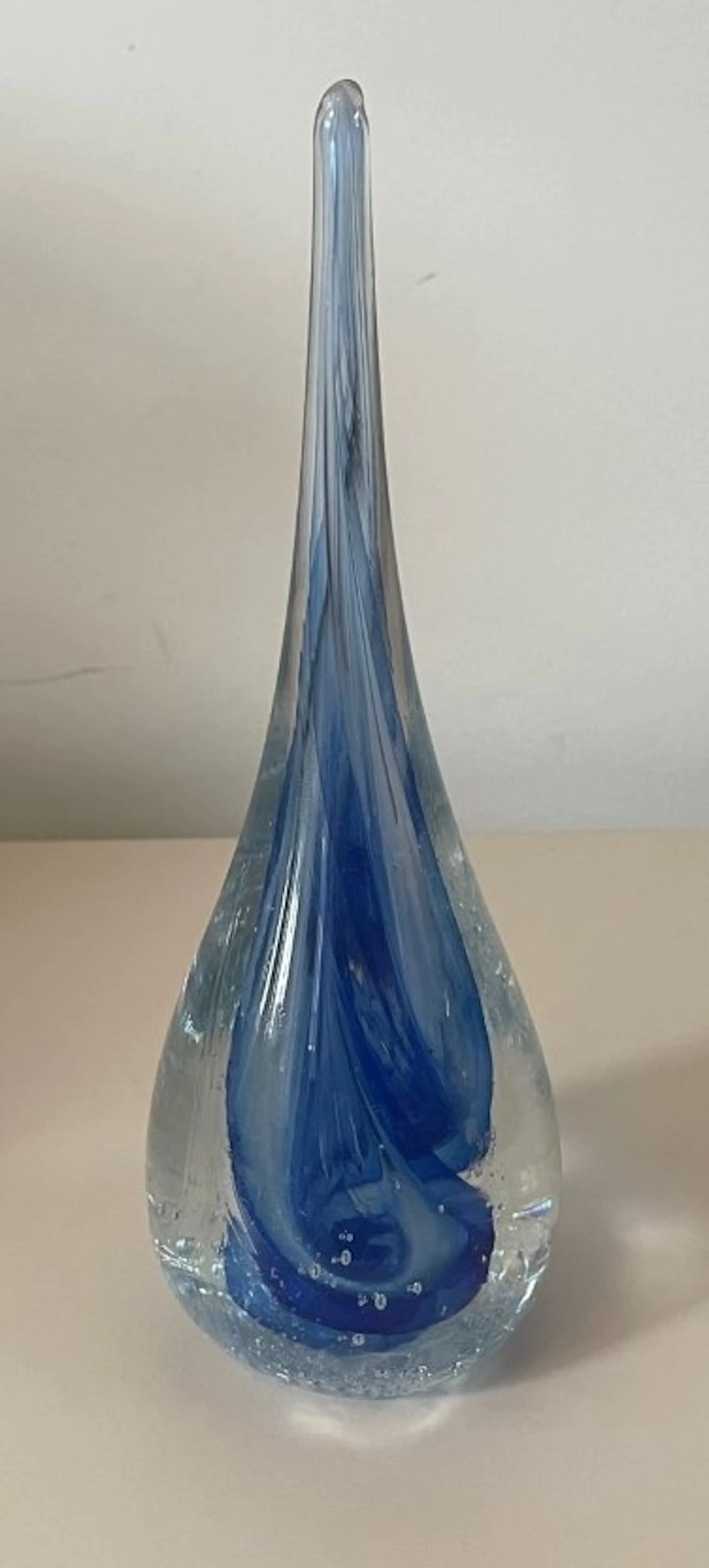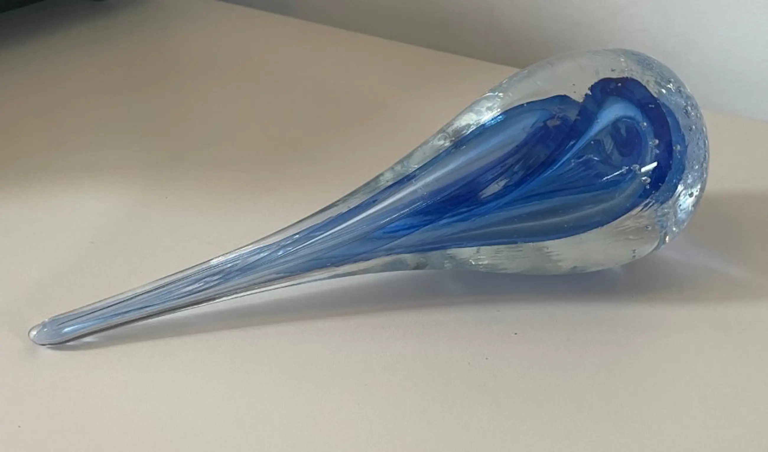 Studio glazen druppel met blauwe - witte swirls van glaspoeder aan de binnenzijde en onderaan ook luchtbellen. In perfecte nieuw conditie. Onderaan met diamantpen gesigneerd Wils en gedateerd 2005 en voorzien van een monogram in de vorm van een ?