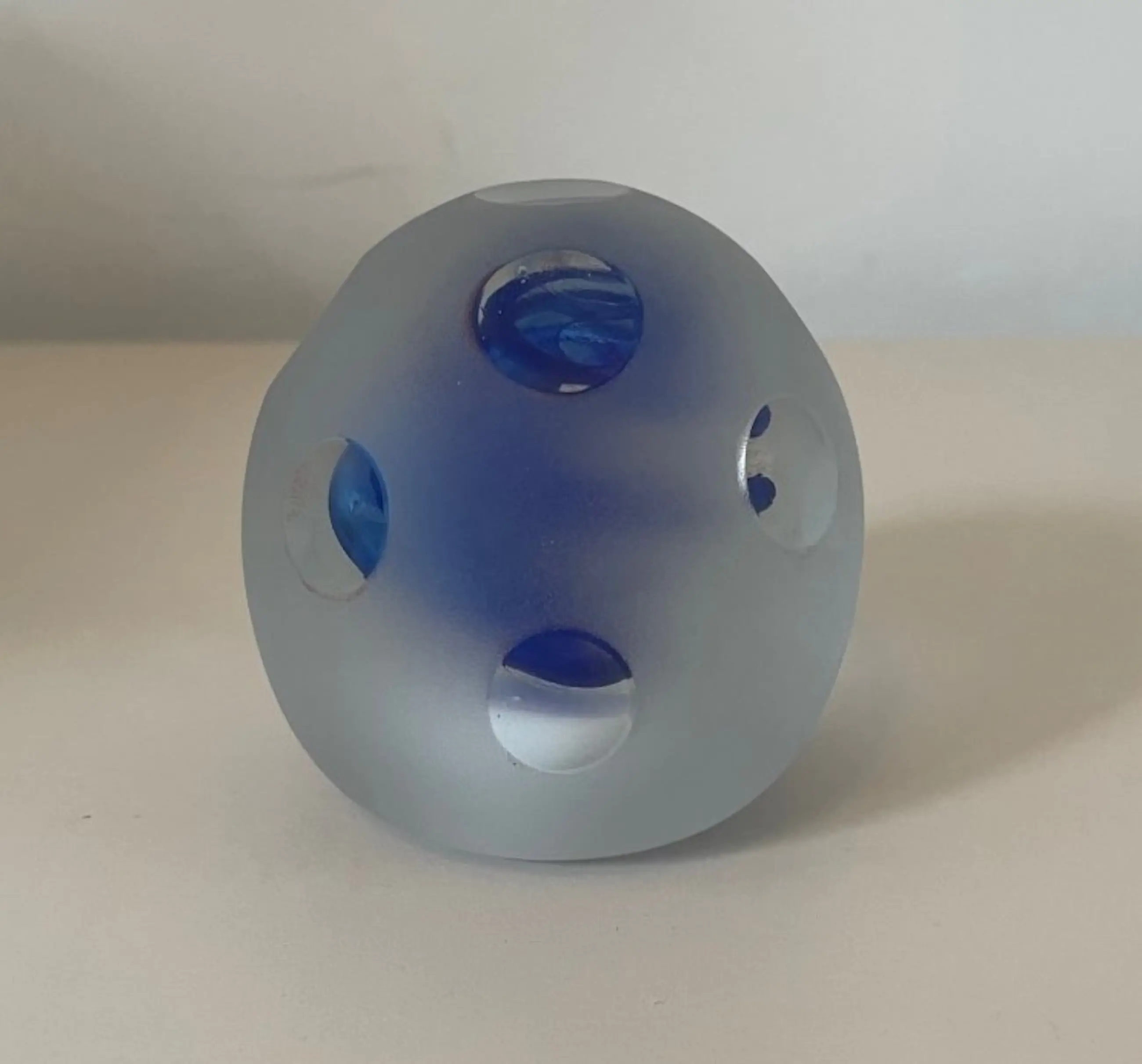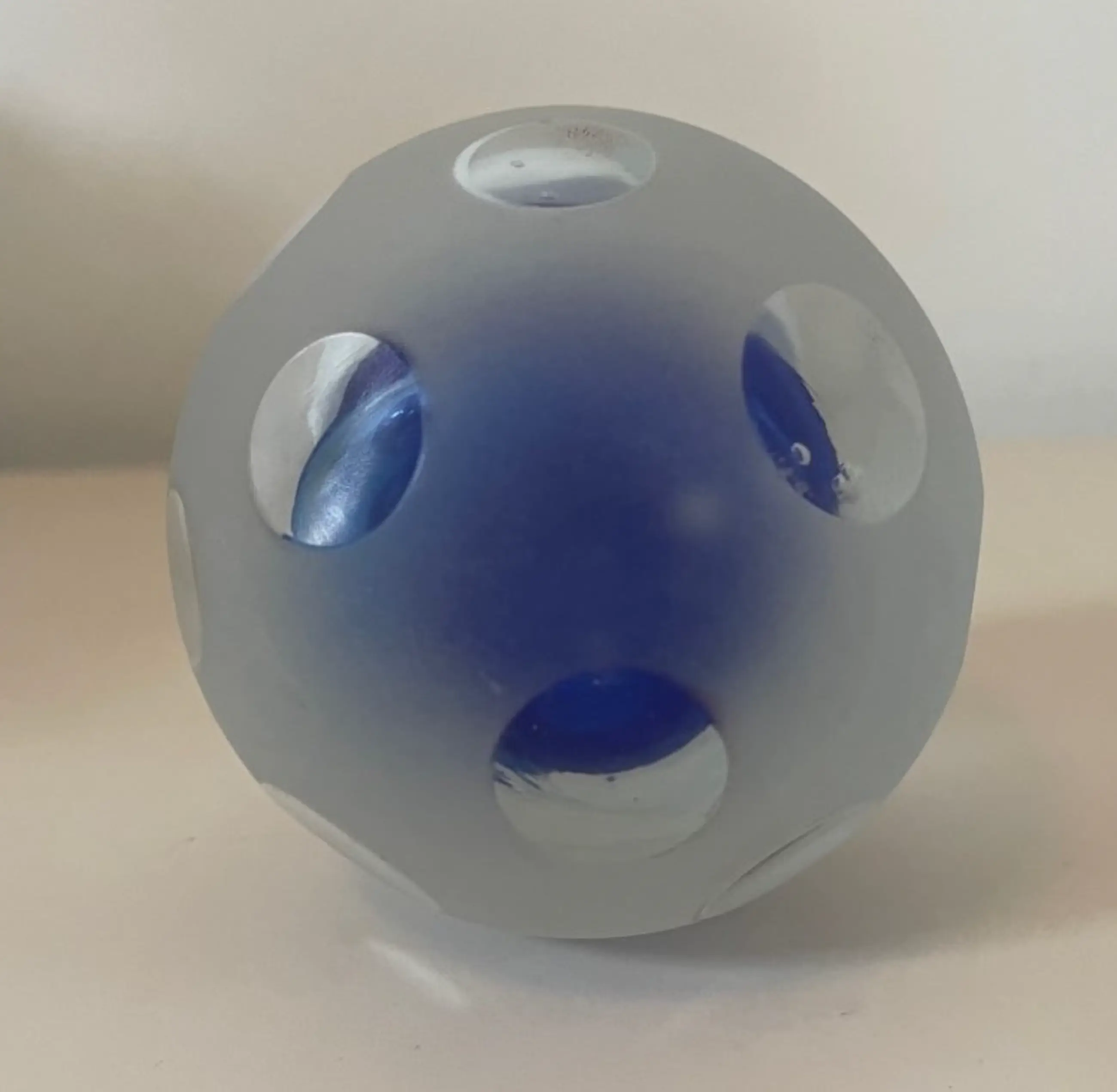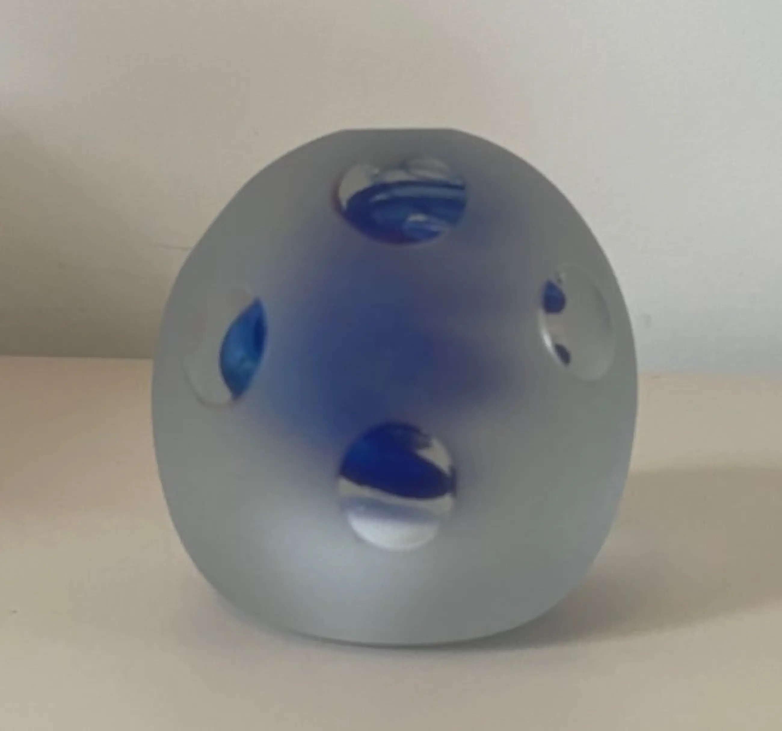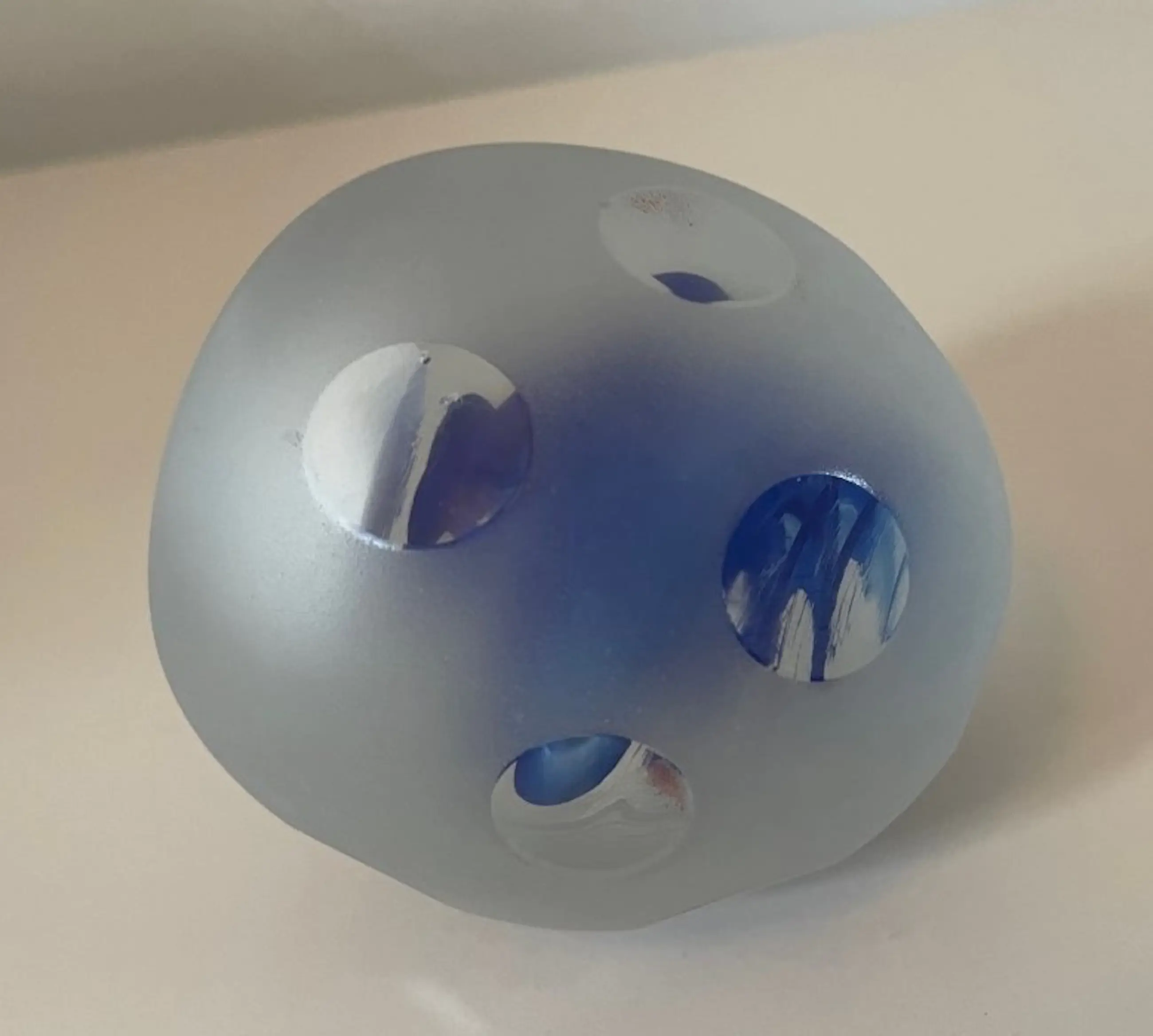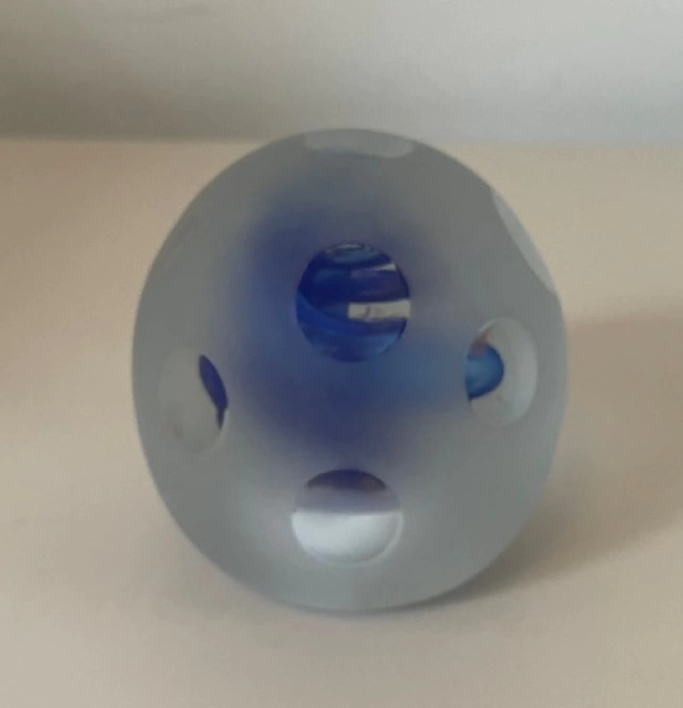 Studio gesatineerde glazen bol of presse papier met geslepen en gepolijste cirkels aan de buitenkant en een blauwe swirl/bloem met een witte steel aan de binnenzijde. In perfecte nieuw conditie. Onderaan met diamantpen gesigneerd Wils en gedateerd 2016.