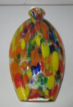 Studio glazen multi coloured ovale vaas. Ontwerper onbekend. Niet gesigneerd, wel voorzien van een gepolijst pontil merk op de bodem. Doet Murano achtig aan.