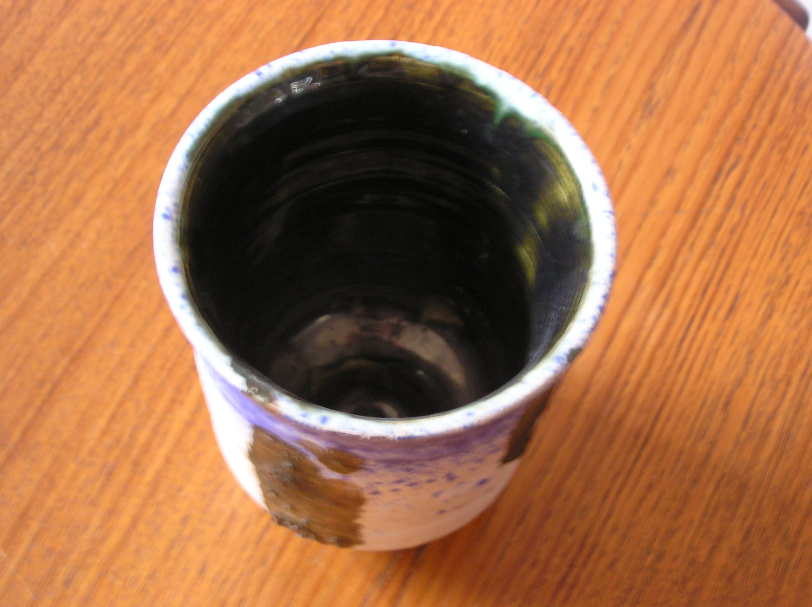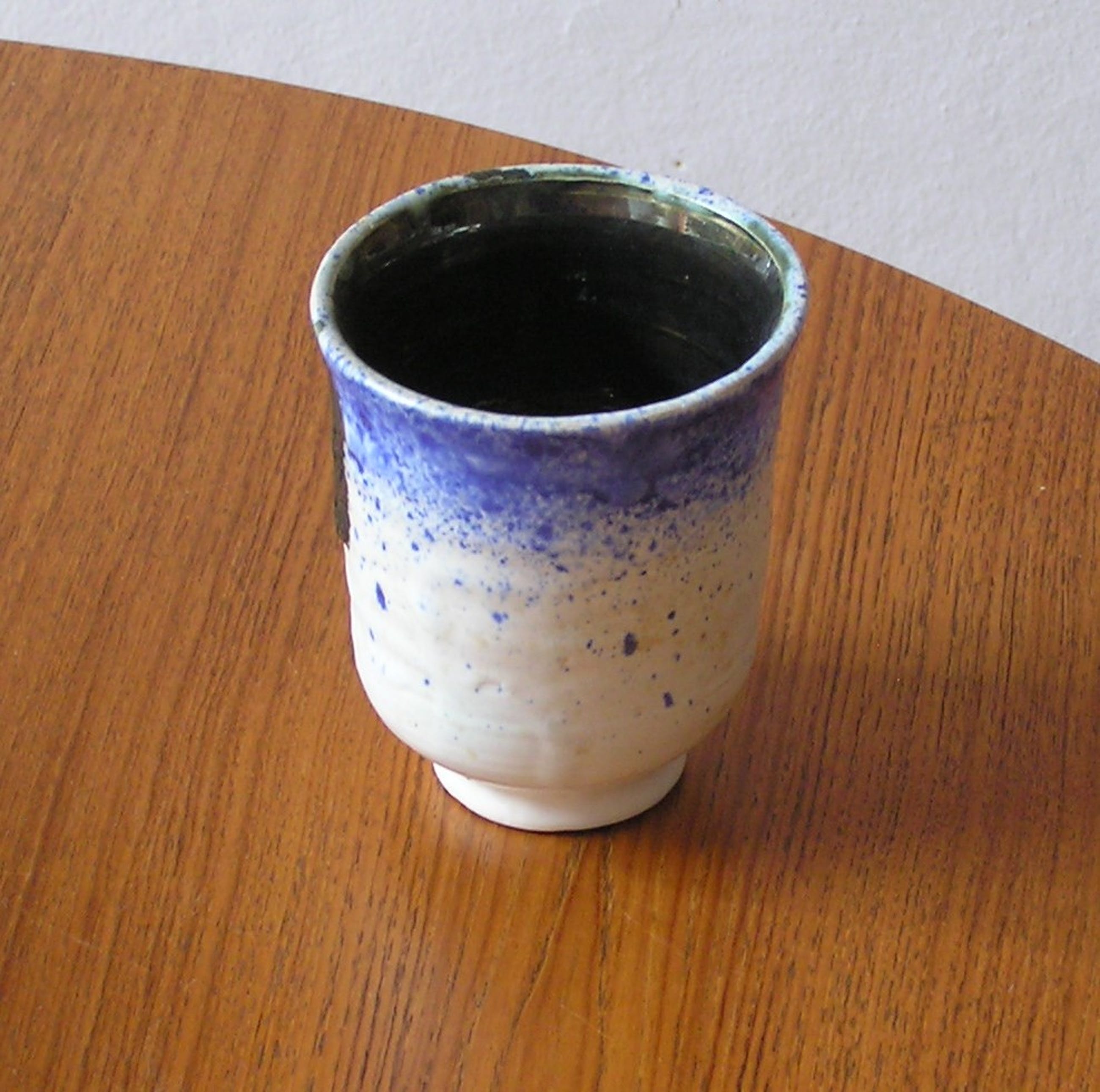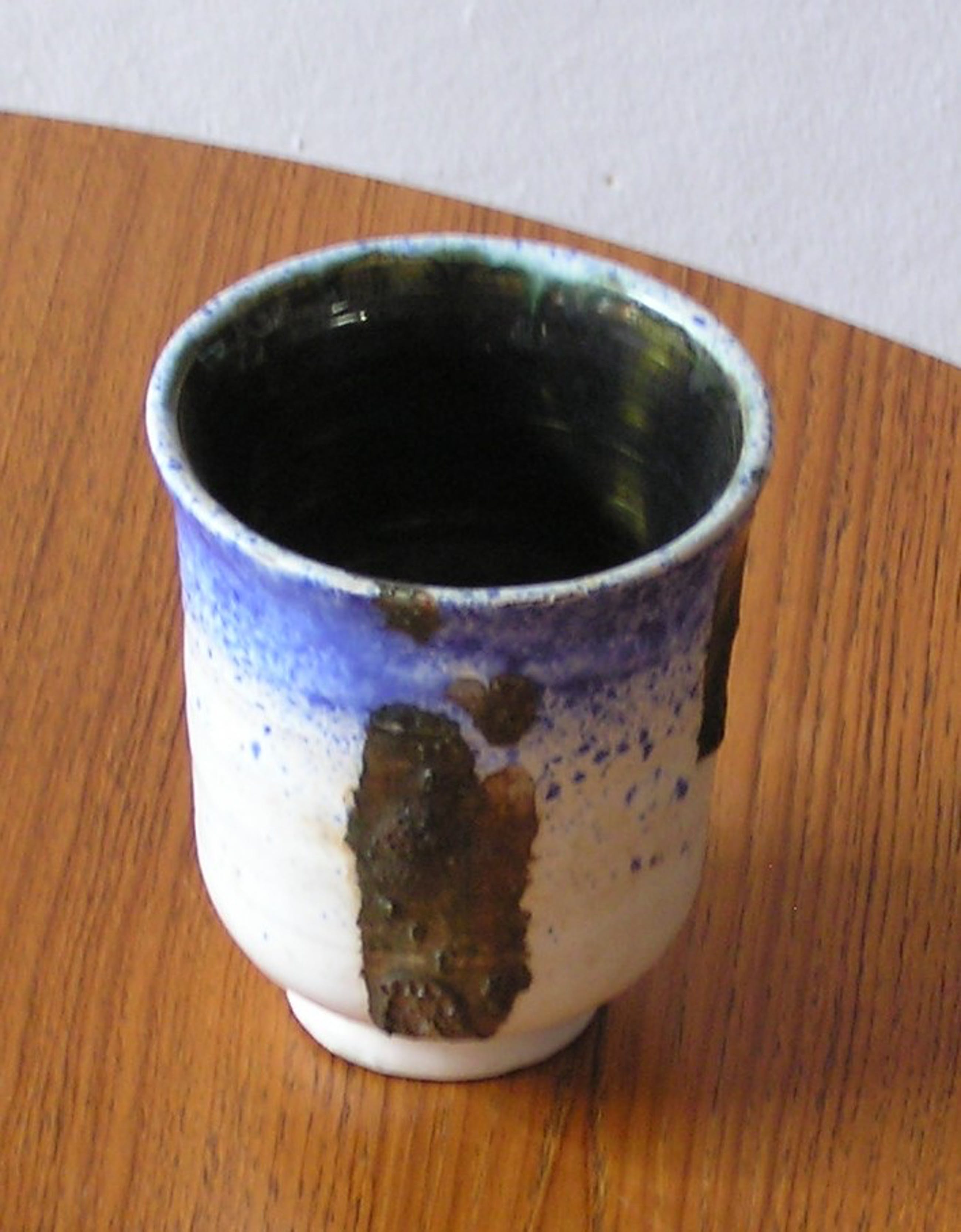 Studio keramisch bekervaasje voorzien van mat wit glazuur, hardblauw spuitglazuur en aan de binnenzijde en buitenzijde een soort van brons/koper glazuur. Met de hand gesigneerd AS of A5 en gedateerd 1978.