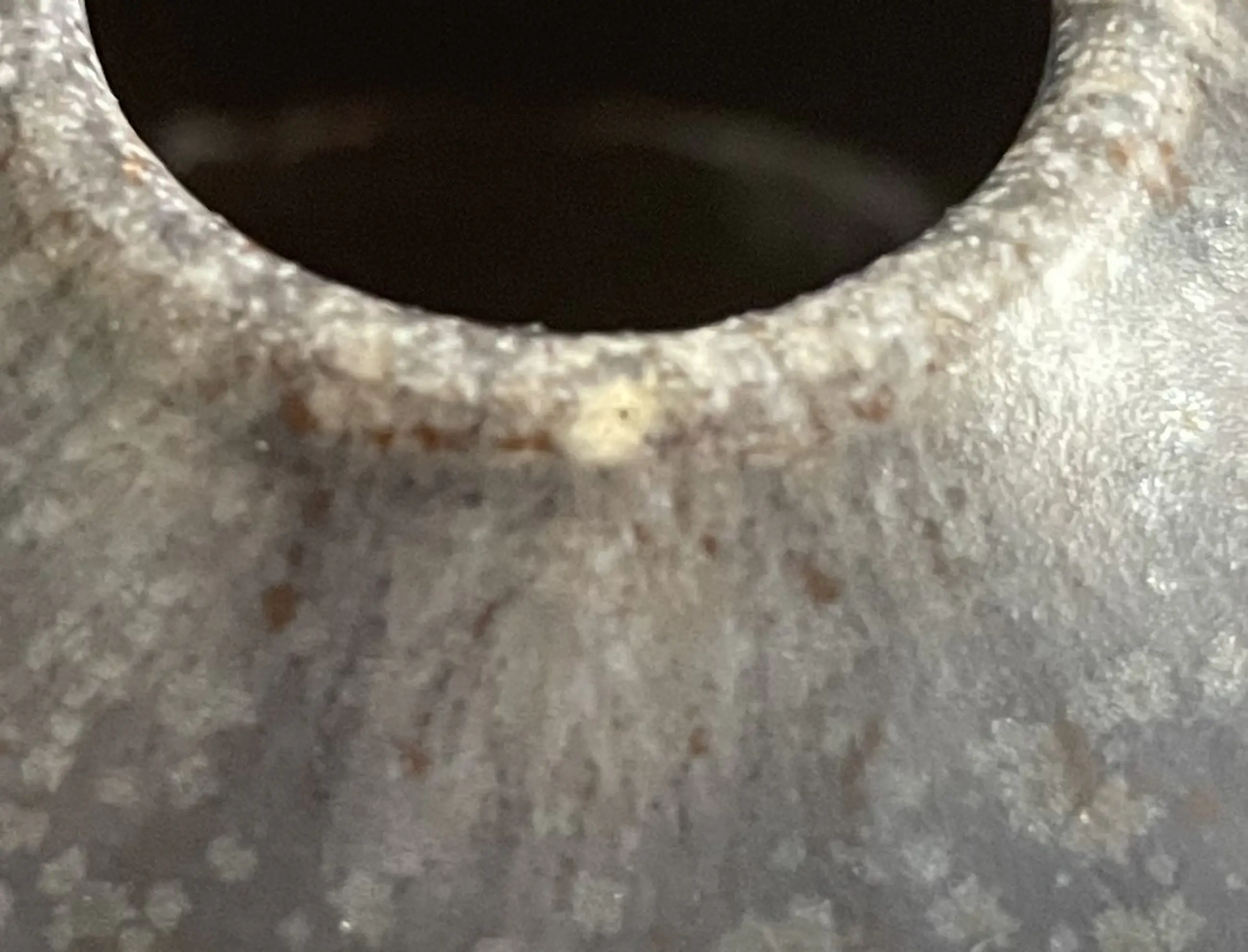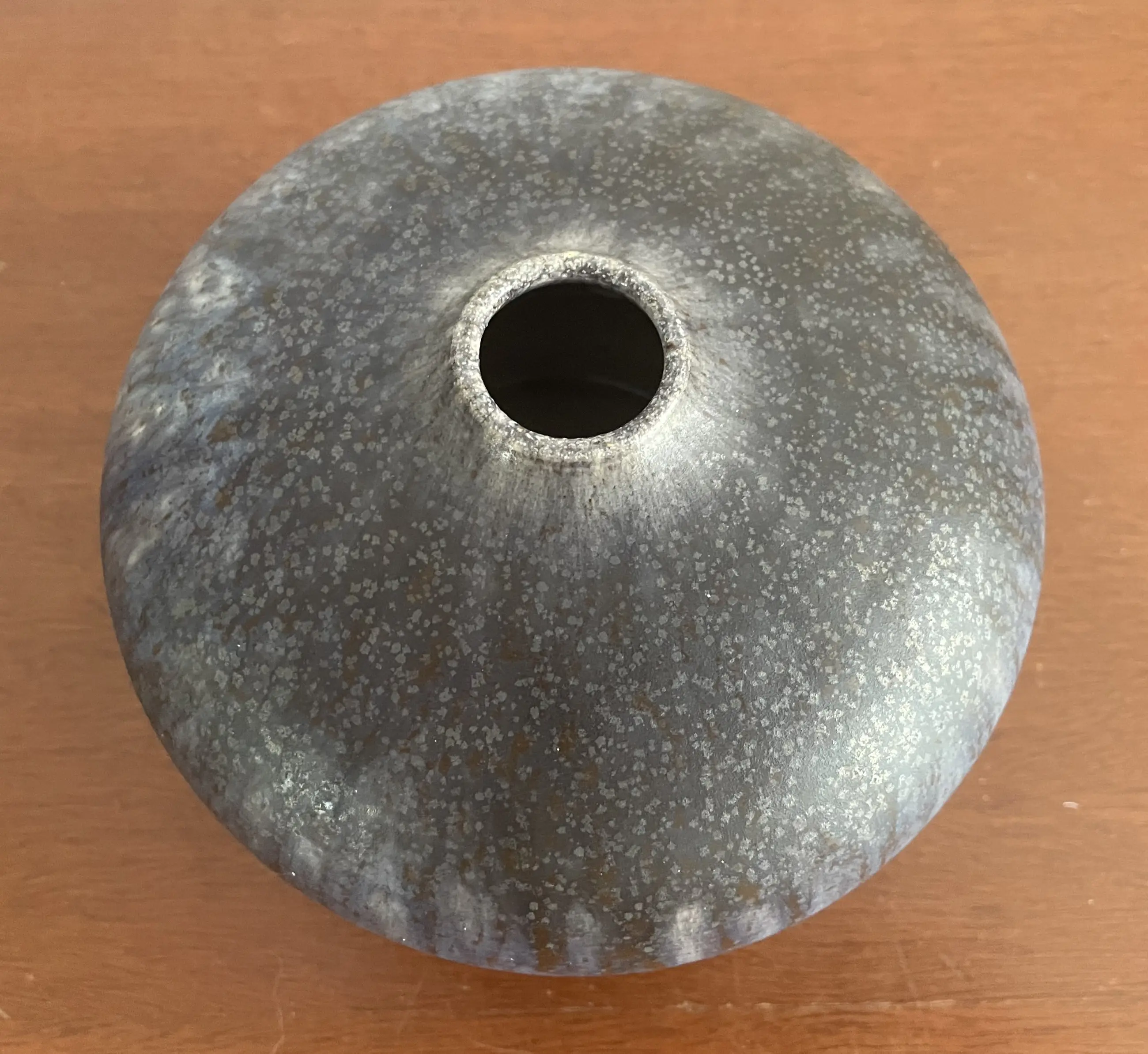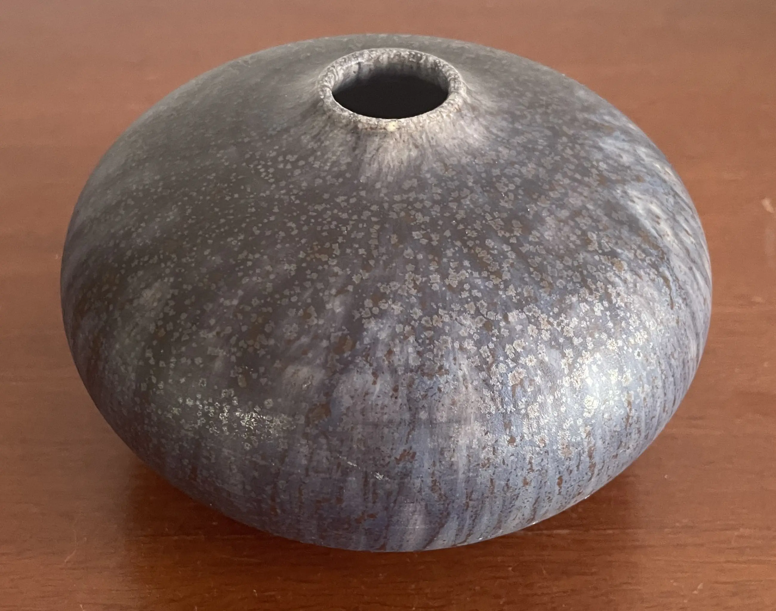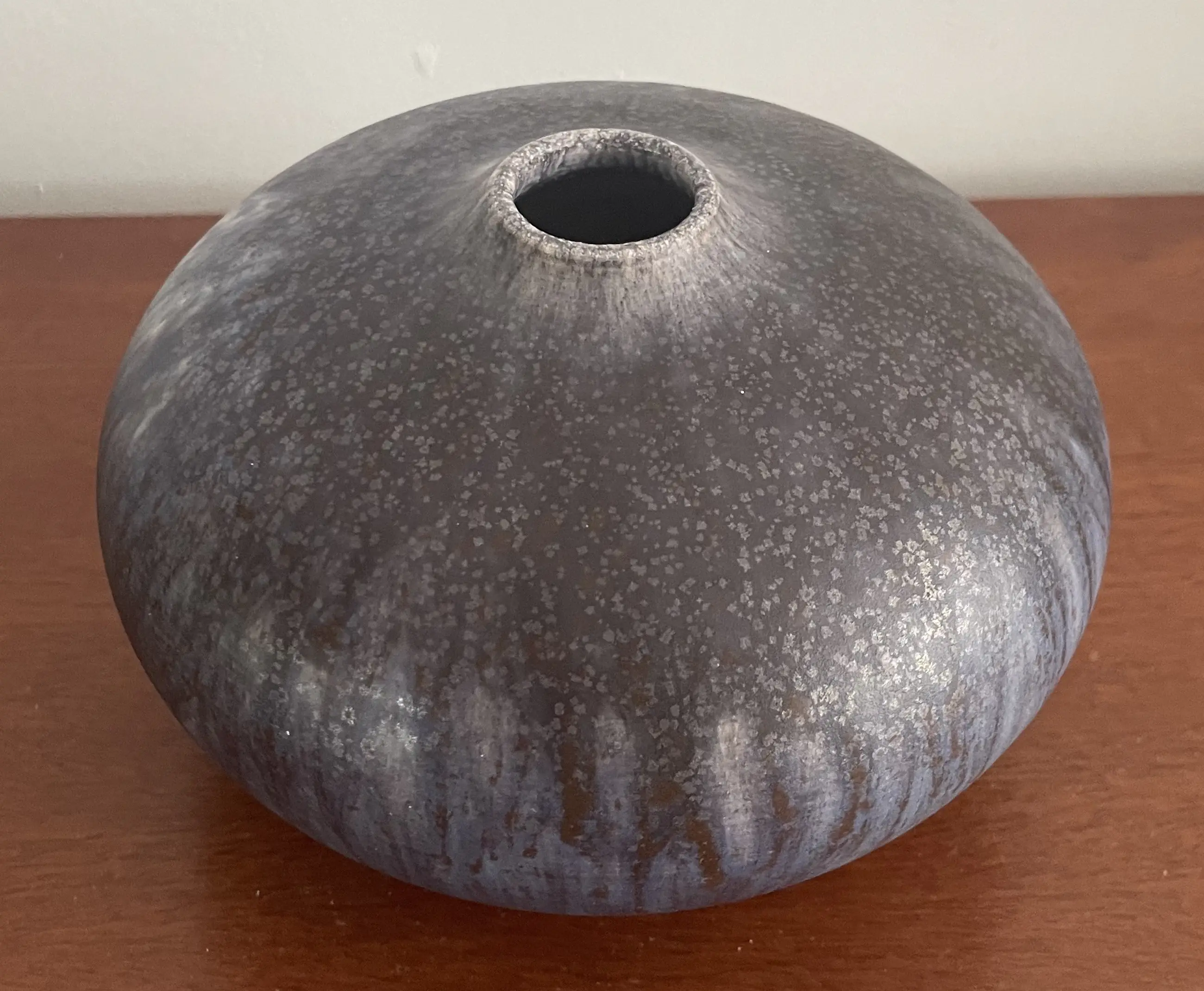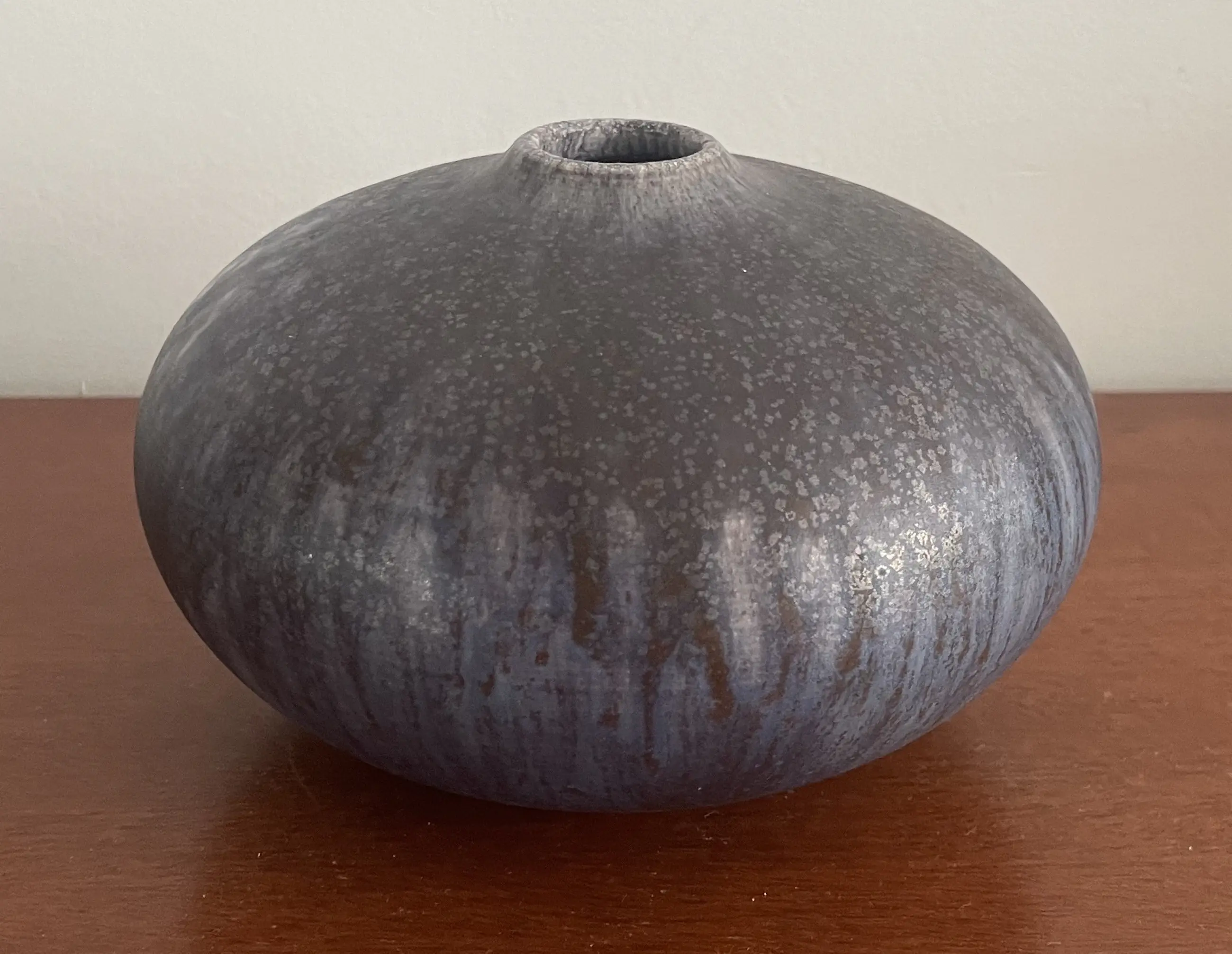 Waarschijnlijk Duits studio keramisch vaasje met grijsblauw stroom en lavaglazuur. Gesigneerd GL? Gerard Liebenthron, Bremen? In zeer goede staat, heeft een minimaal stootpuntje aan de bovenkant.