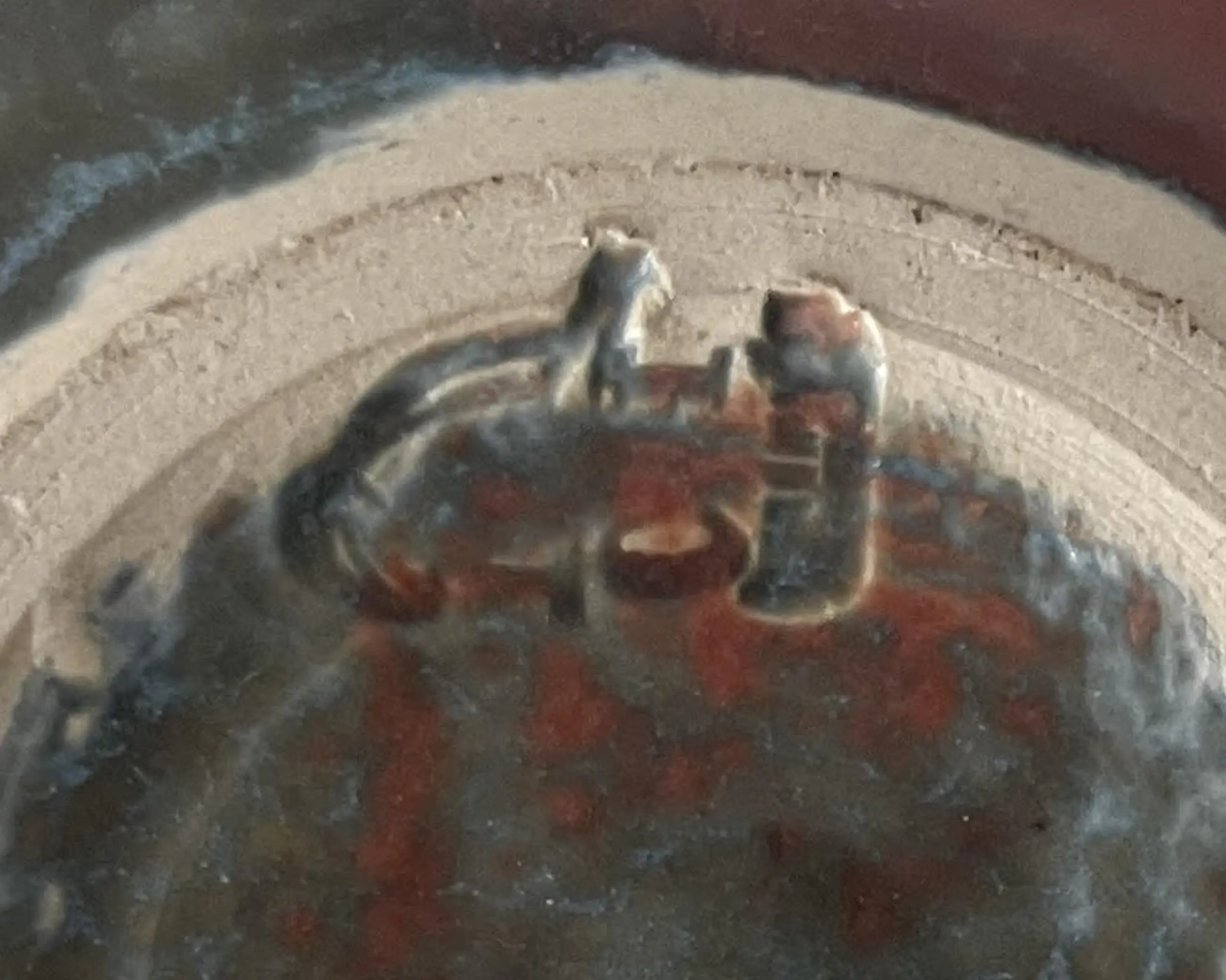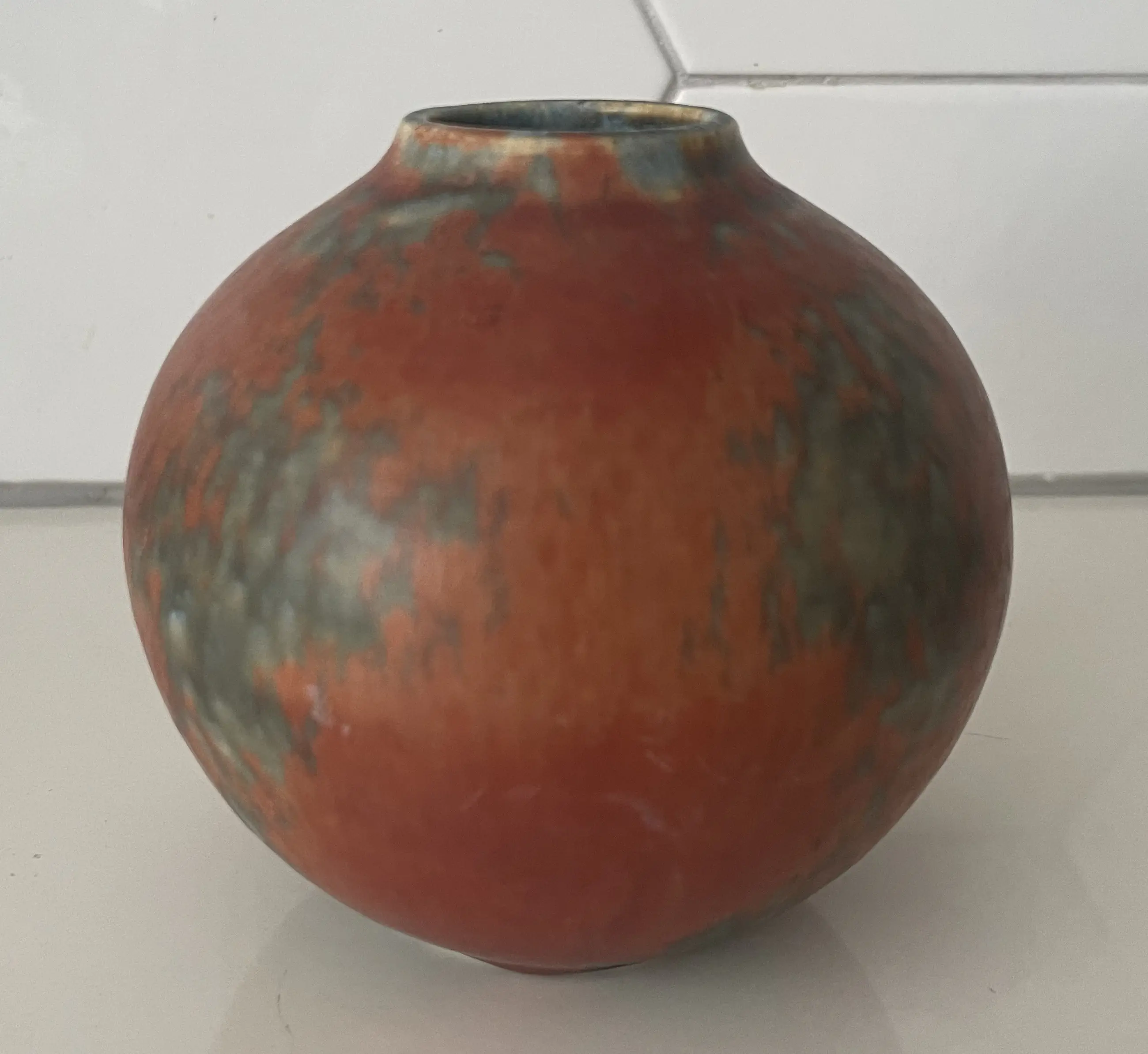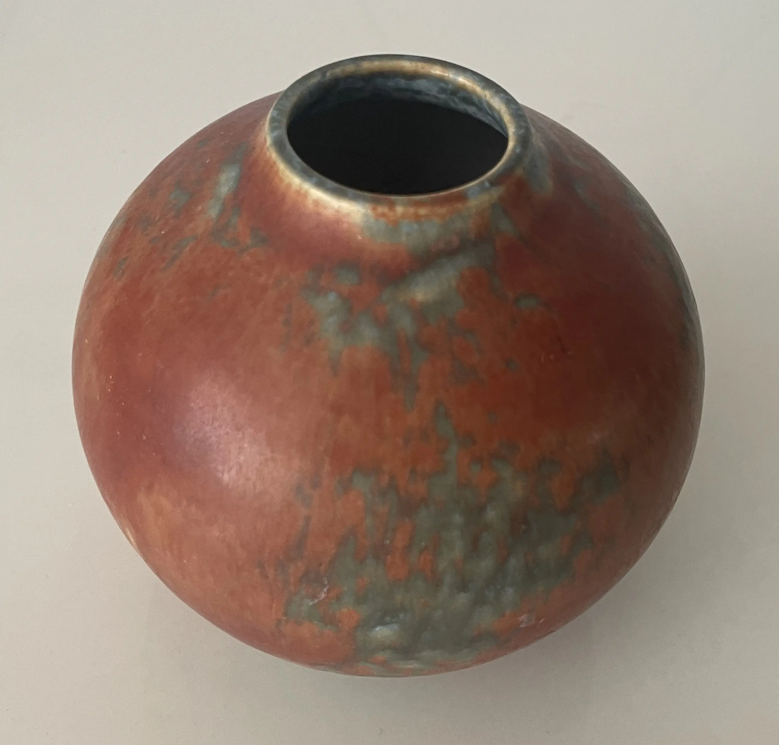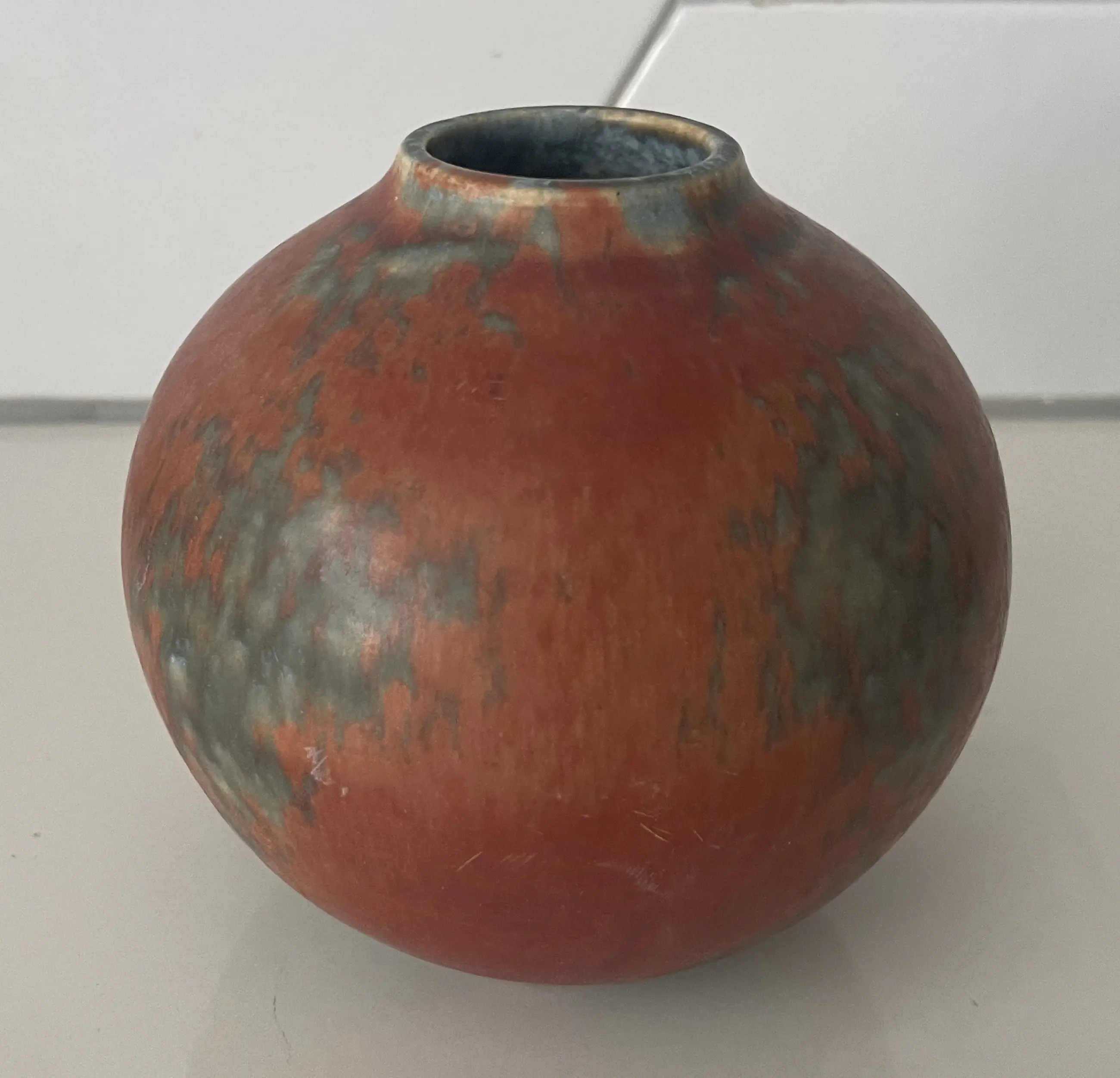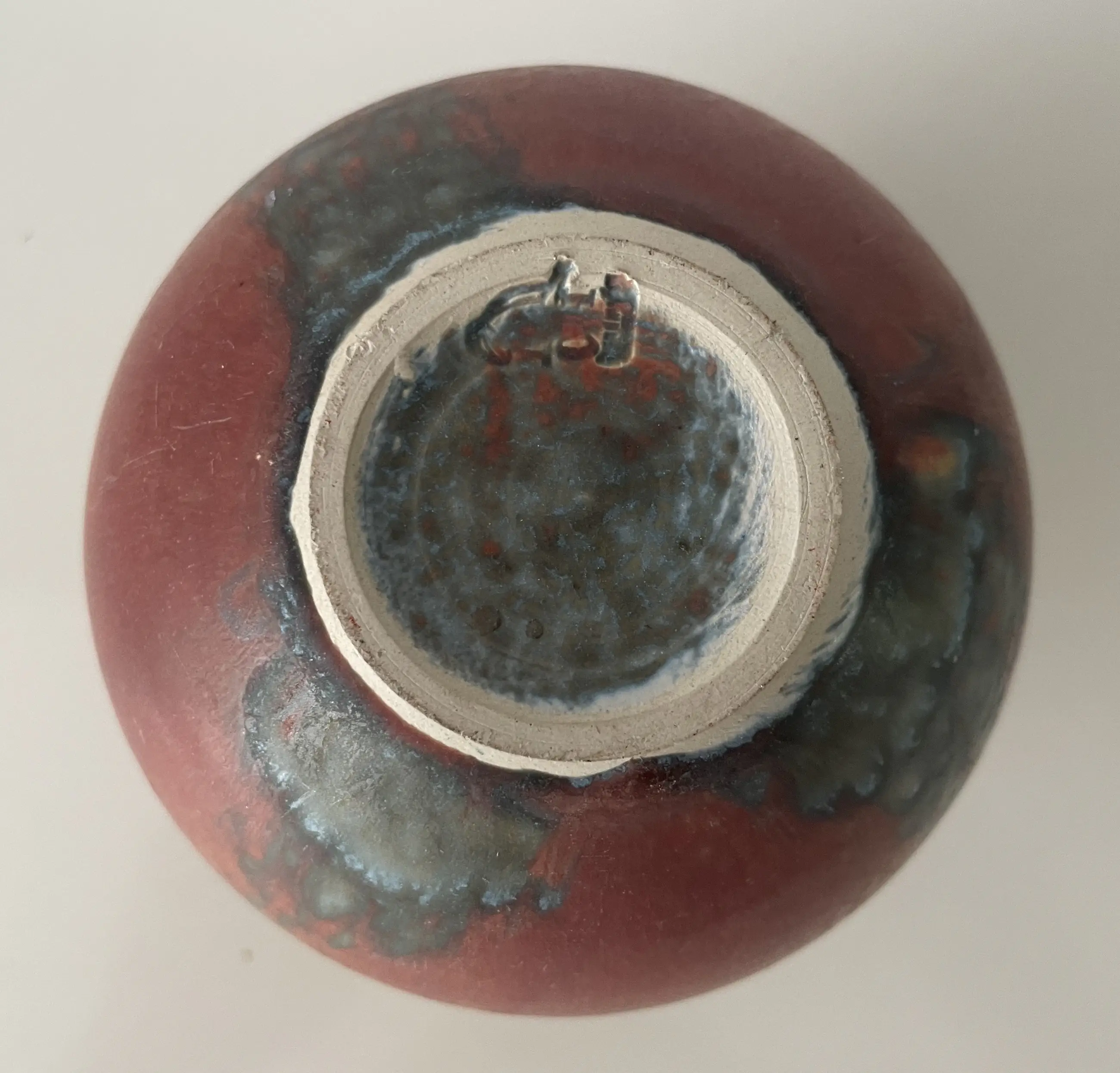 Studio keramisch bolvaasje met in bruinrood en groen koperen mat glazuur. In perfecte conditie. Voorzien van ingedrukt monogram of merk aan de onderkant. Niet goed leesbaar.