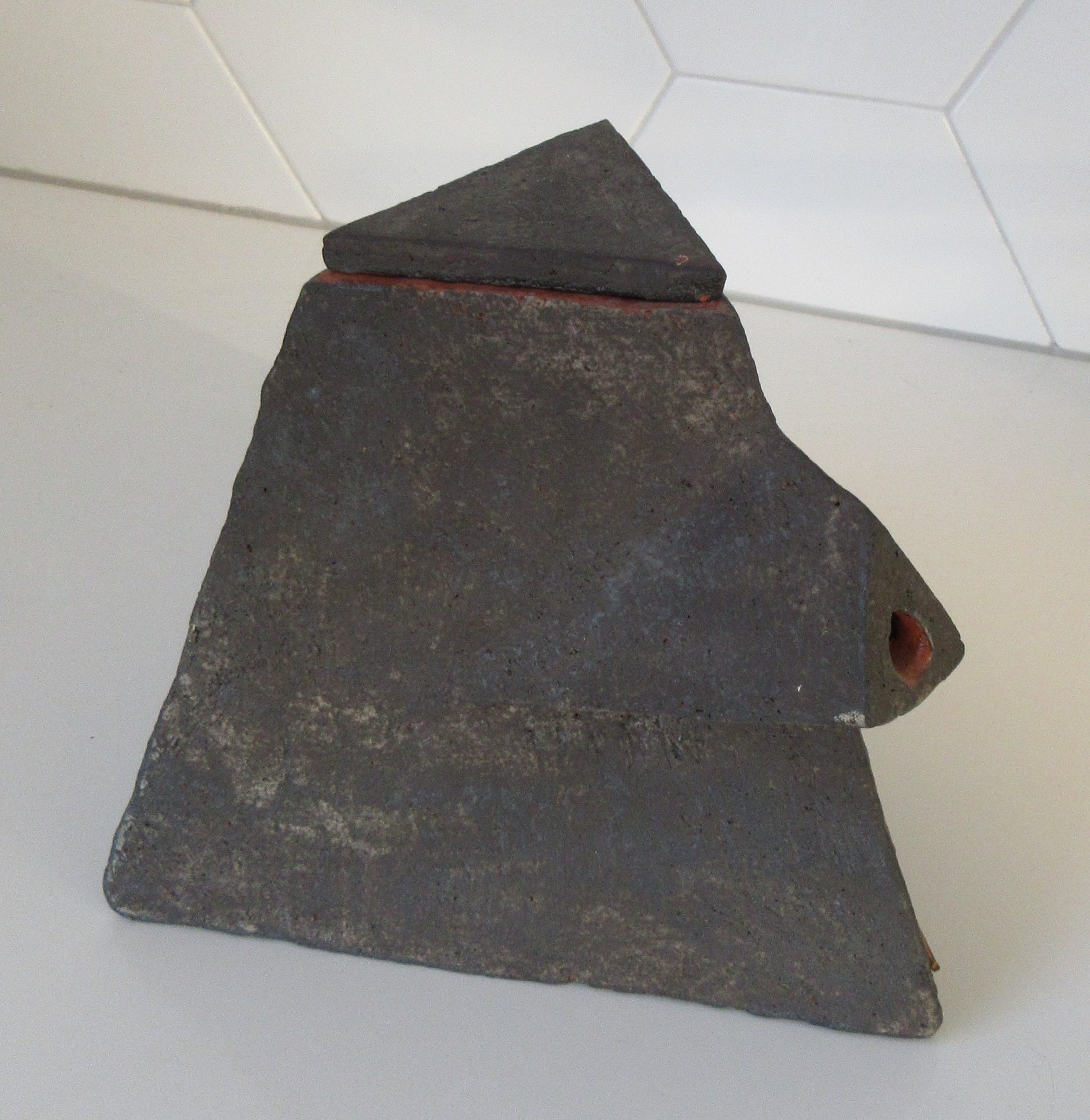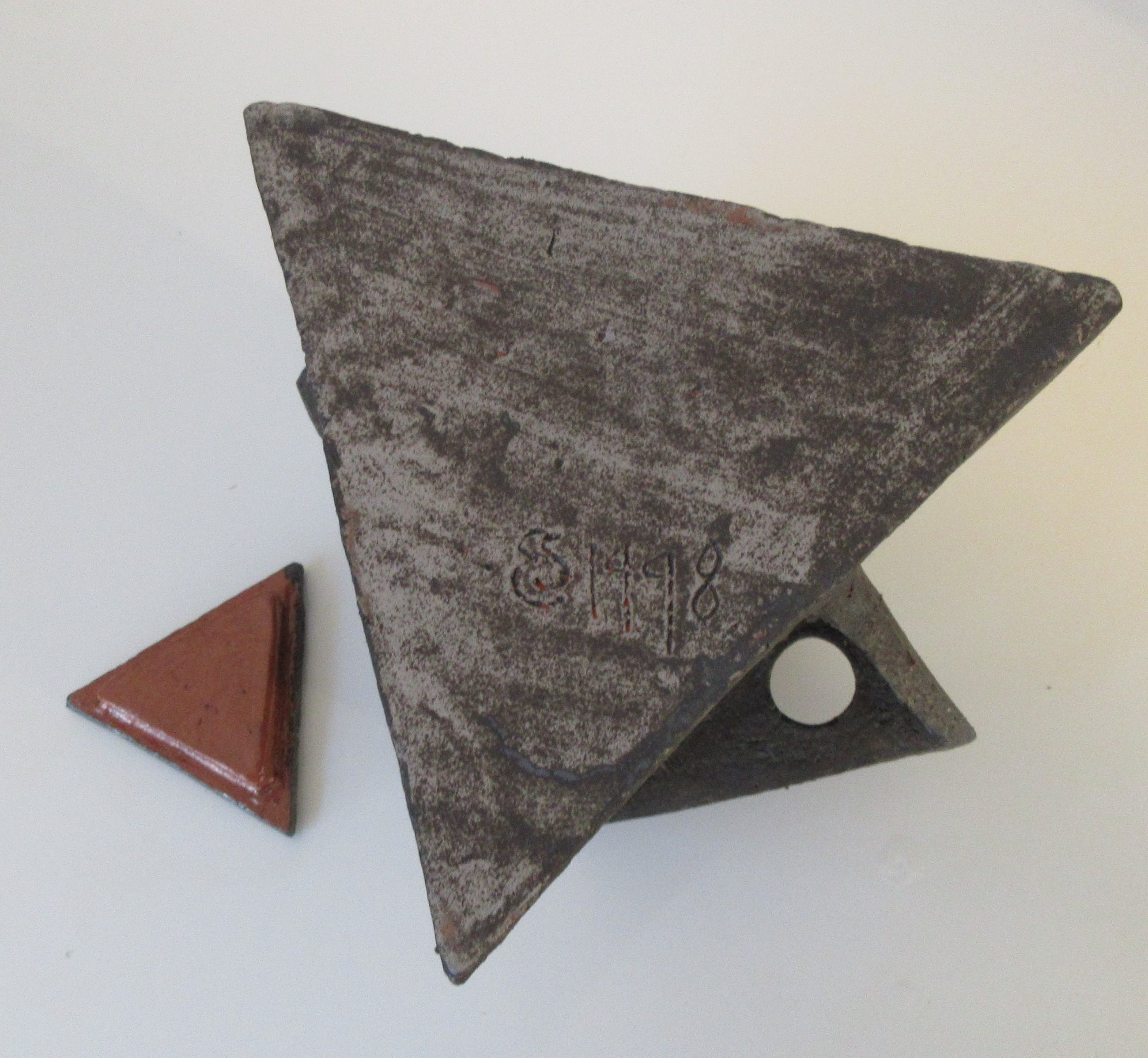 Studio Keramische Avantgardistische theepot gemaakt grof rode chamott klei met matbruine glazuur heeft op de voorzijde een koperdraad lopen. Het handvat heeft een klein chipje verder onbeschadigd. Gesigneerd ES op de onderzijde en gedateerd 1998. Kunstenaar of keramist helaas onbekend.