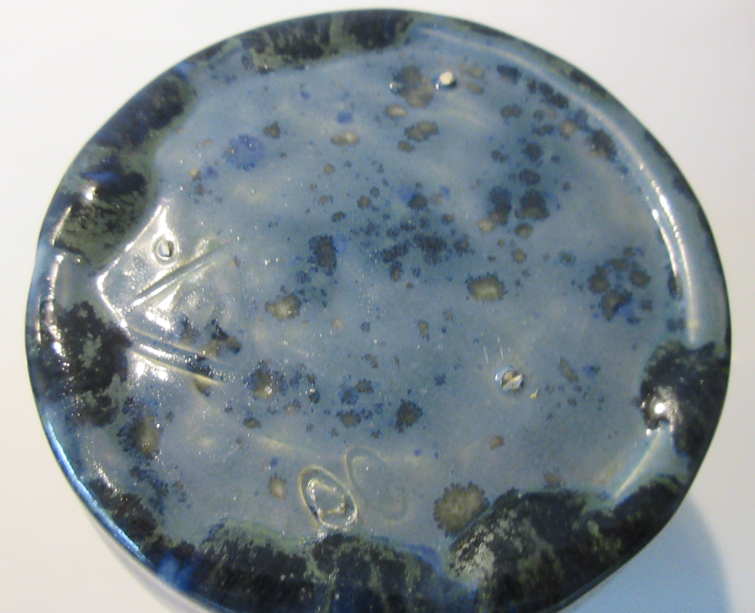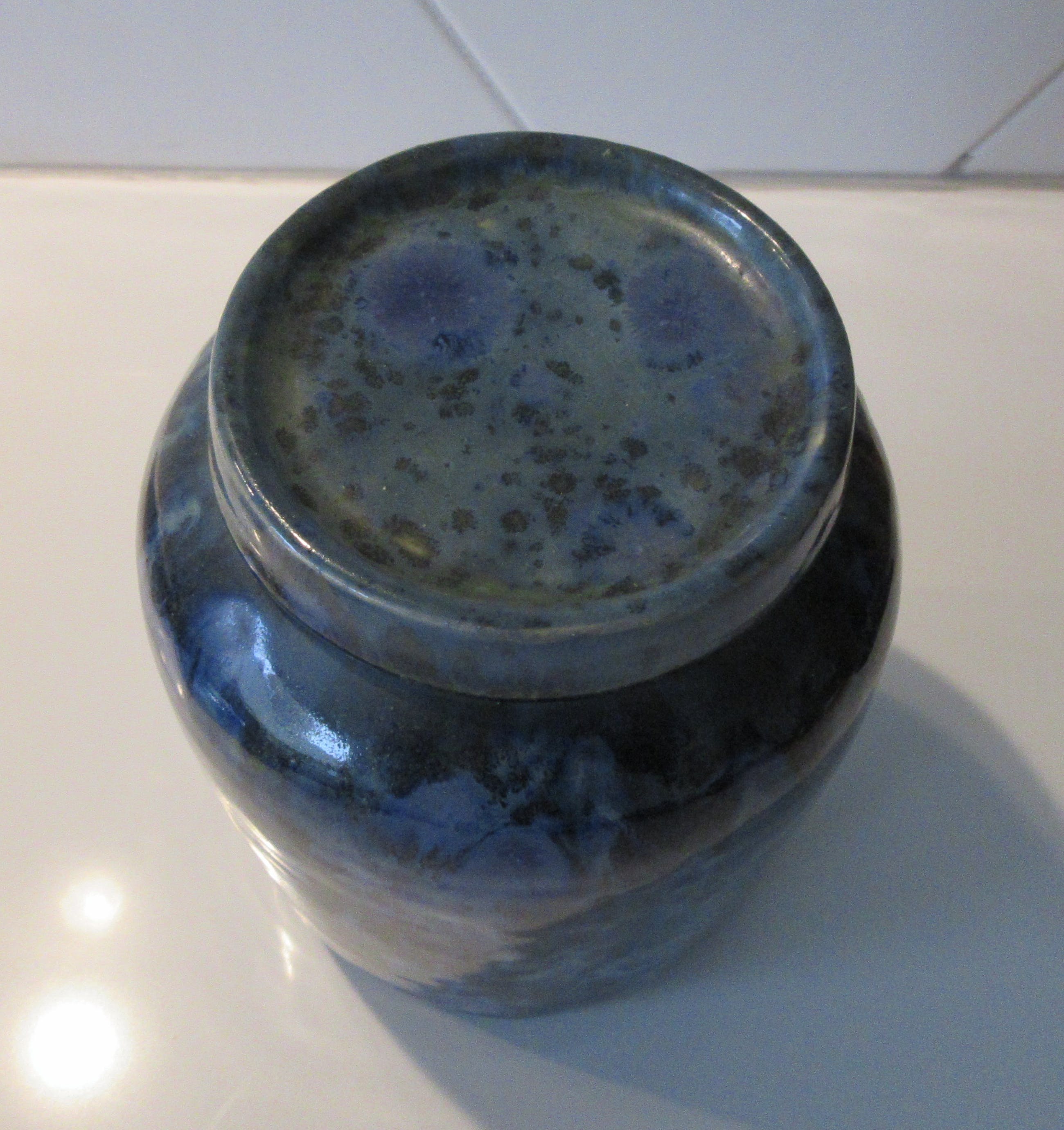 Studio keramische dekselpot of urn met blauw stroom en kristalline glazuur. Aan de onderzijde voorzien van een monogram CL of LL in een driehoek.