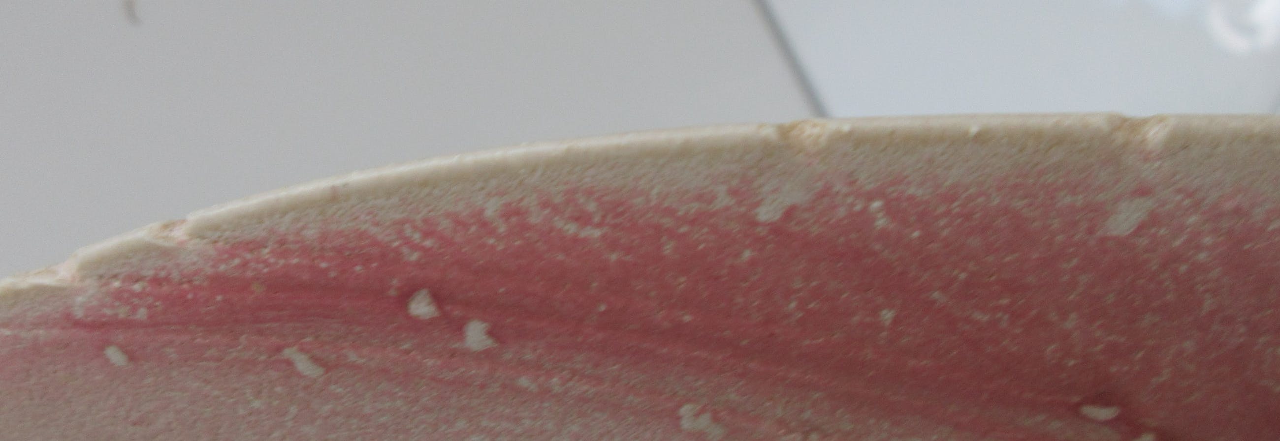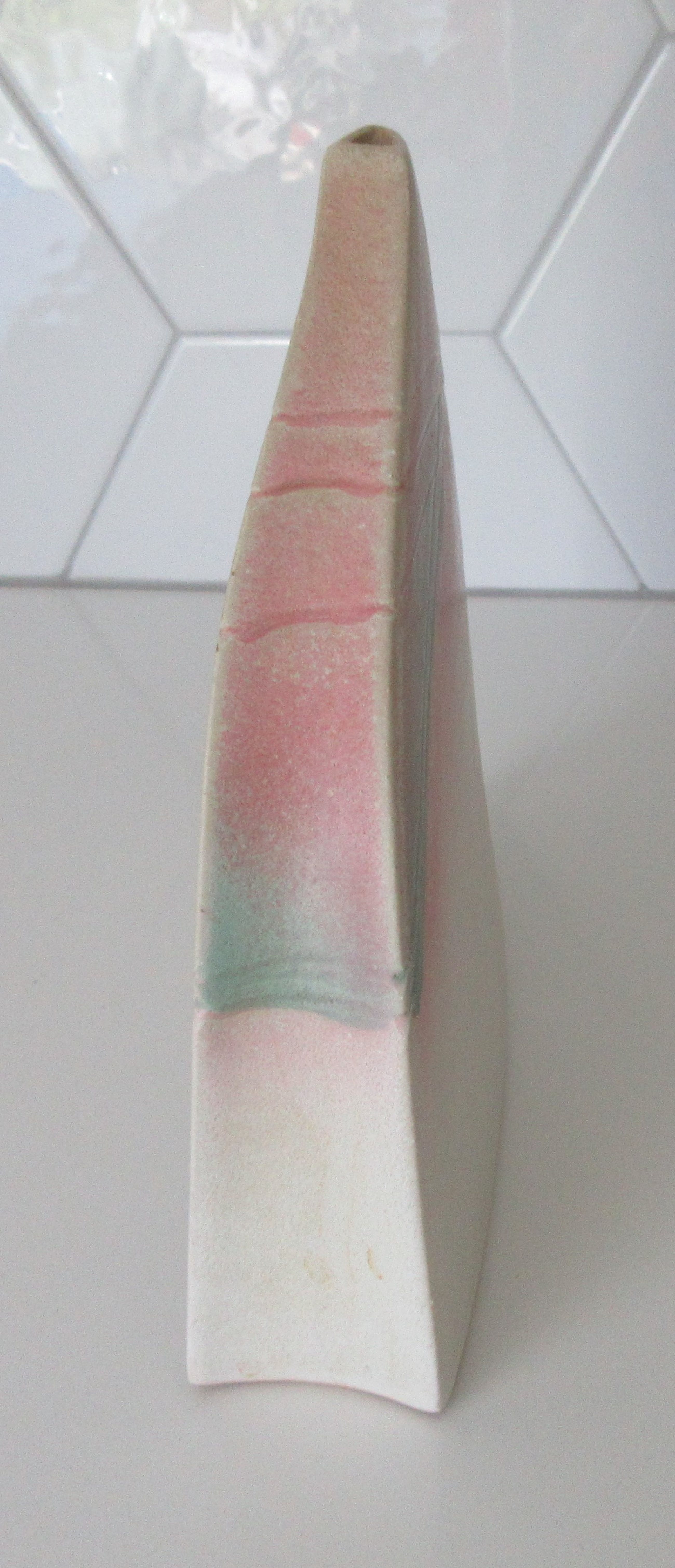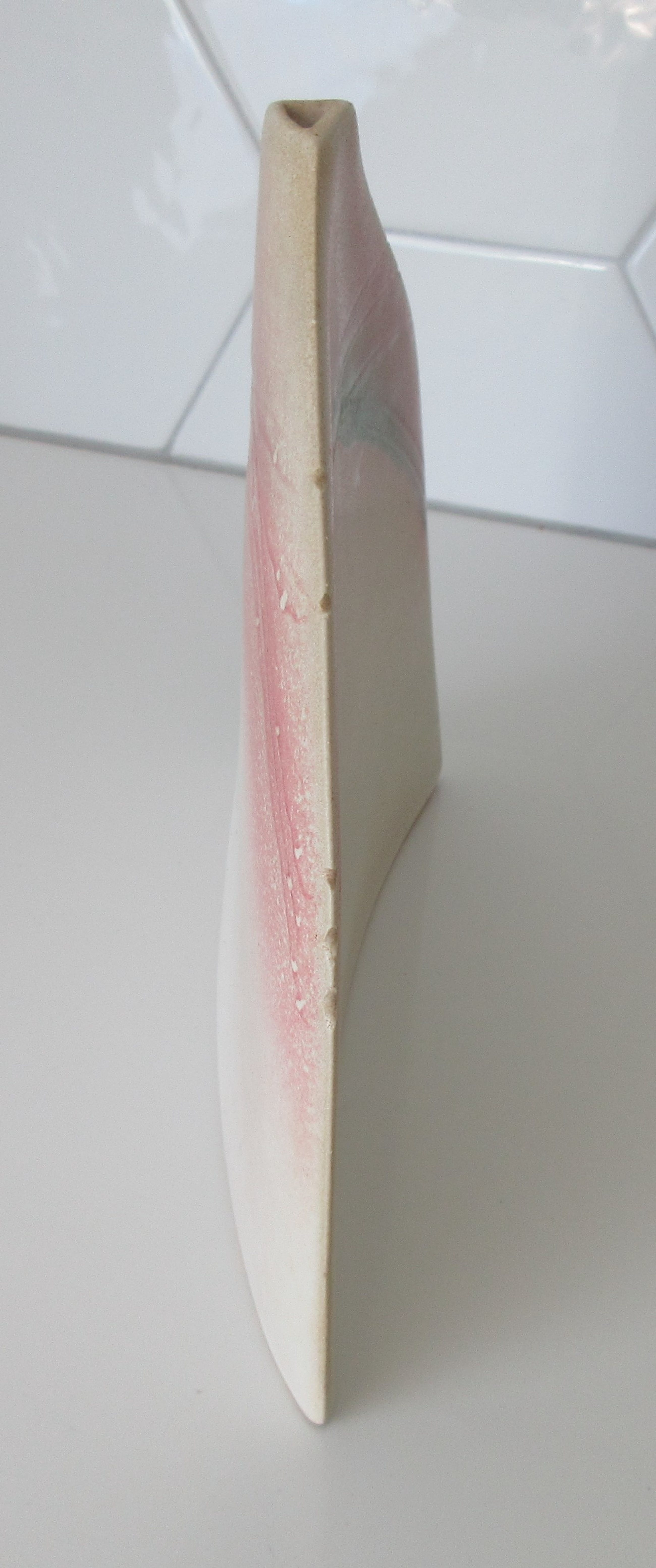 Studio Keramische oval vaasvorm, voorzien van incisie decoratie en matte licht roze en blauw poederglazuur. Gemerkt aan de onderzijde met een blauwe stempel, helaas wat vaag en dus niet duidelijk leesbaar meer.