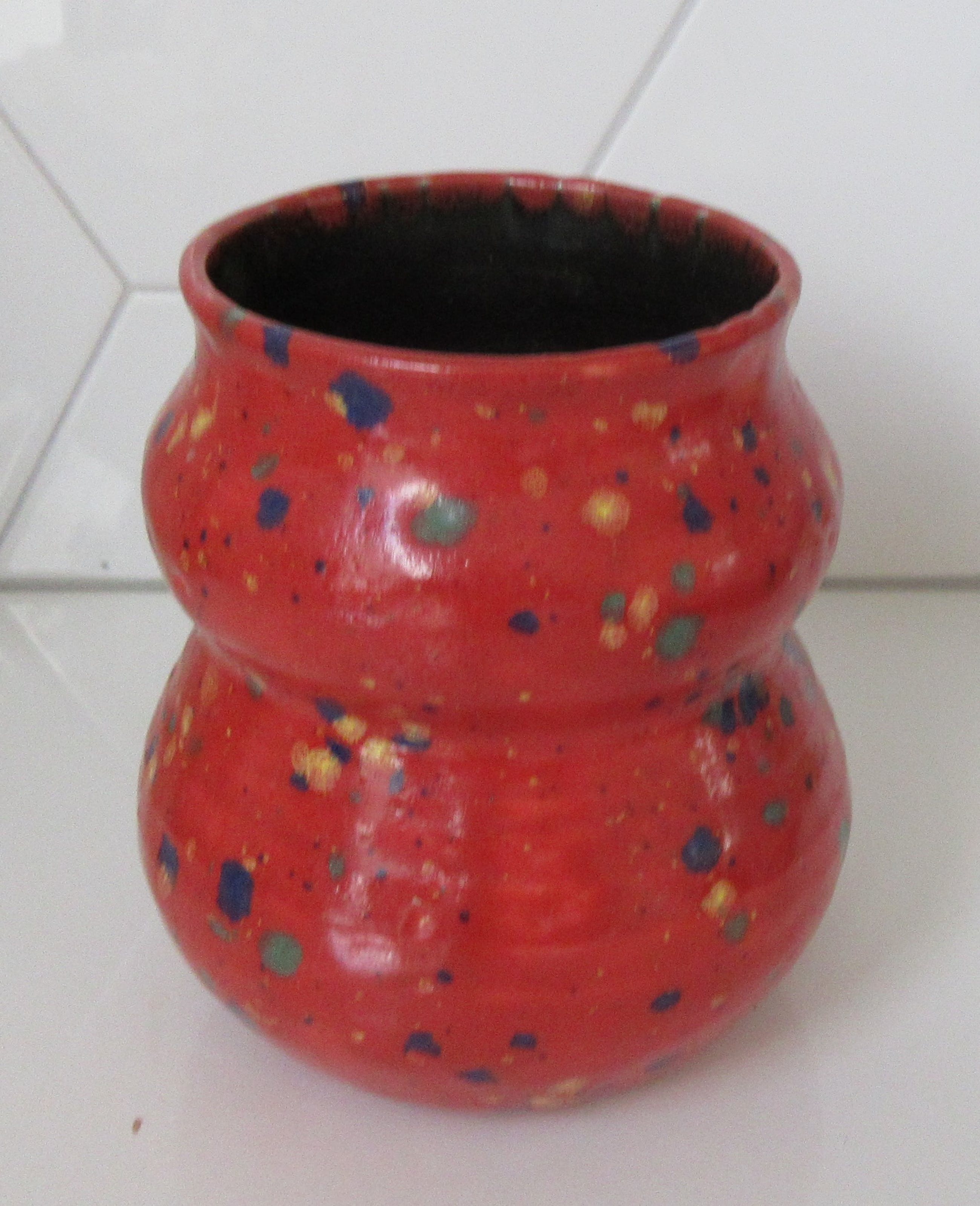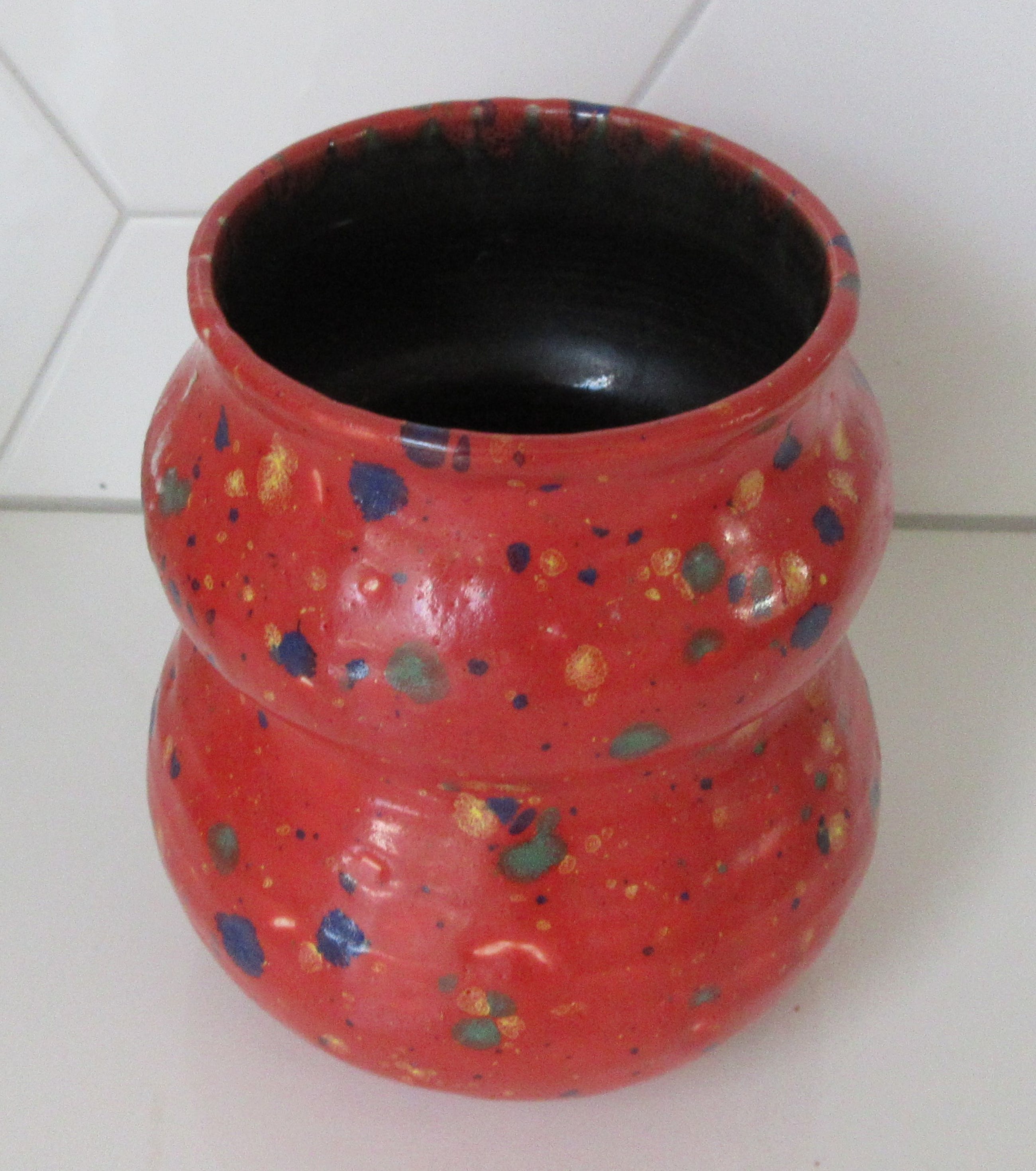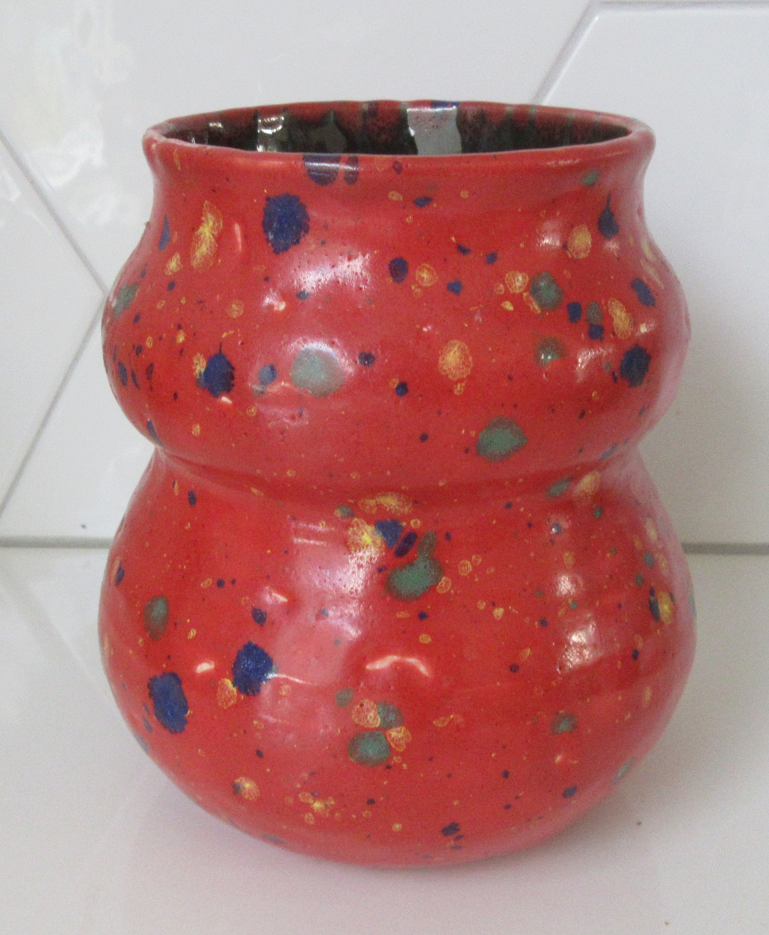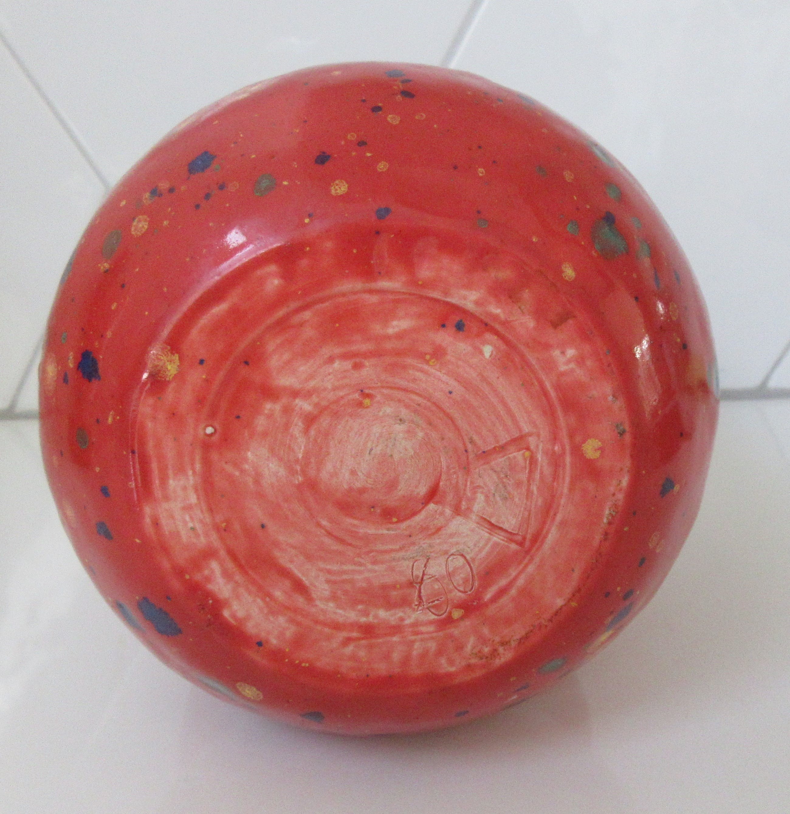 Studio keramische rode en gespikkelde vaas. Leuke vaas voorzien ingedrukt monogram. Keramist onbekend, waarschijnlijk uit de omgeving van Gouda. In prima onbeschadigde conditie.