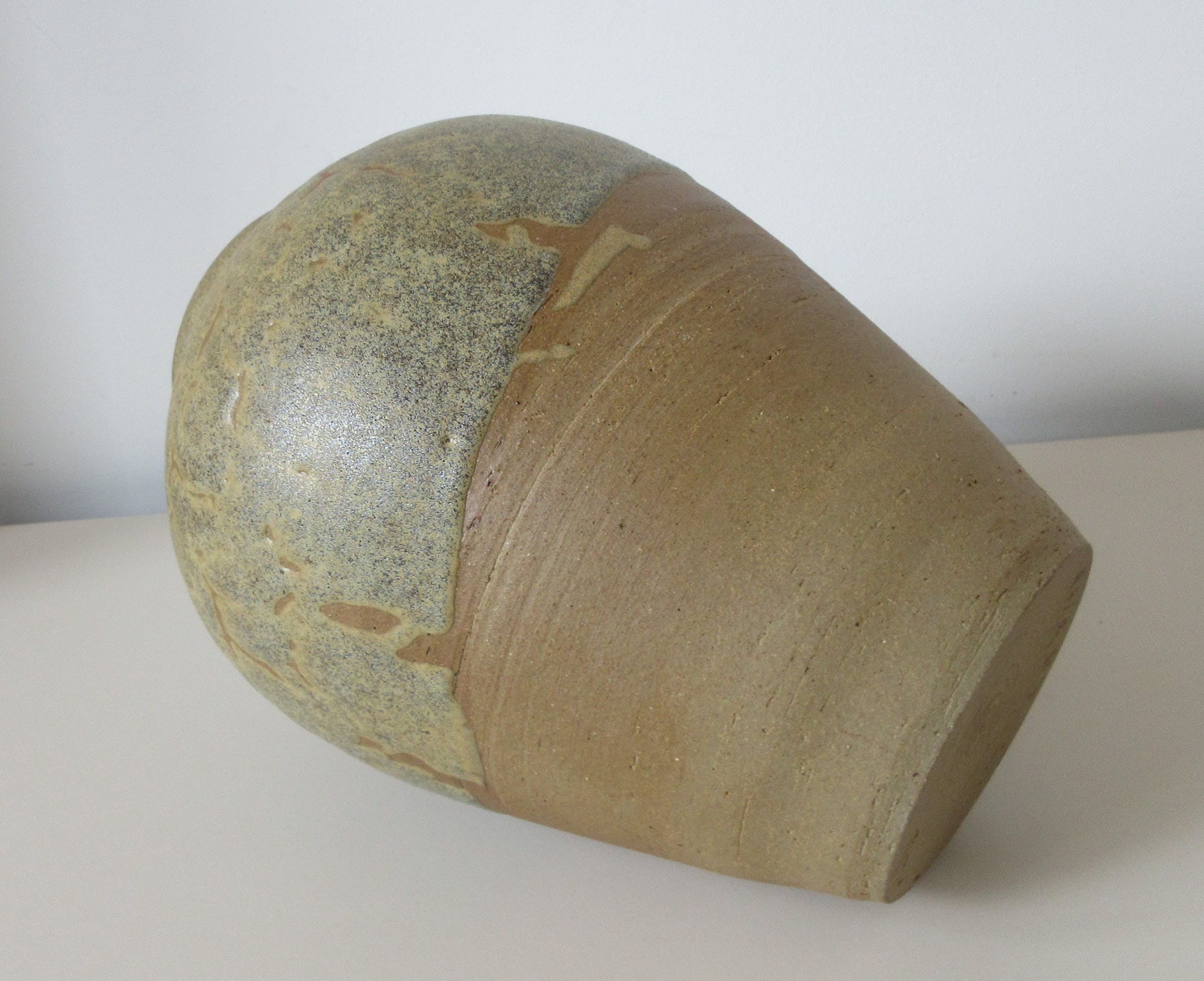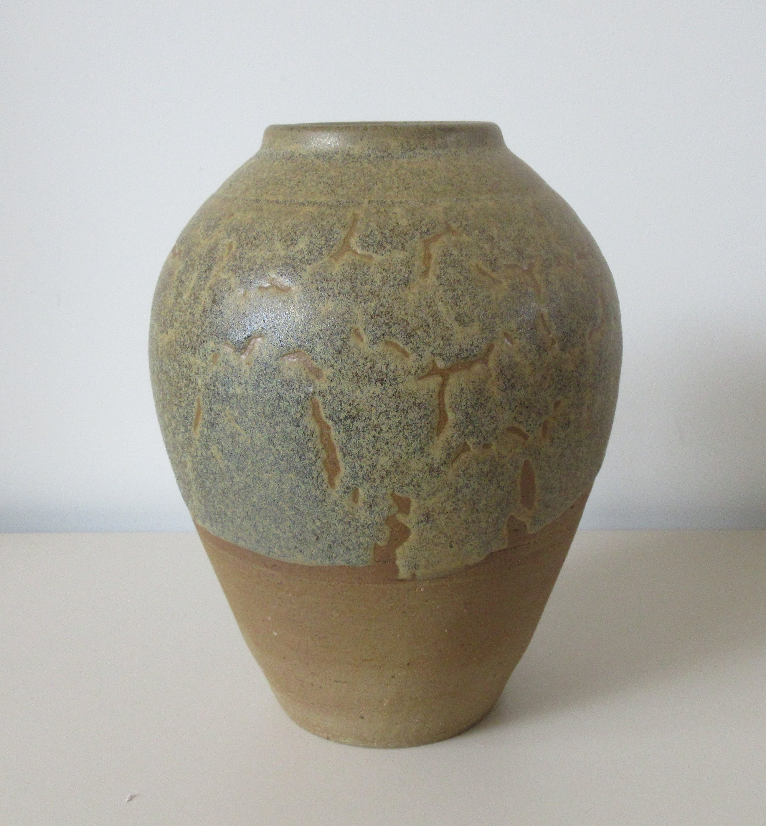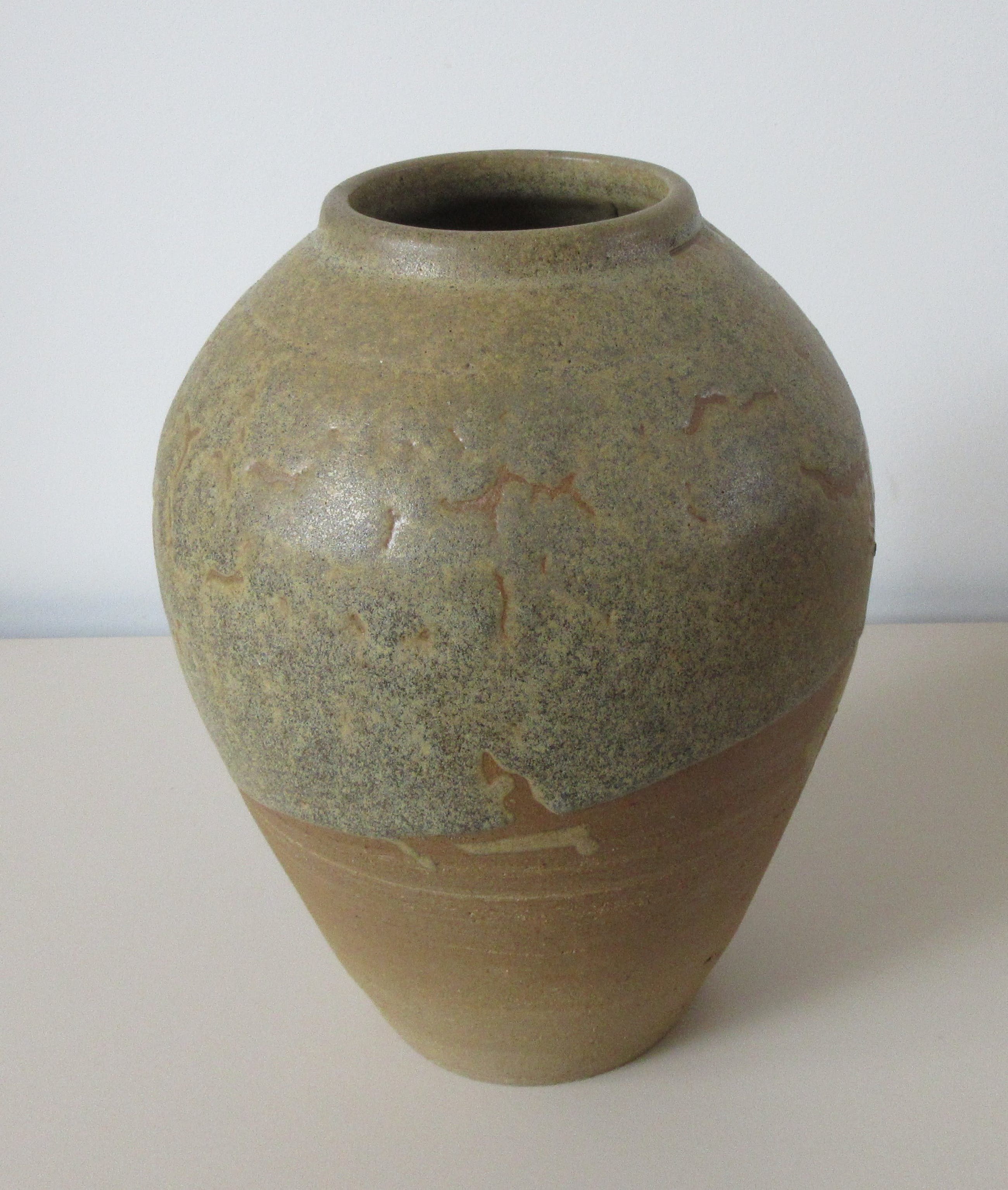 Studio keramische vaas met prachtig beige grijs glazuur voorzien van zwarte as achtige structuur. Gesigneerd Hans J?! en gedateerd '85 aan de onderzijde. In perfecte onbeschadigde conditie.