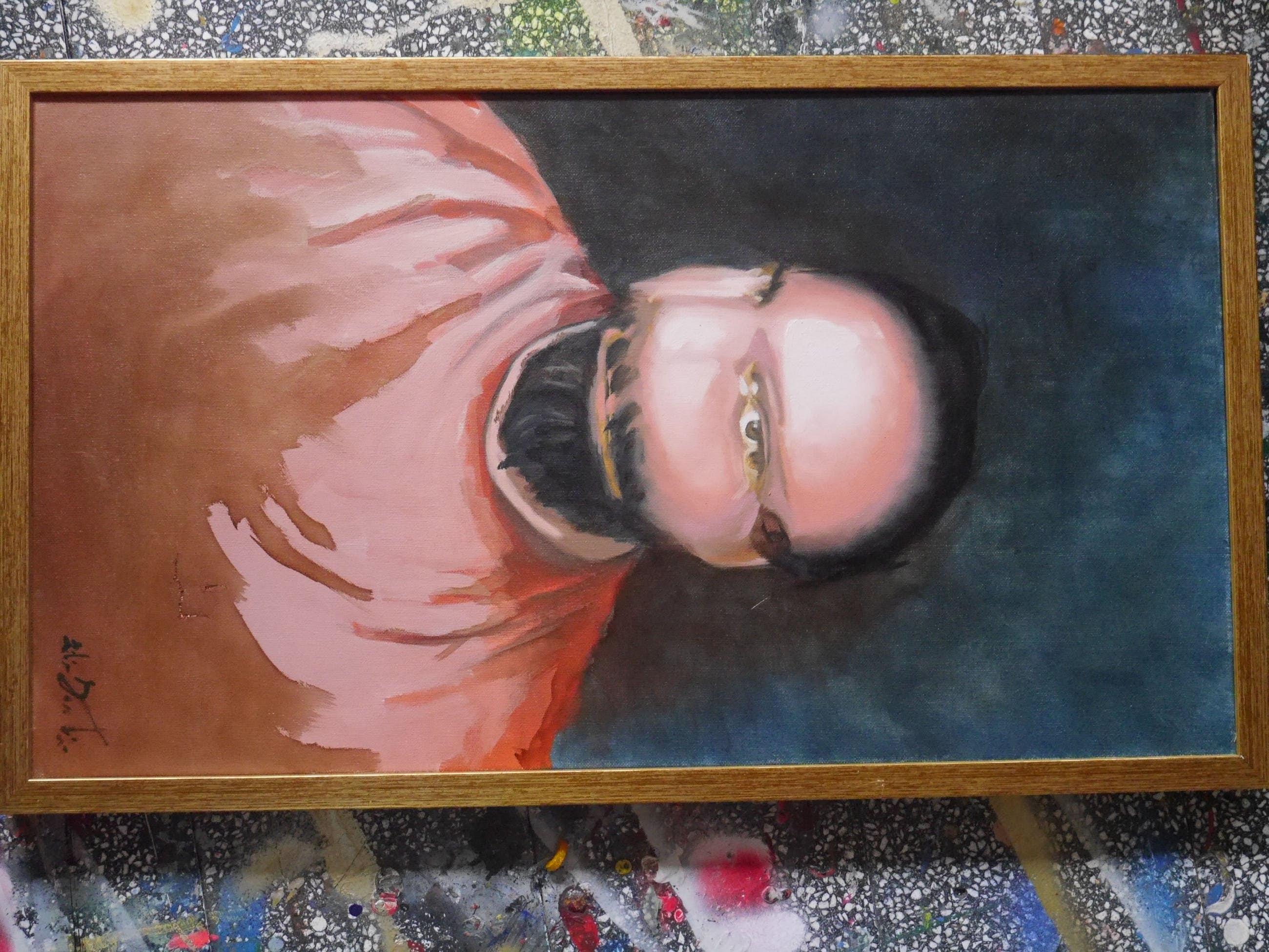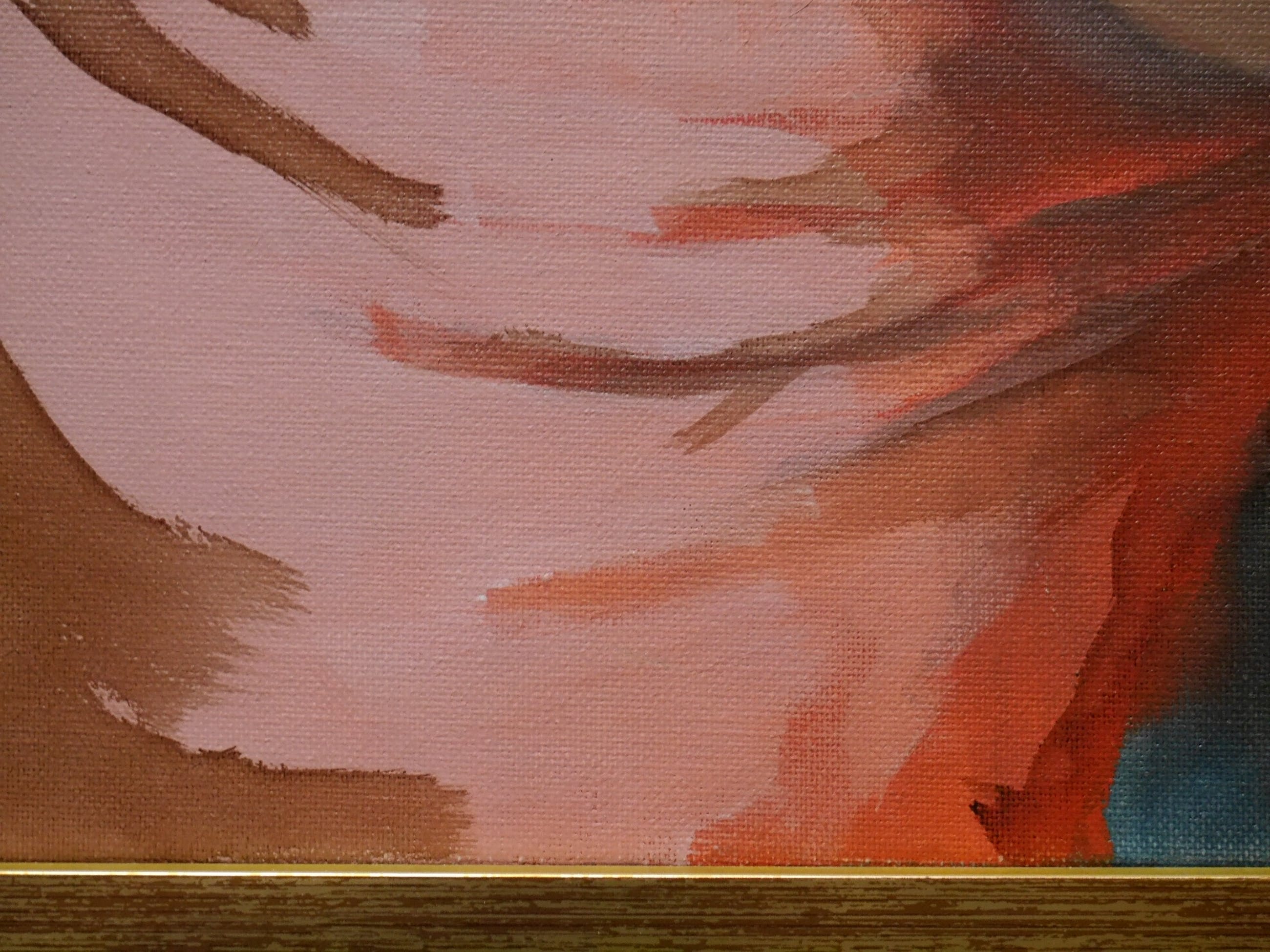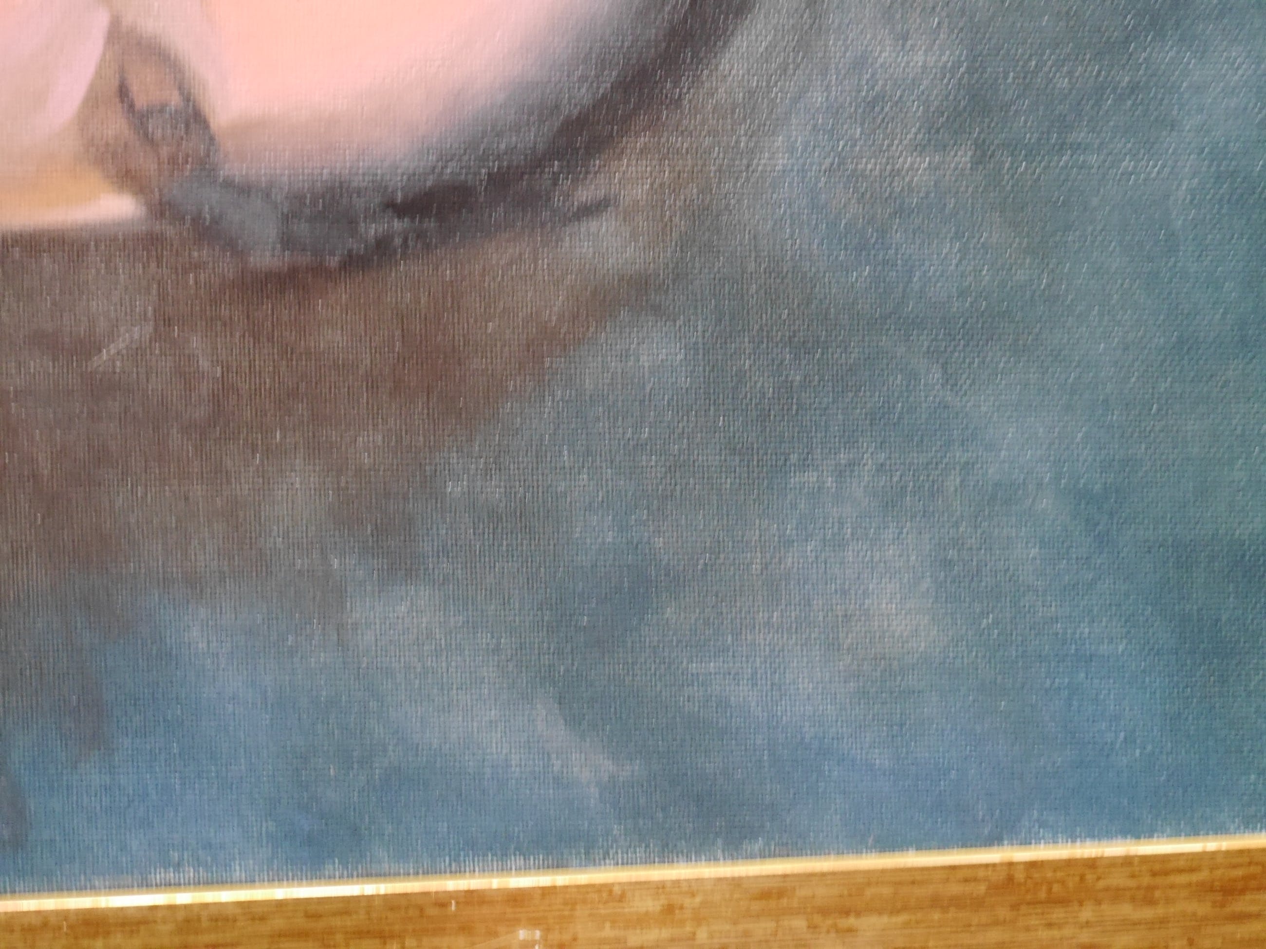 fraai portret met inspiratie van fracis bacon.het oogt geheel gaaf met een mooie lijst in een aparte afmeting....maar is is een klein scheurtje geweest dat gerepareerd is.