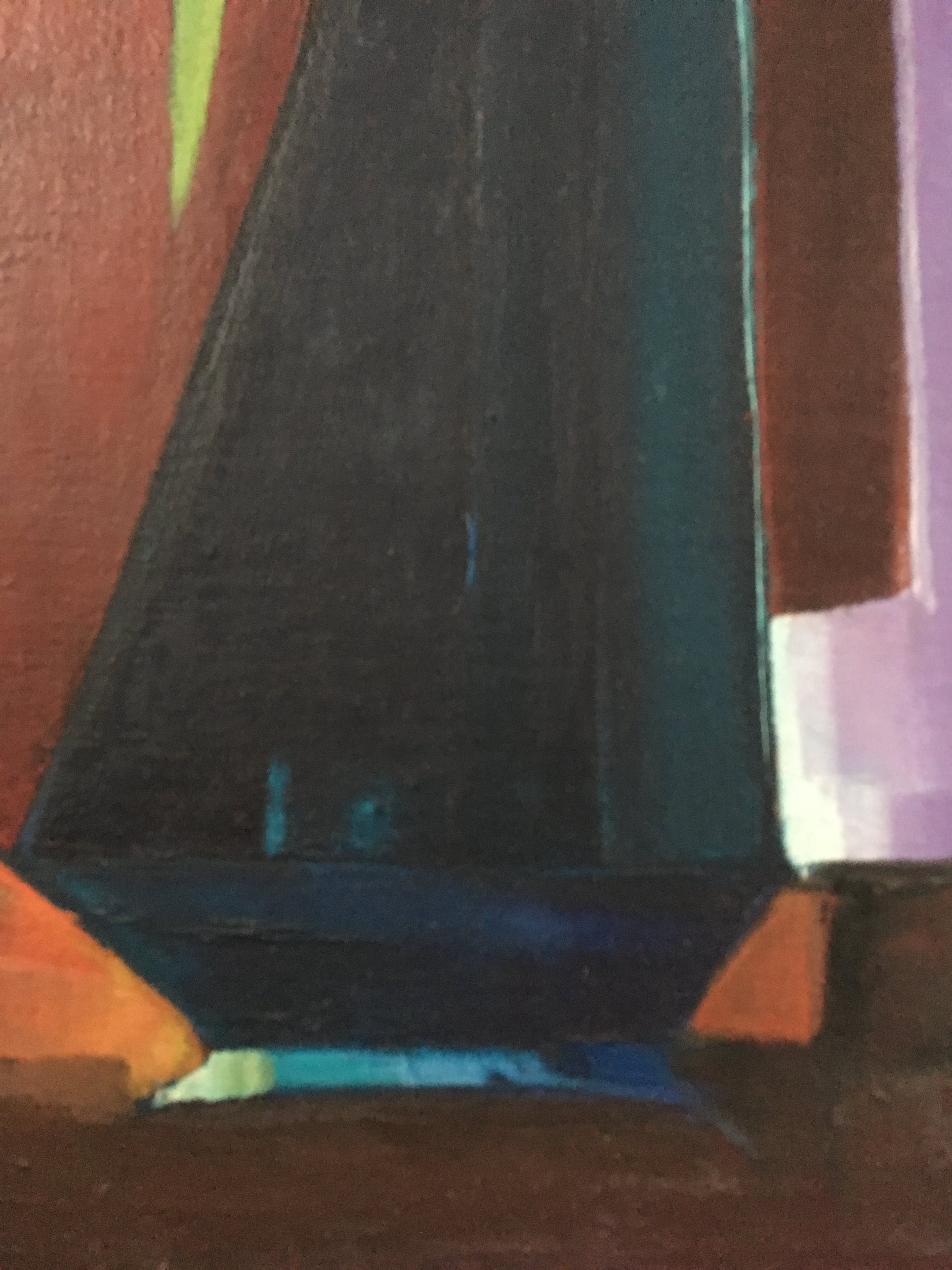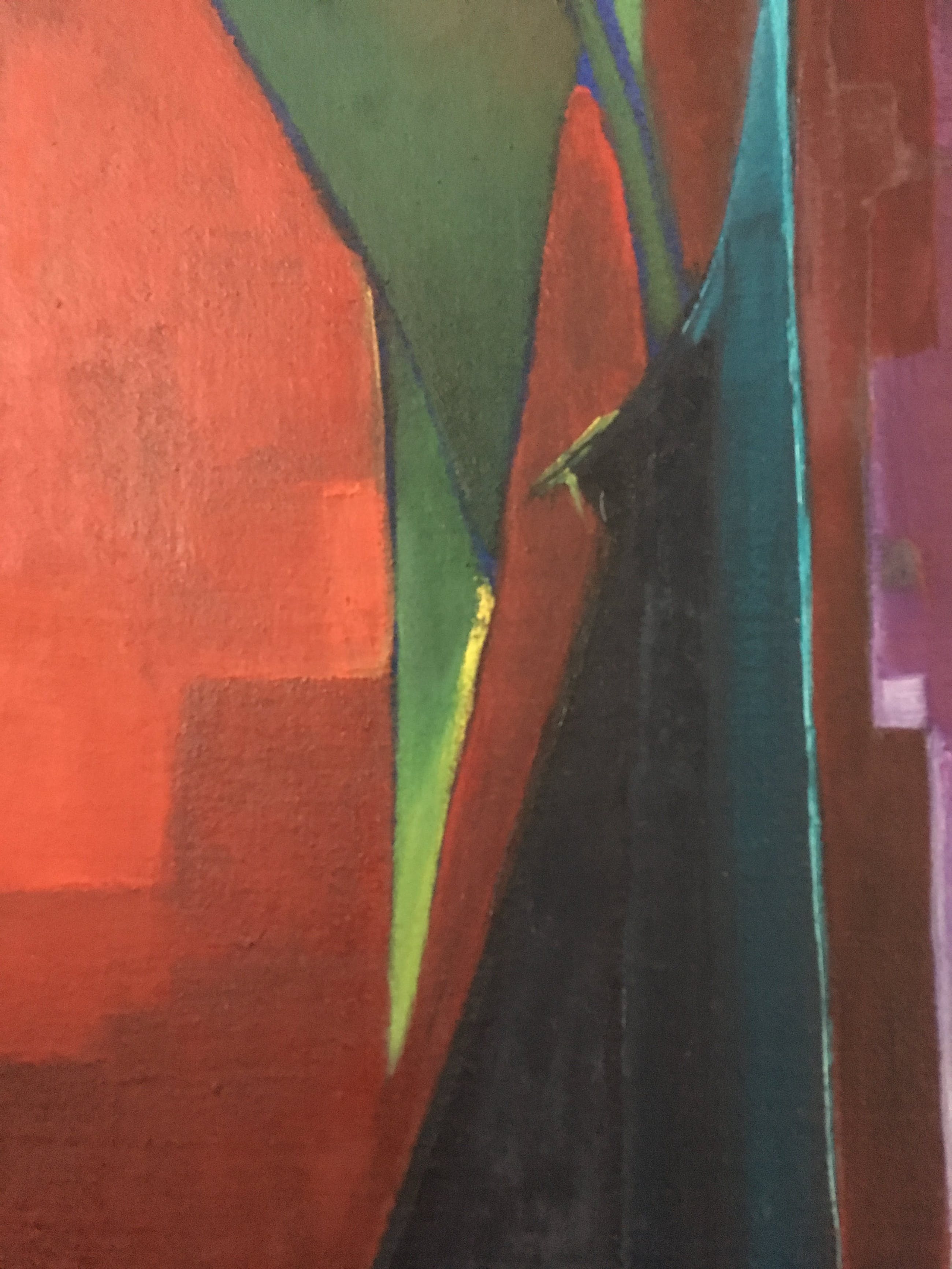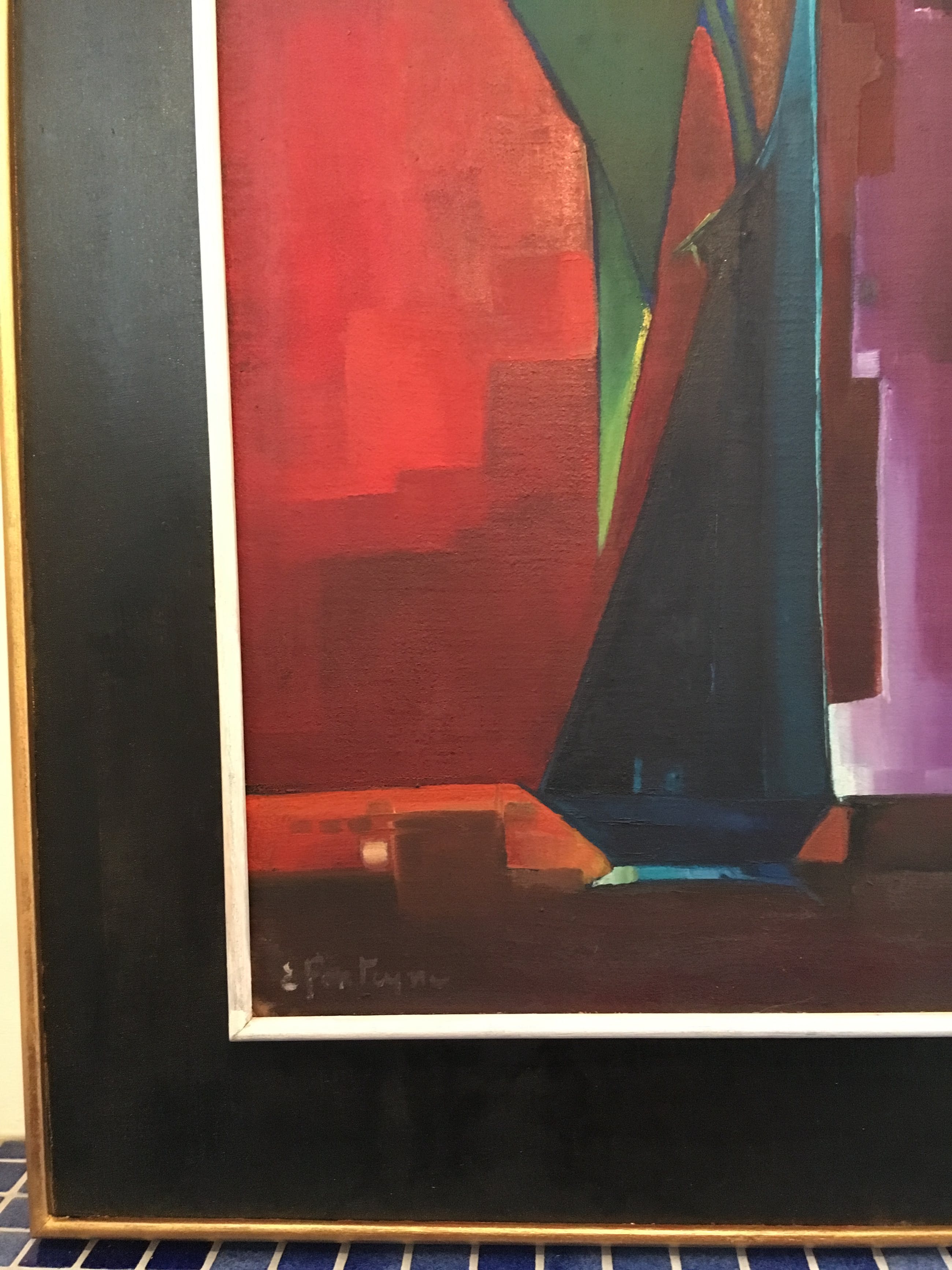 Een typisch werk uit de jaren 60 dat  in elk (vintage) interieur past. Let op de geabstraheerde vormen en de prachtige kleuren! Bekijk vooral de foto's en geniet nu al! Bovendien komt dit schilderij in een prachtige lijst waarvan het goud, zwart en wit als het ware één geheel vormt met het schilderij zelf. Dit schilderij komt uit het huis van mijn vader die twee beelden en één schilderij van deze schilder had.Hieronder vindt u een tekst van de hand van Jacques Walschap over Edgar Fonteyne: