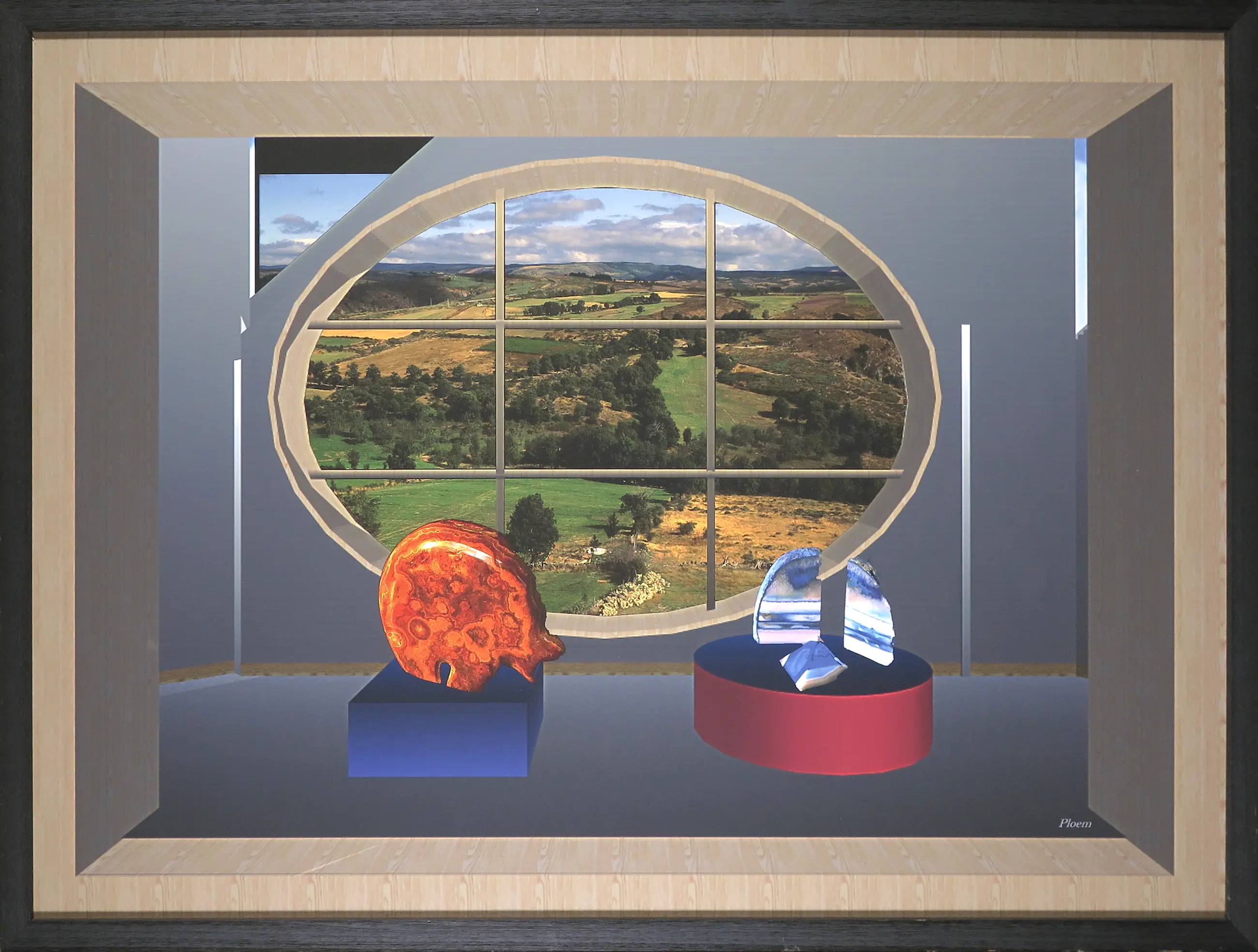Digitaal geprinte surrealistische compositie. In de hoek rechtsonder drukgesigneerd 'Ploem'.