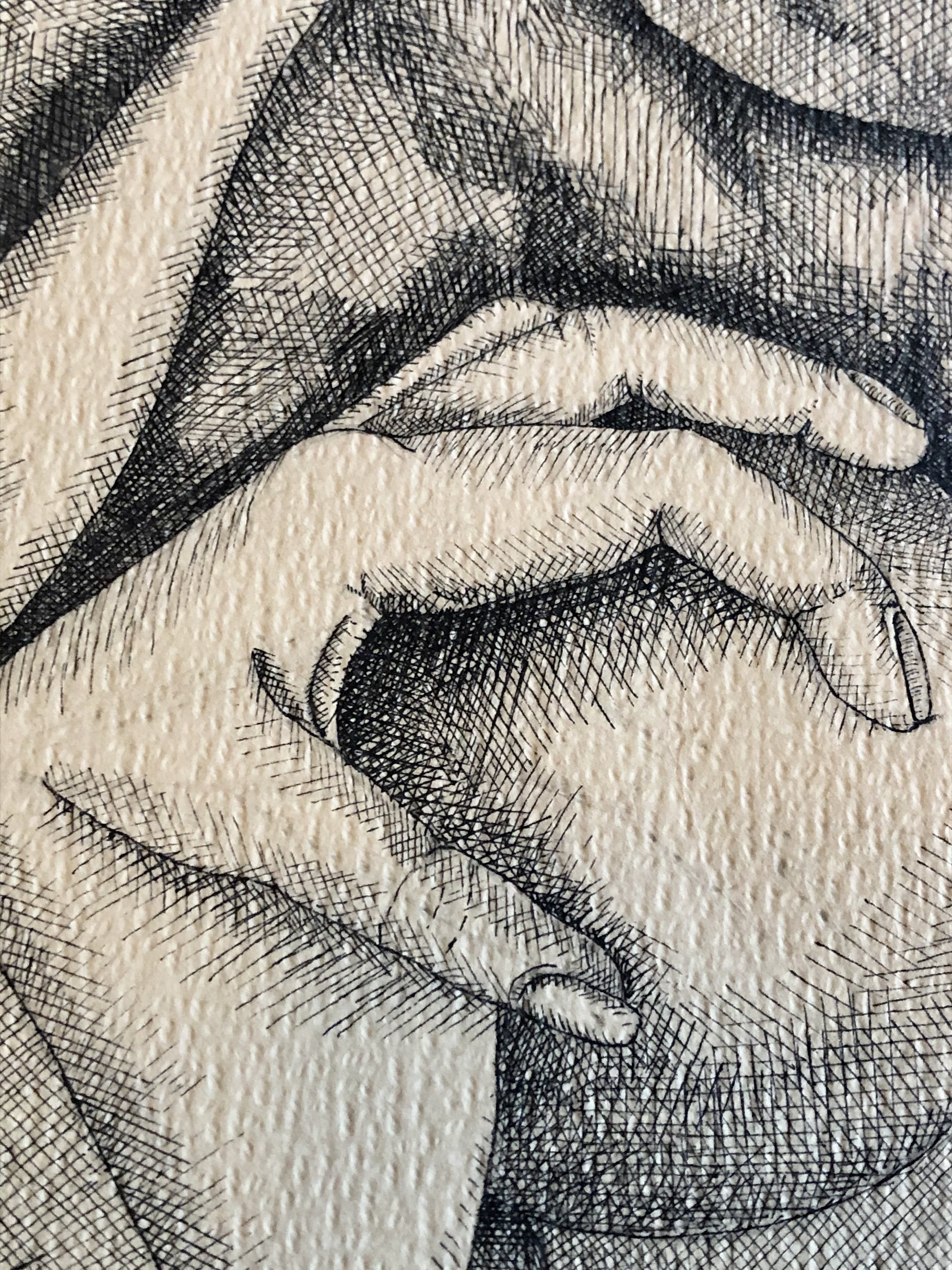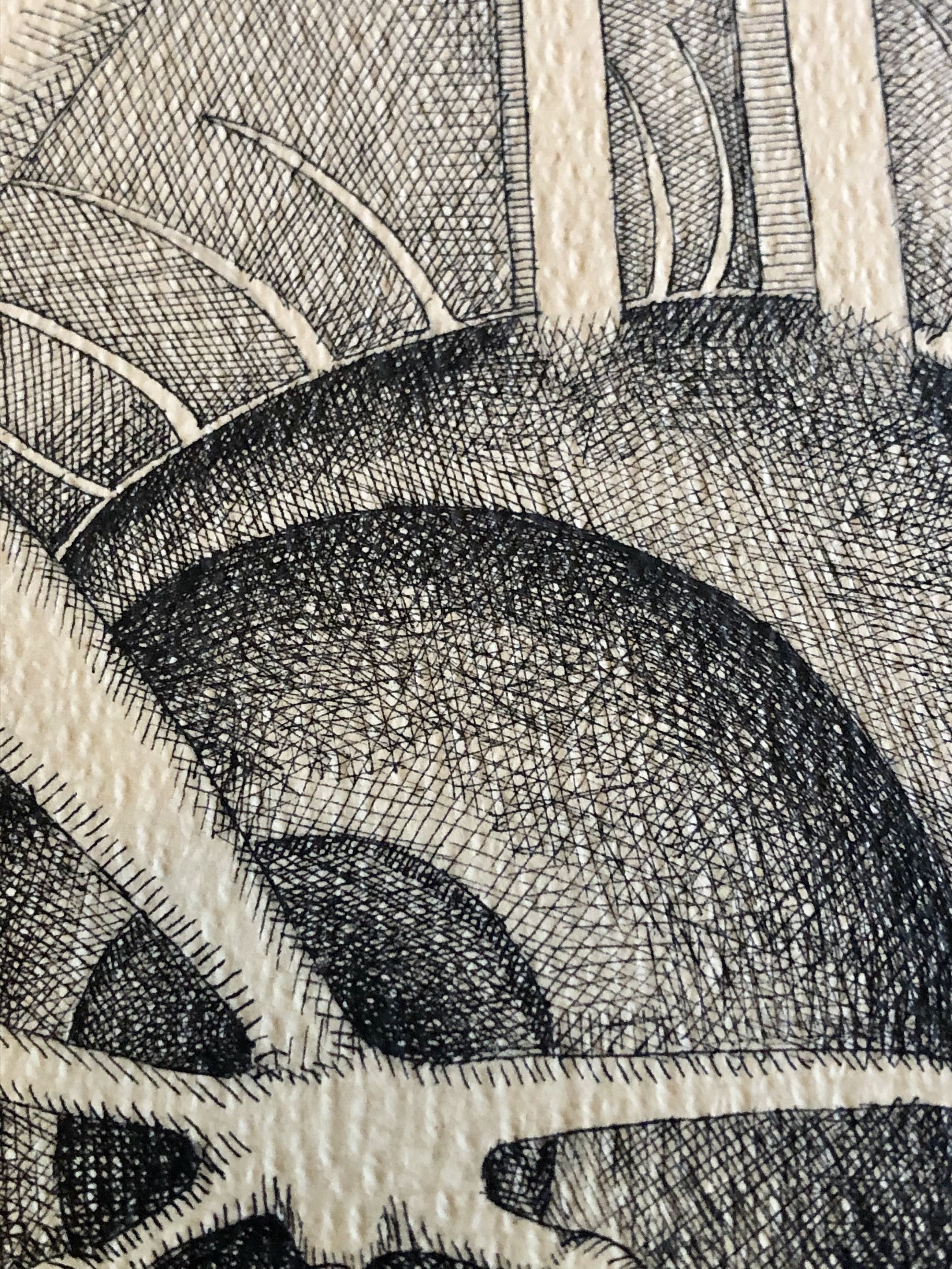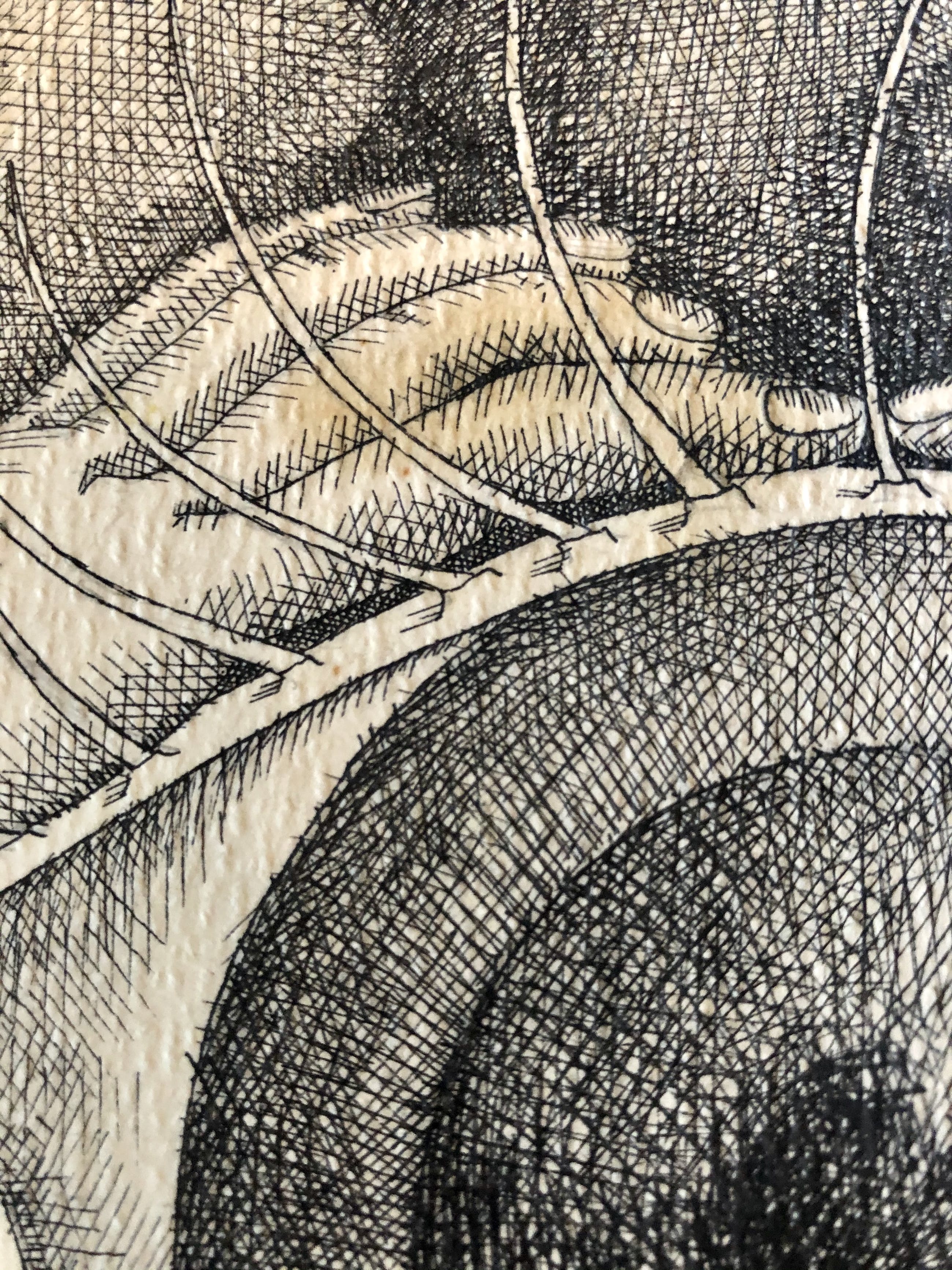 Prachtige gedetaileerde surrealistische pentekening van een ons onbekende kunstenaar. Knap getekend. Hoe langer je kijkt, hoe meer je ziet.