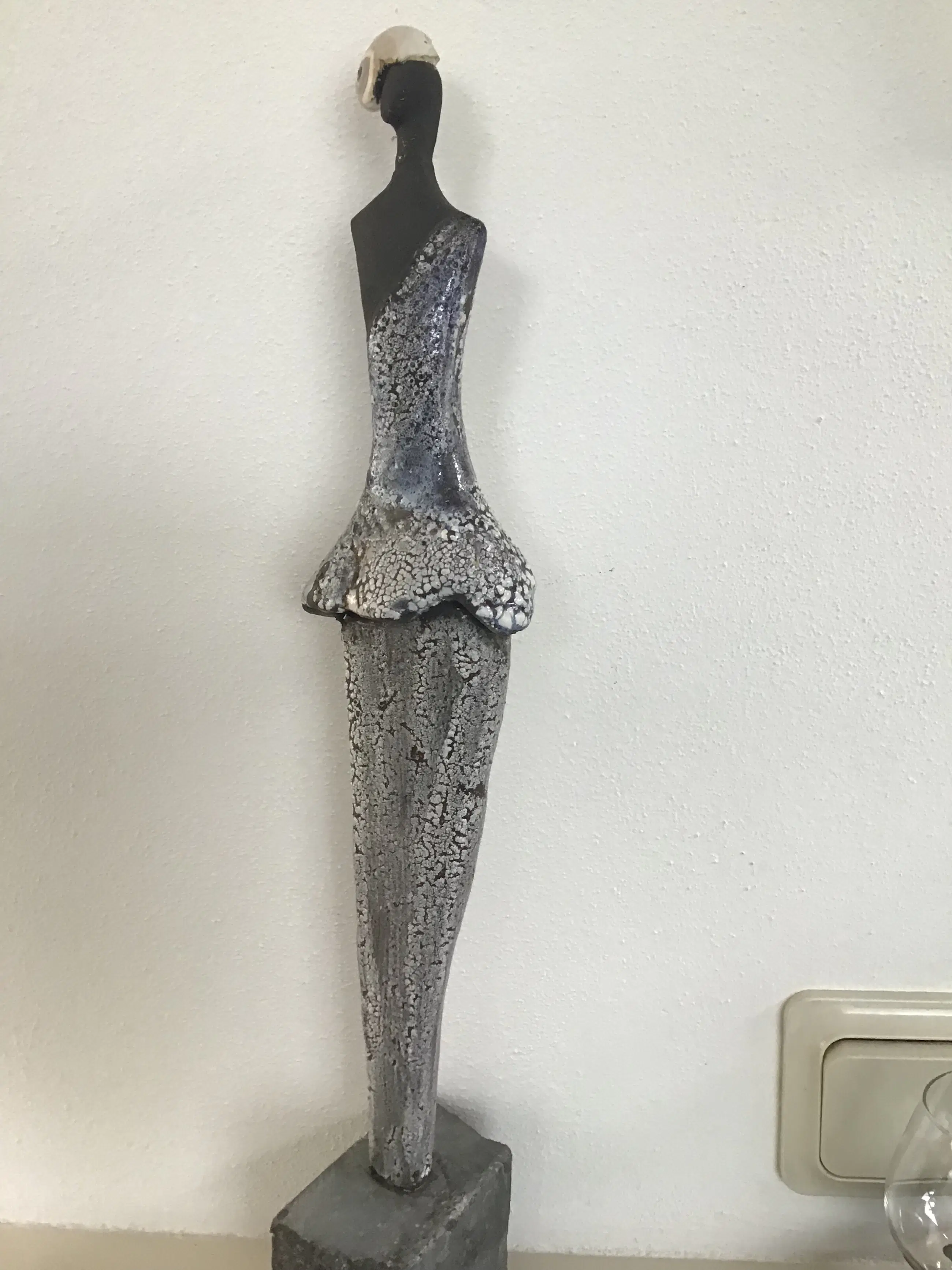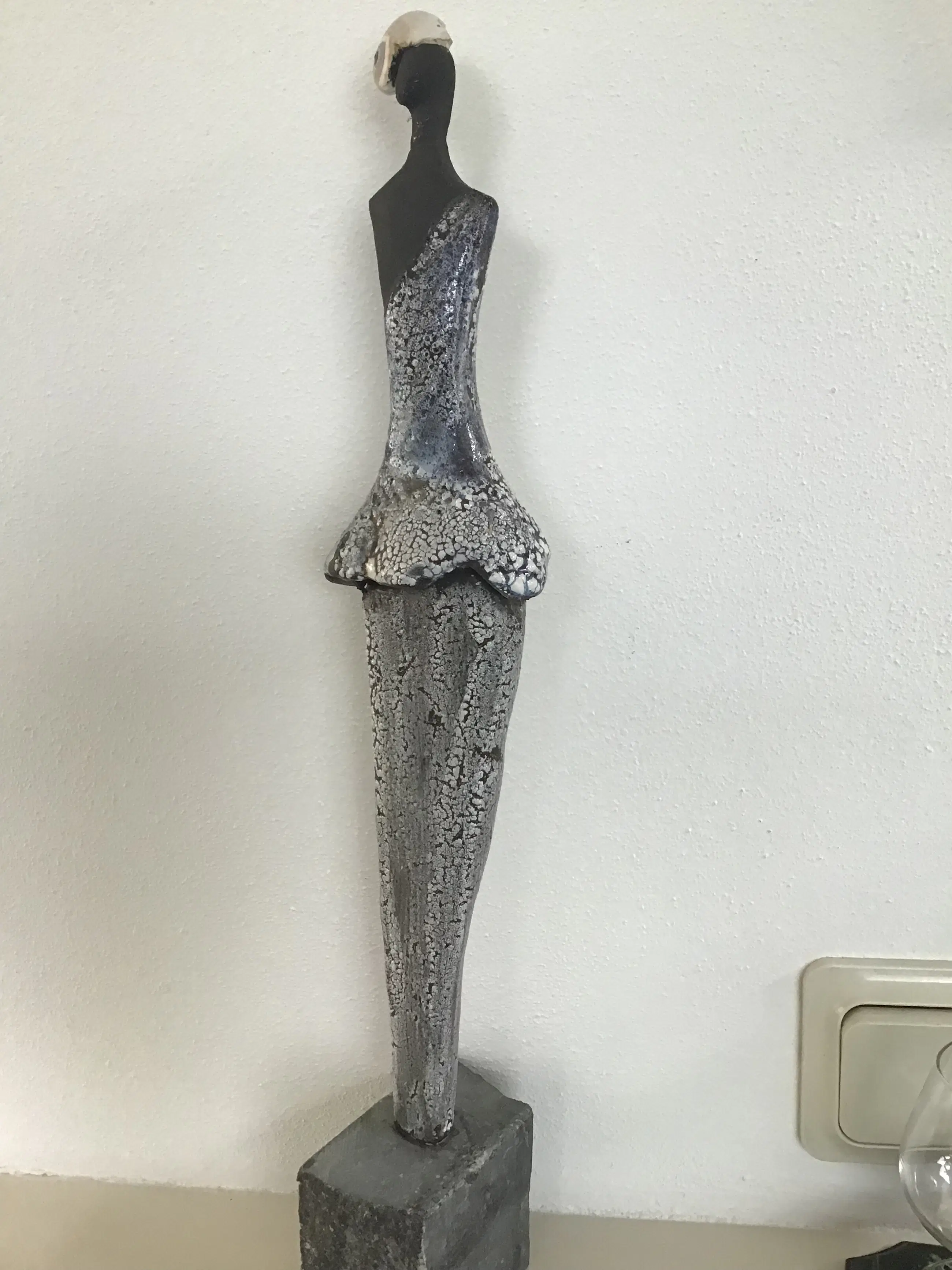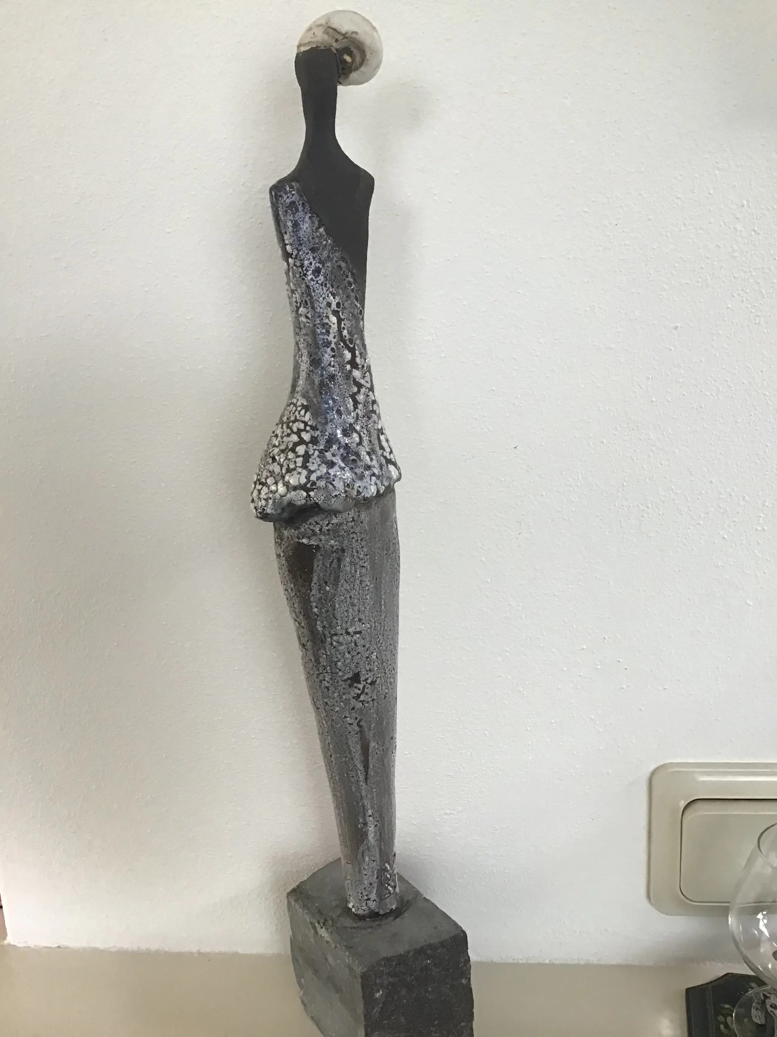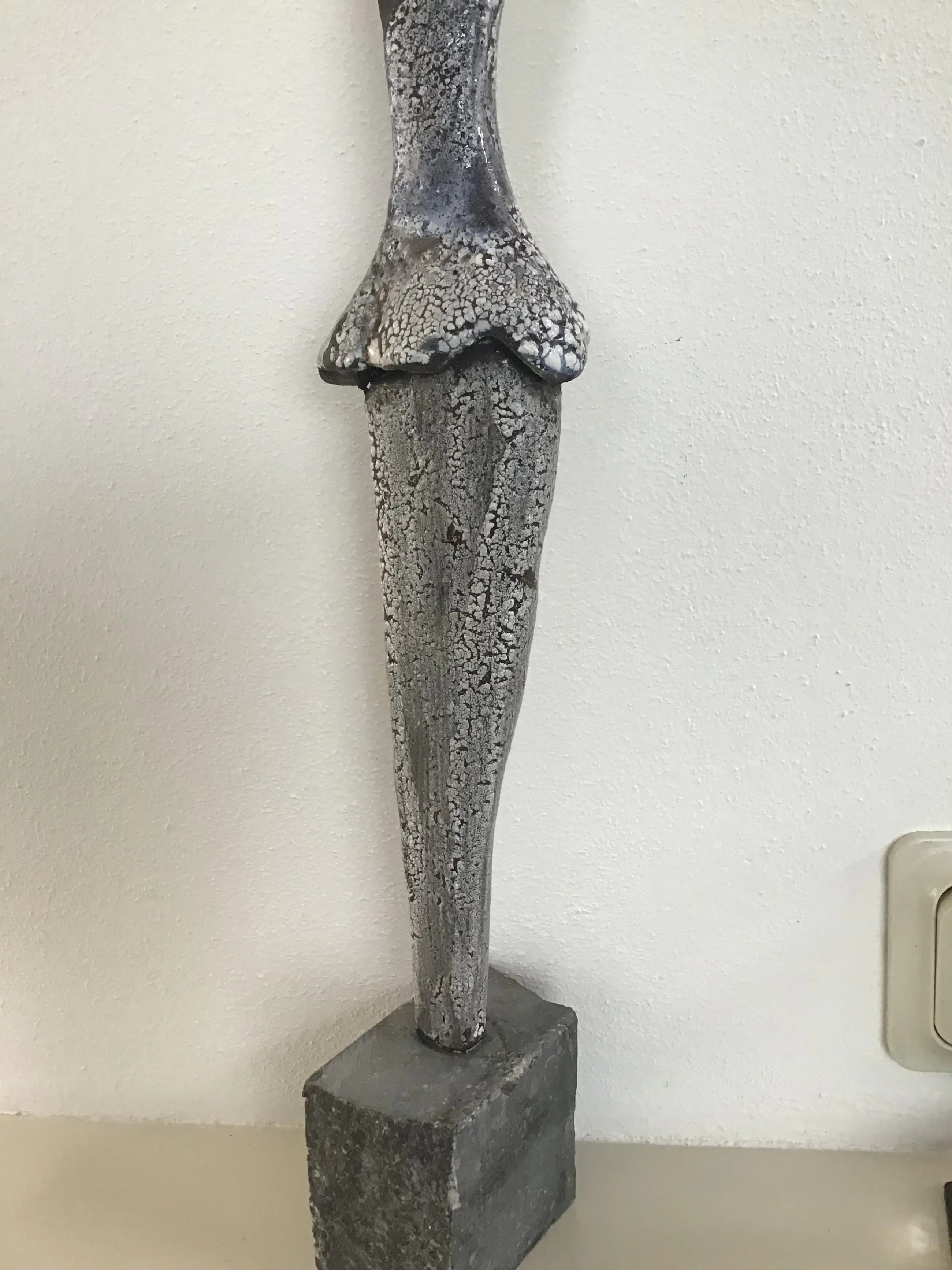 Keramiek beeld op hardstenen sokkeltje. Met initialen gesigneerd.