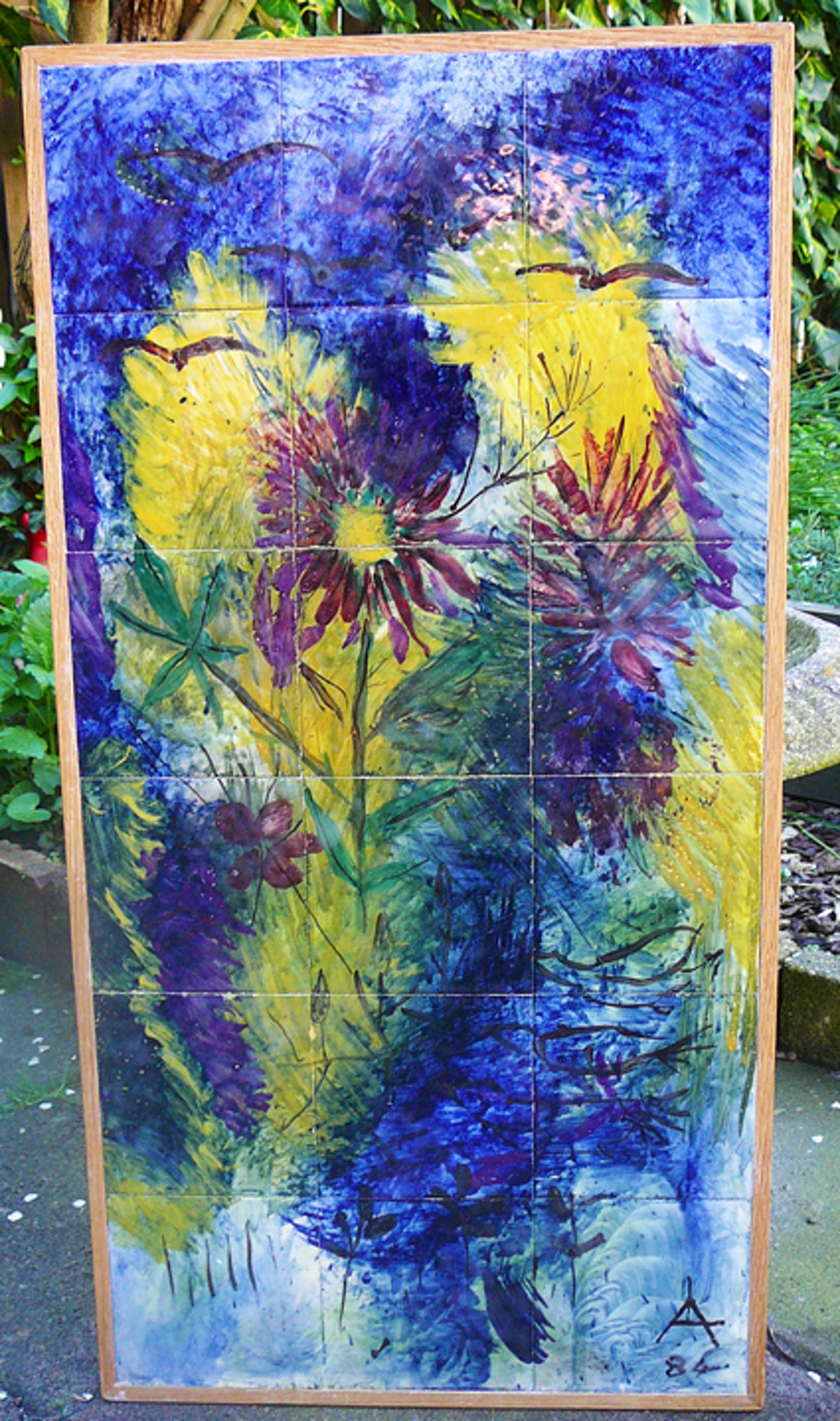 Decoratief expressief tegeltableau met afbeeldingen van bloemen en vogels. De kunstenaar is mij helaas onbekend. Rechtsonder voorzien van een monogram kapitale A met een verticaal streepje in het hart en jaartal 1984 (zie foto). Het tableau bestaat uit 18 geglazuurde tegels in de maat 10,5 x 10,5 cm. Het werk is voorzien van een smalle beuken lijst en is fraai afgewerkt. Gezien de kwetsbaarheid en gewicht alleen af te halen in Utrecht.